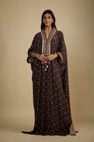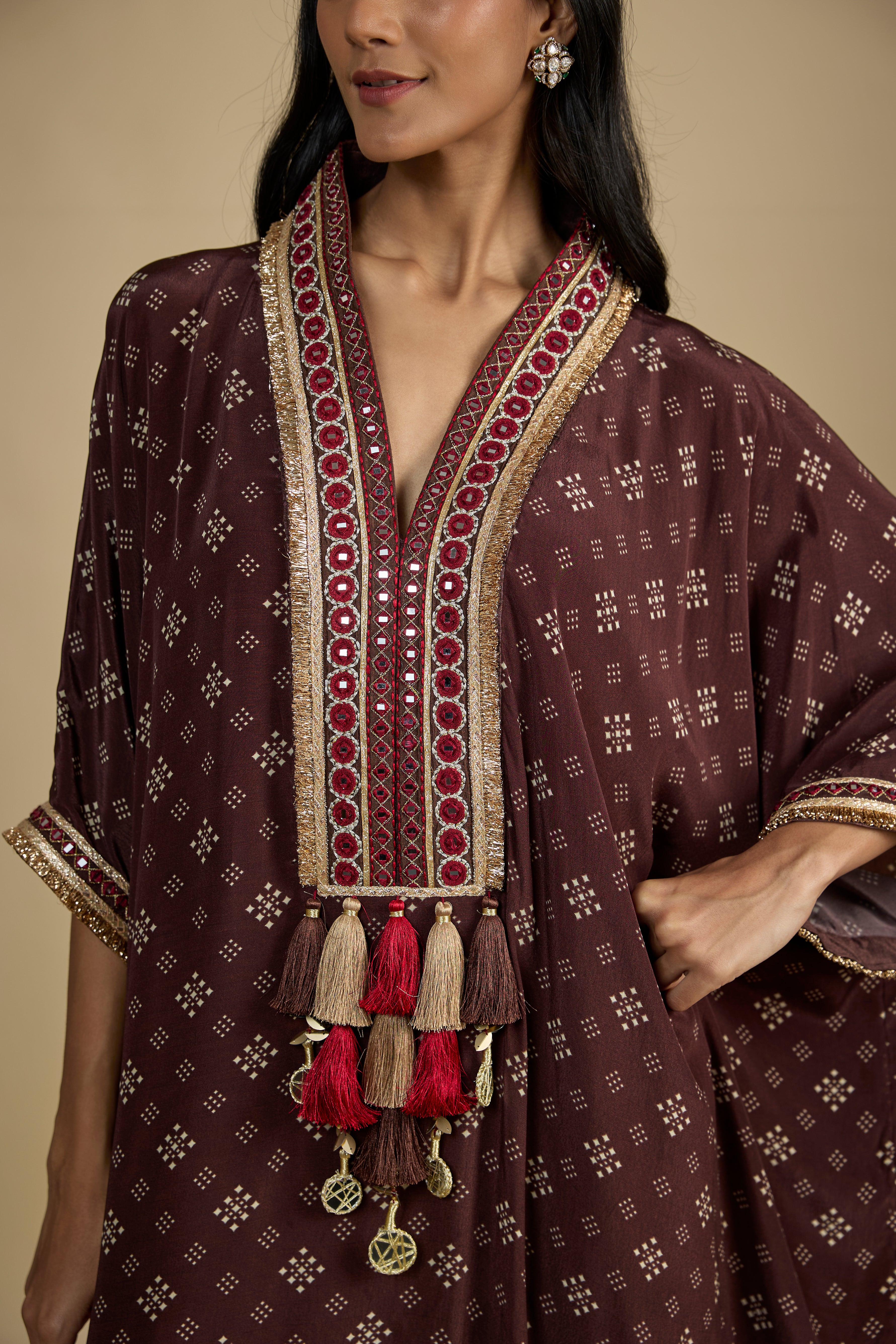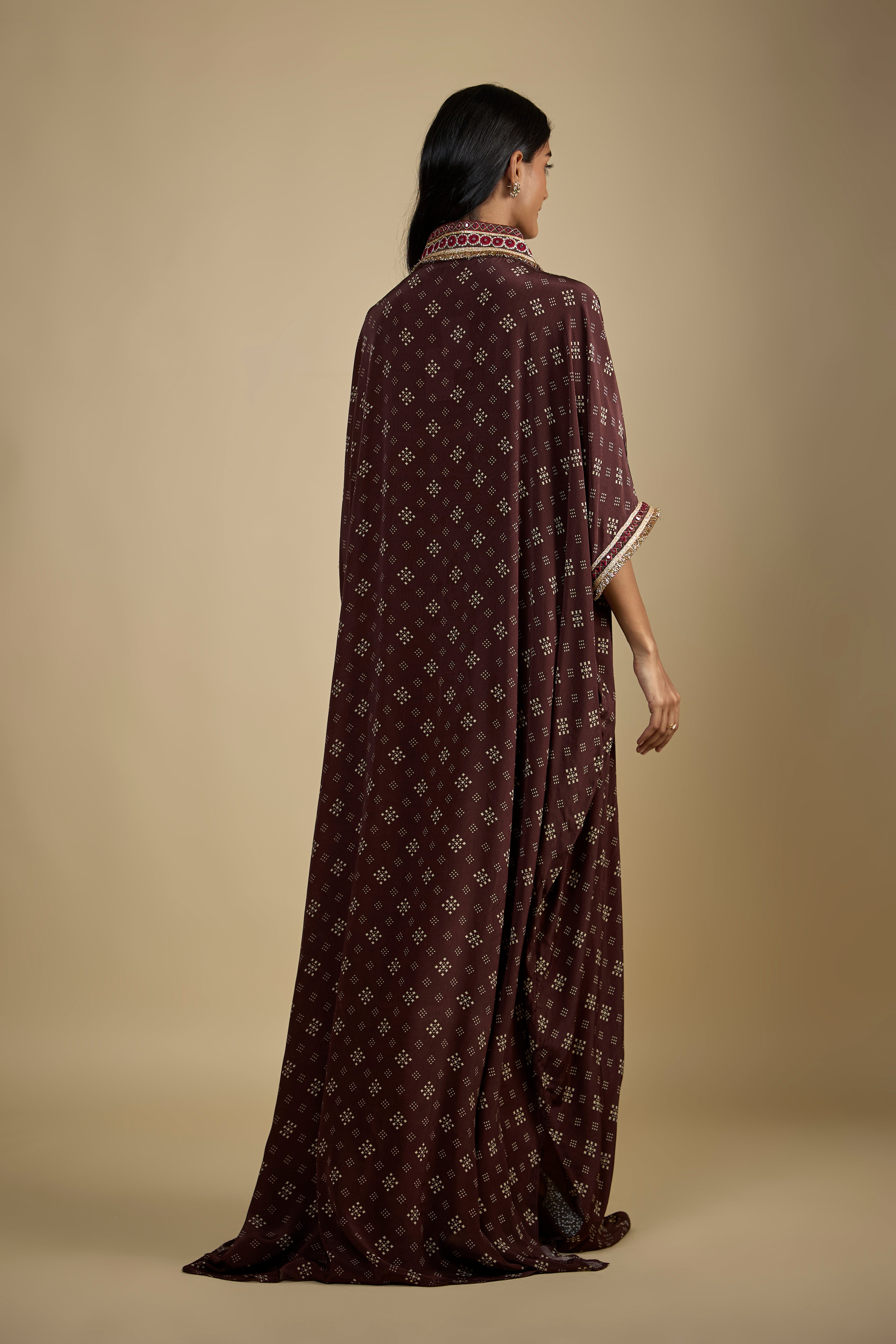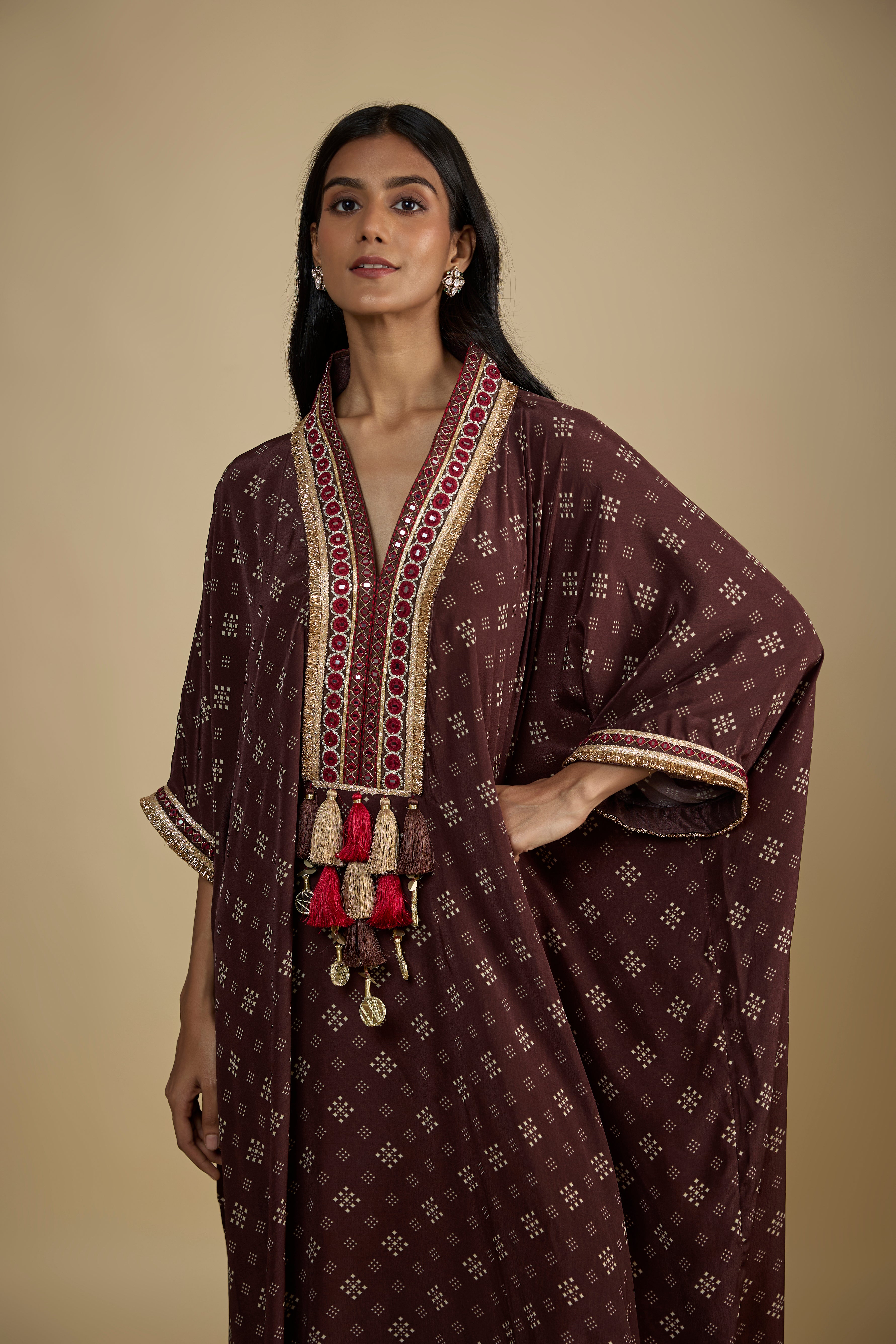 يتميز بفستان كافتان برتقالي من الكريب المطبوع مع ترتر وتطريز لؤلؤ وتفاصيل شرابة ذهبية.