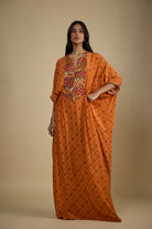يتميز بفستان كافتان برتقالي من الكريب المطبوع مع ترتر وتطريز لؤلؤ وتفاصيل شرابة ذهبية.