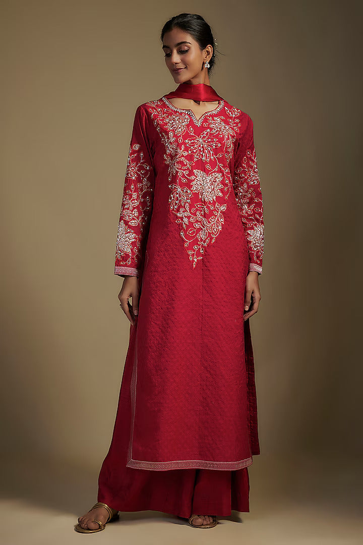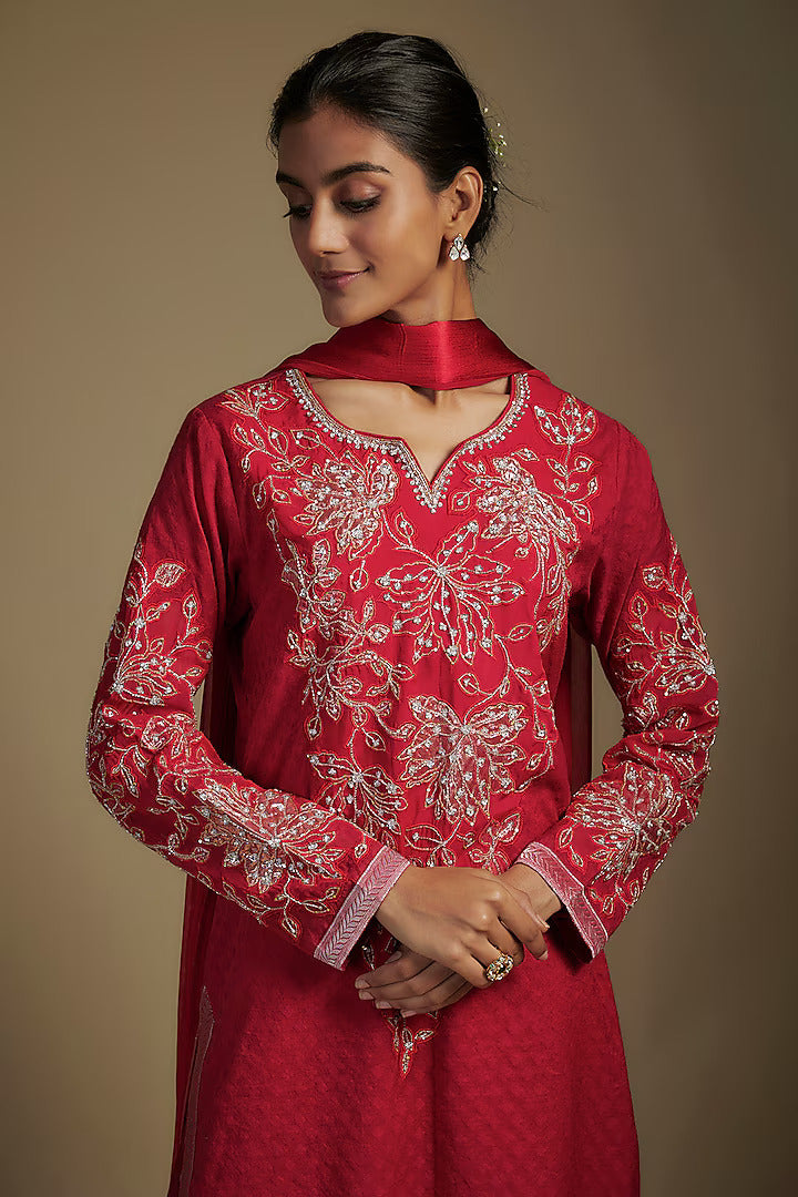 ارفع أسلوبك مع مجموعة ناديمة صاقب المذهلة المكونة من 3 قطع باللون الأحمر، والتي تضم كُرتا، بنطلون بالازو، ودوباتا مصنوعة من تشانديري الفاخر، حرير دوبون، organza، وجورجيت. مصممة بتناسب جذاب عند الصدر والخصر، هذه المجموعة الأنيقة مثالية للمناسبات الخاصة. يتم الشحن خلال 2-3 أسابيع؛ الطلبات المصنوعة حسب الطلب غير قابلة للإرجاع. يُنظف جافًا فقط للحفاظ على الجمال الدائم.