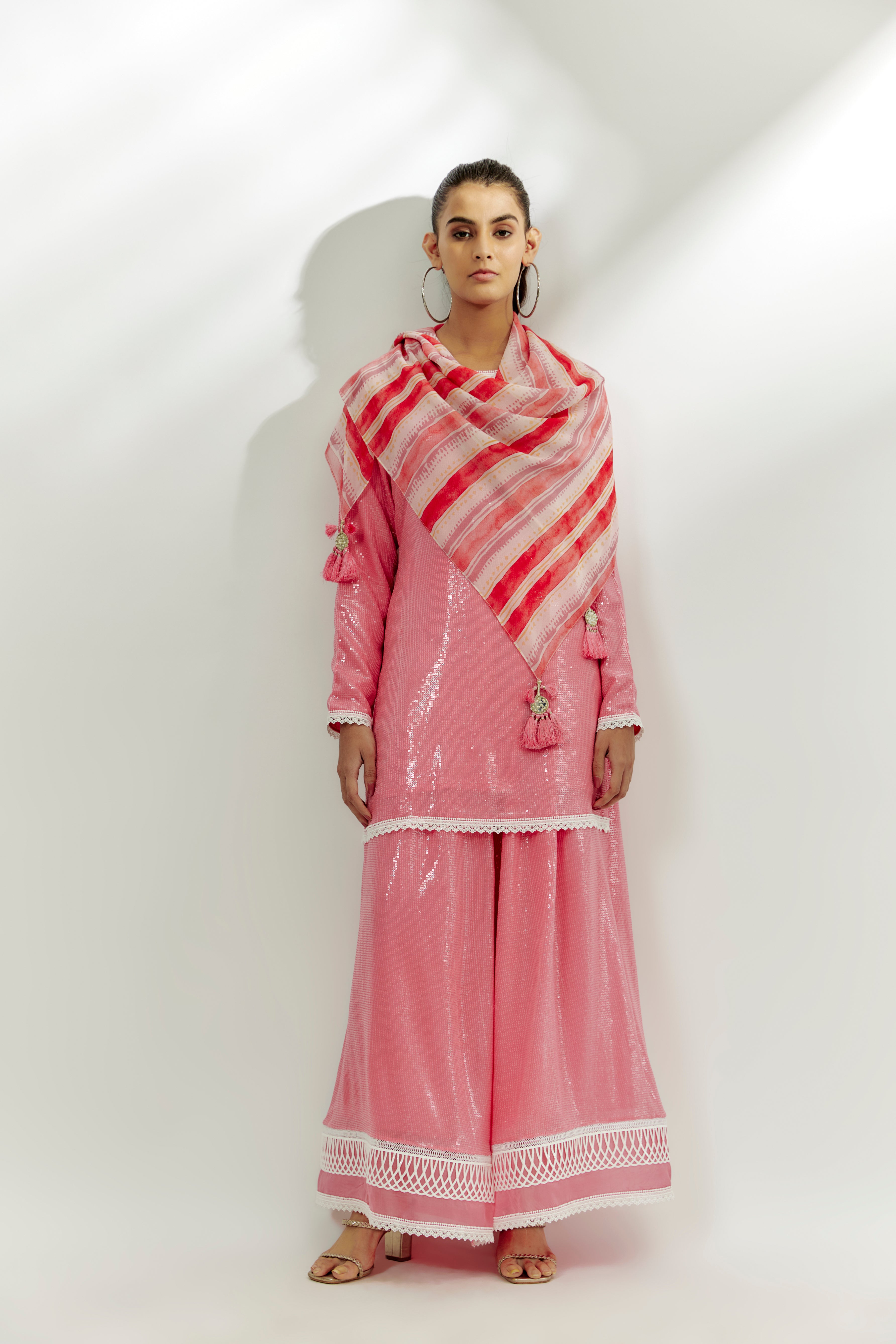 يتميز بكُرتا قصيرة بلون وردي باهت على قاعدة جورجيت. يتم تنسيقها مع بنطلون واسع وشال مطبوع. أبرزي إطلالتك مع مجوهرات بارزة وكعب عالٍ لمناسبة احتفالية.