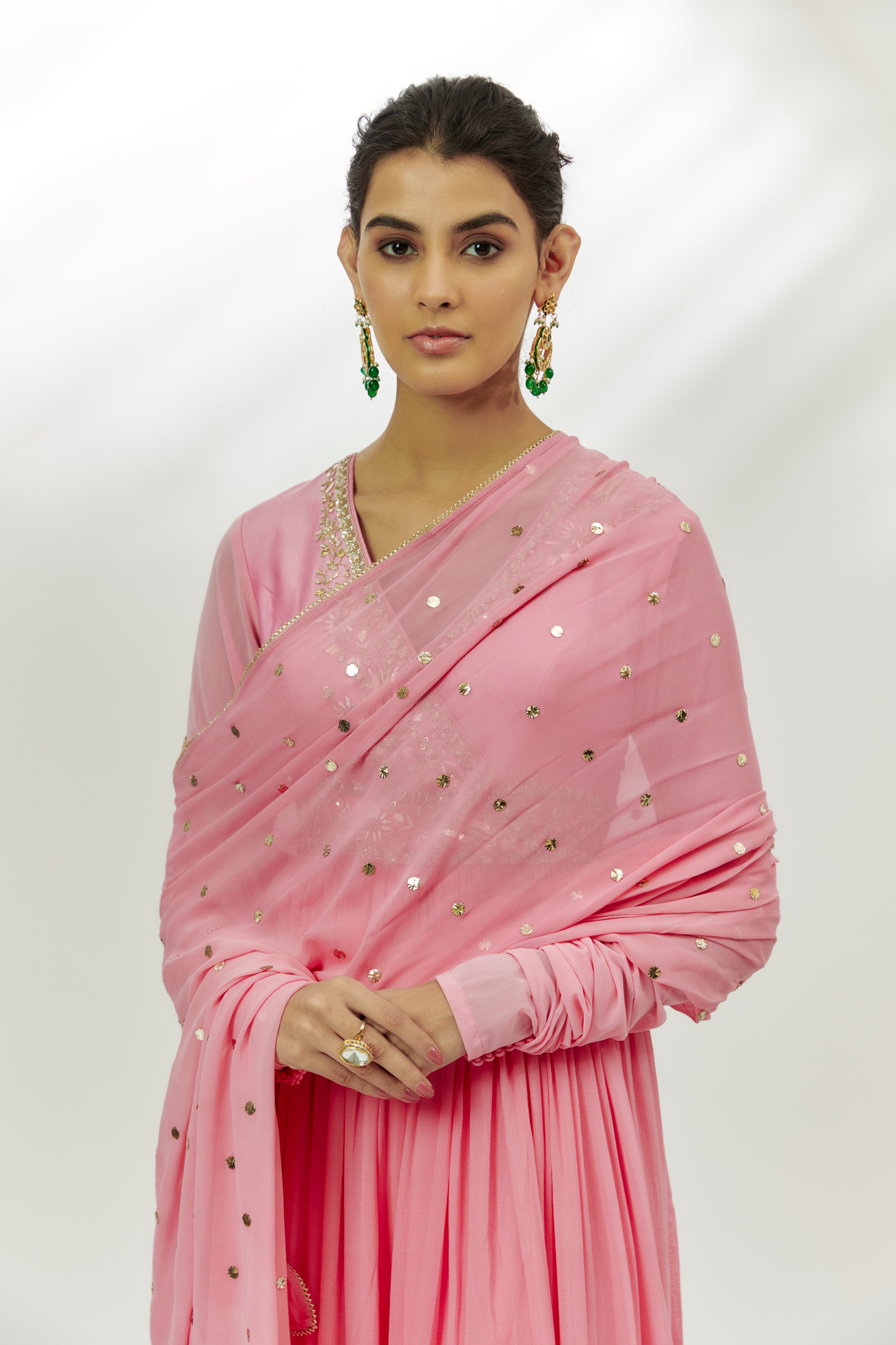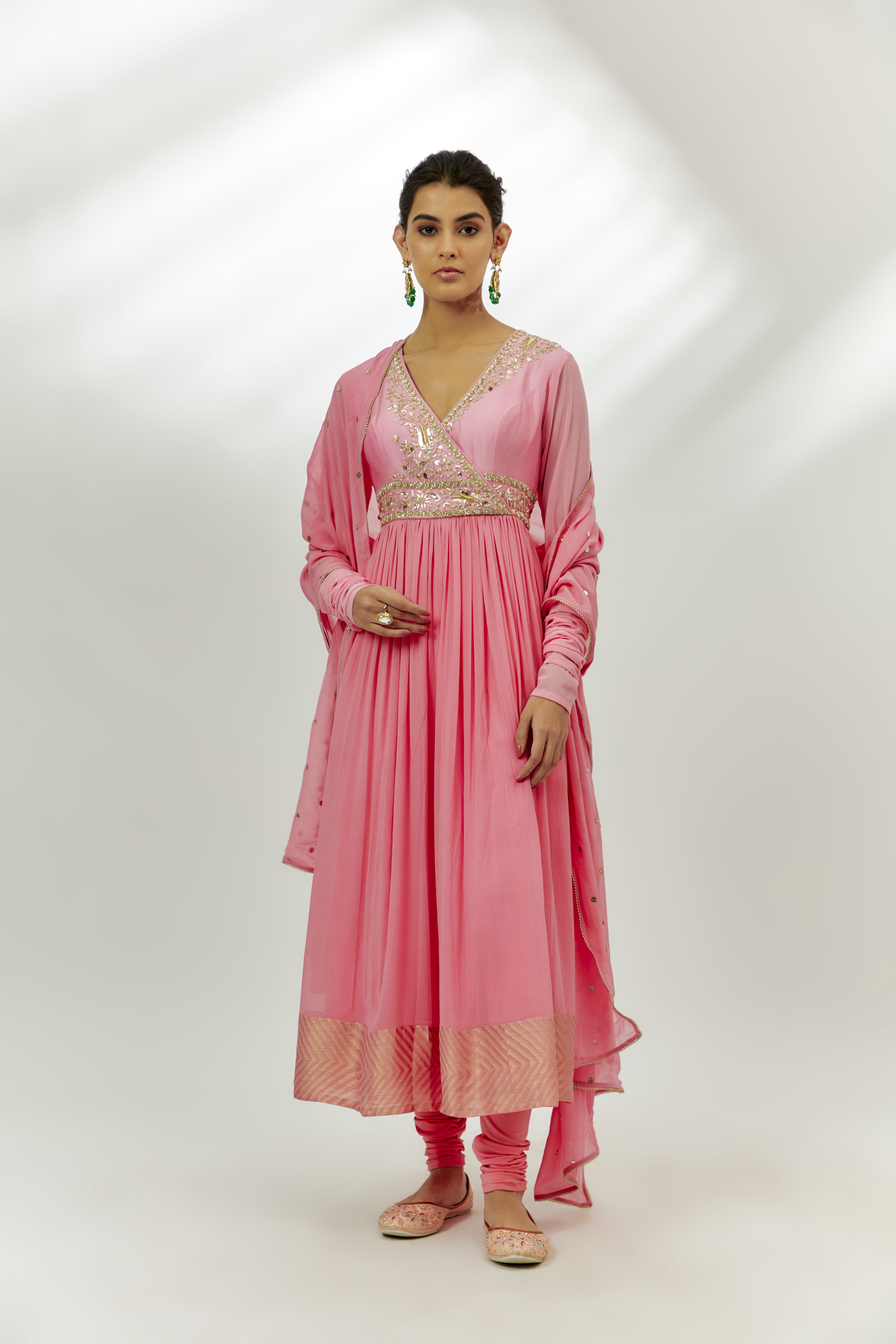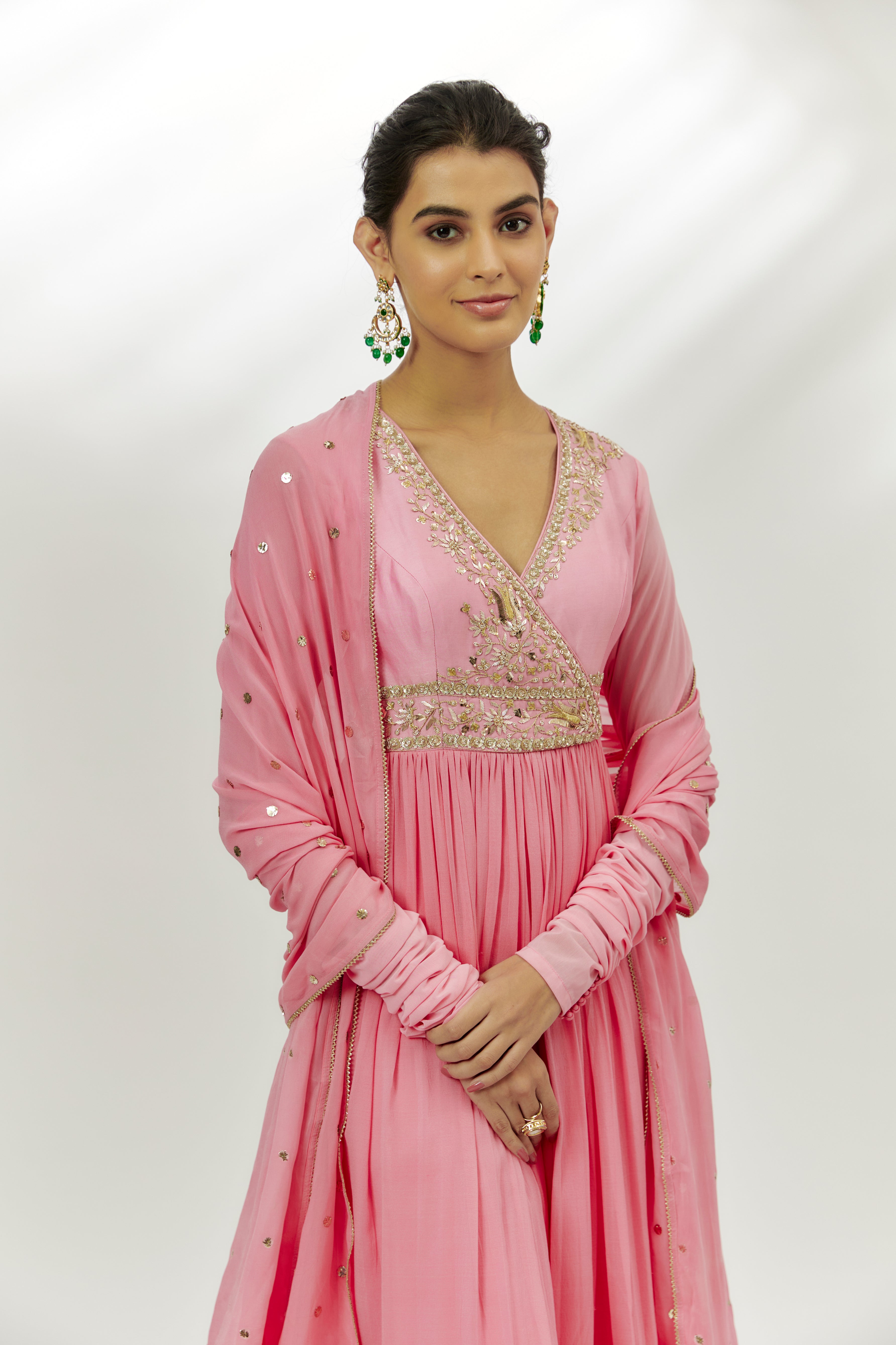يتميز بملابس أنغراخا أناركالي باللون الوردي الباستيل على قاعدة تشانديري مع عمل مارودي وزردوسي. يتم تنسيقه مع بنطلونات لايكرا تشوريدار ودوبيتا جورجيت. أضف لمسة مع مجوهرات بارزة وكعب عالٍ لمناسبة احتفالية.