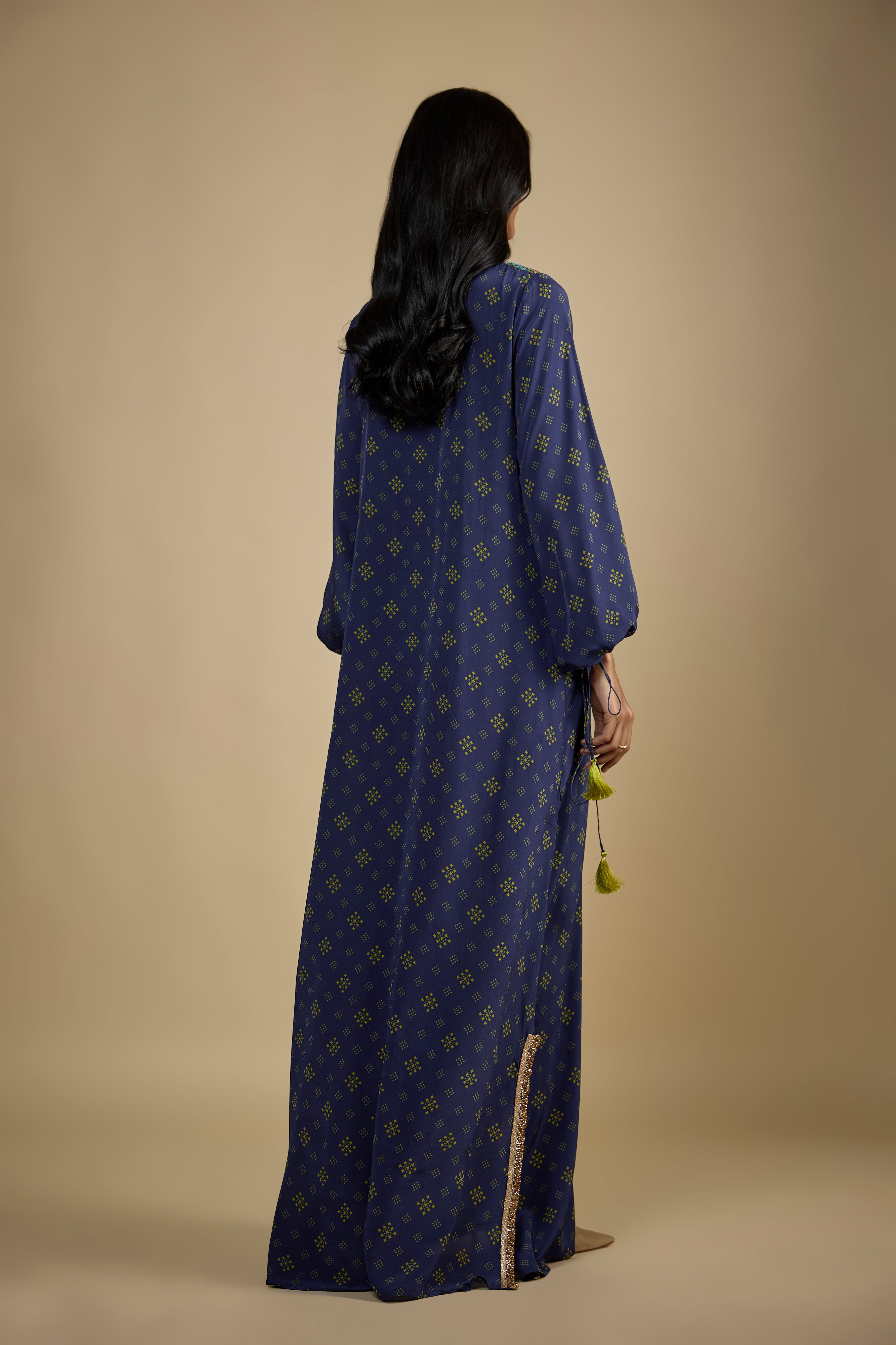 يتميز بفستان كافتان برتقالي من الكريب المطبوع مع ترتر وتطريز لؤلؤ وتفاصيل شرابة ذهبية.