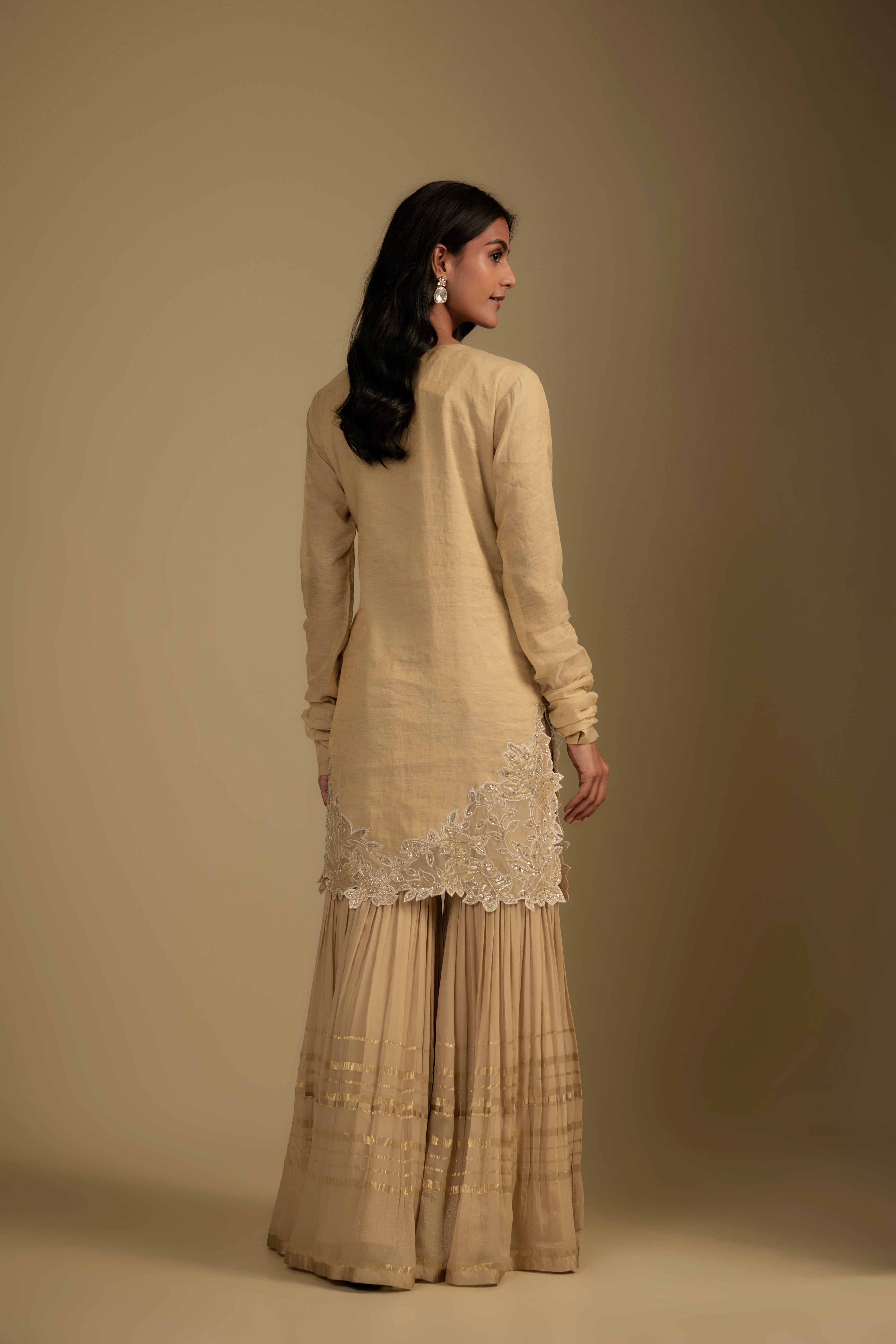 يتميز بكورتا بيج من قماش تشانديري مع تطريز قطع وزاردوسي. مزود ببنطلون جارارا مطابق ودوپتا من قماش جورجيت.