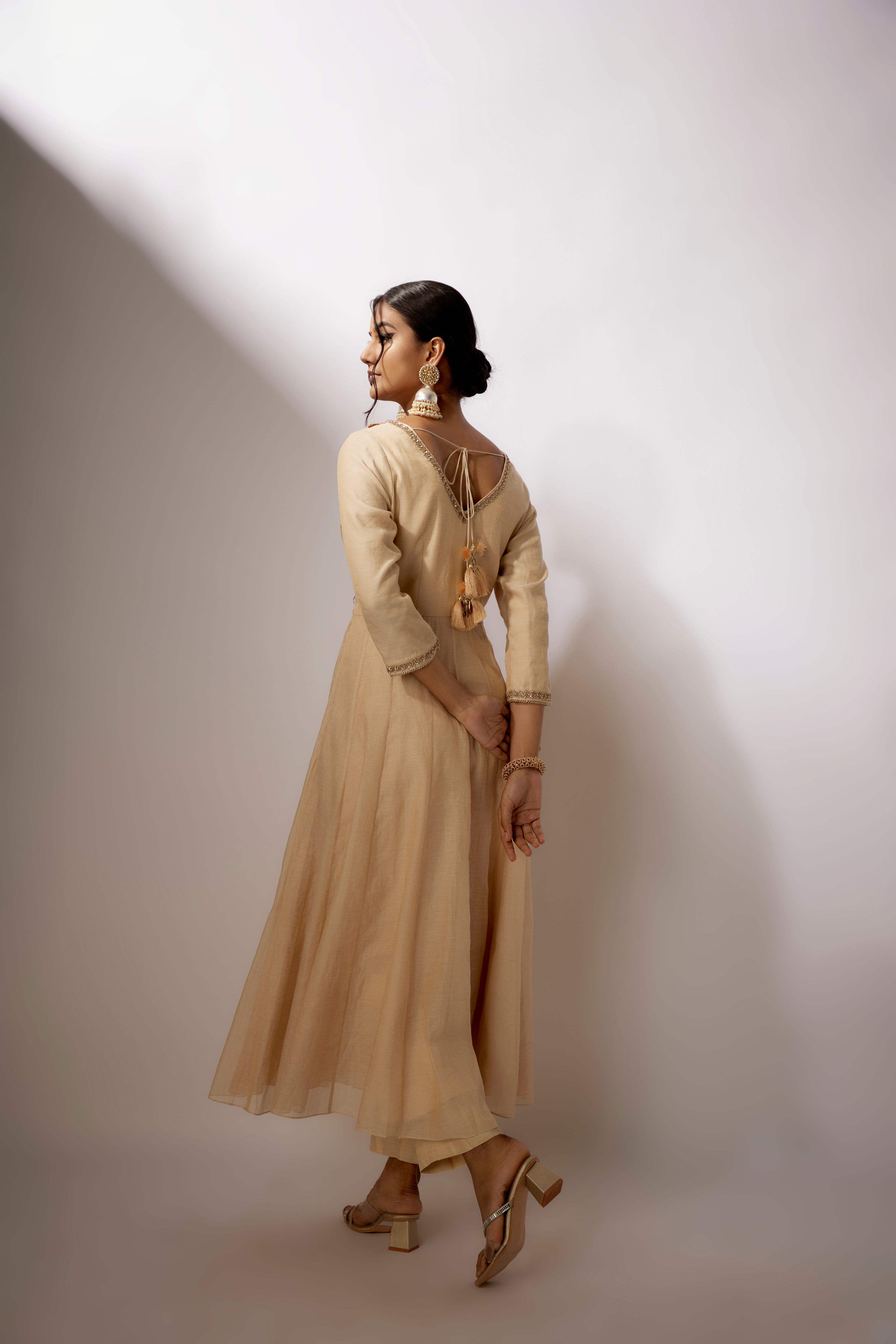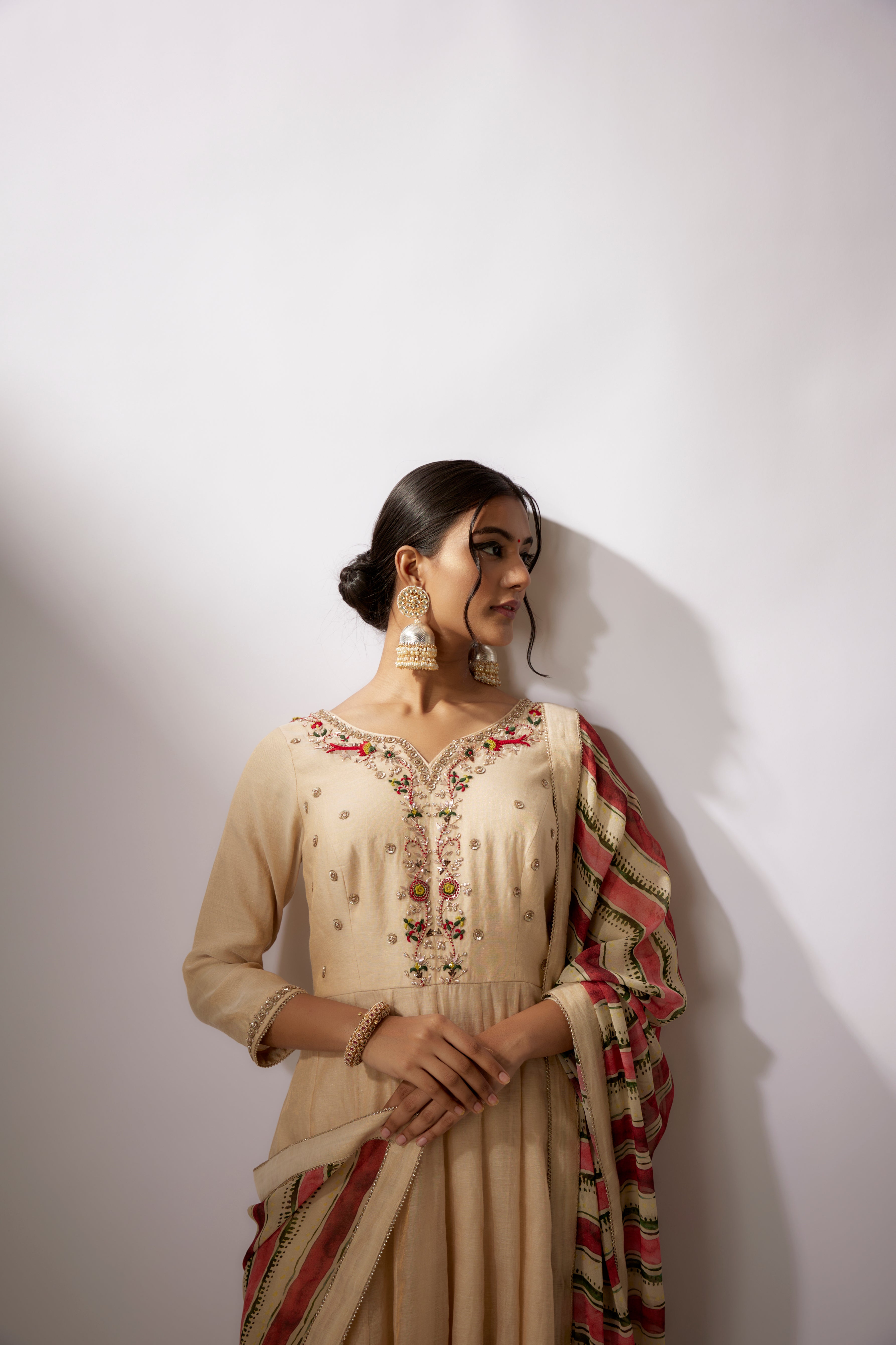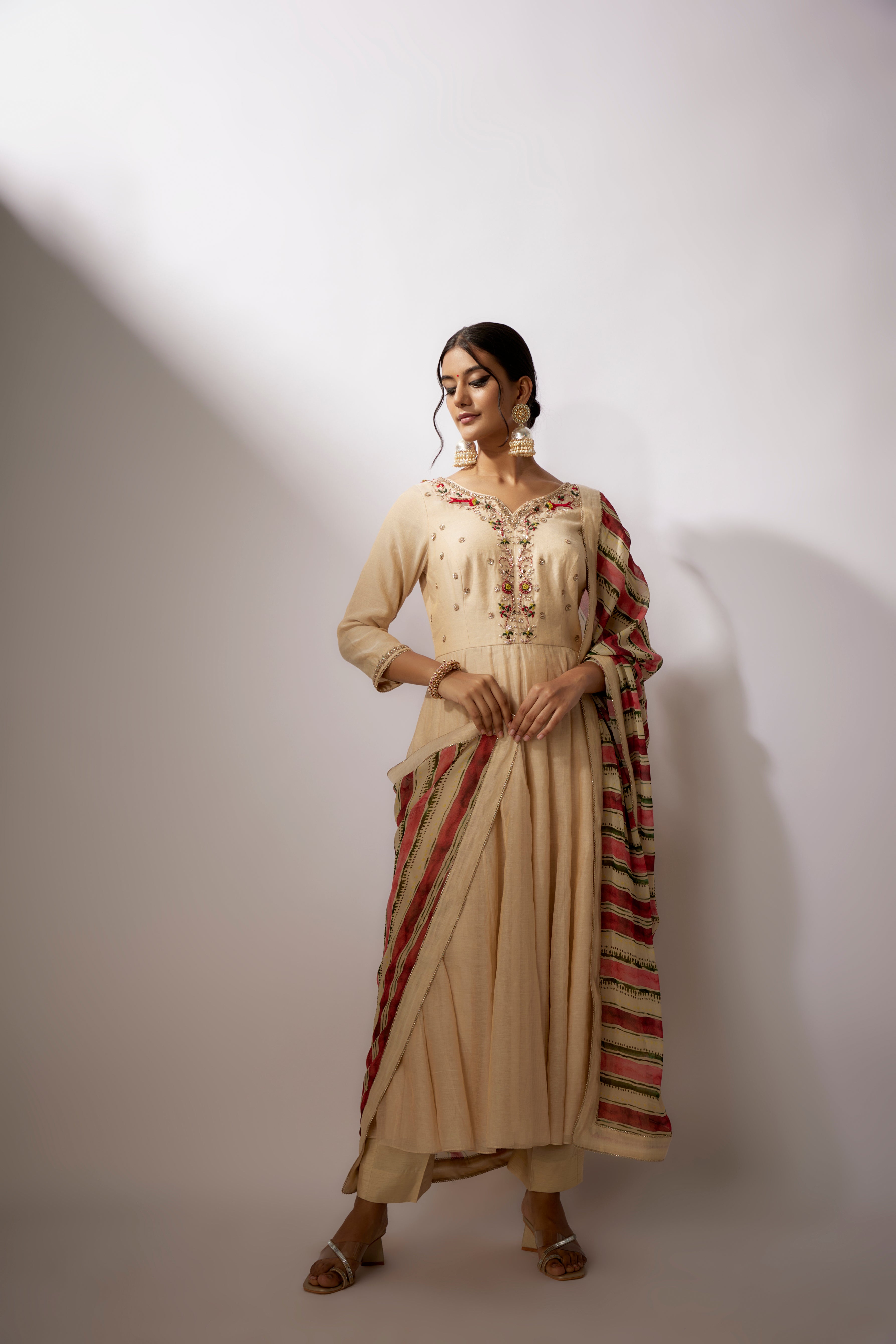 تتميز هذه القميص البيج المصنوع من قماش تشانديري مع تطريز زاردوسي. يأتي مع بنطلون دوبون مطابق ووشاح مخطط مطبوع من قماش جورجيت، مع حواف دانتيل.