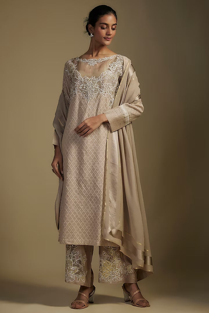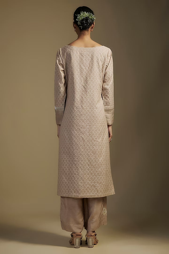يتميز بكُرتا طويلة بنية اللون من قماش الشانيري وقاعدة الأورغنزا مع تطريز بالخرز، أنابيب، وعمل تطبيق. يتم تنسيقه مع بنطلون مستقيم من حرير الدوبون ودوباتا جورجيت. أبرزي مع مجوهرات بارزة وكعب عالٍ للمناسبات الاحتفالية أو حفلات الزفاف.