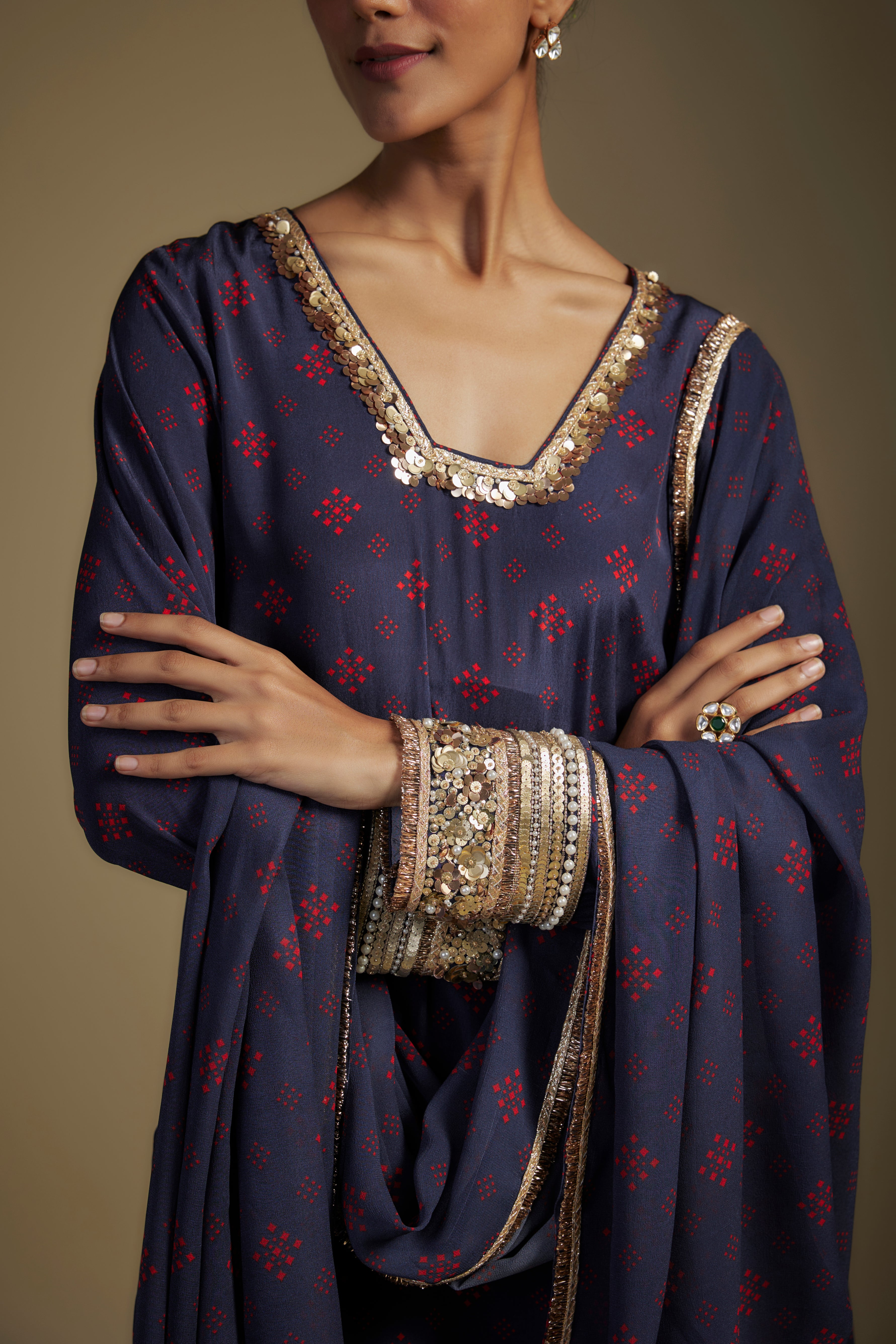 تتميز بكورتا مطبوعة باللون الأزرق الداكن من قماش الكريب مع ترتر، تطريز باللؤلؤ والزردوسي. مزودة بدوباتا جورجيت مطبوعة متناسقة وبالازوز مطرزة من حرير الدوبيون.