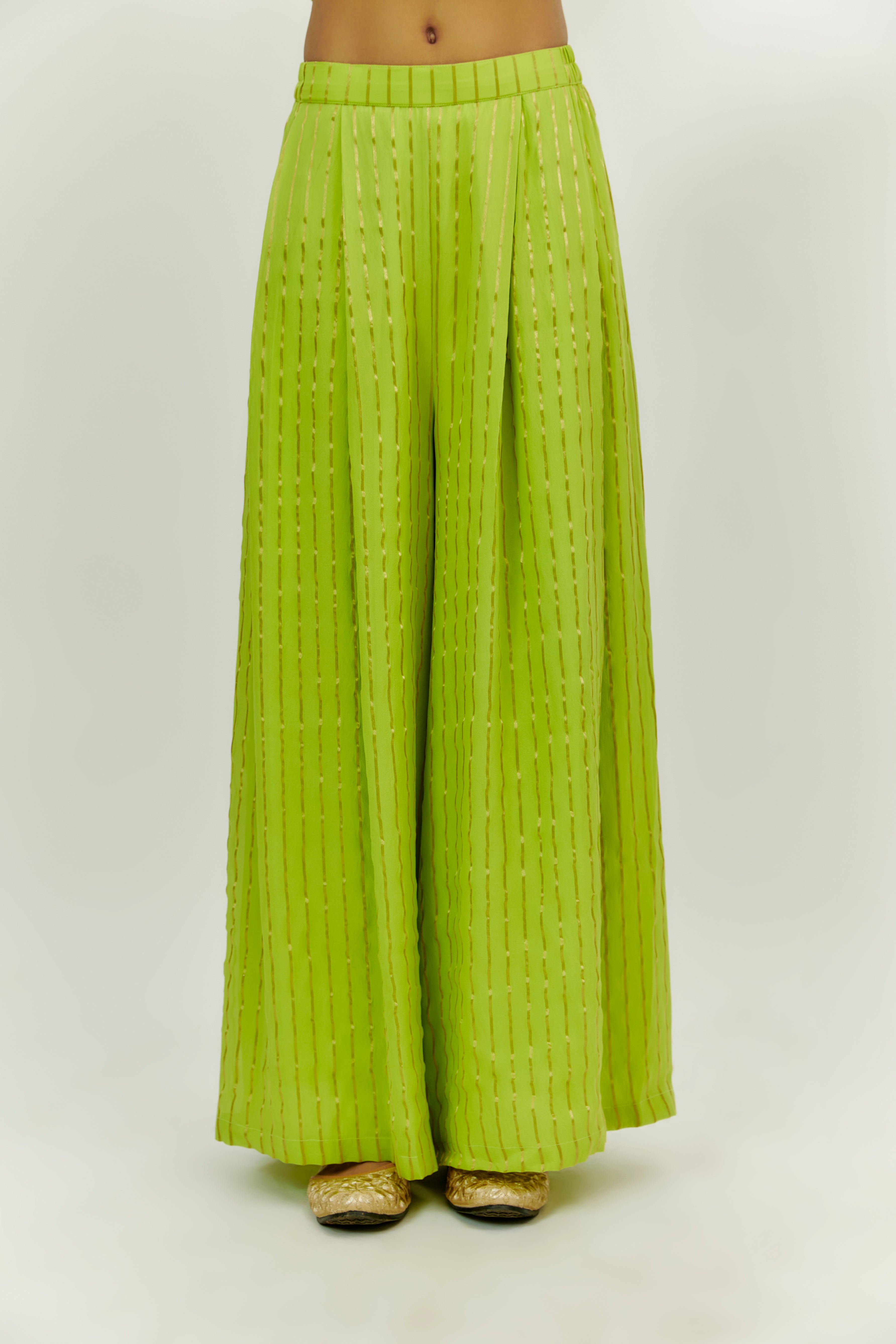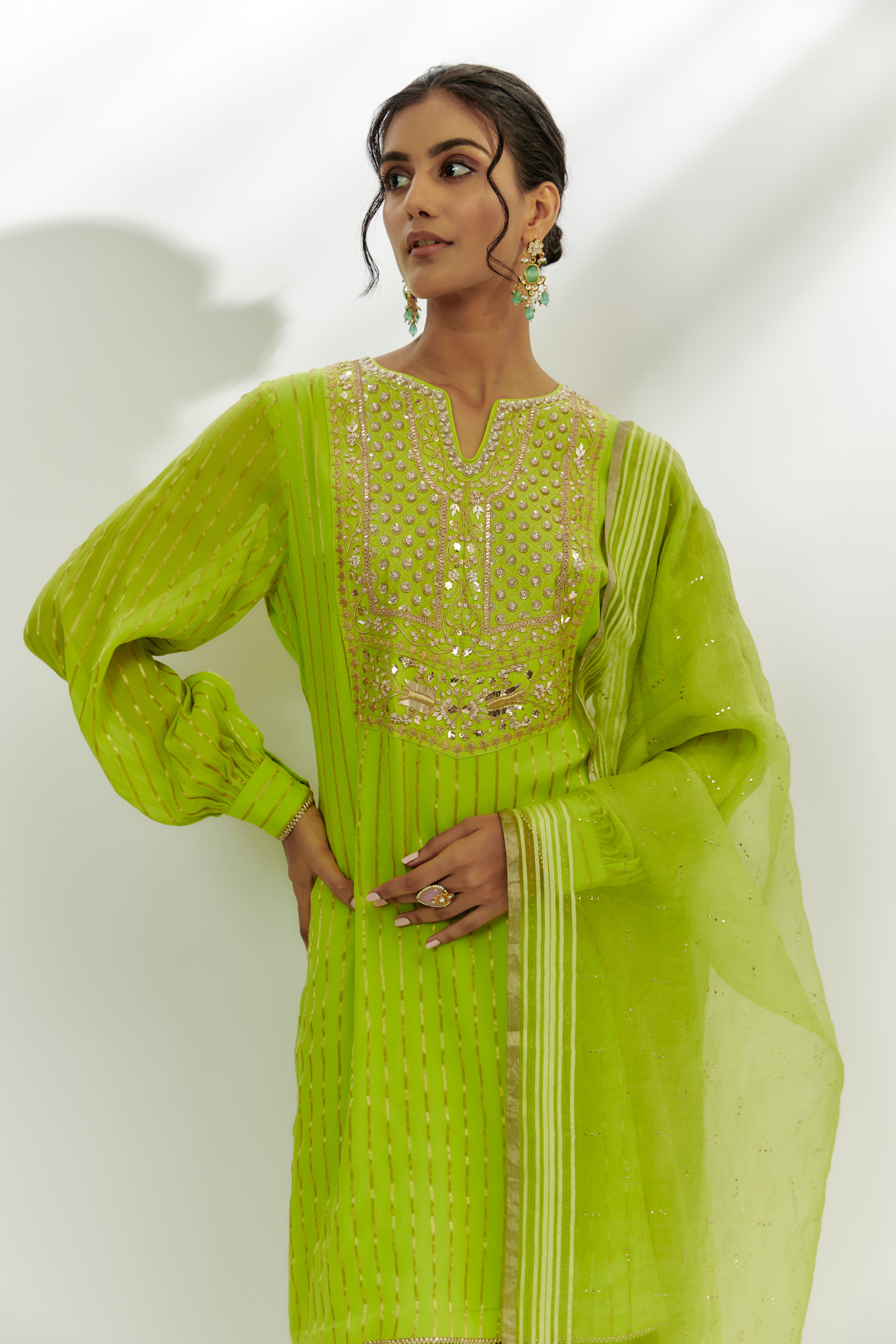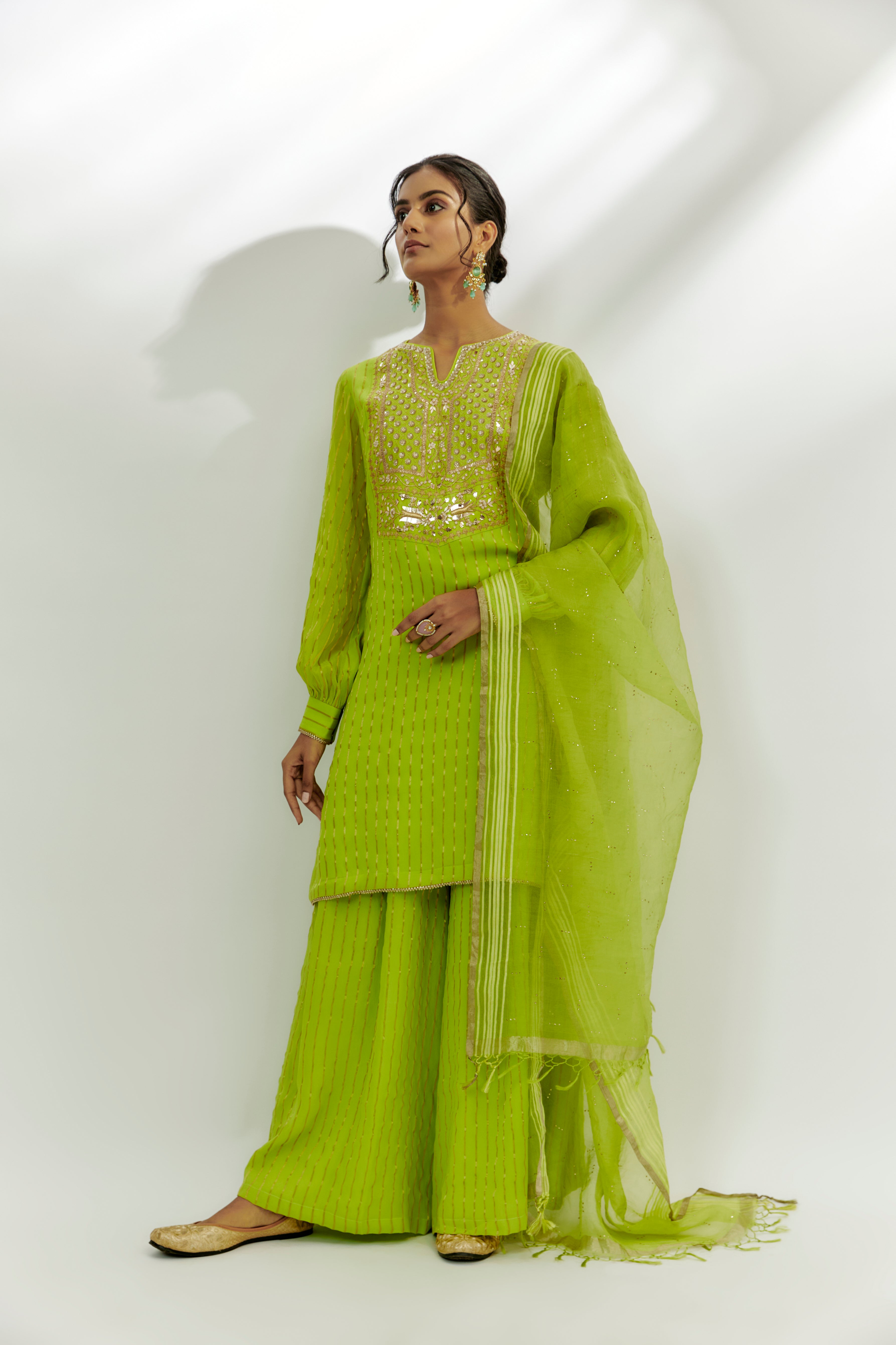 تتميز بكُرتا بلون أخضر ليموني على قاعدة جورجيت مع عمل مارودي وزردوسي. يتم تنسيقها مع بنطلونات واسعة ودوبيتا أورغنزا. أبرزيها بمجوهرات بارزة وكعب عالٍ لمناسبة احتفالية.