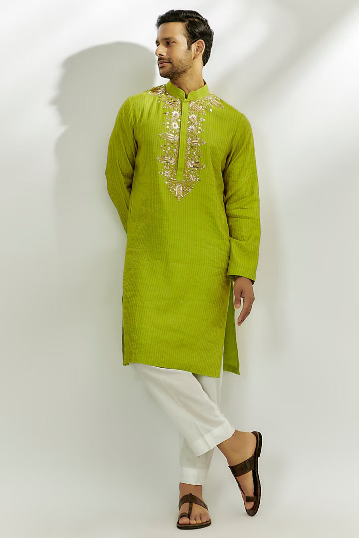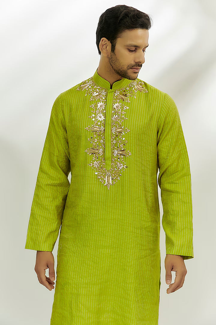 يتميز بكُرتا بلون أخضر ليموني مصنوع من قماش الشانيري الحريري مع زردوزي، ومارودي، وتطريز بالخيوط. ملابس مثالية للمناسبات الاحتفالية.