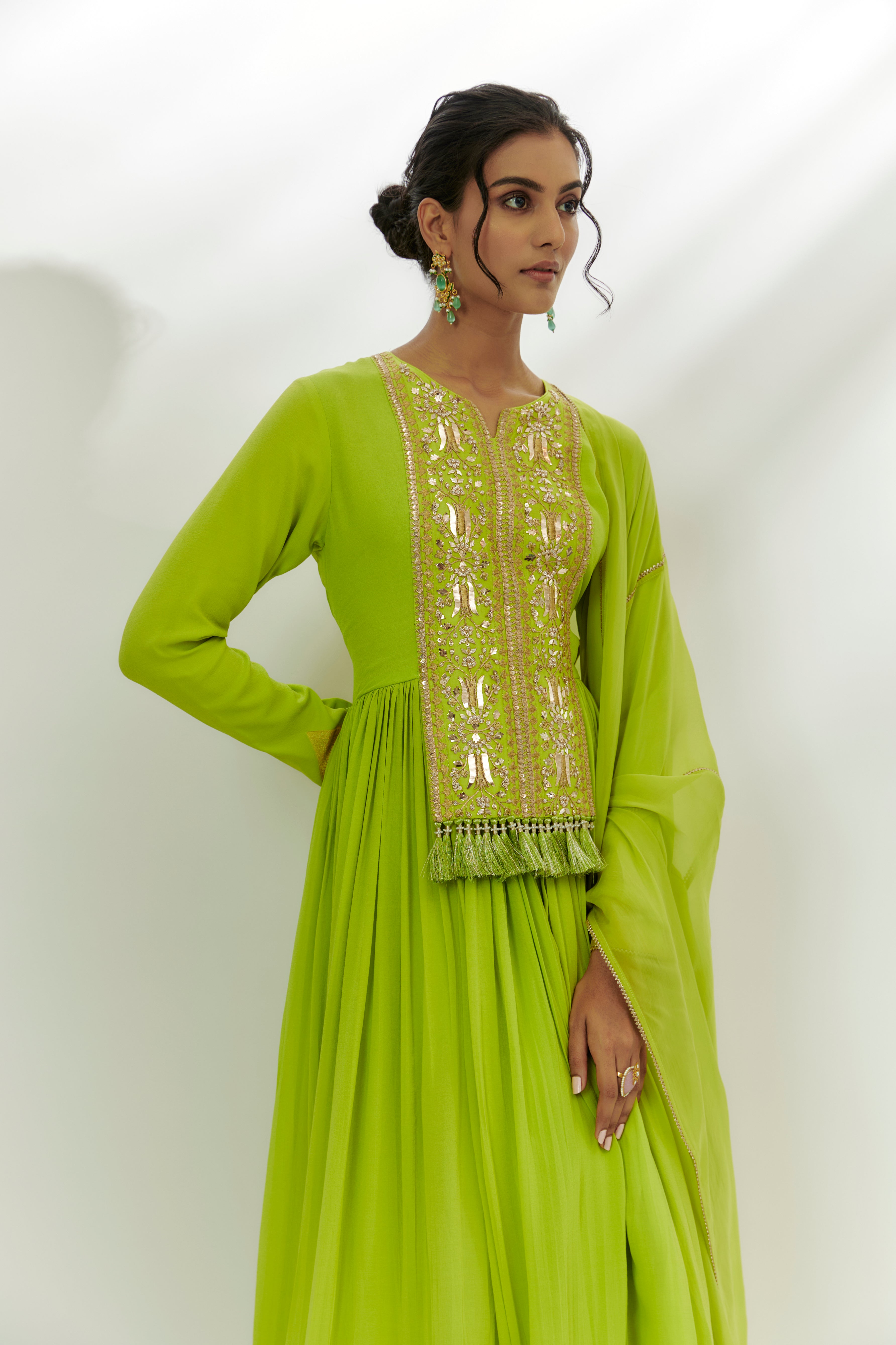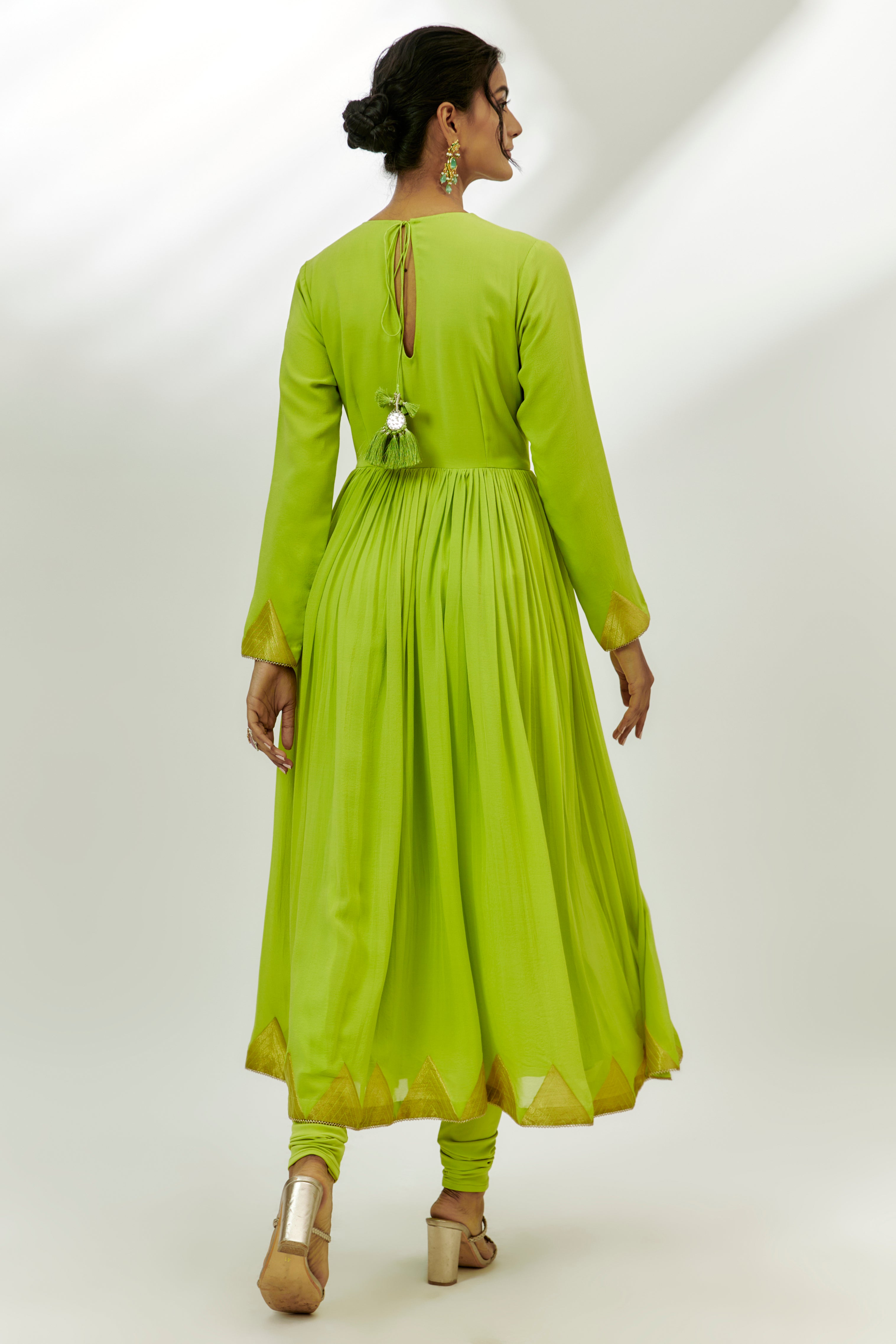 Featuring a lime green anarkali in chanderi base with marodi and zardosi work. It is paired with lycra churidar pants and an organza dupatta. Accentuate with statement jewellery and heels for a festive occasion.