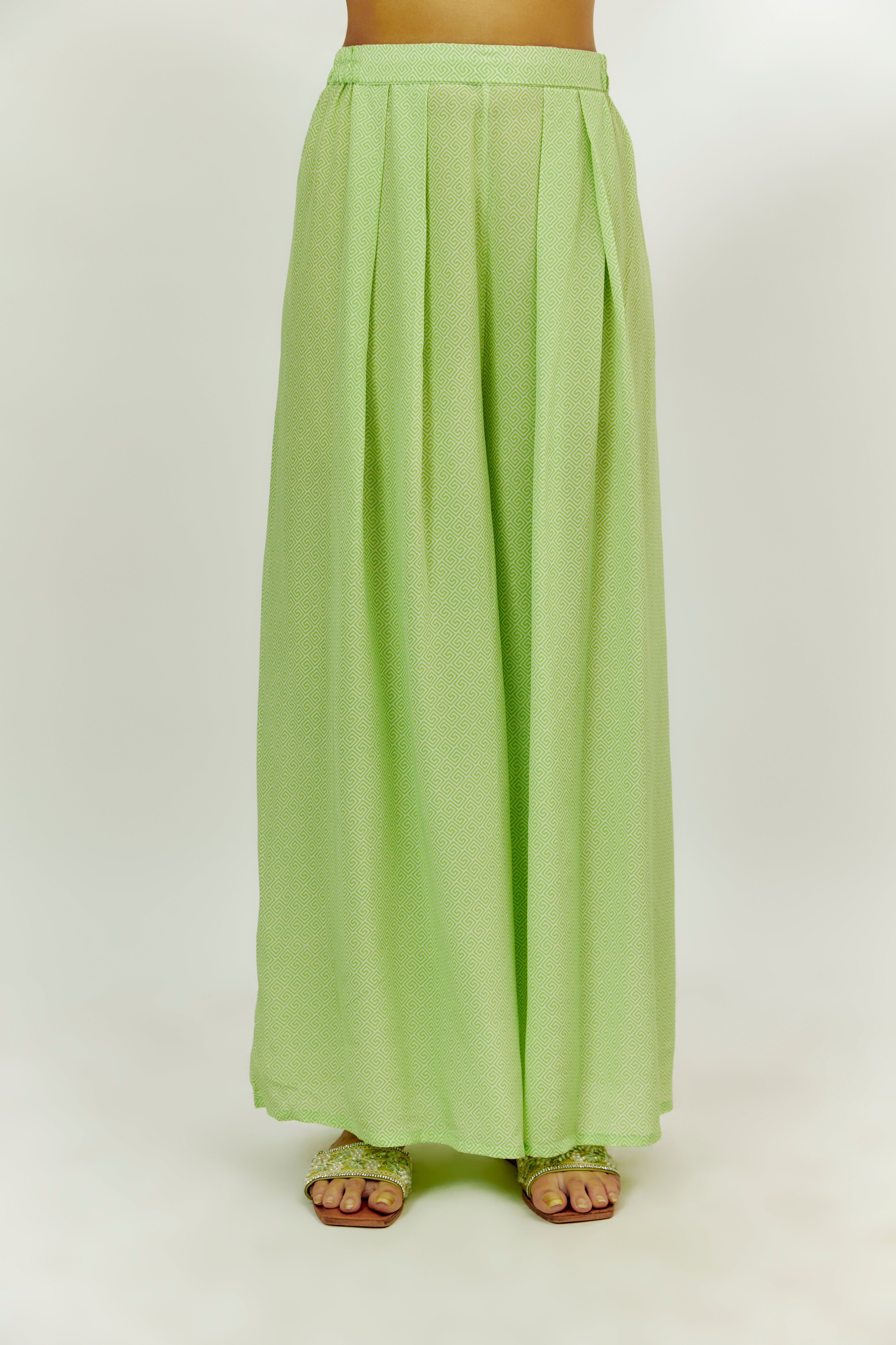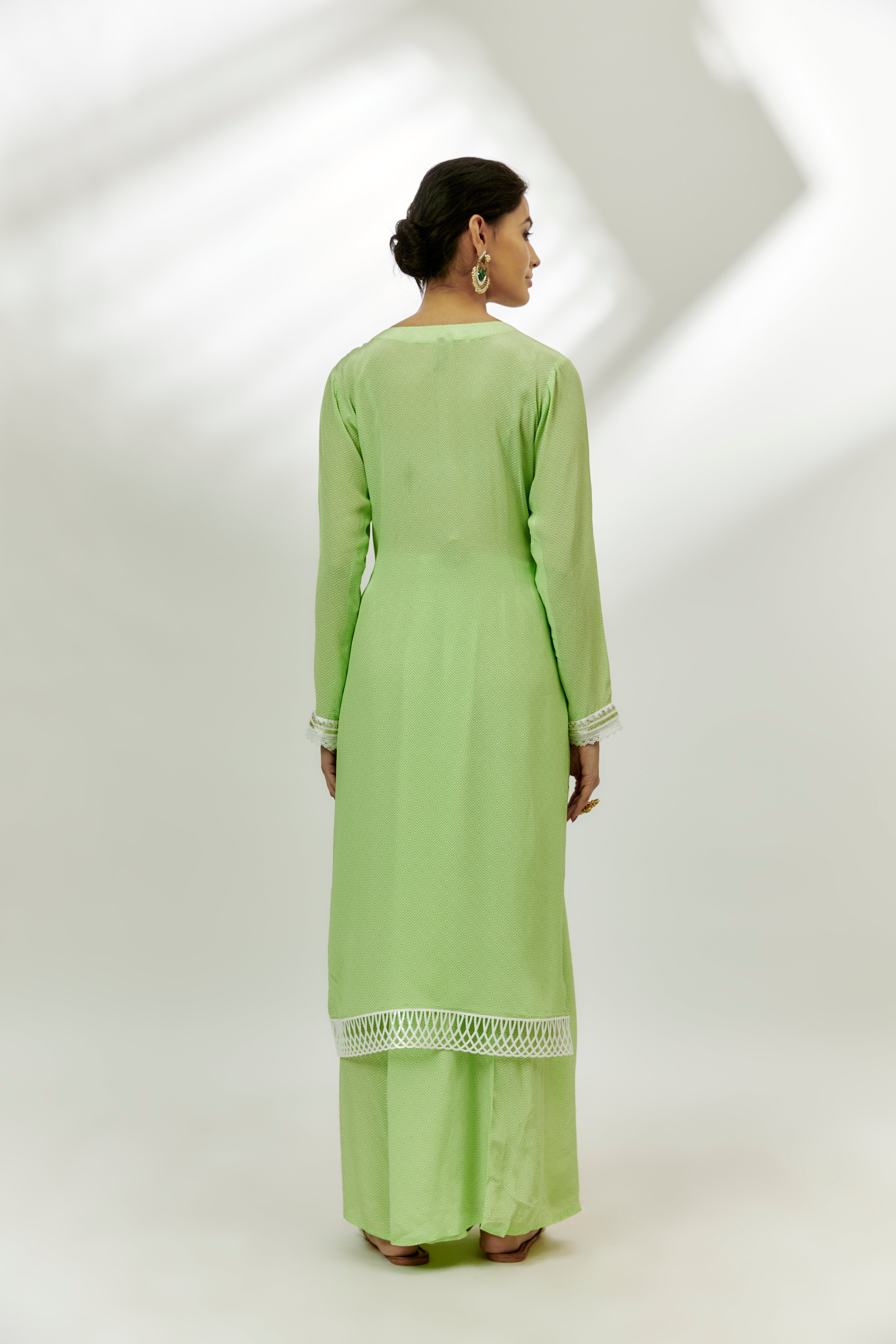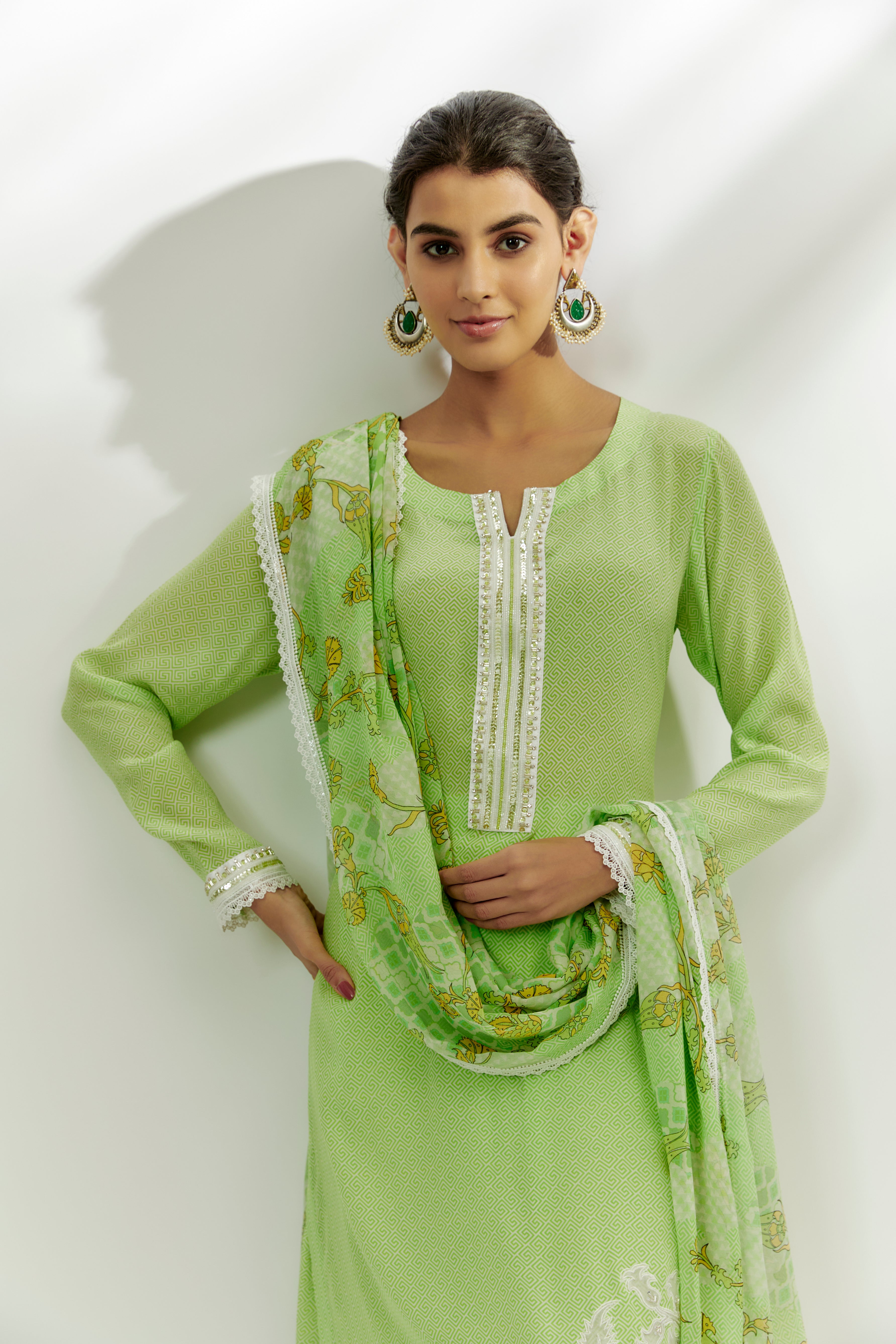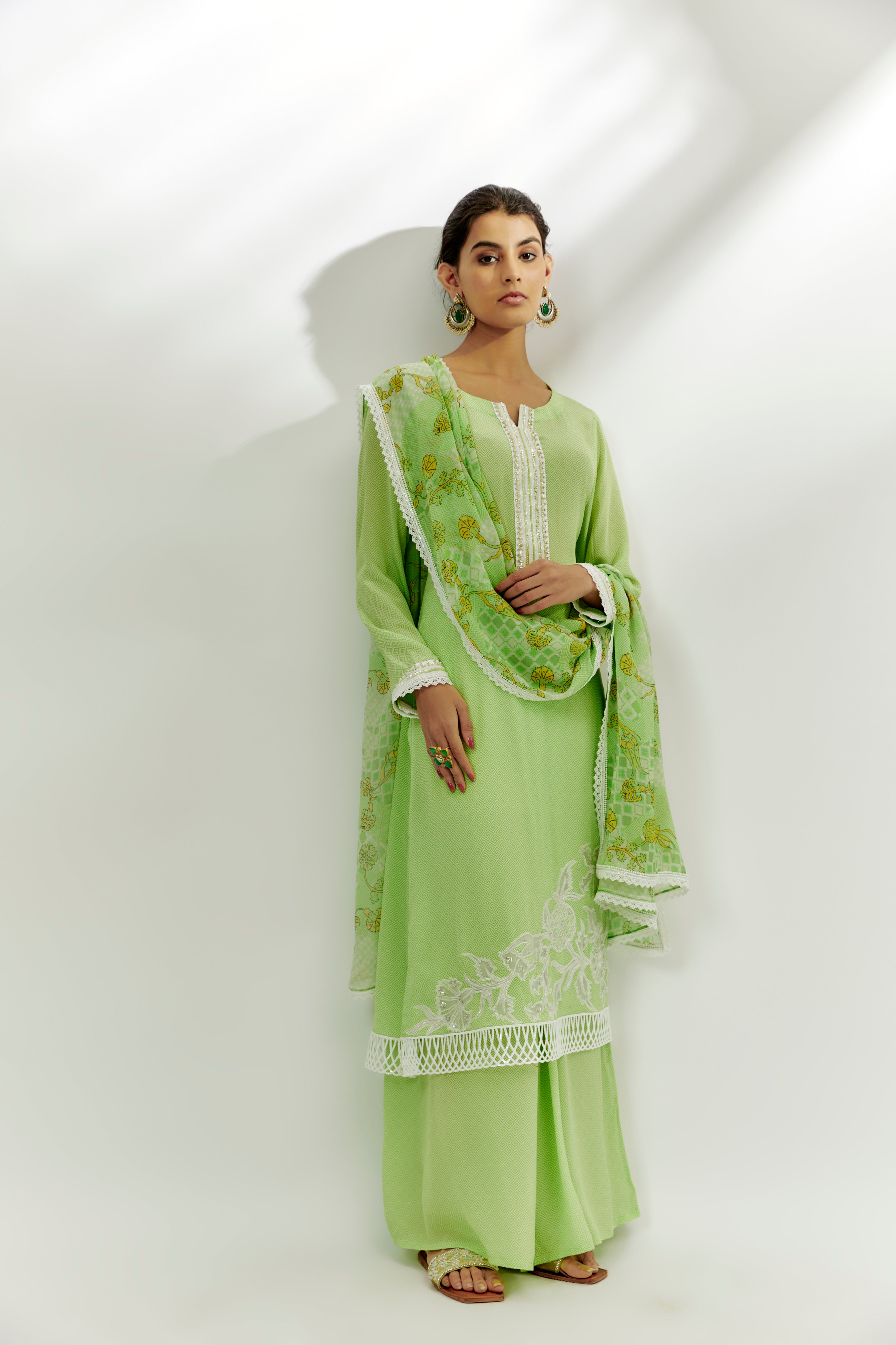 Featuring a lime green kurta in crepe base with print, cutwork and sequins embroidery. It is paired with palazzo pants and a georgette printed dupatta. Accentuate with statement jewellery and heels for a festive occasion.