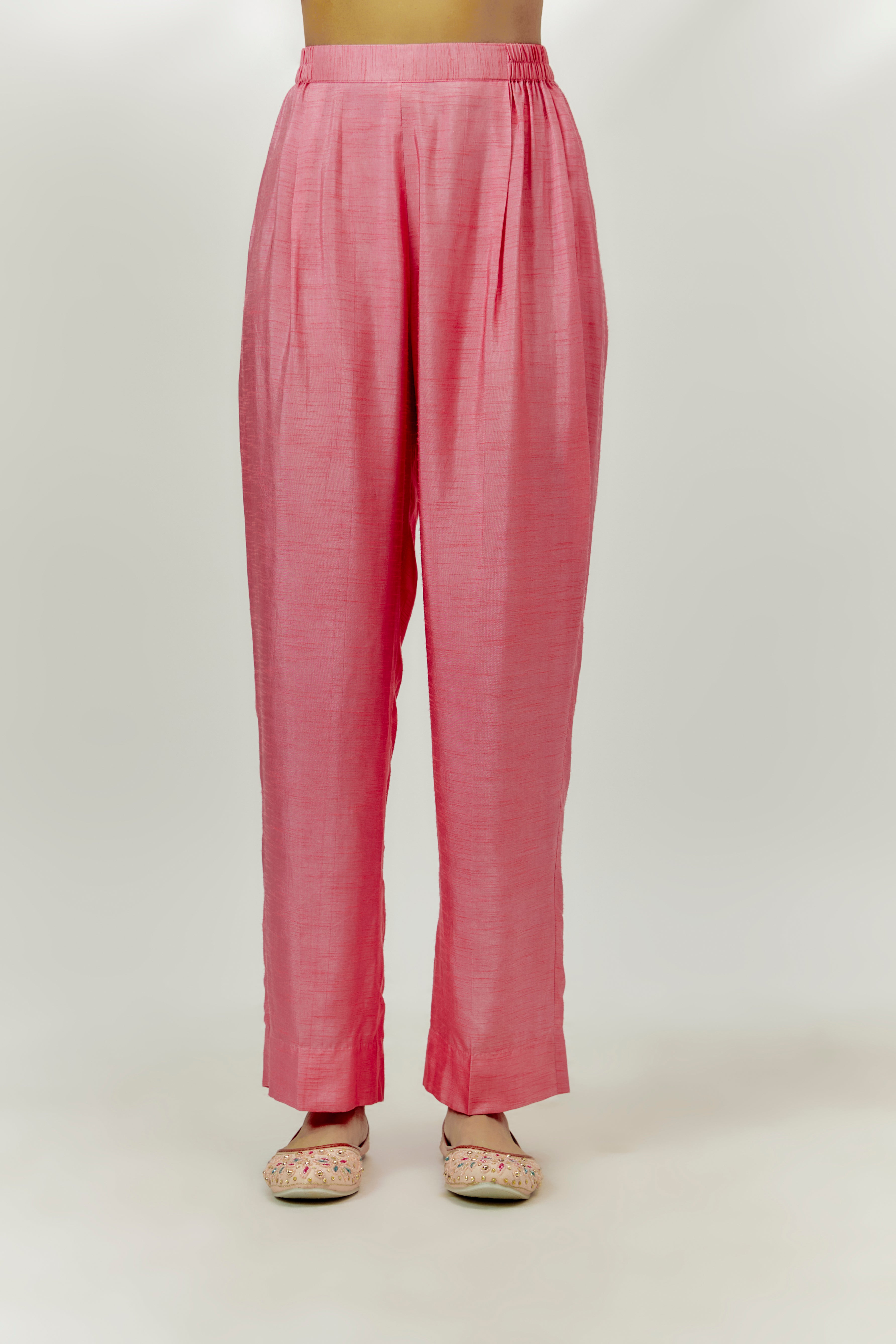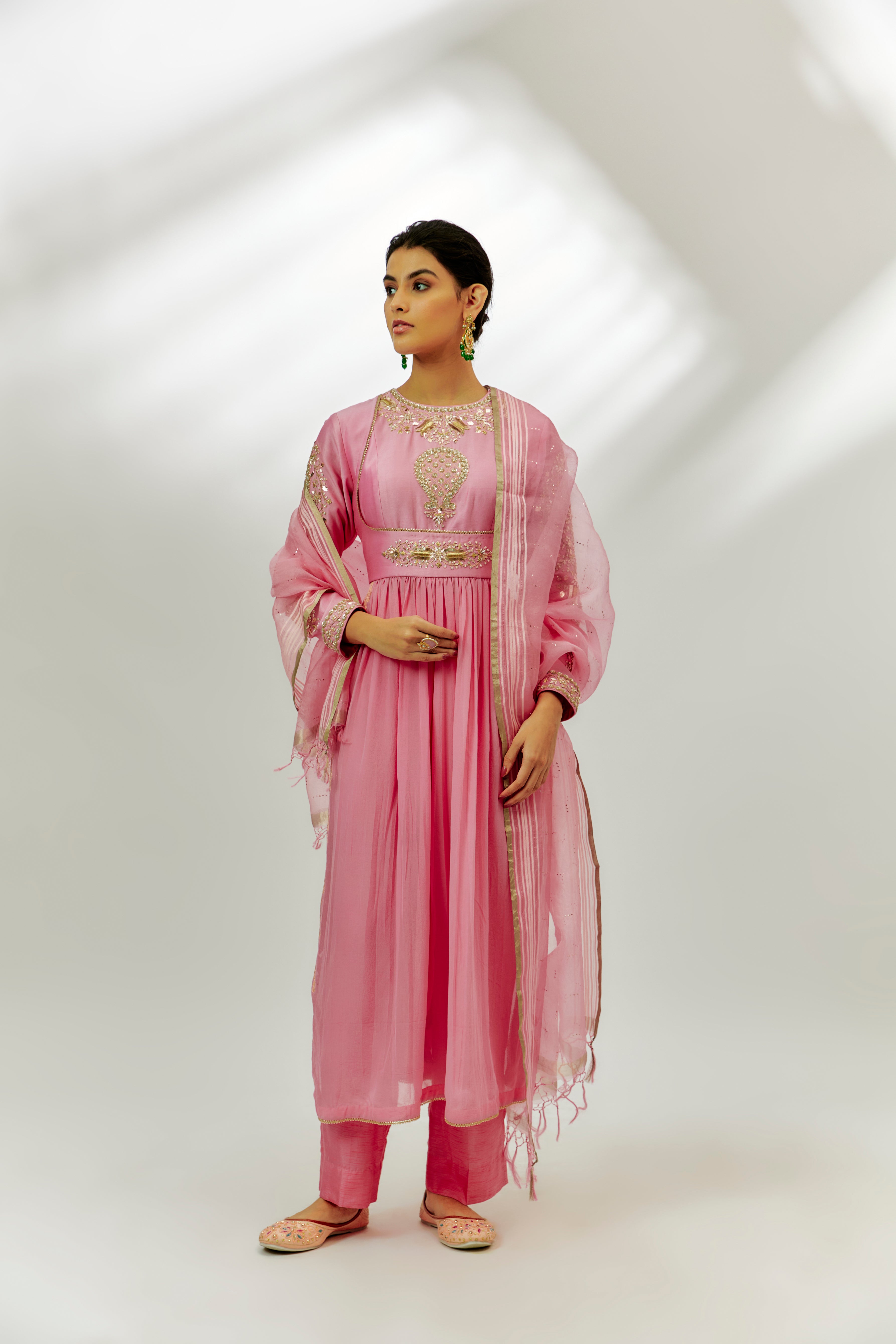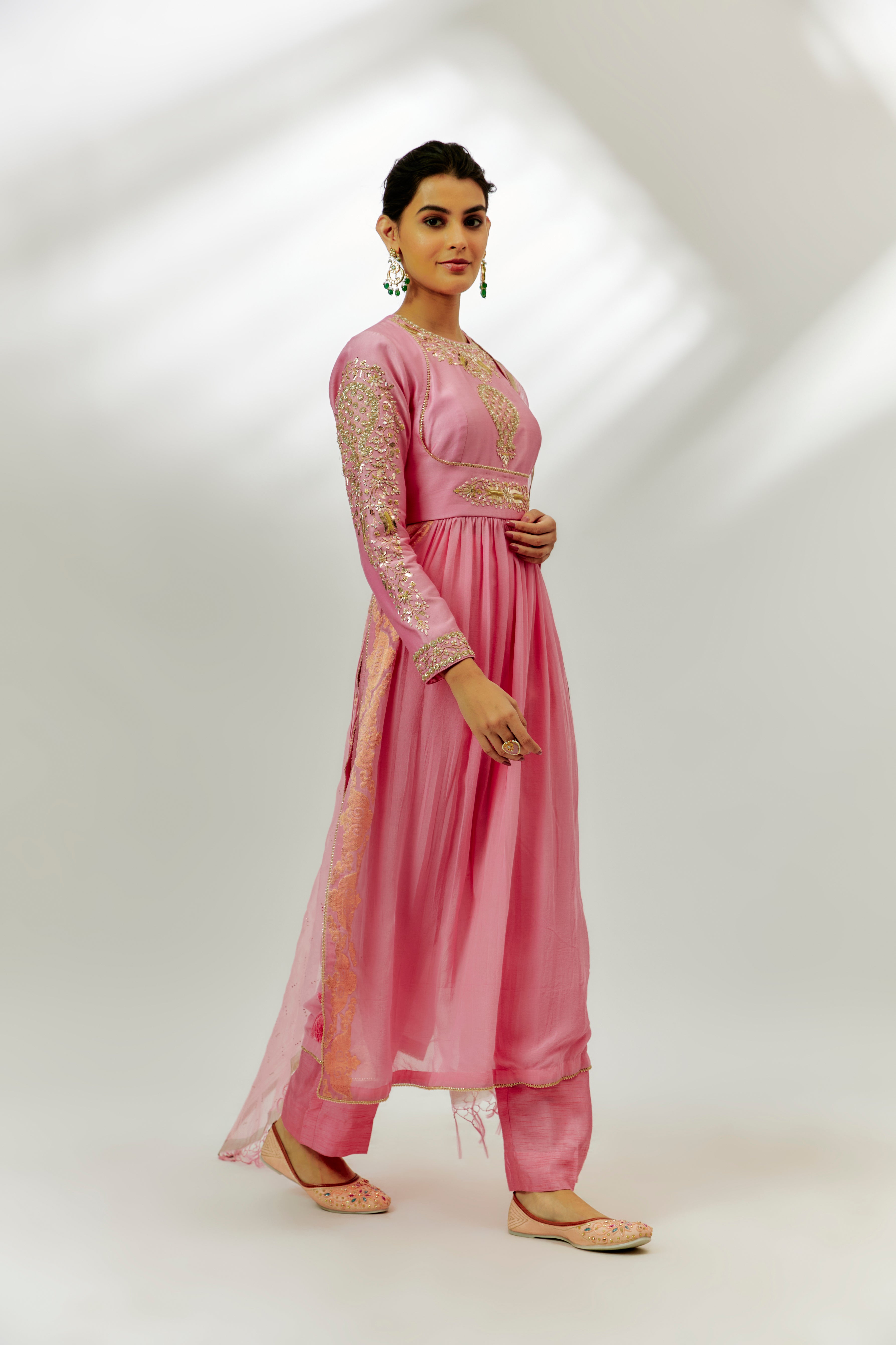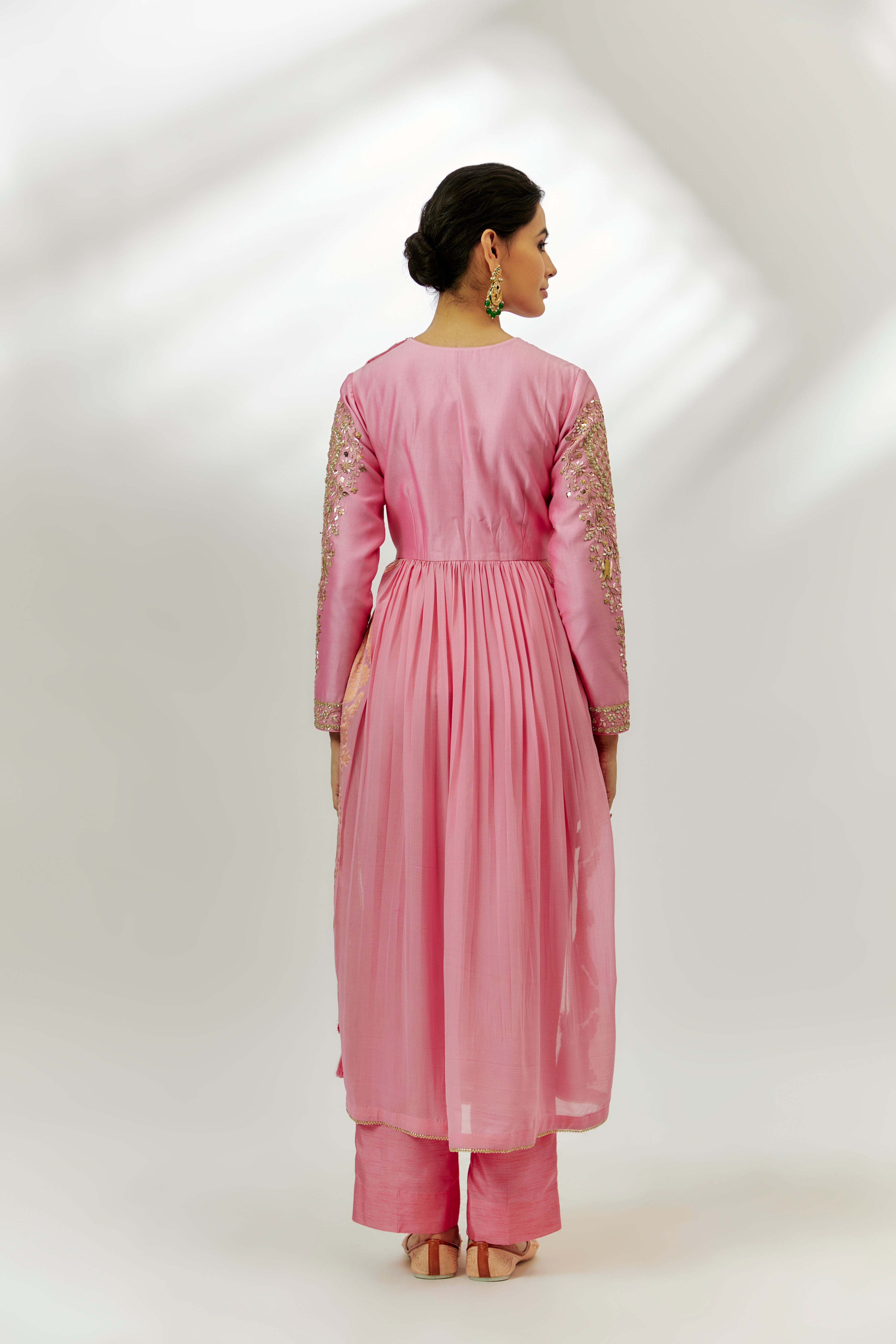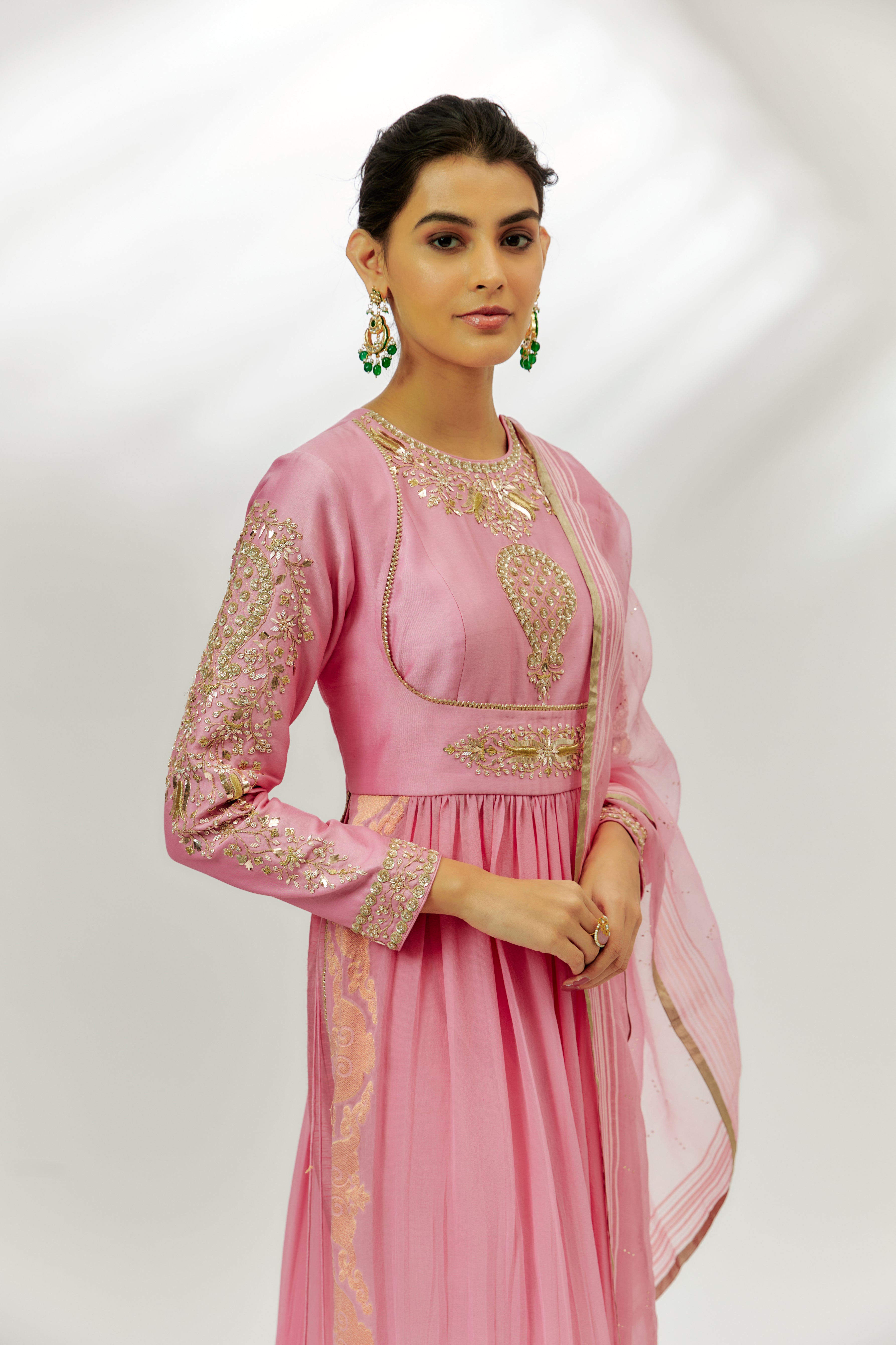 Featuring a pastel pink achkan-style anarkali in chanderi base with marodi and zardosi embroidery. It is paired with dupion straight pants and a georgette badla work dupatta. Accentuate with statement jewellery and heels for a festive occasion.