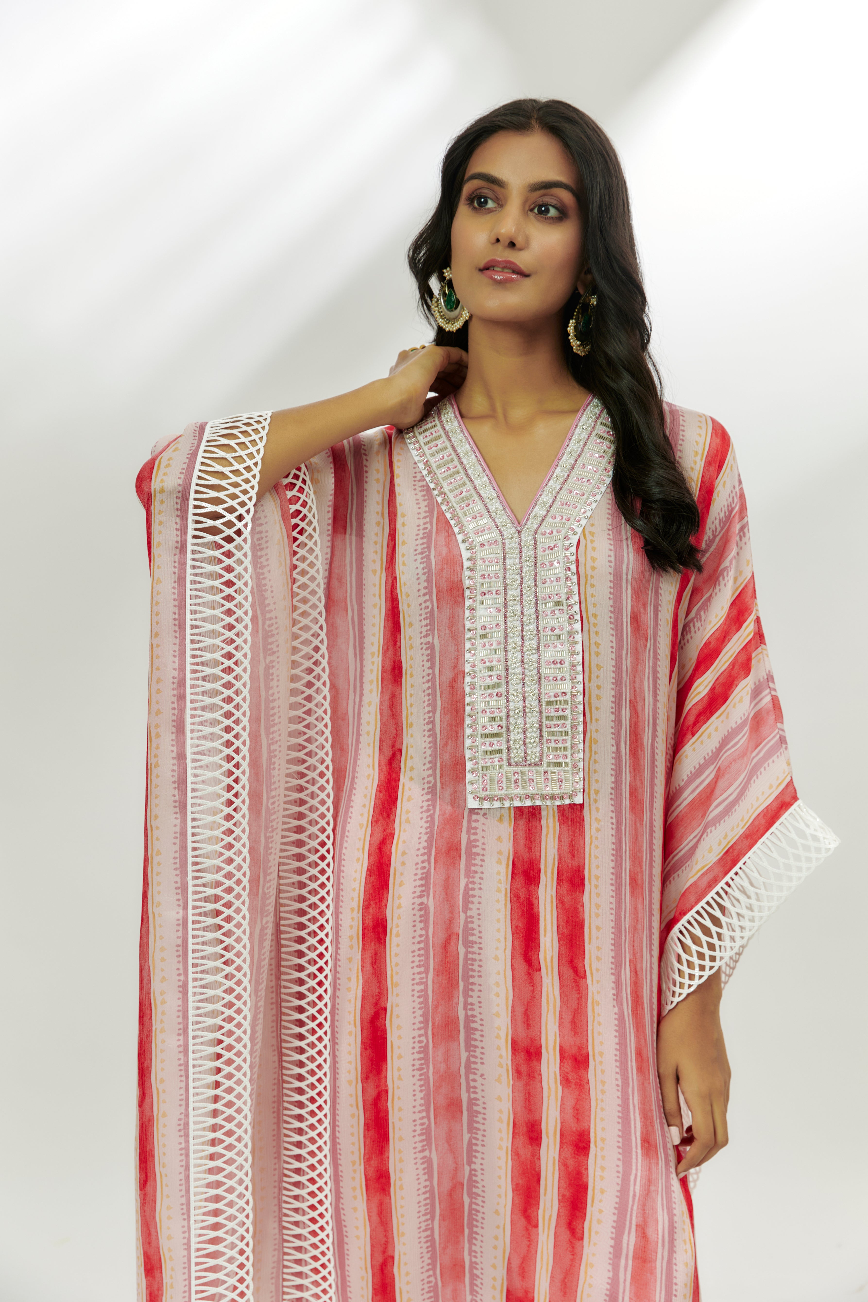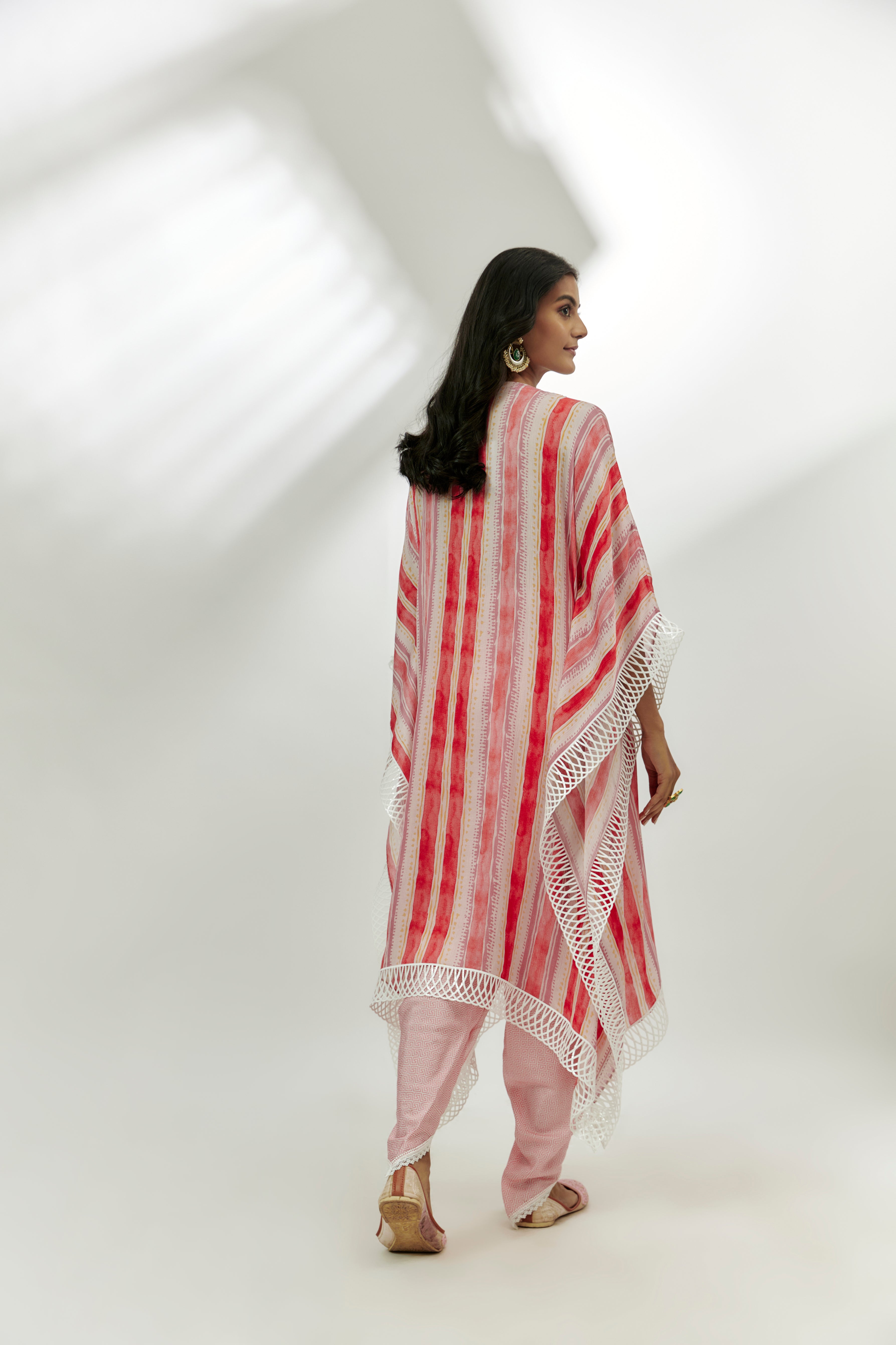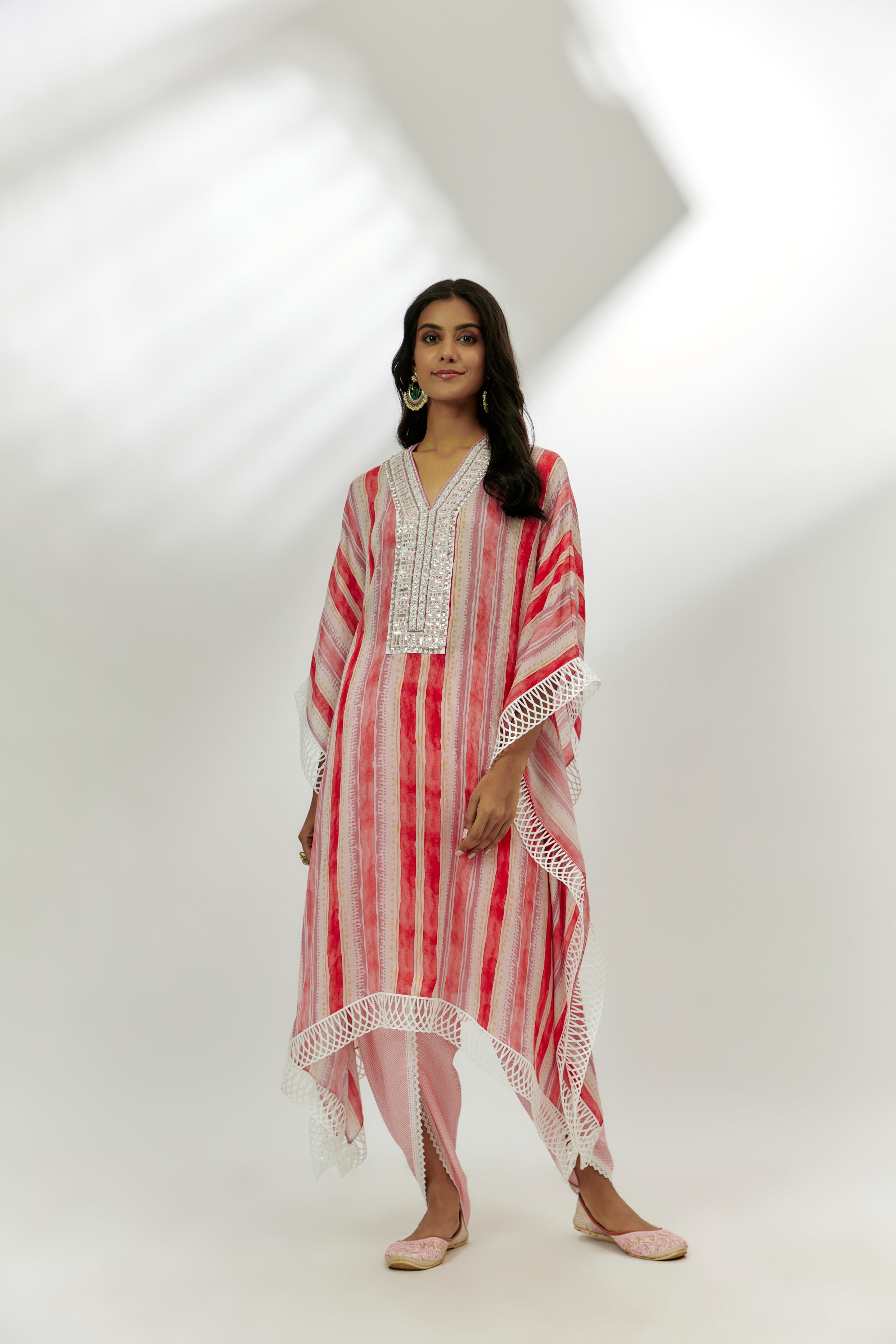 Featuring a pastel pink kaftan in cotton crush base with stripe print and sequins embroidery. It is paired with dupion dhoti pants. Accentuate with minimal jewellery and heels for a festive occasion.
