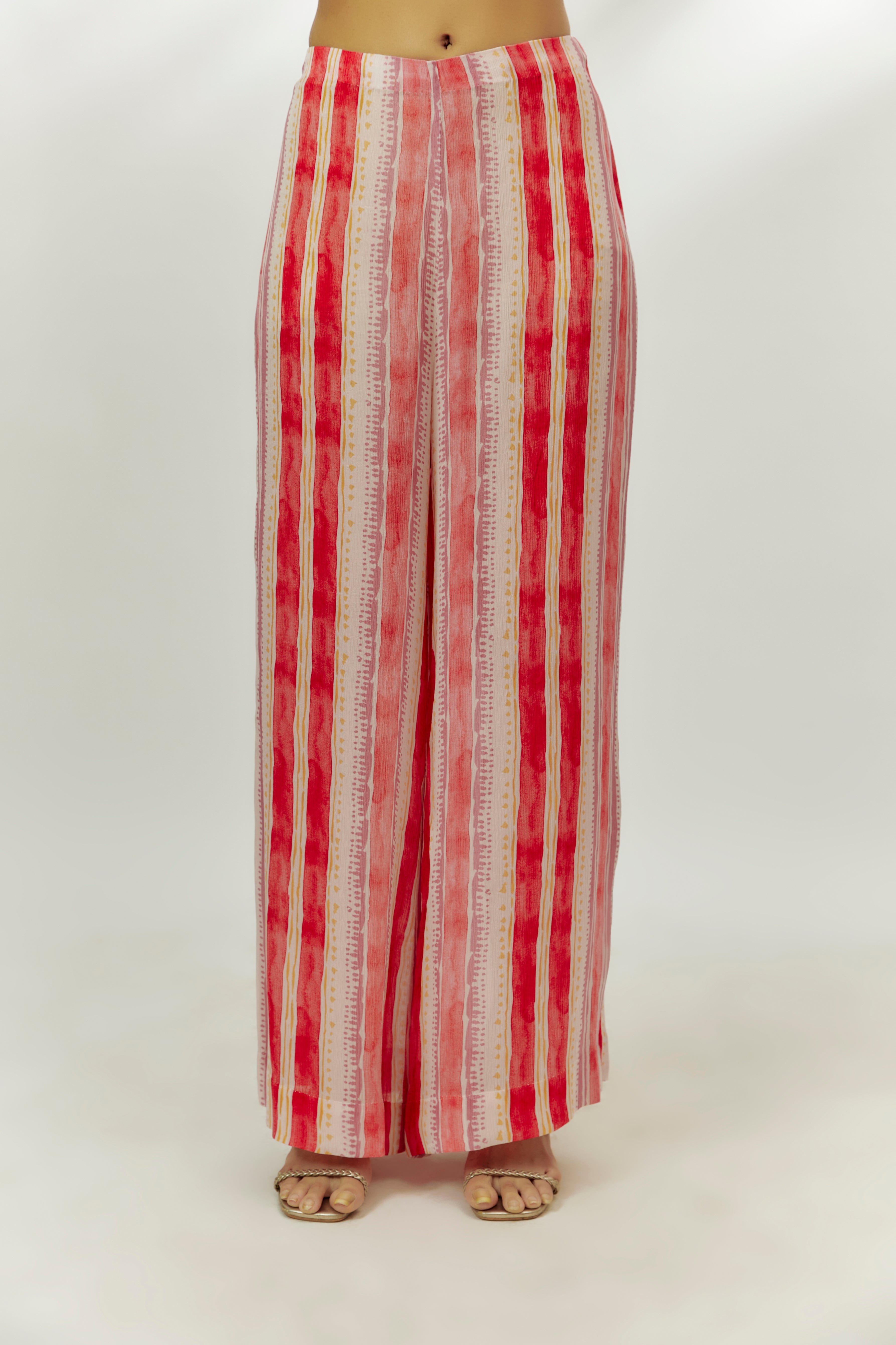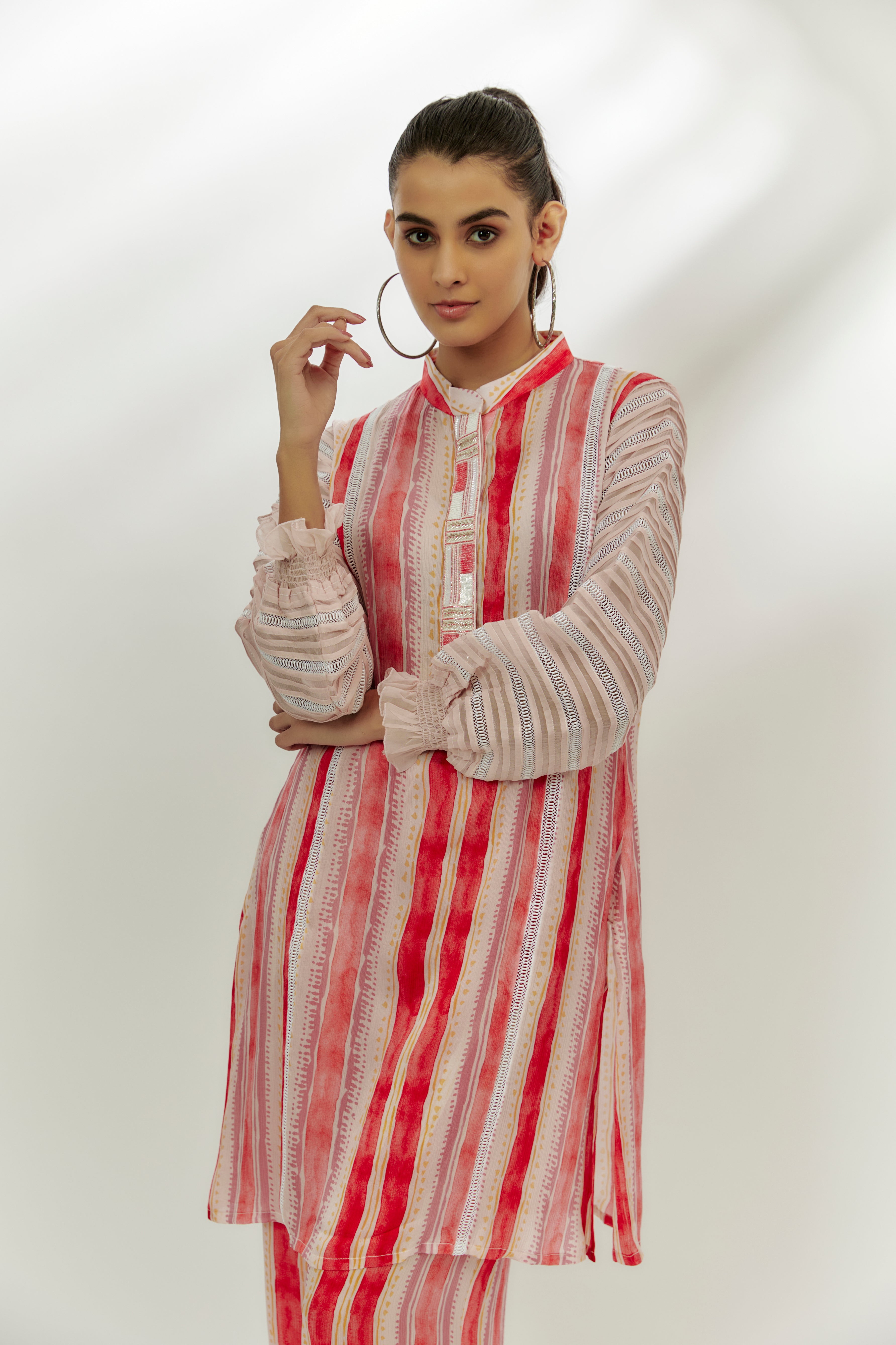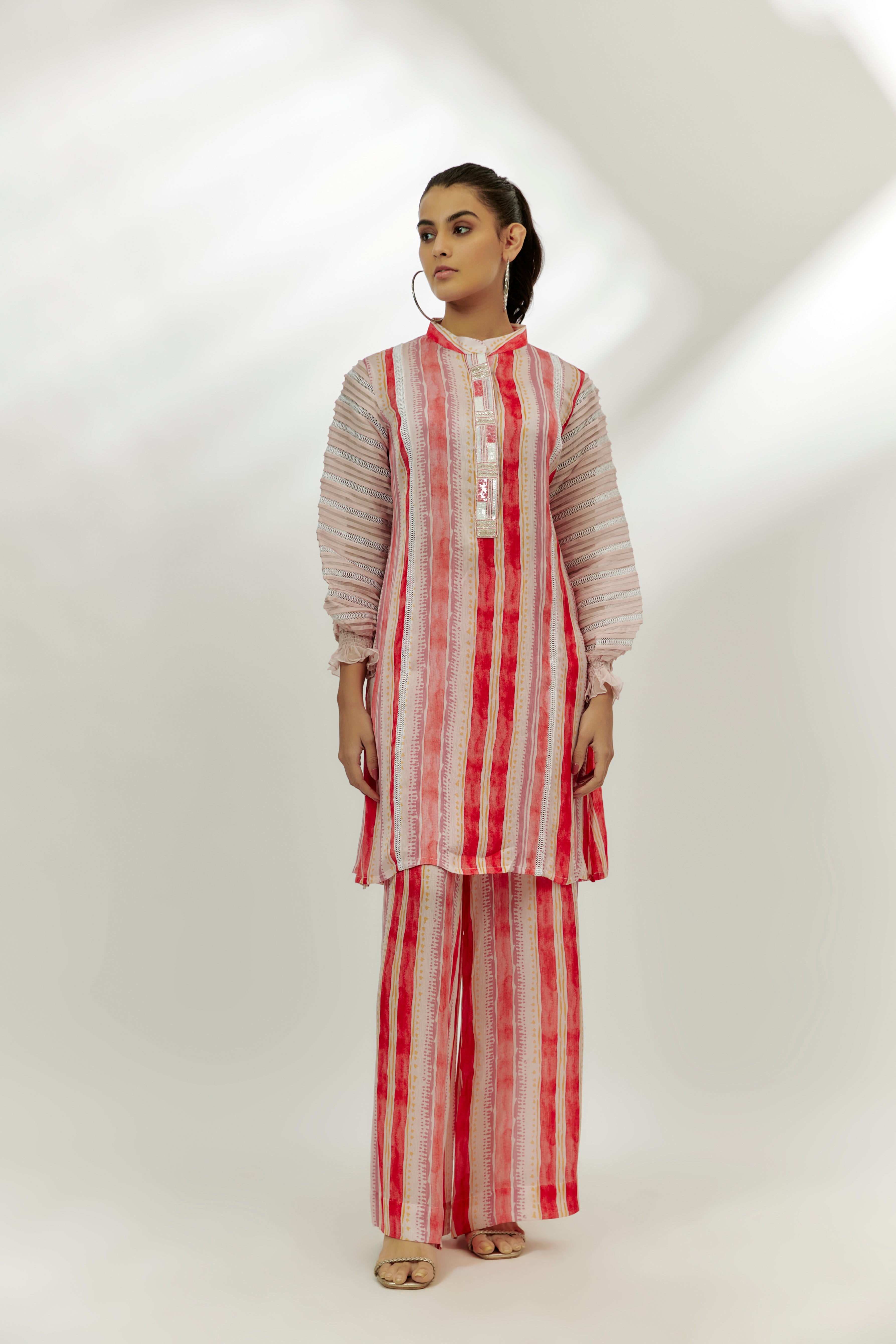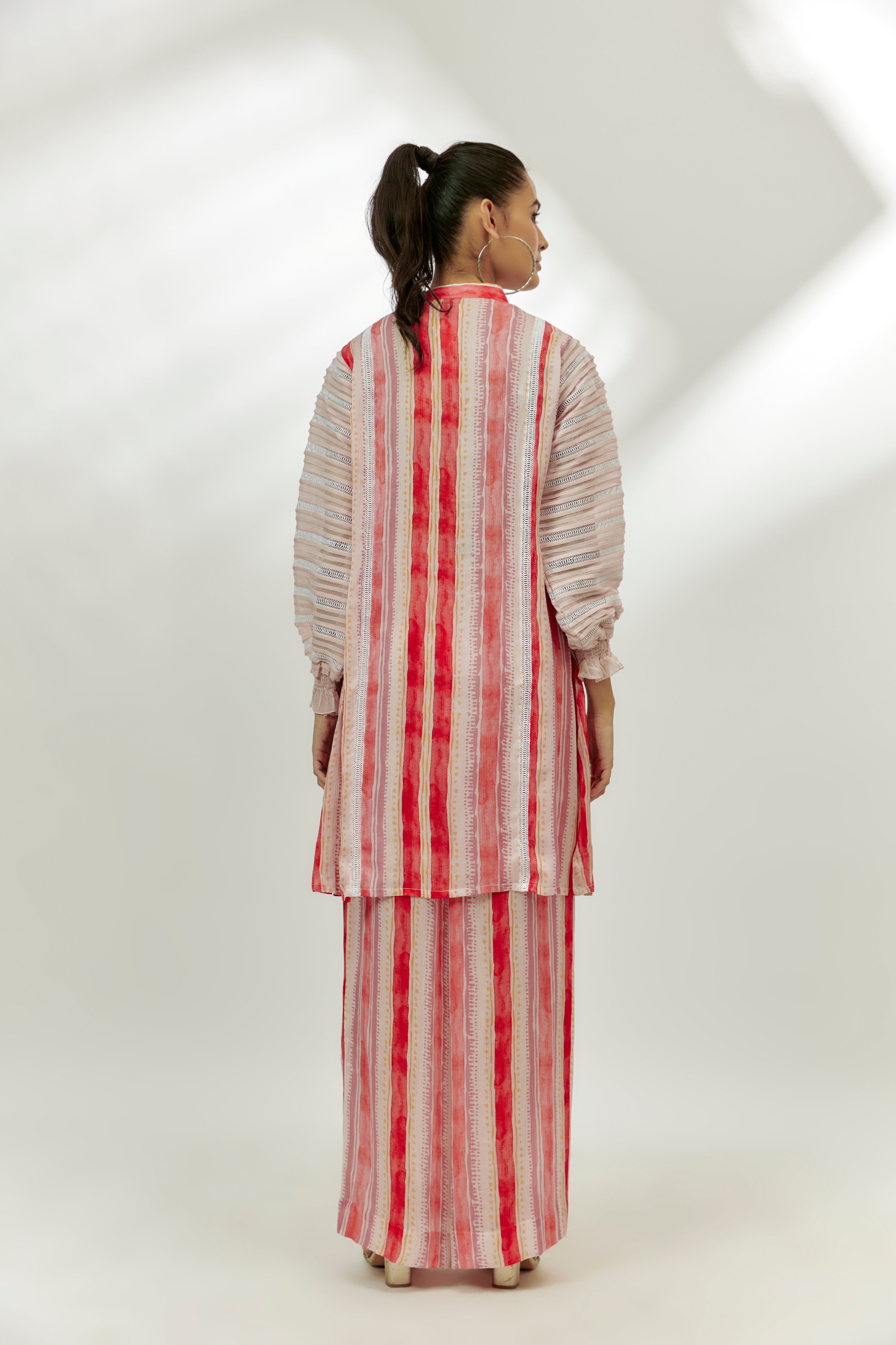 Featuring a pastel pink kurta in cotton crush base with stripe print, organza puff sleeves and sequins embroidery. It is paired with palazzo pants. Accentuate with statement jewellery and heels for a festive occasion.