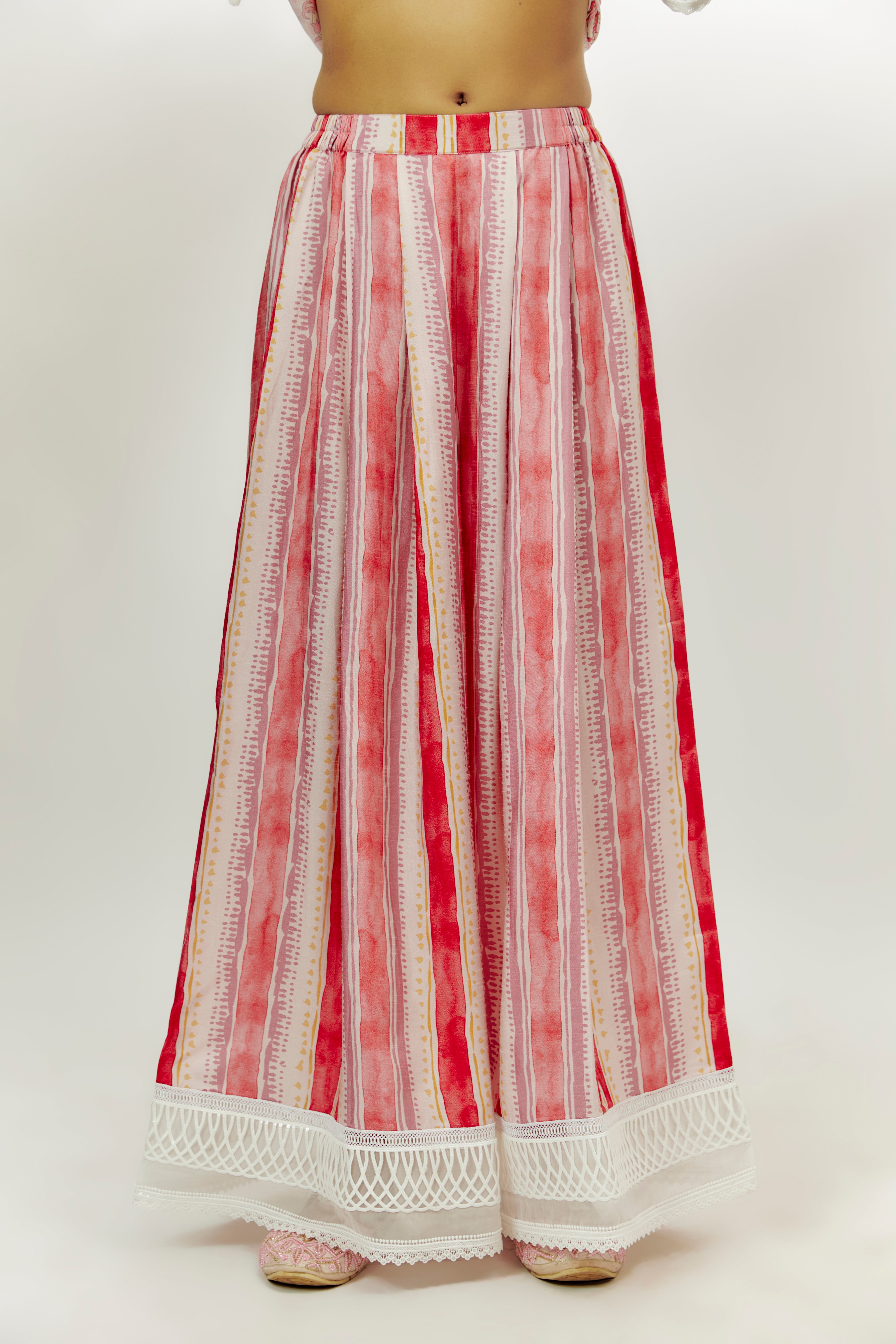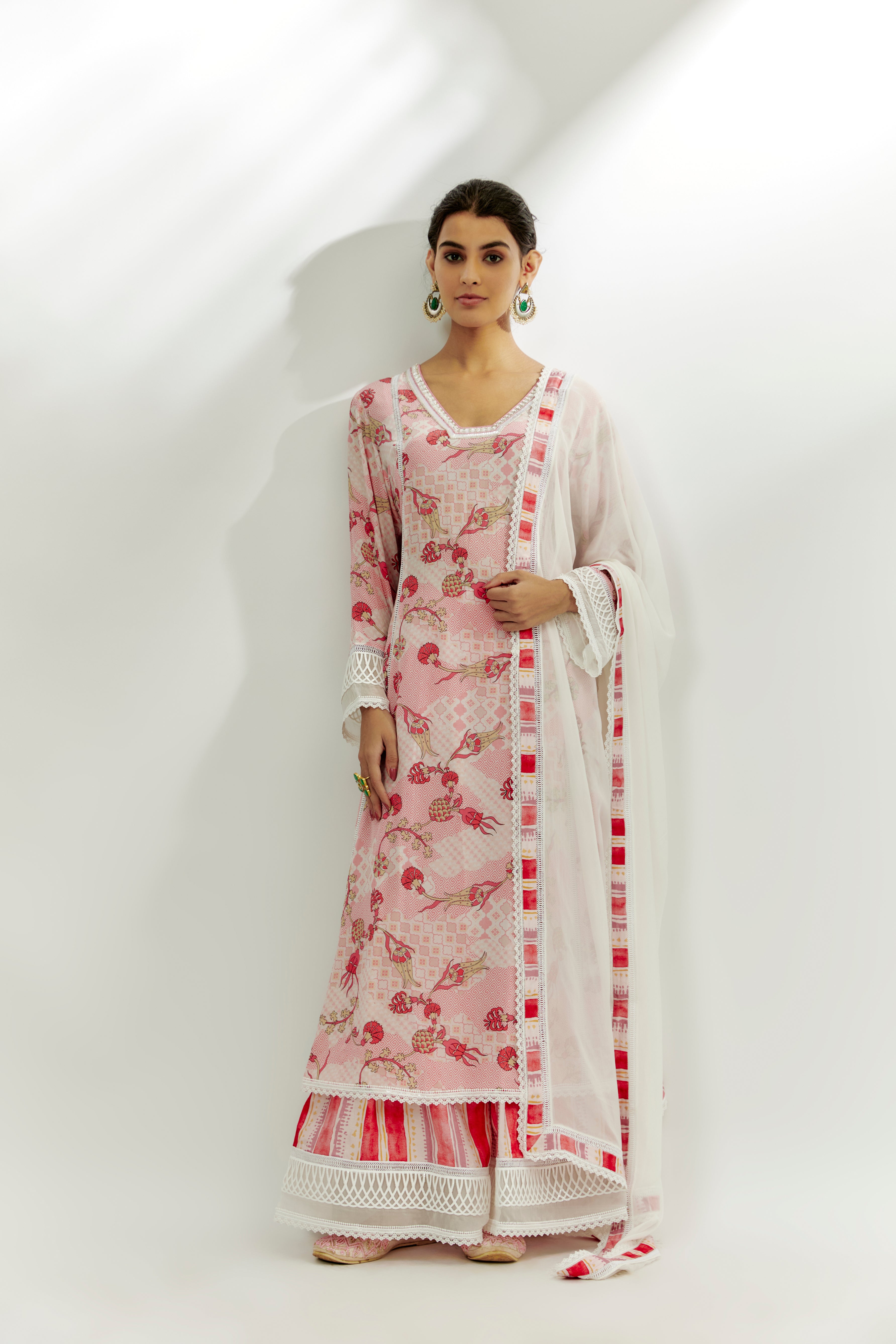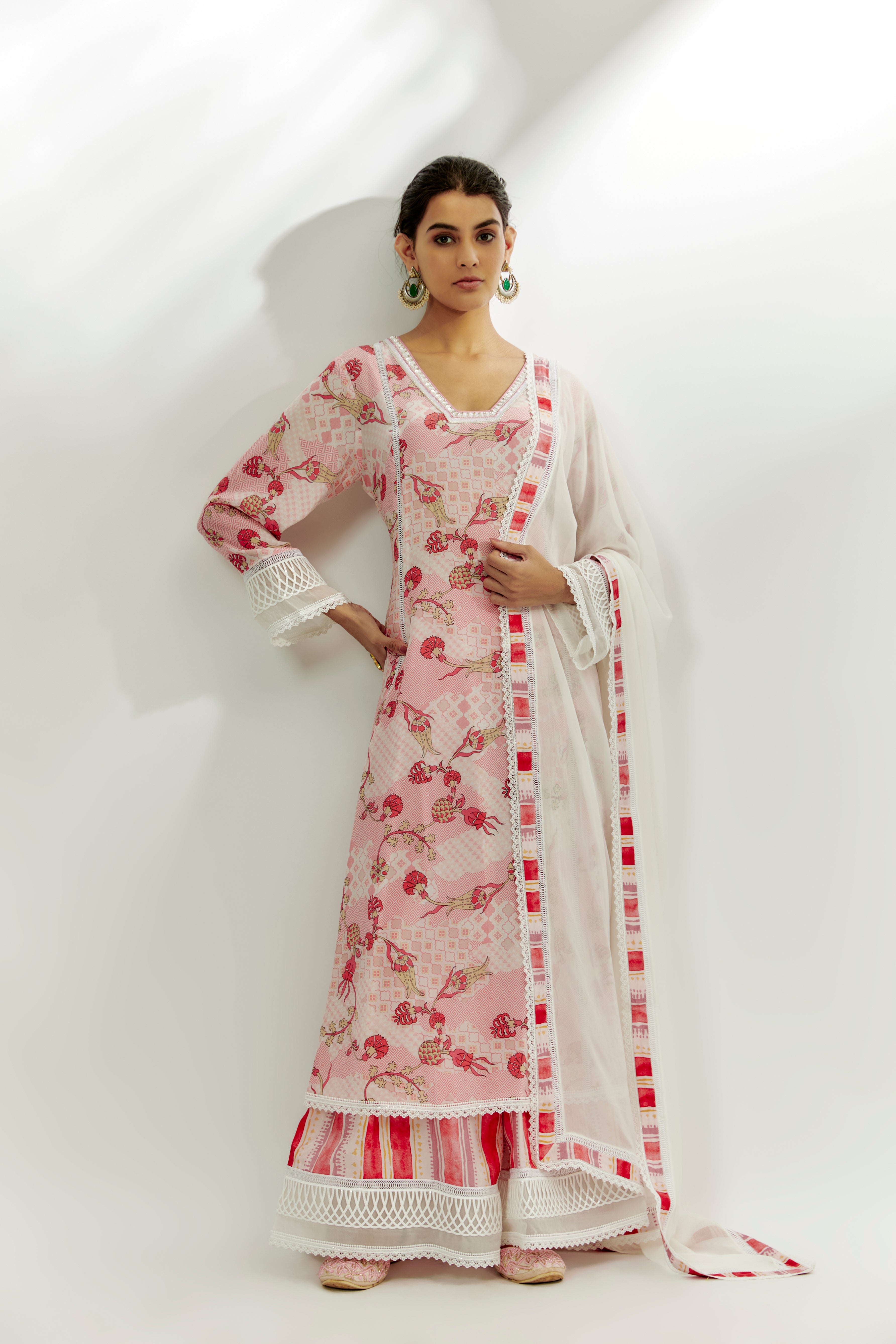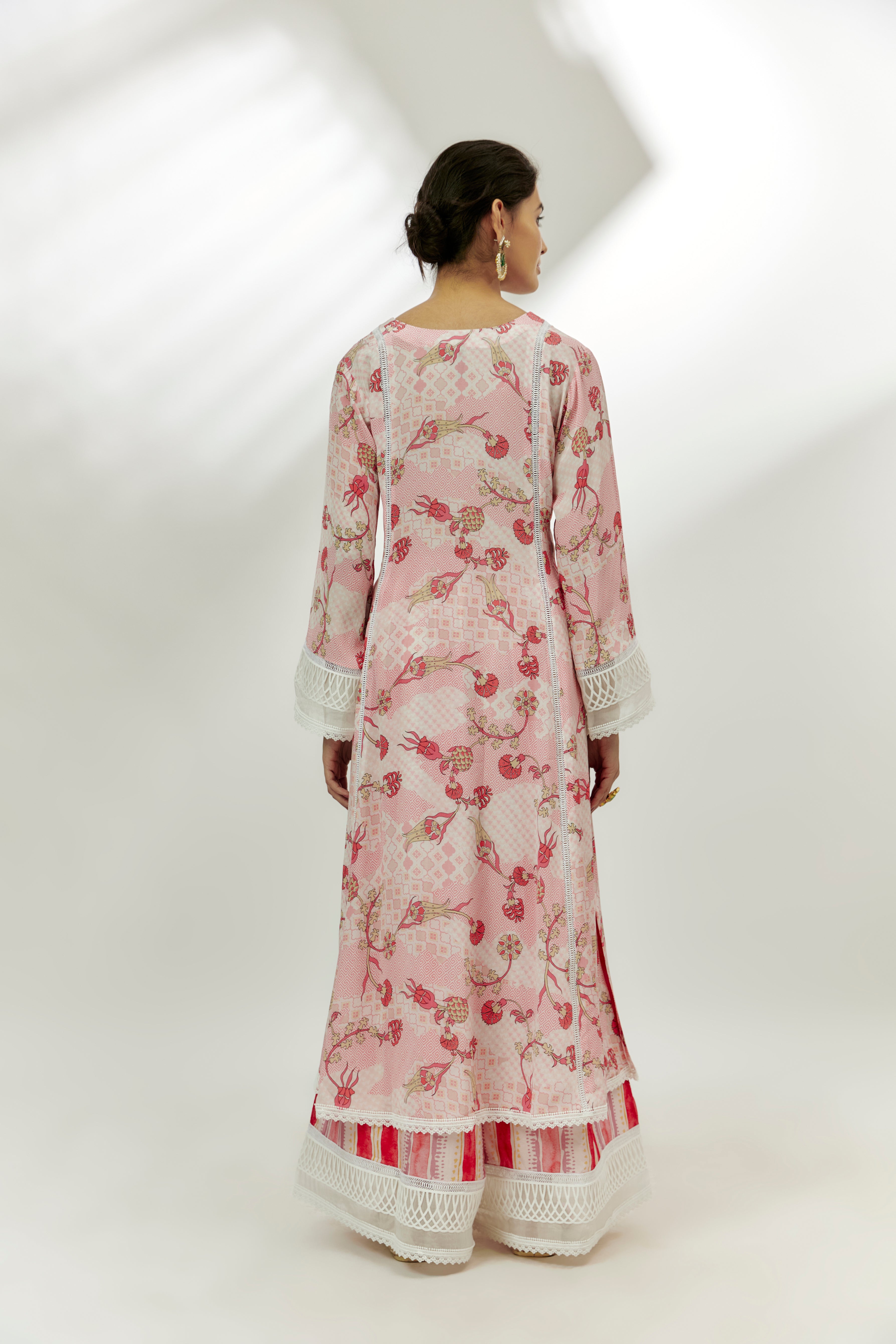 Featuring a pastel pink kalidar kurta in crepe base with floral print and sequins work. It is paired with dupion stripe printed palazzo pants and a georgette lace work dupatta. Accentuate with statement jewellery and heels for a festive occasion.
