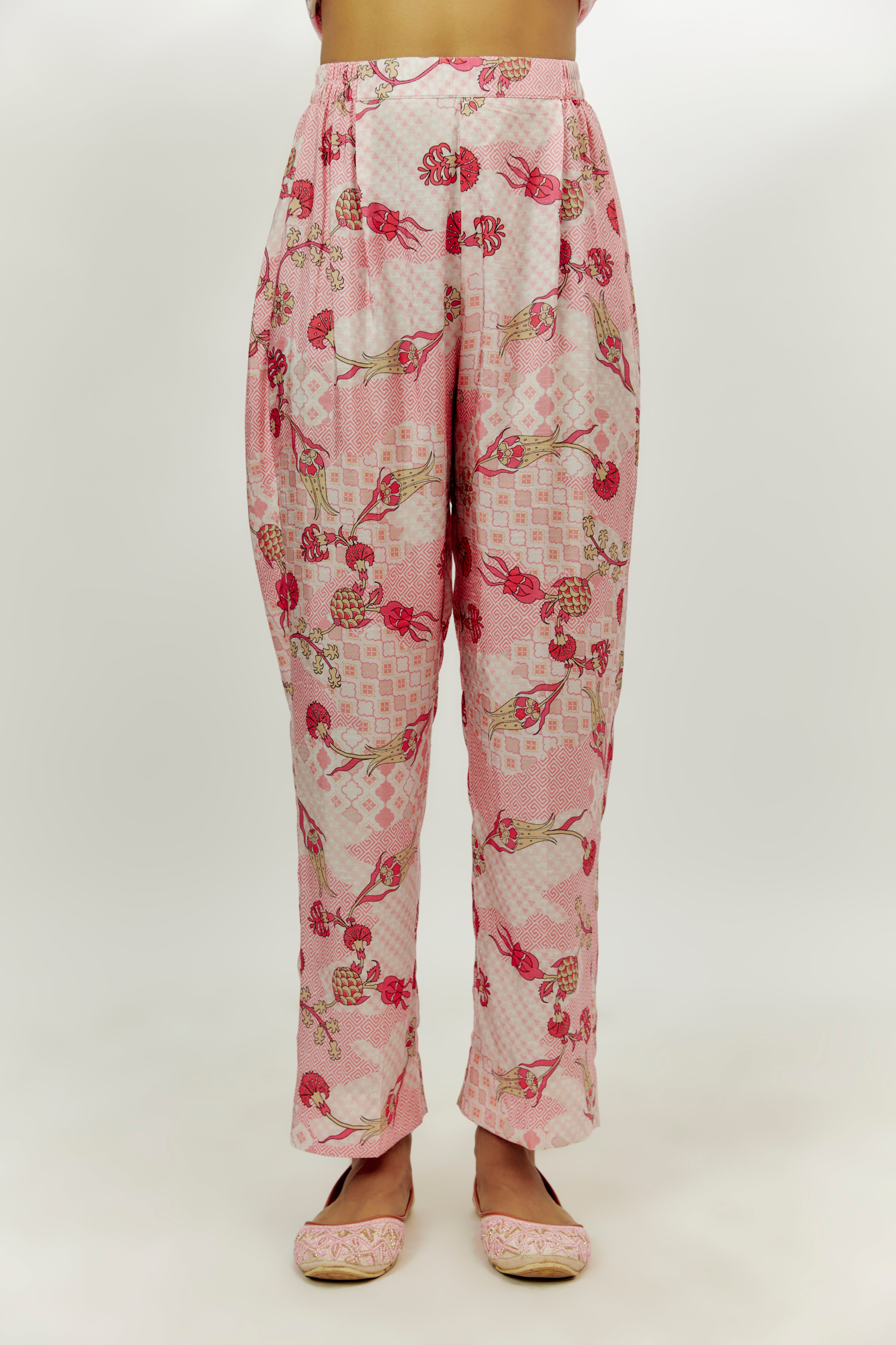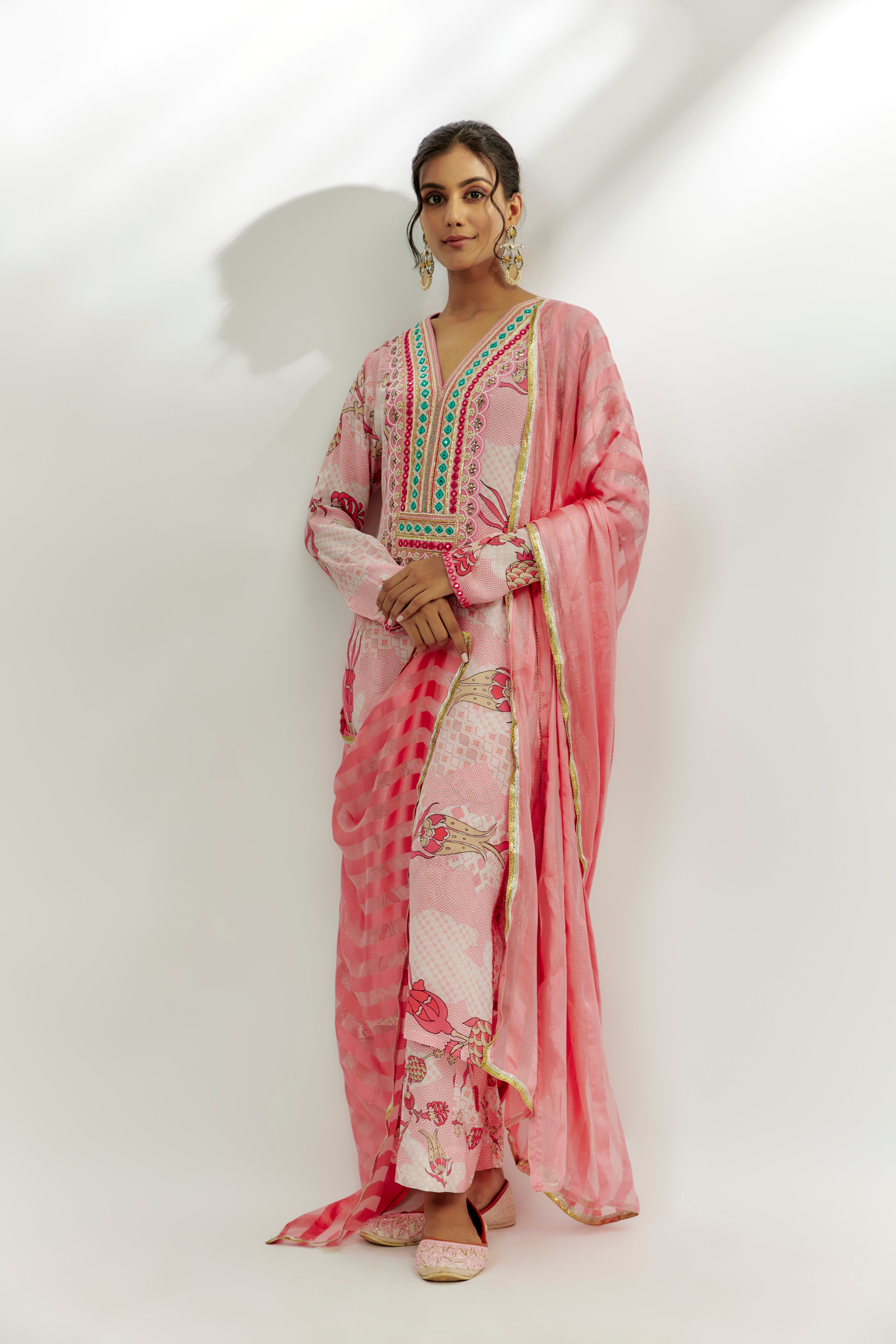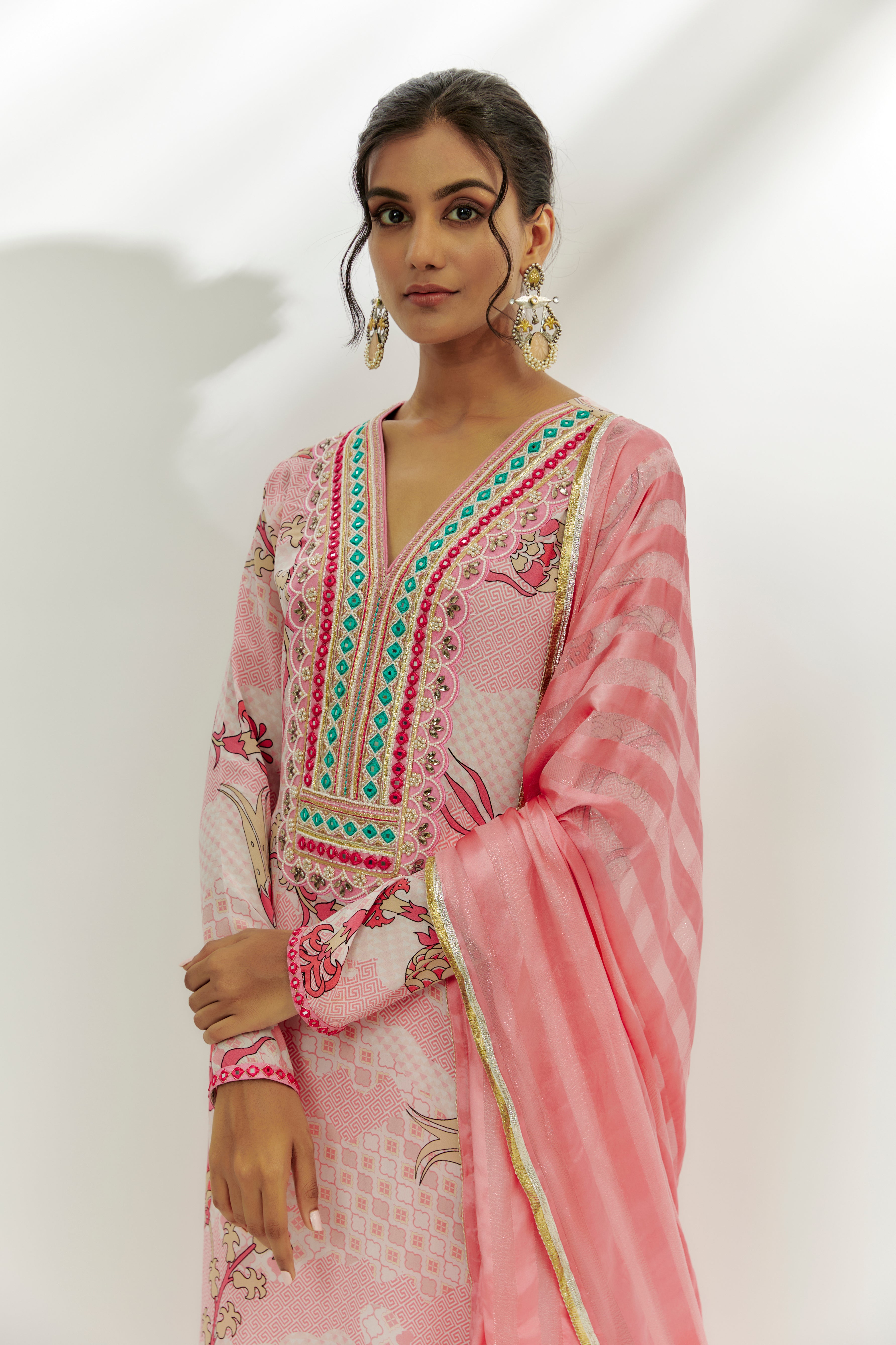 Featuring a pastel pink kurta in crepe base with print, mirror and gota embroidery. It is paired with dupion silk striped pants and a georgette dupatta. Accentuate with statement jewellery and heels for a festive occasion.