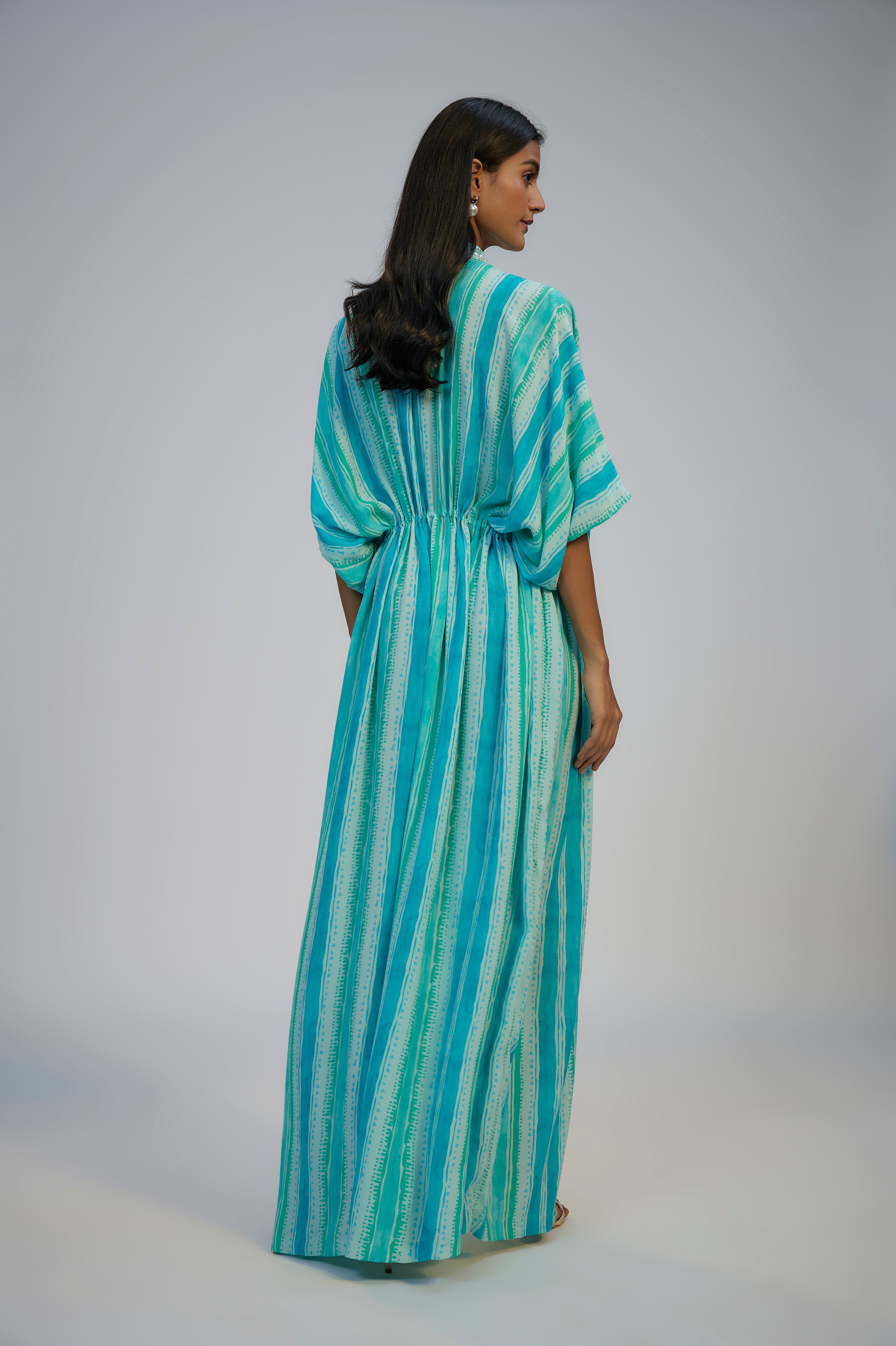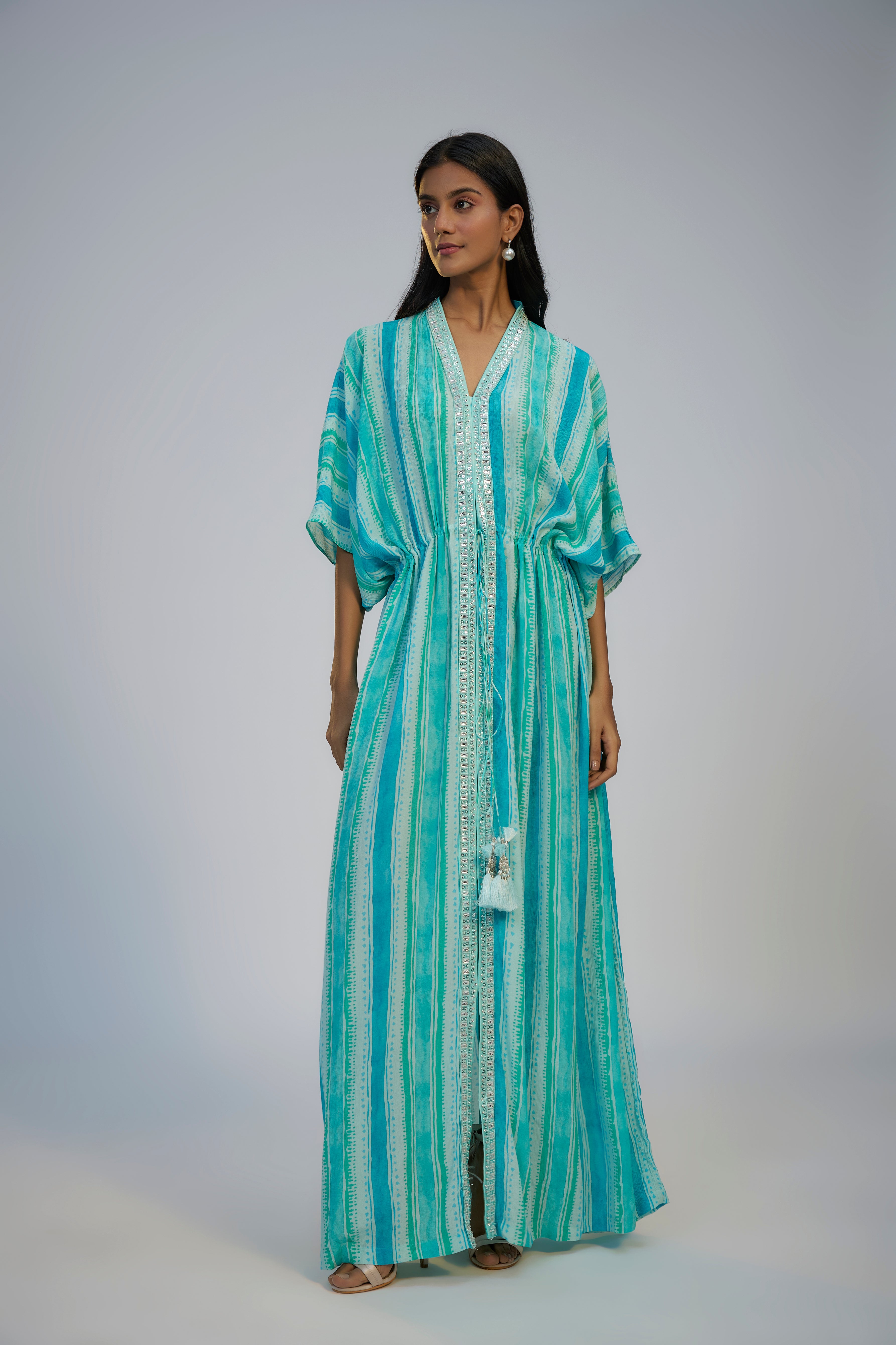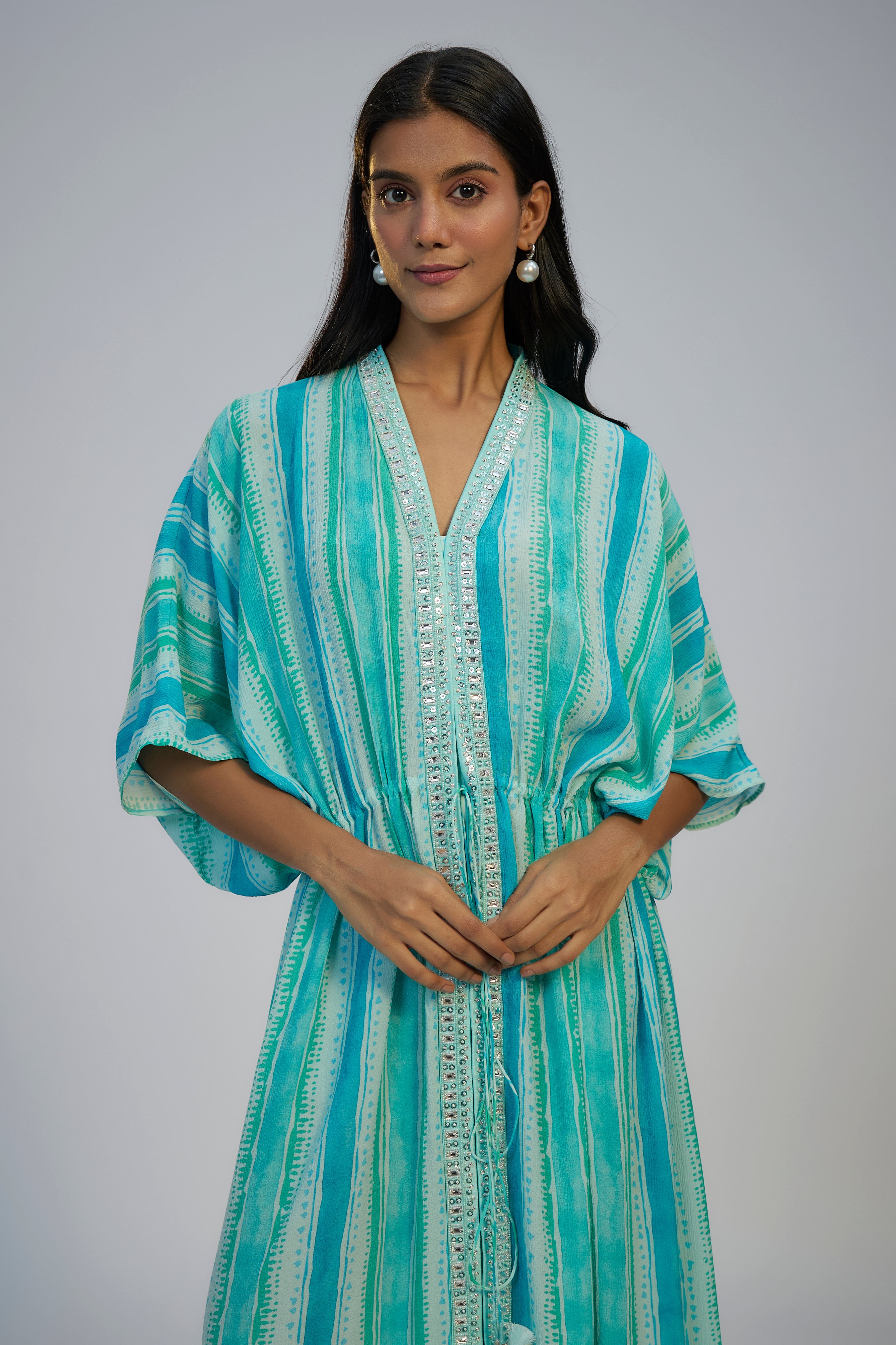 Zafeera Cyan Blue Cotton Crush Digital Printed & Sequins Embroidered Kaftan Set