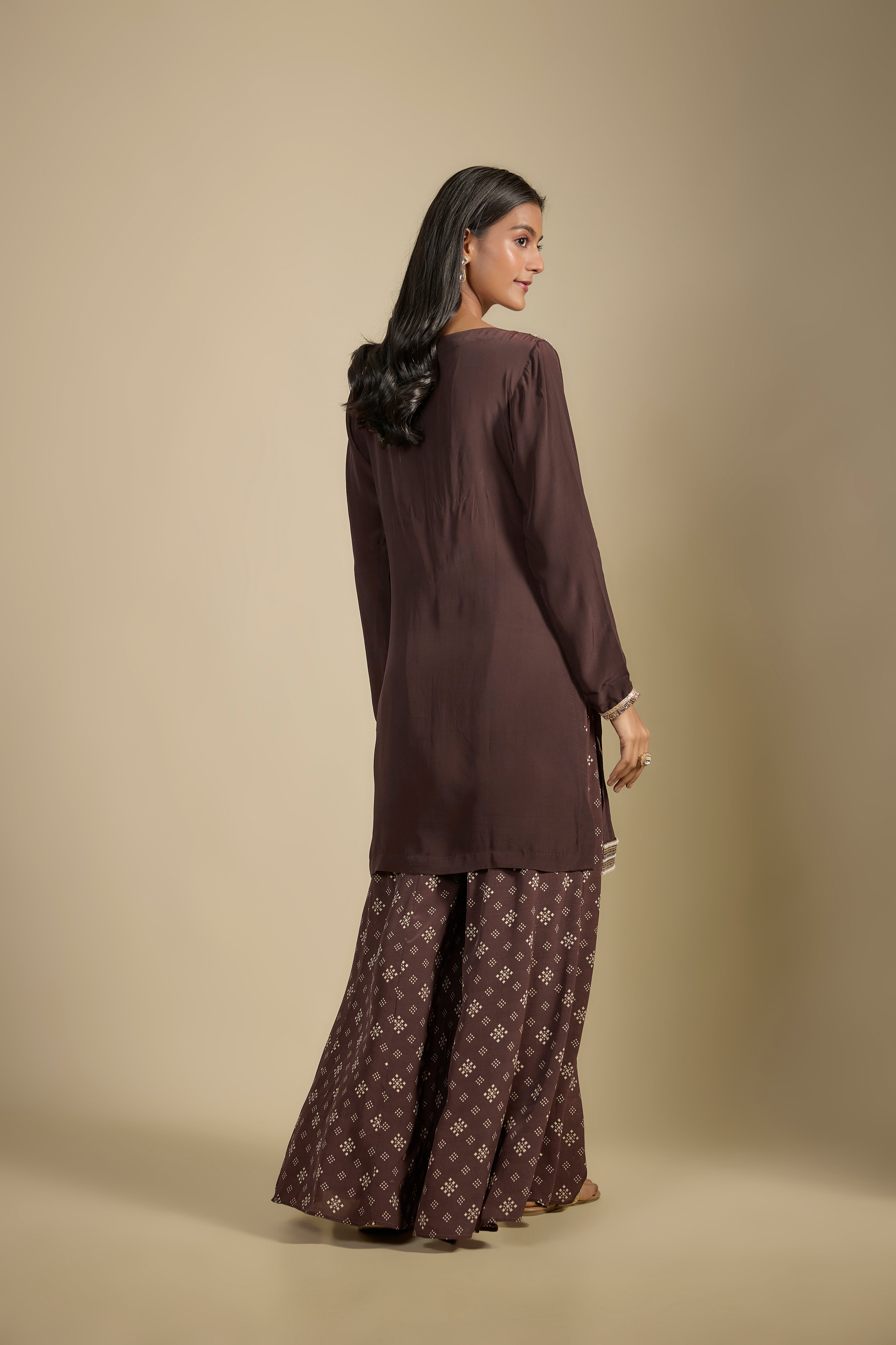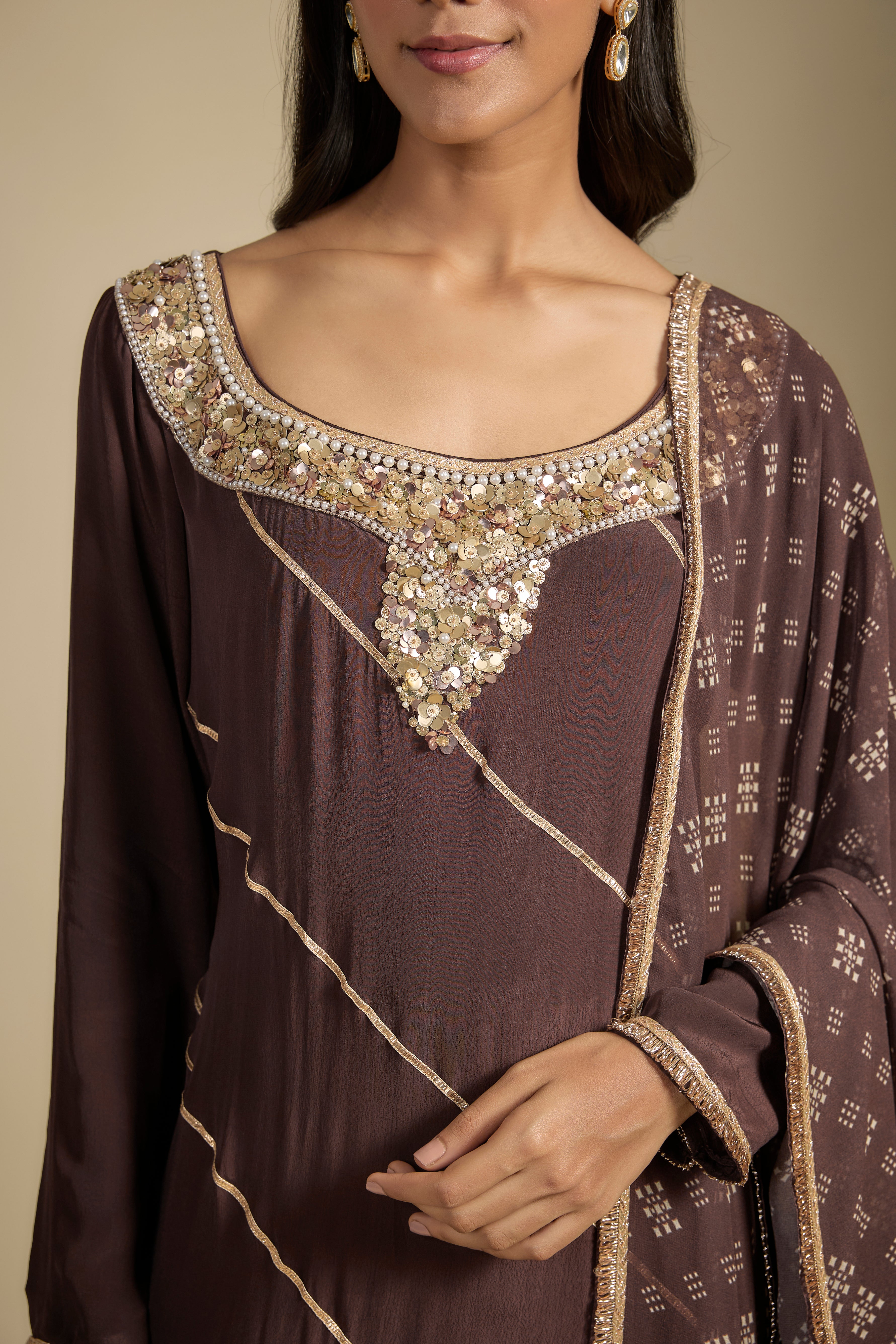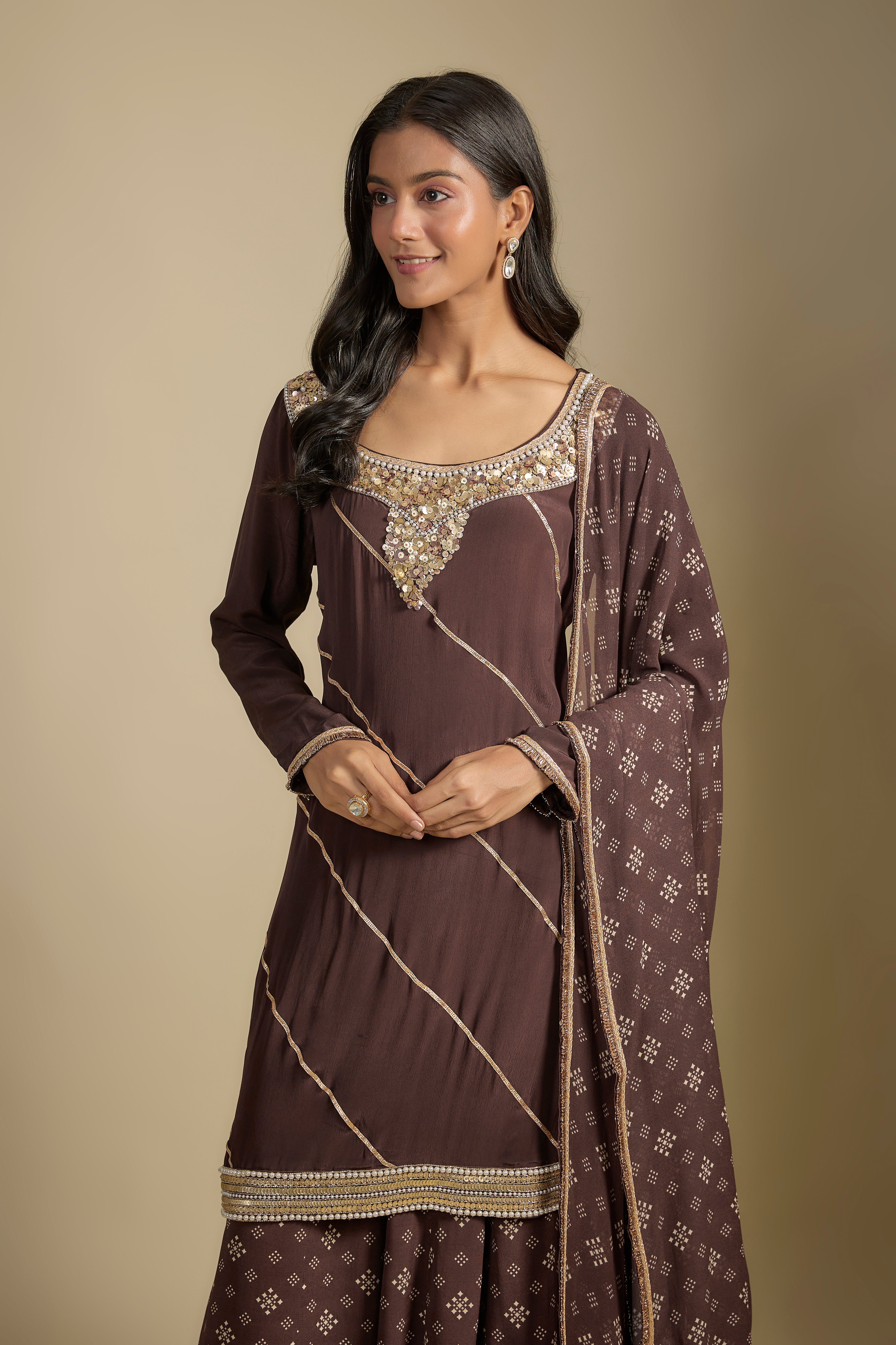 Featuring a set of brown printed crepe sharara pants and solid brown crepe kurta with sequins and pearl embroidery. Comes with a georgette printed dupatta with gold fringes.