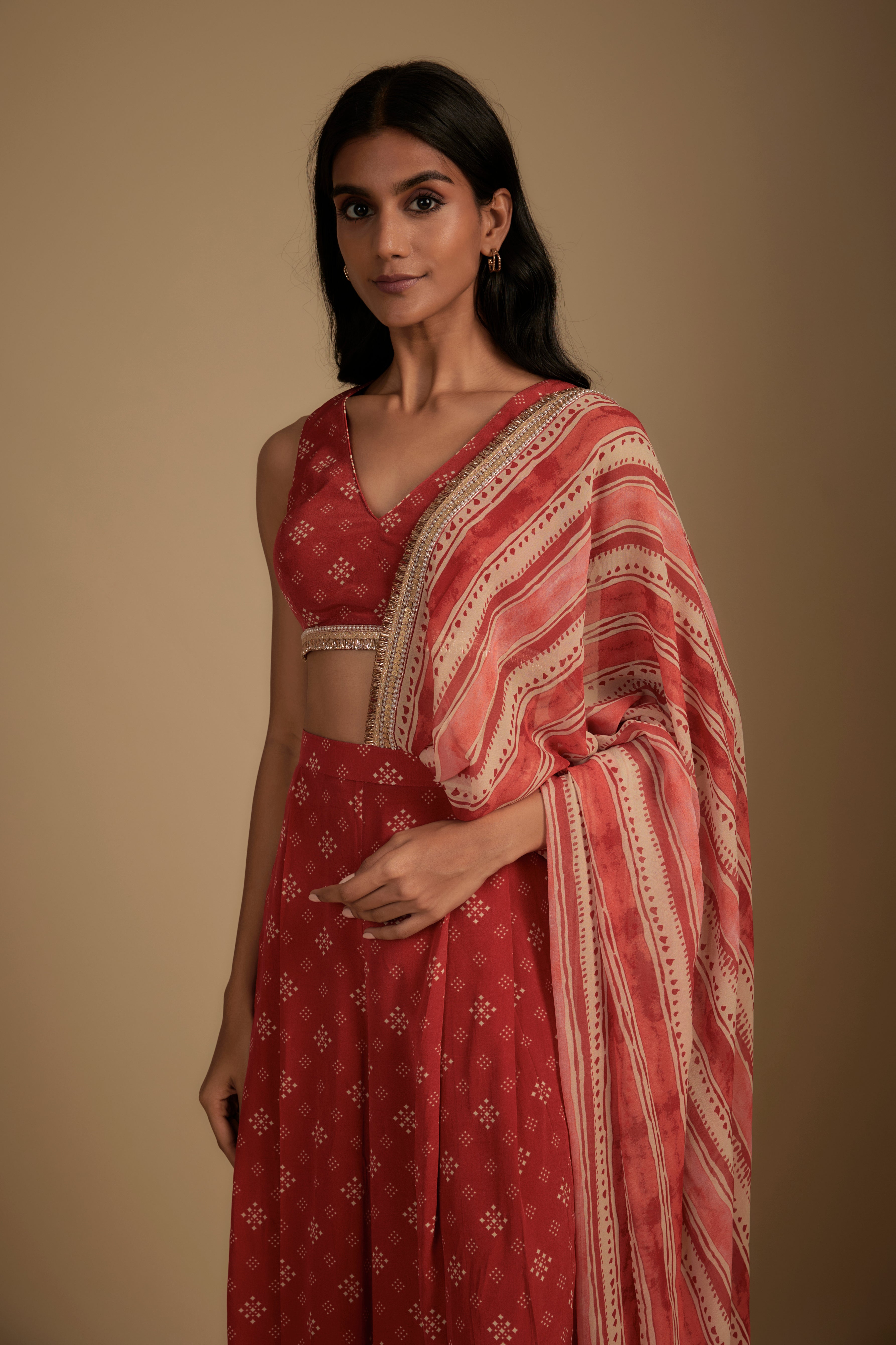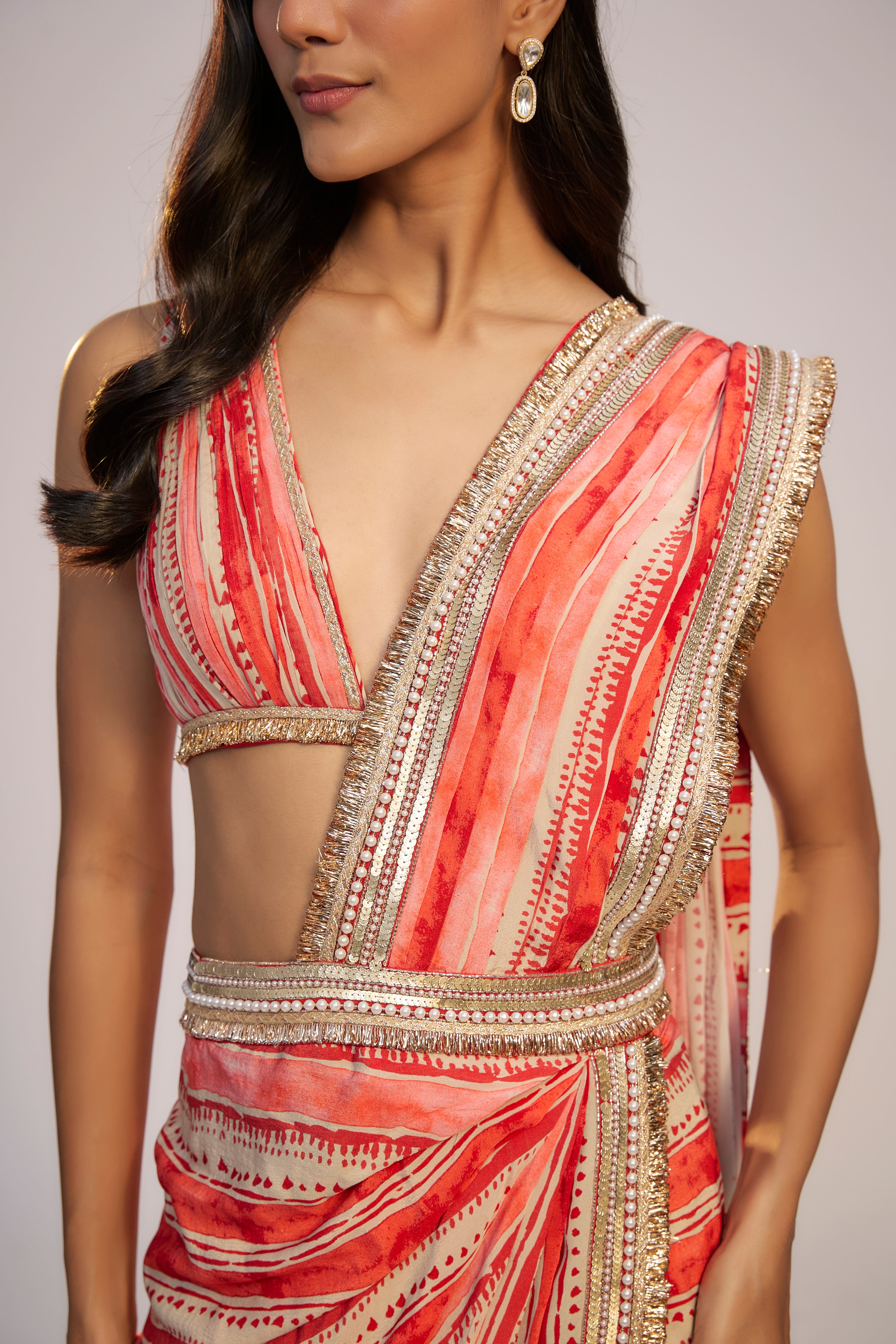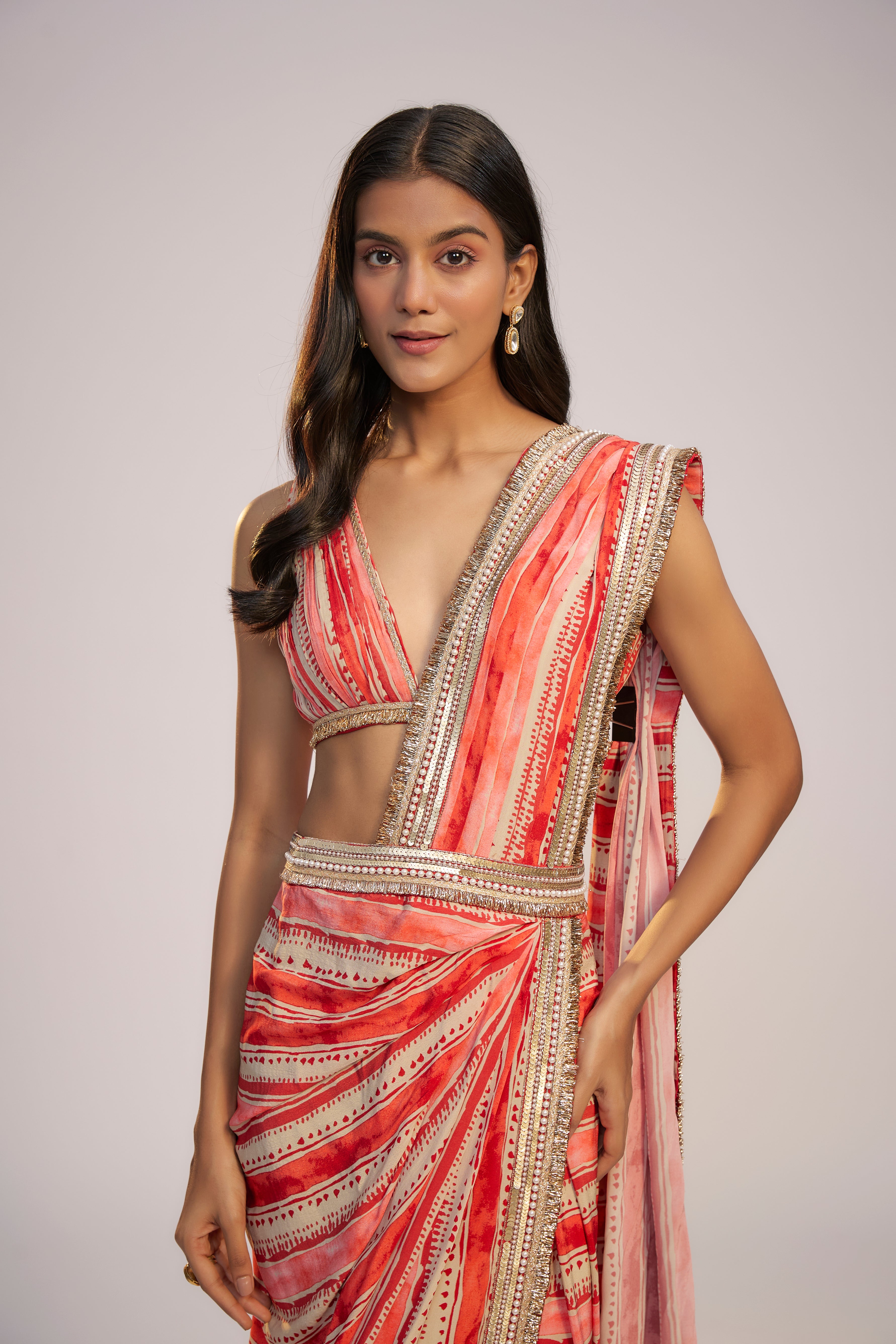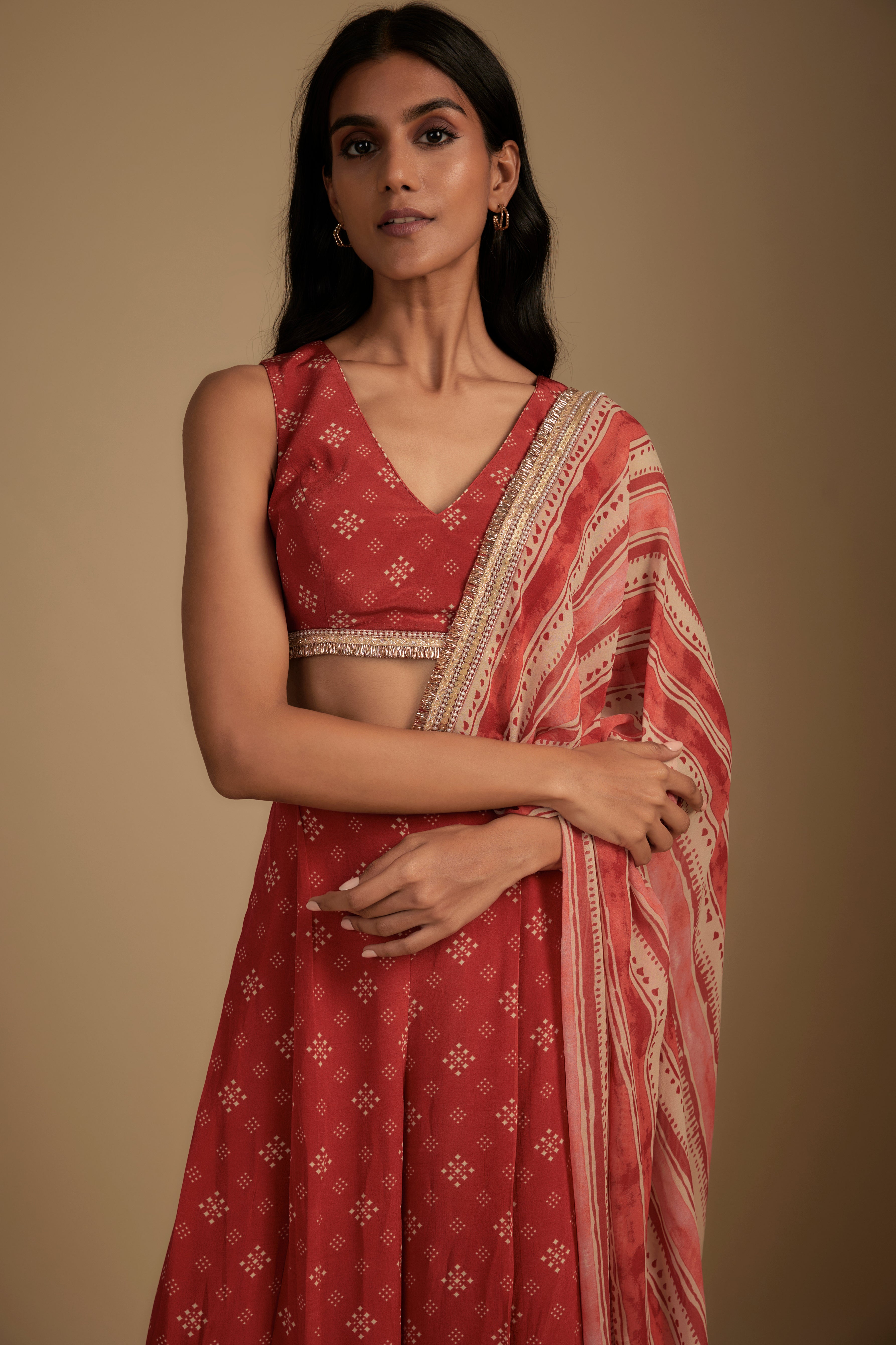 Red Printed Pre-Draped Saree Set