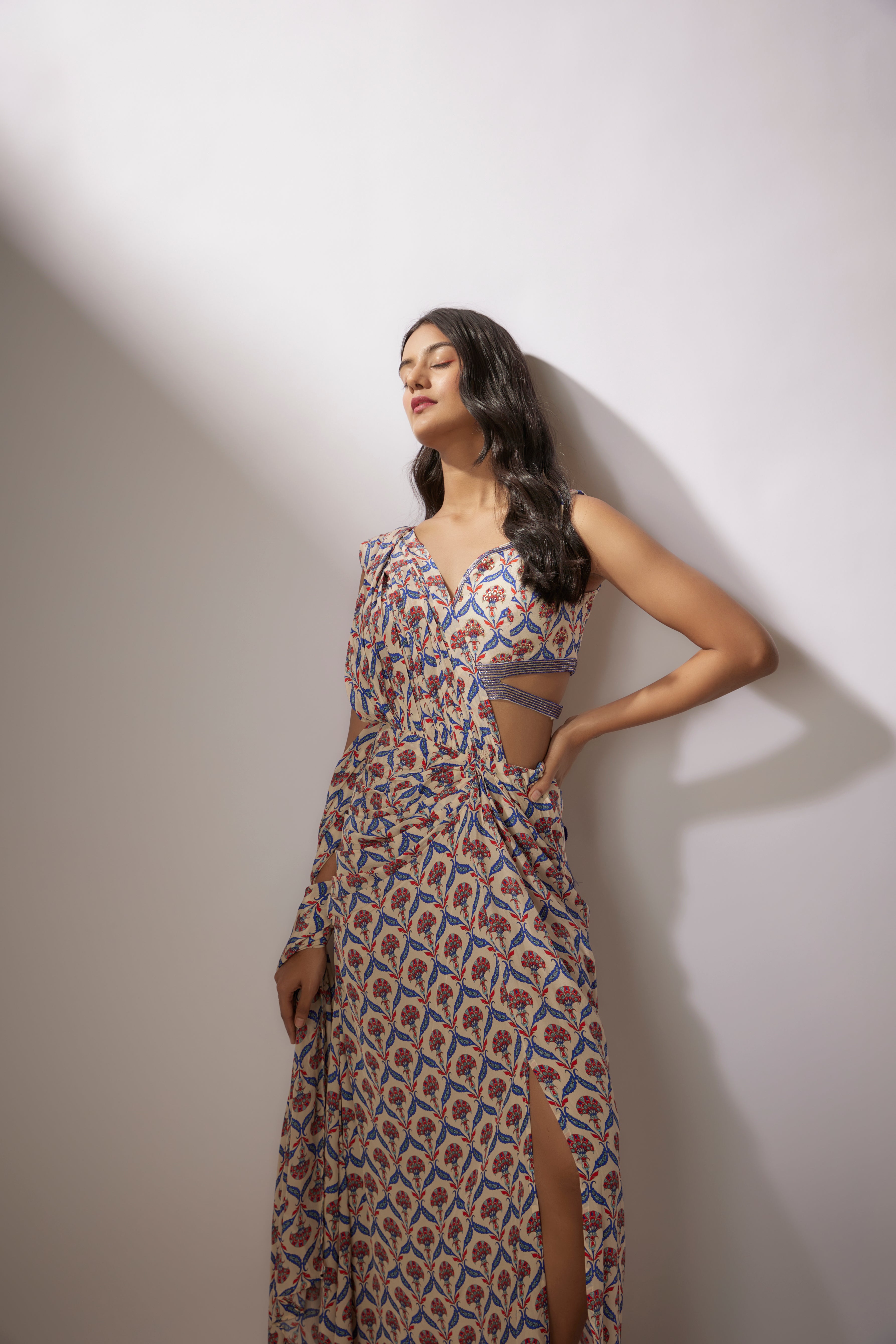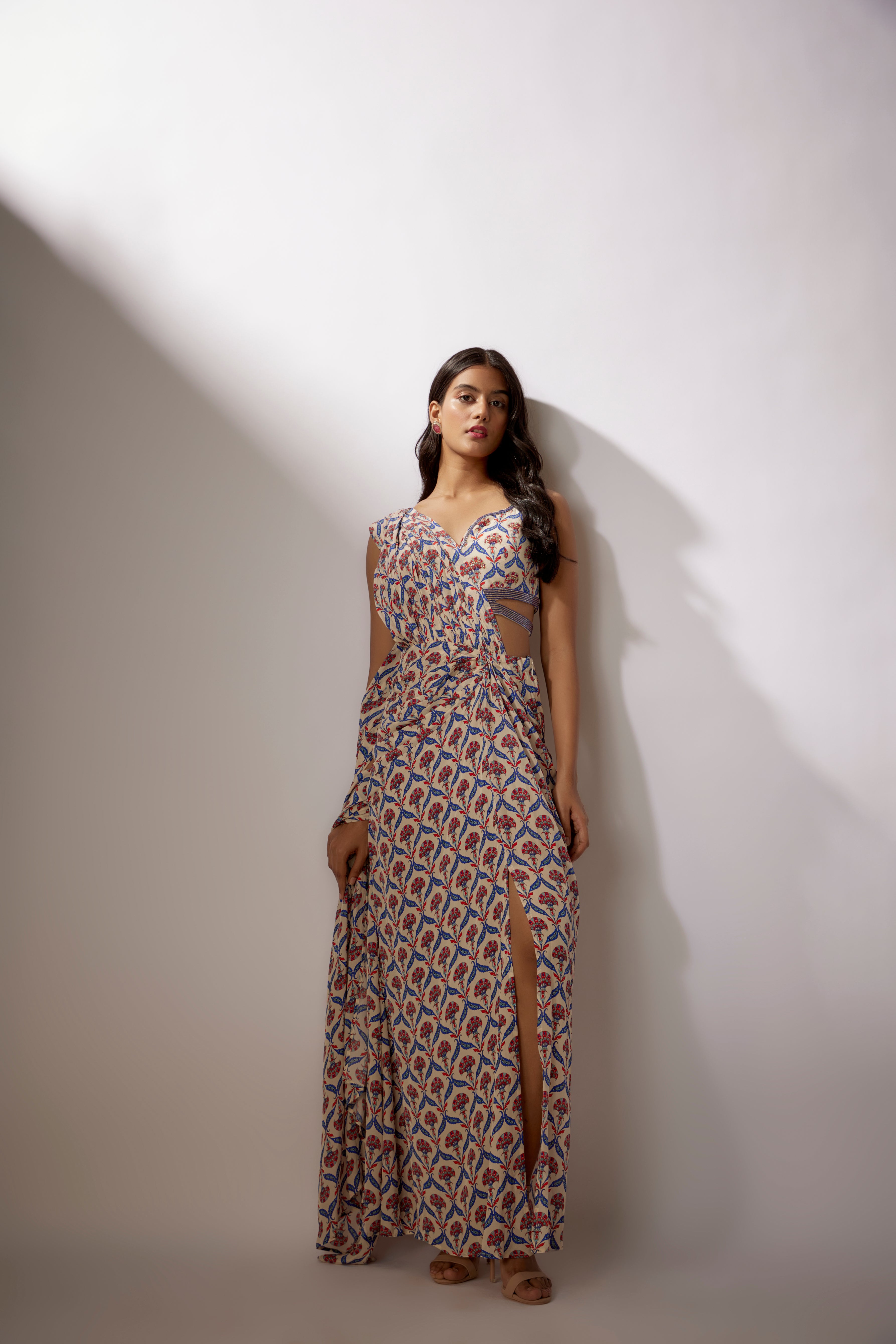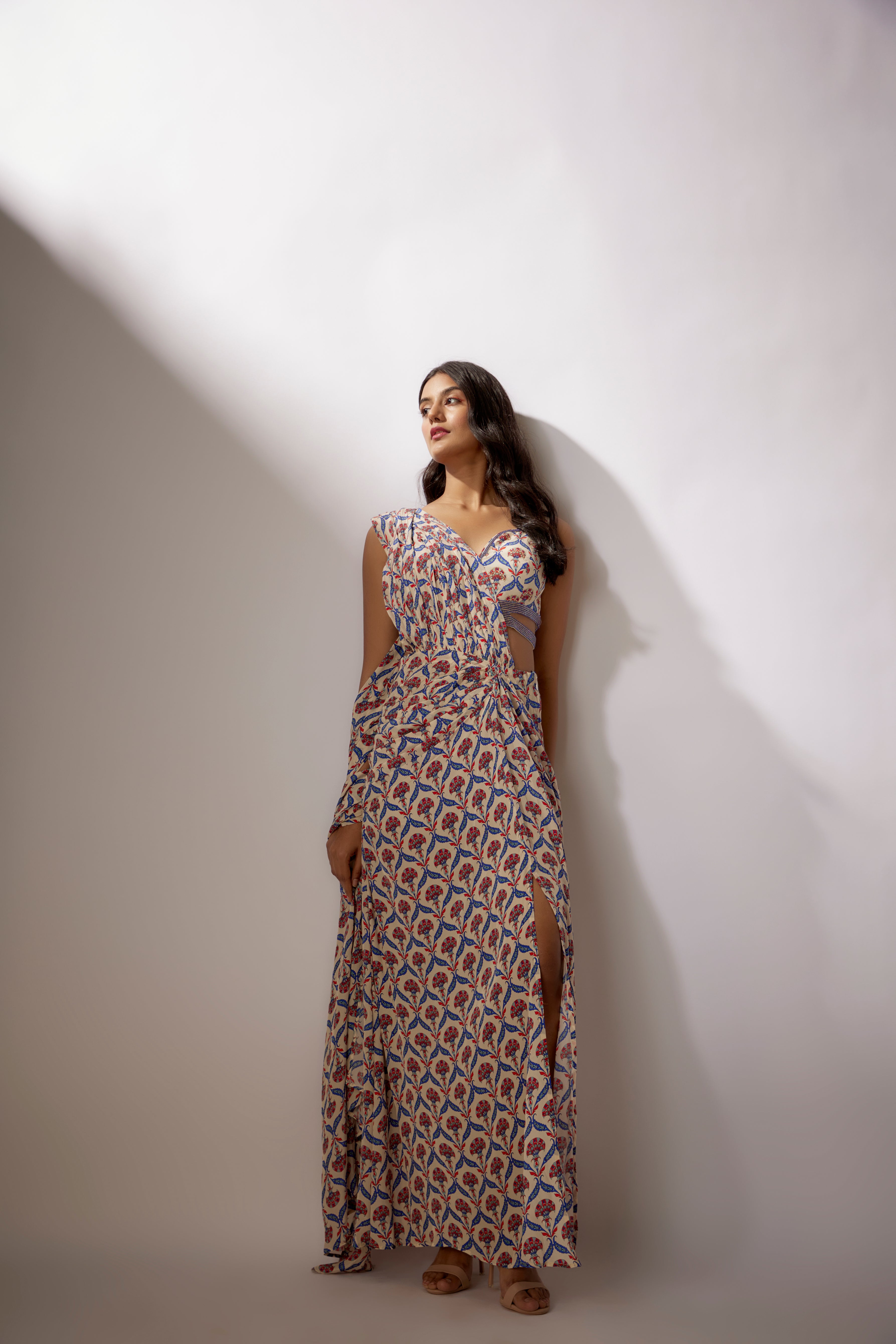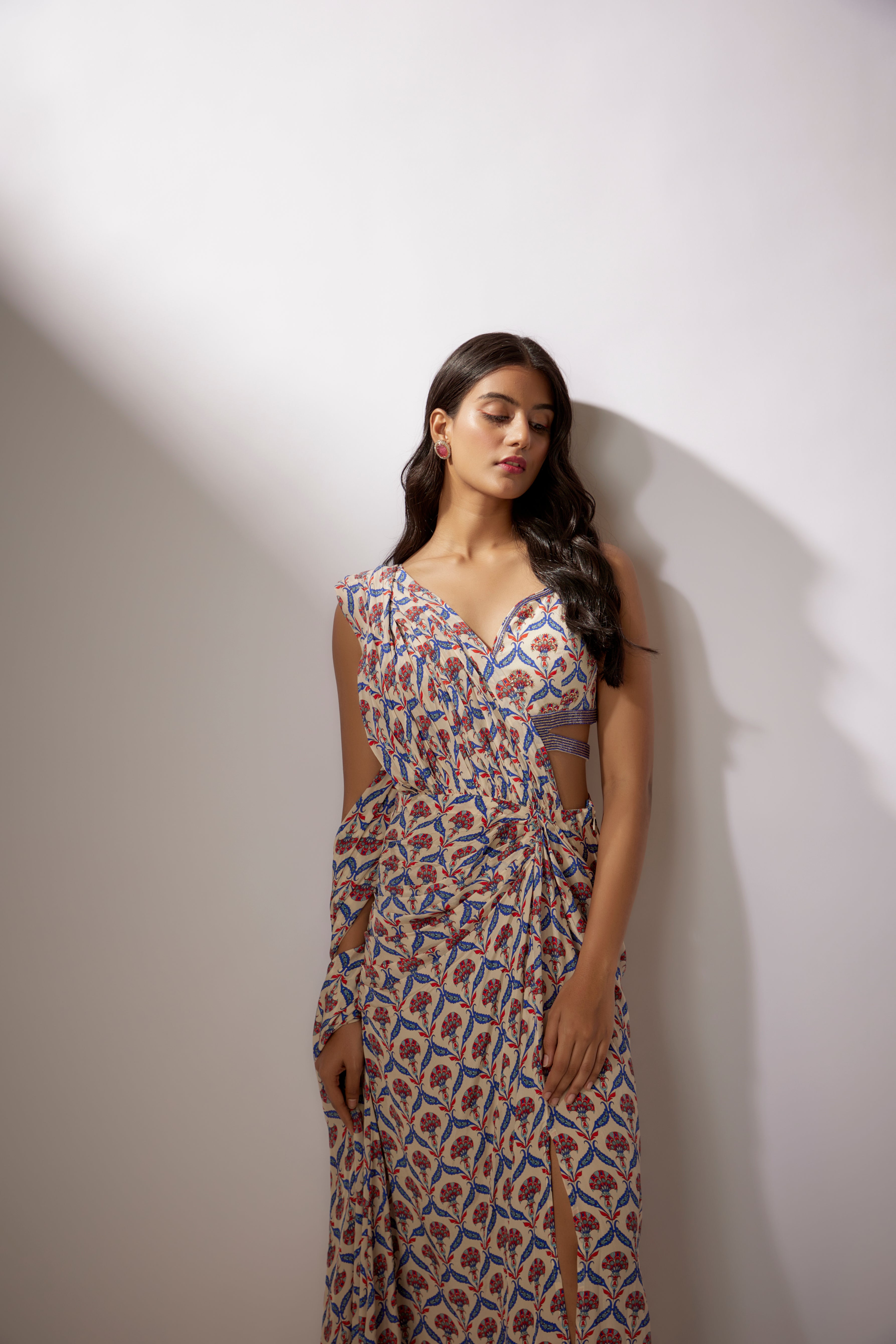 Beige Printed Draped Pants Saree Set
