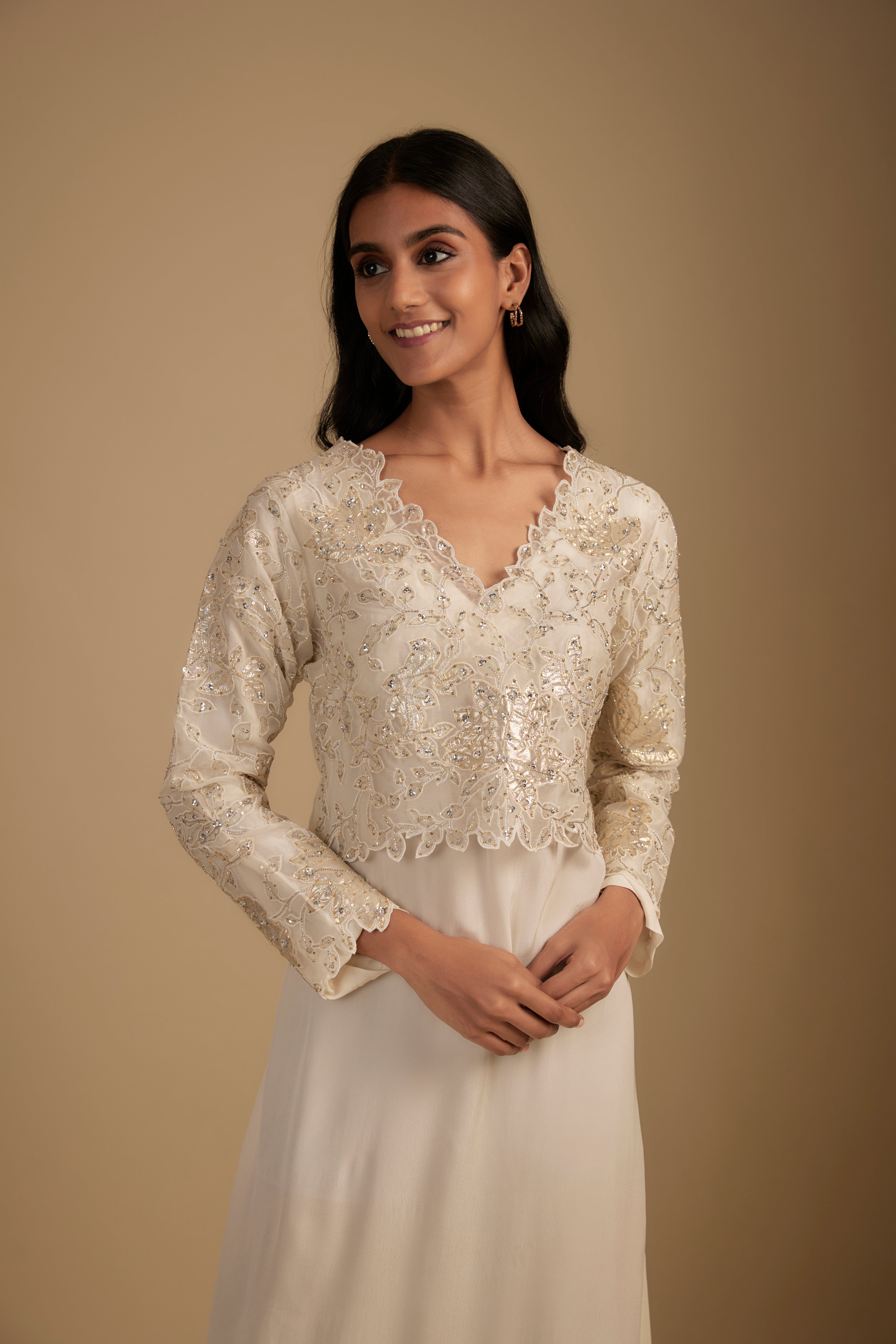 Featuring a white maxi dress in crepe fabric with a cutwork and zardosi embroidered crop top in organza.