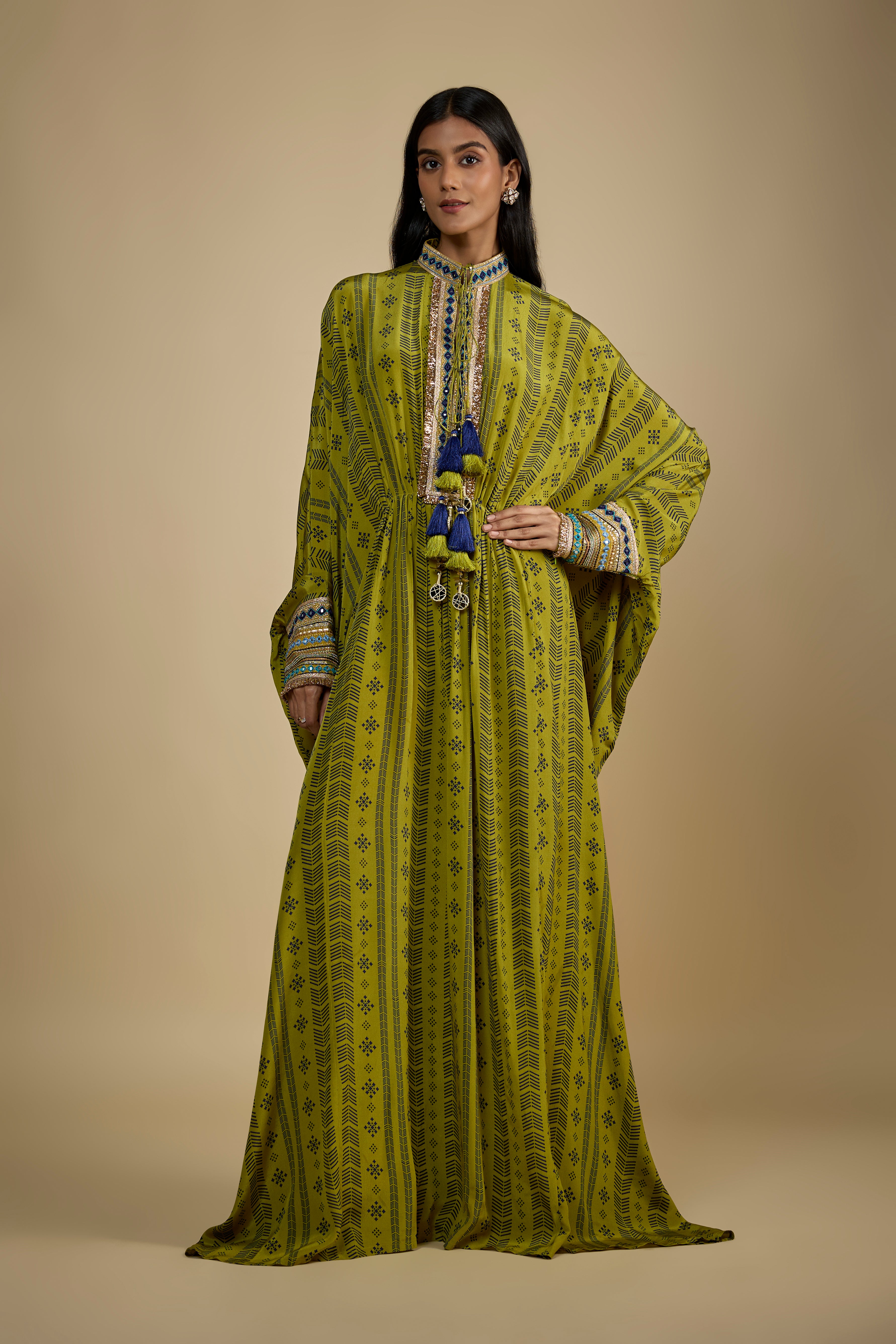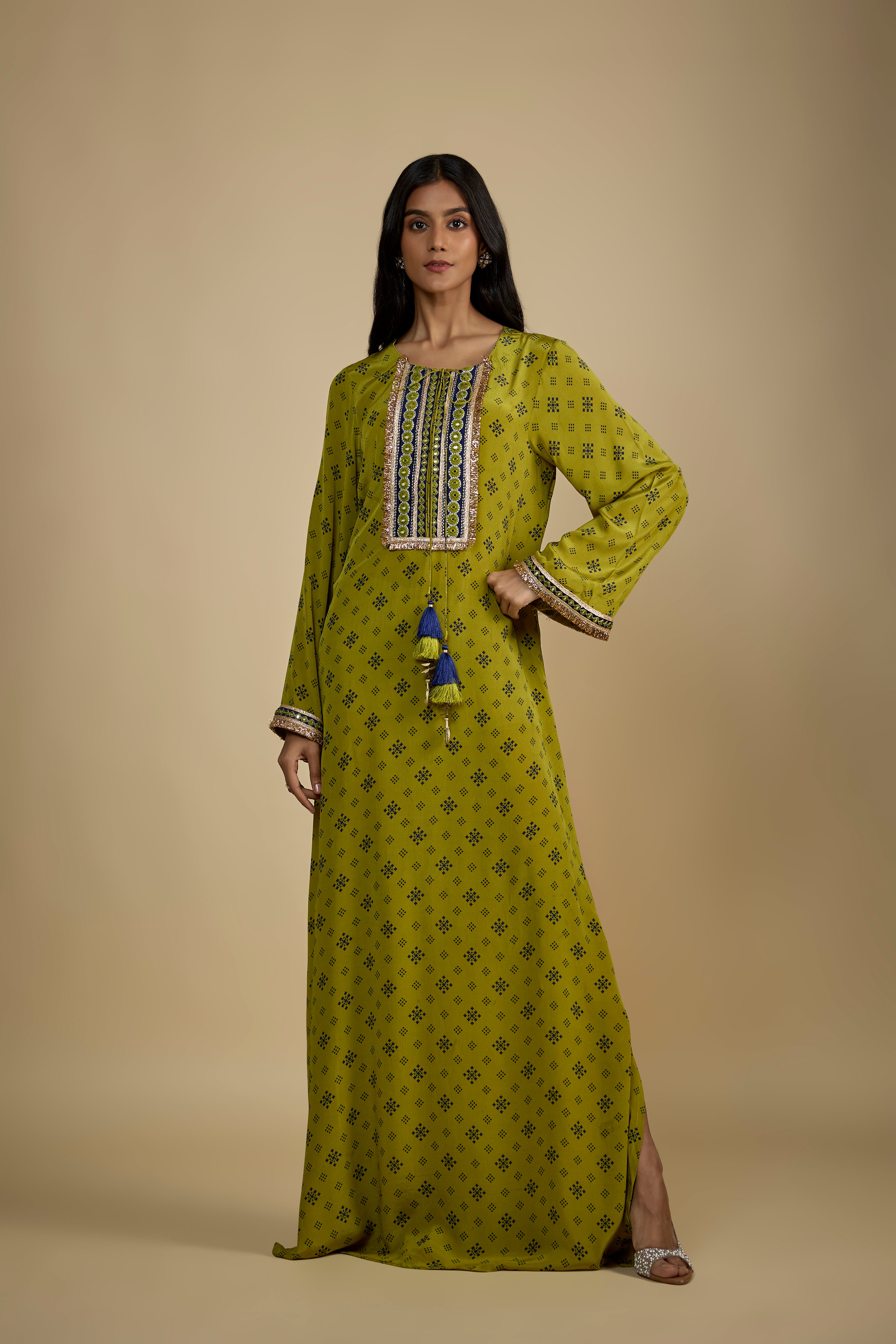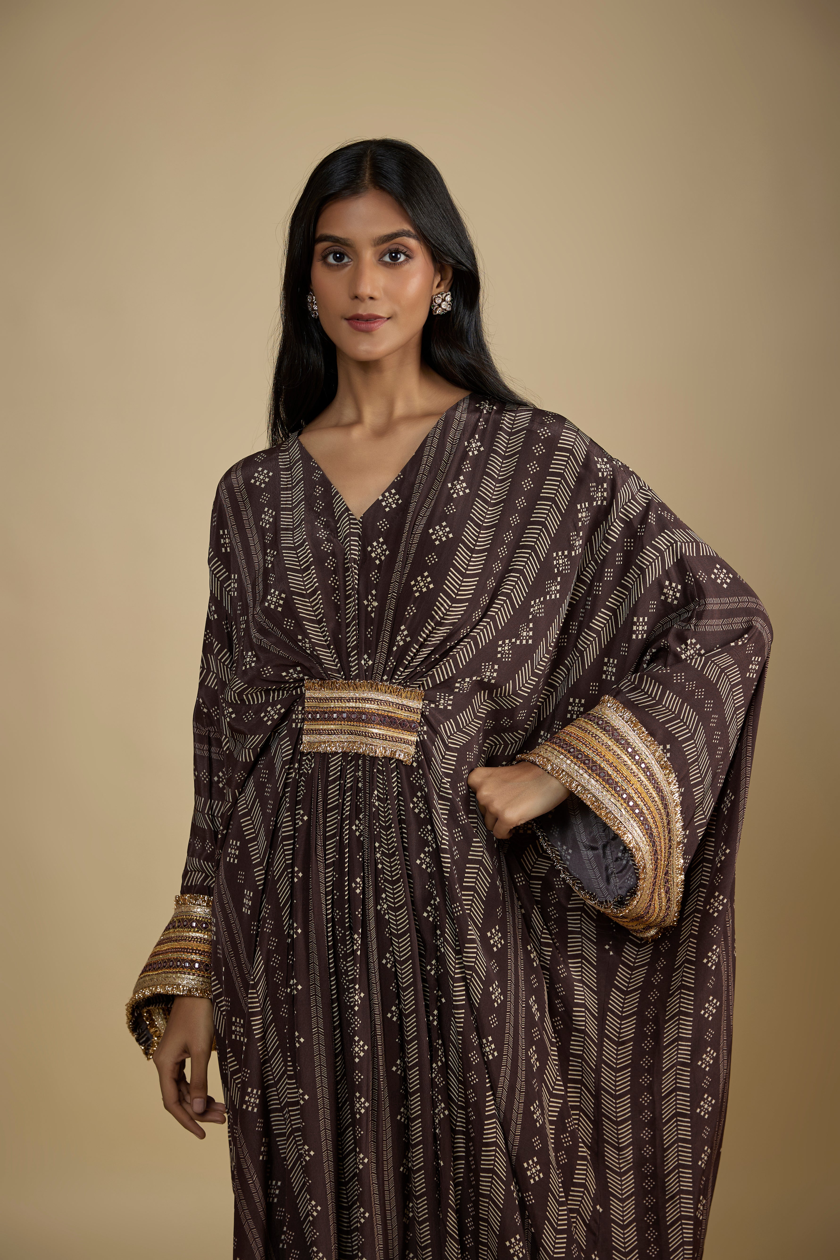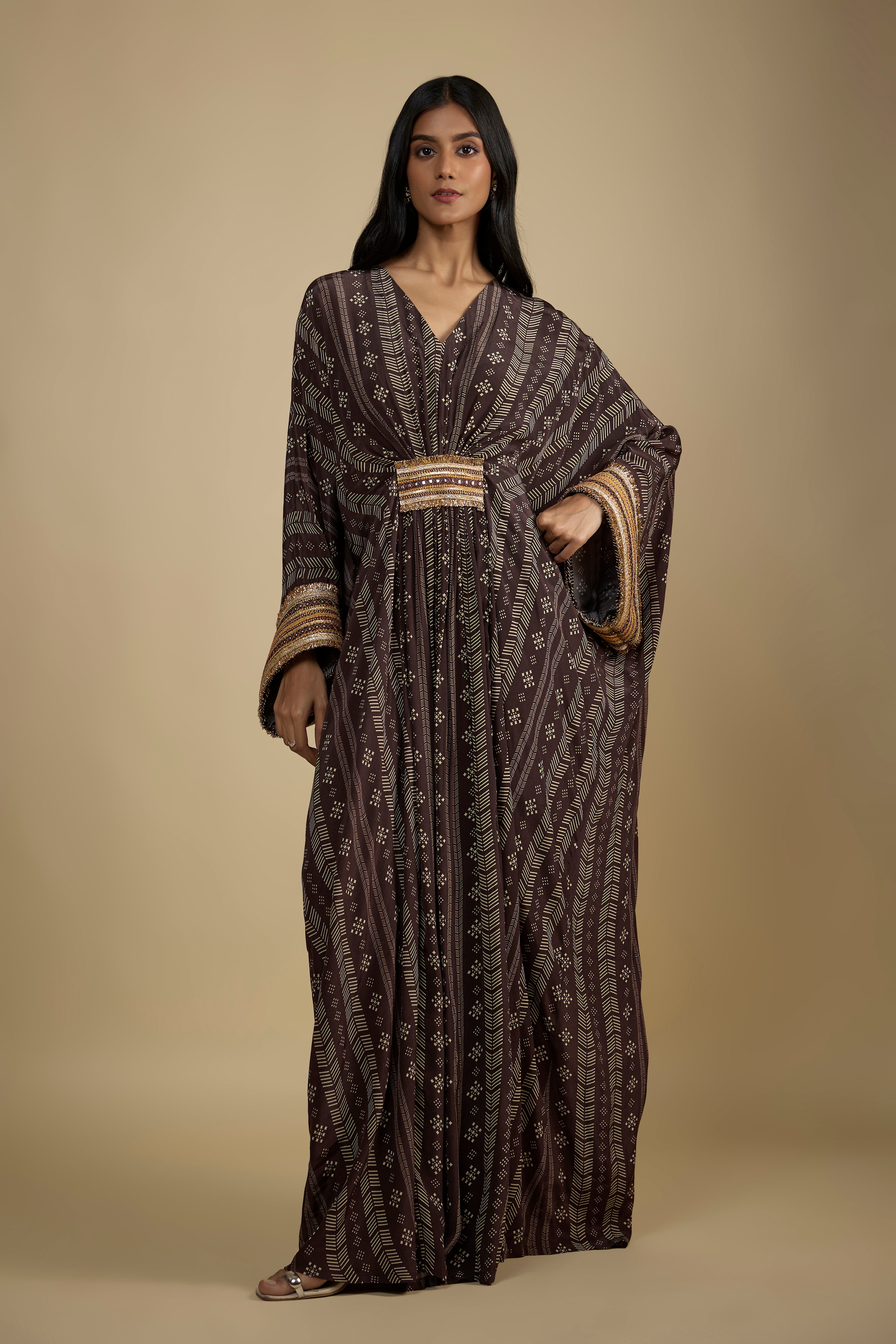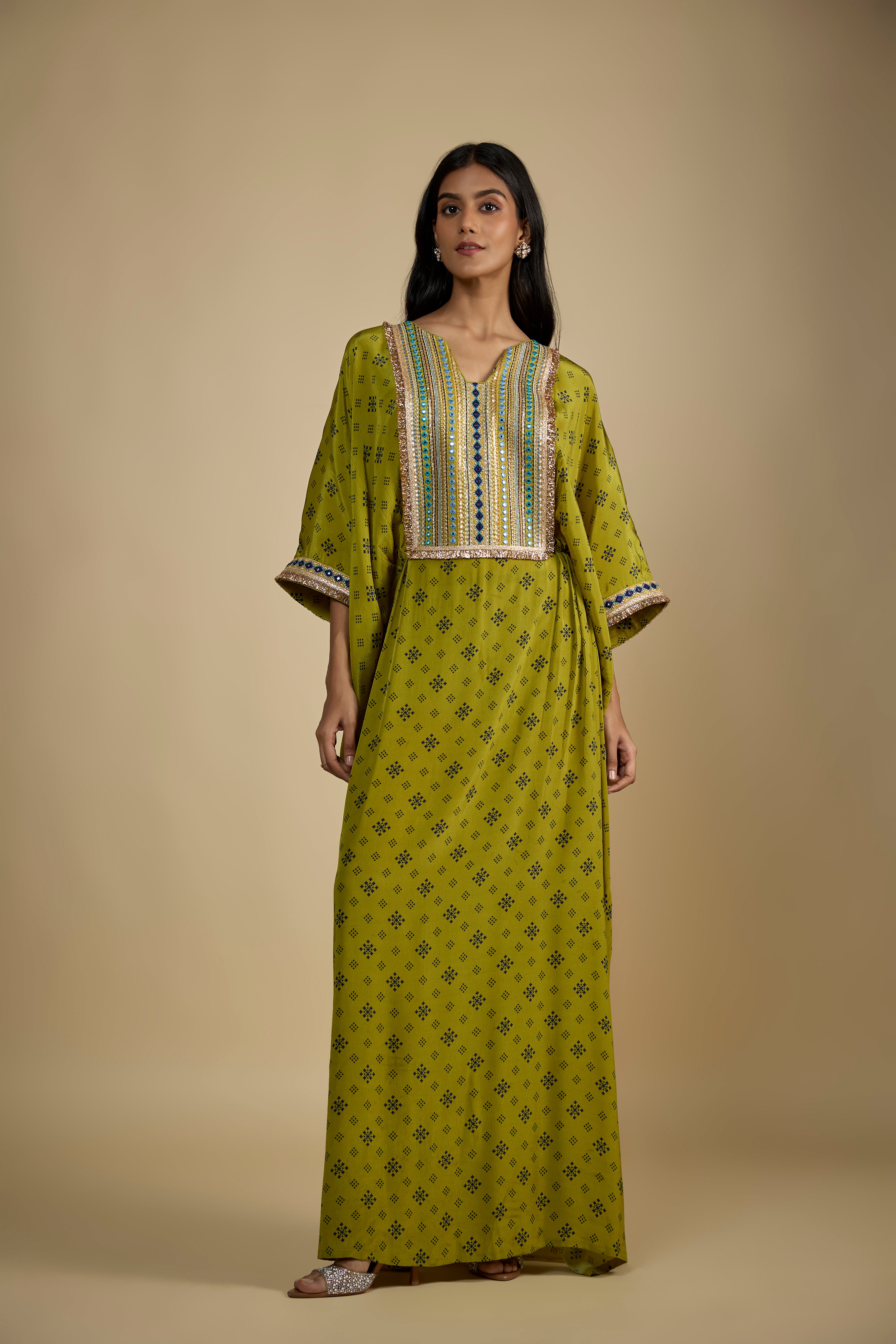 Multi Color Printed and Embroidered One- Shoulder Kaftan