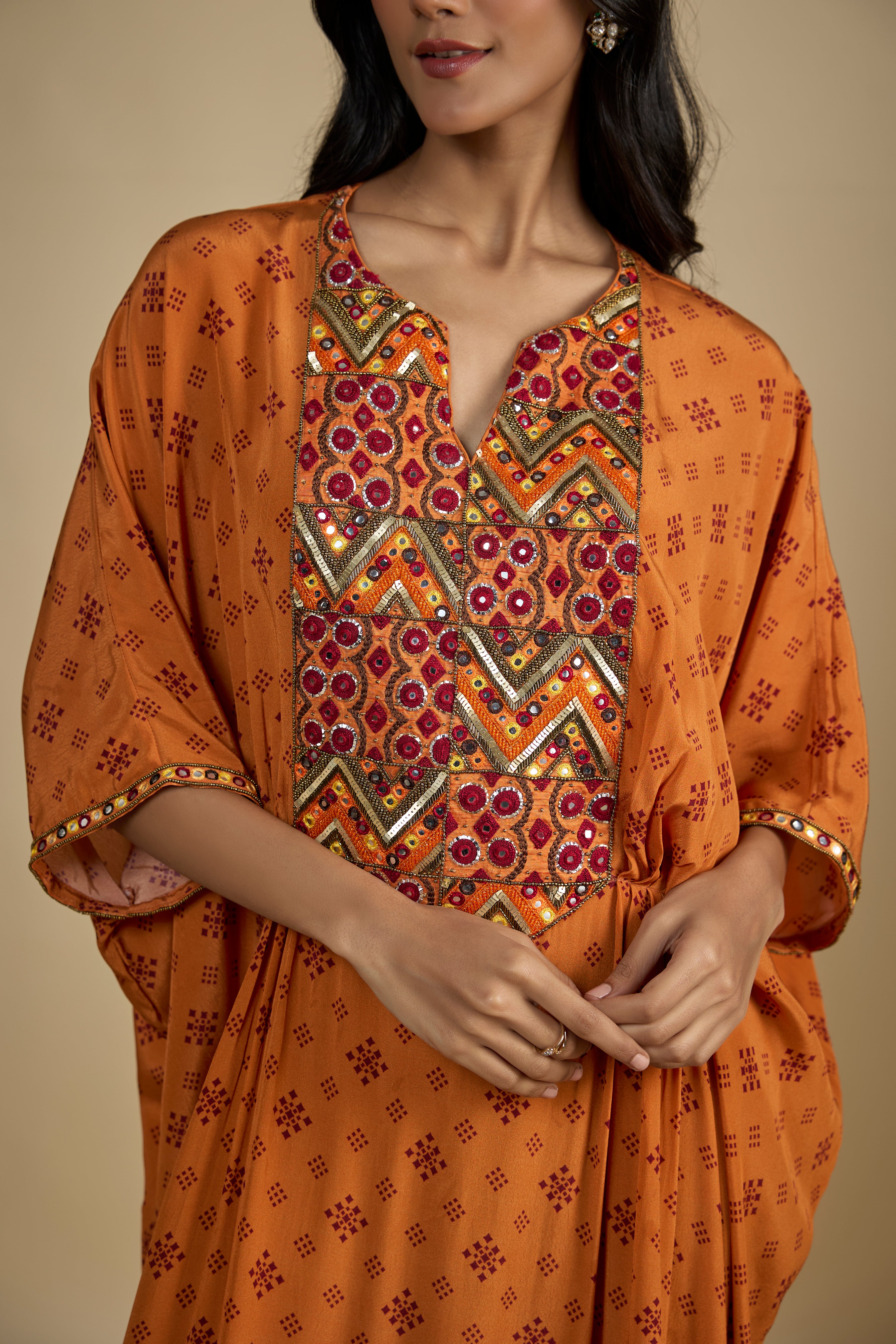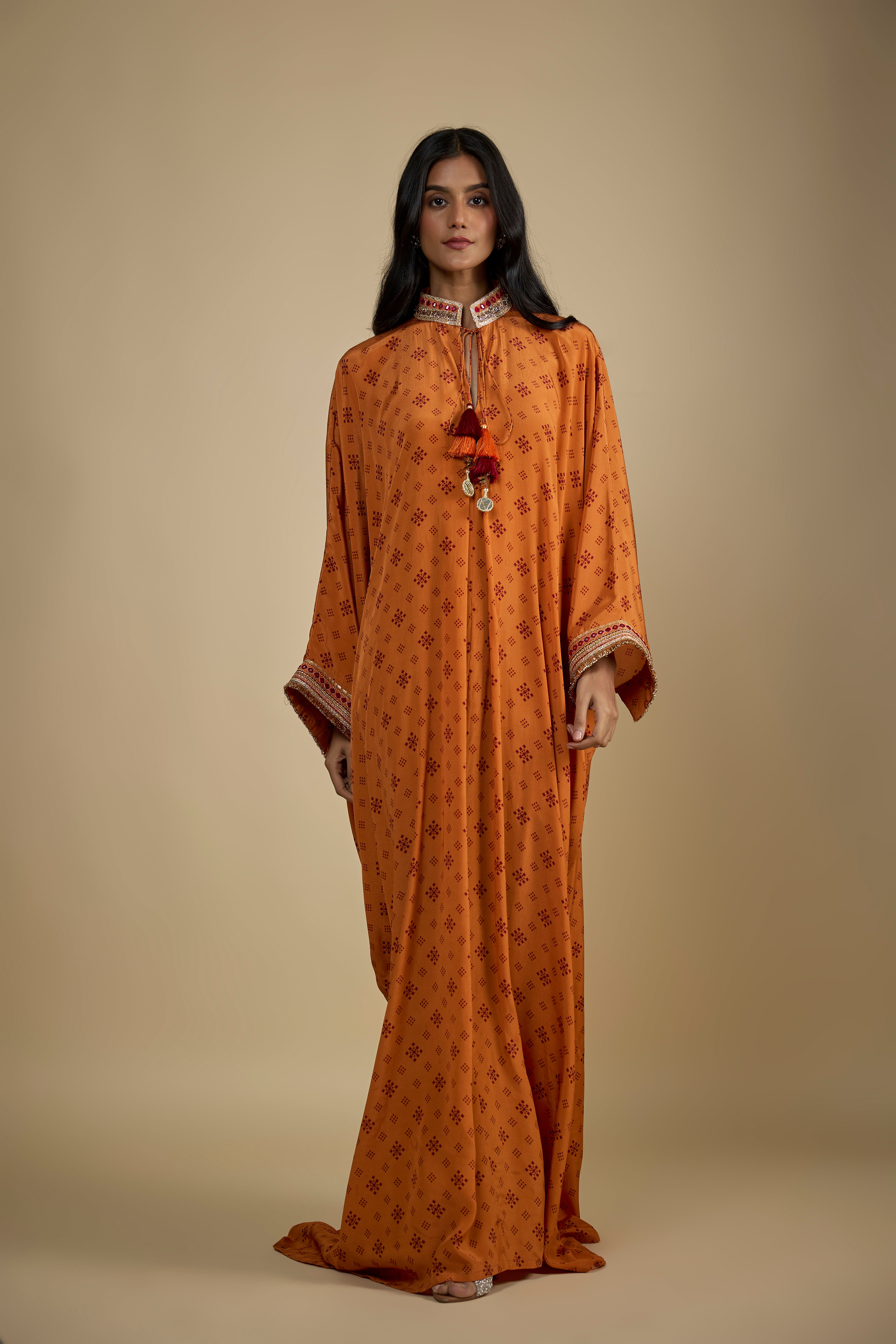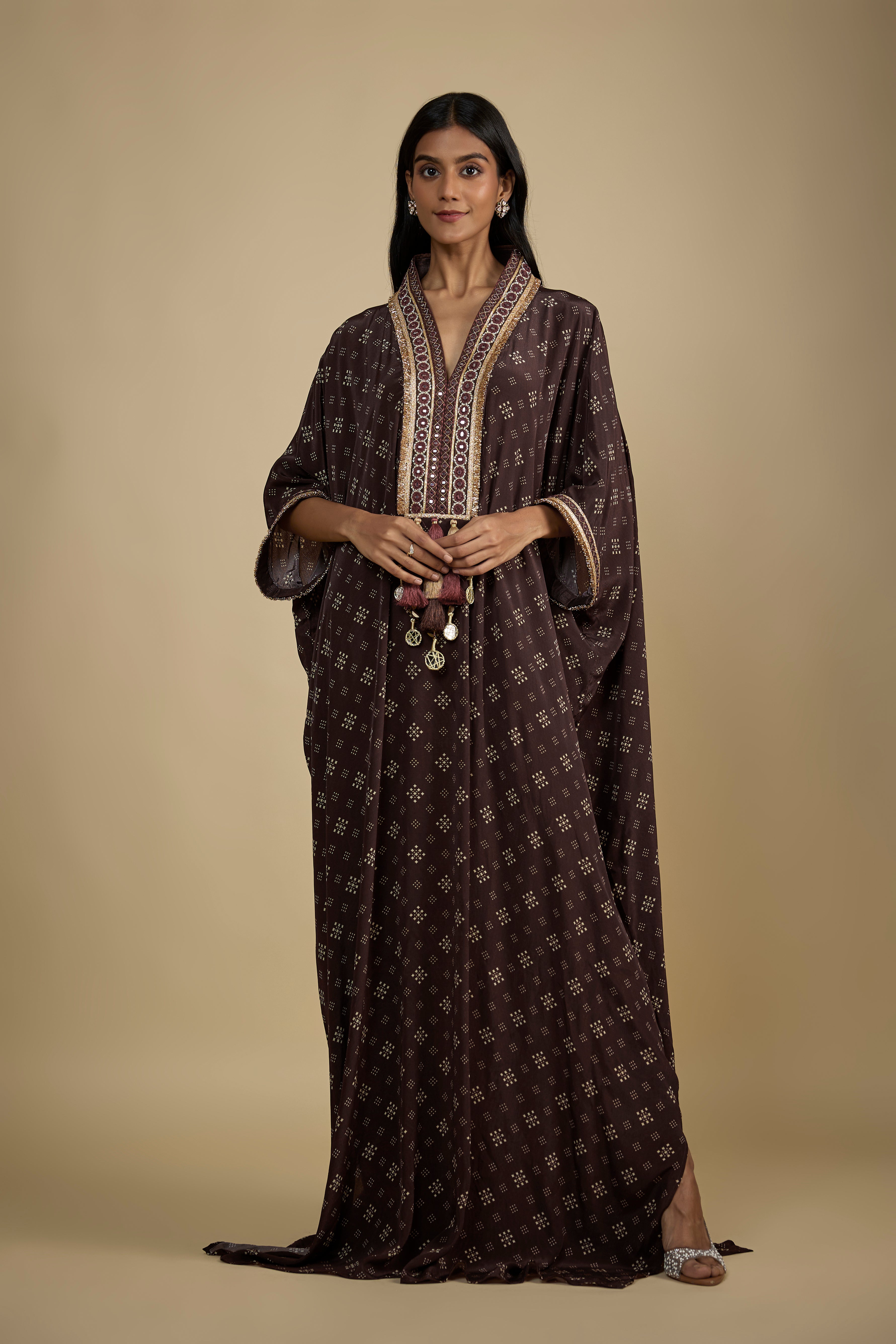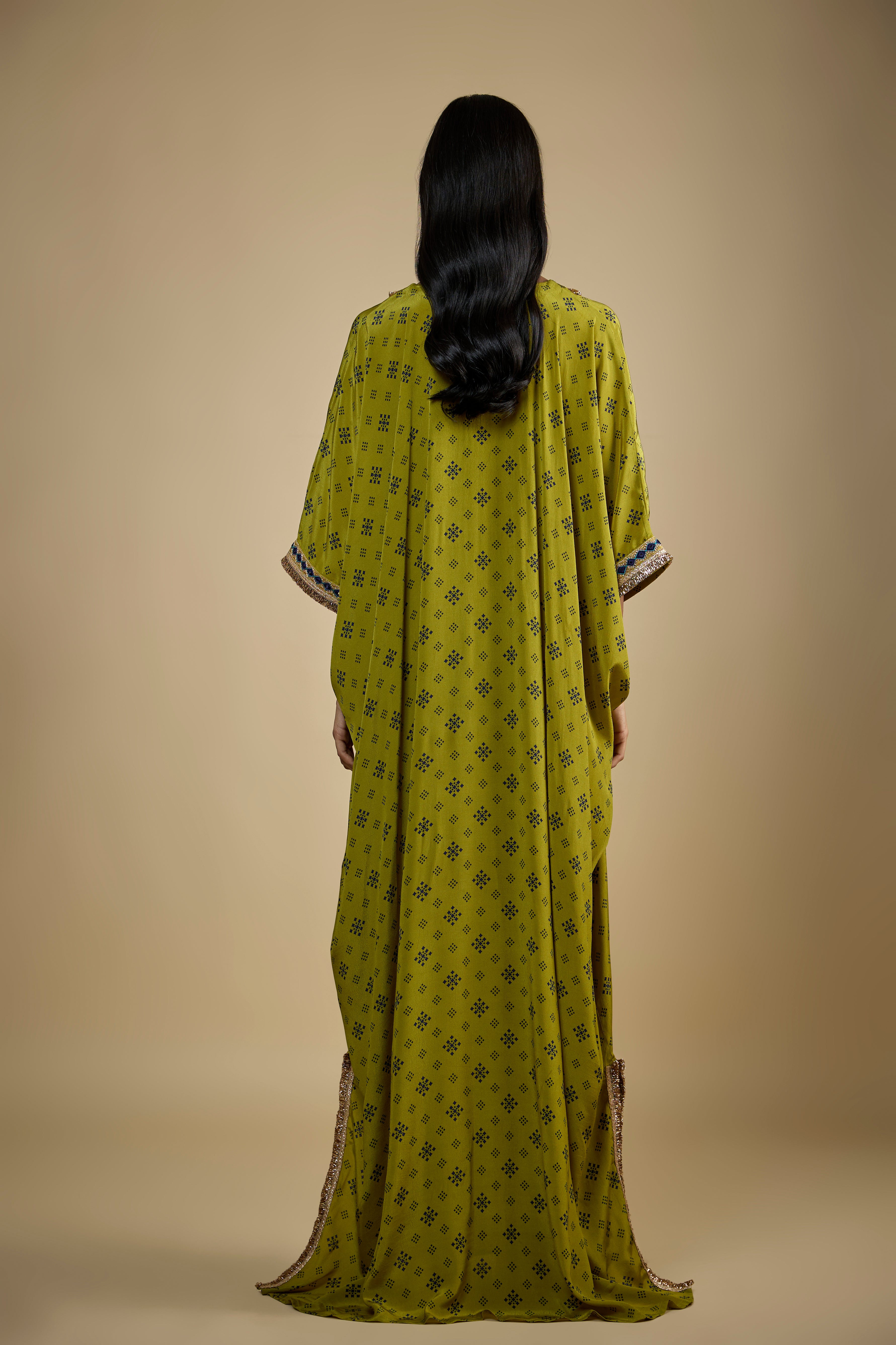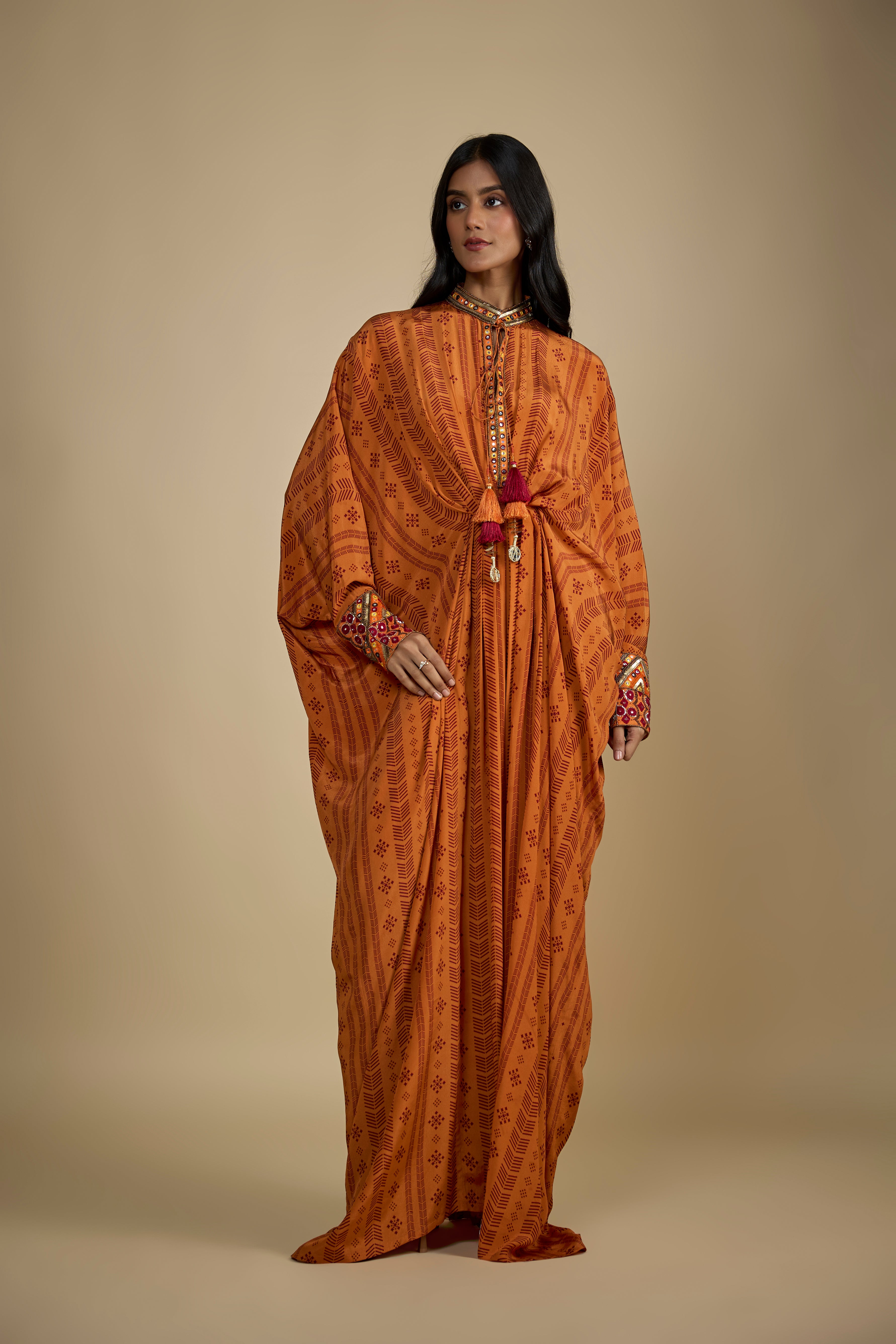 Multi Color Printed and Embroidered One- Shoulder Kaftan