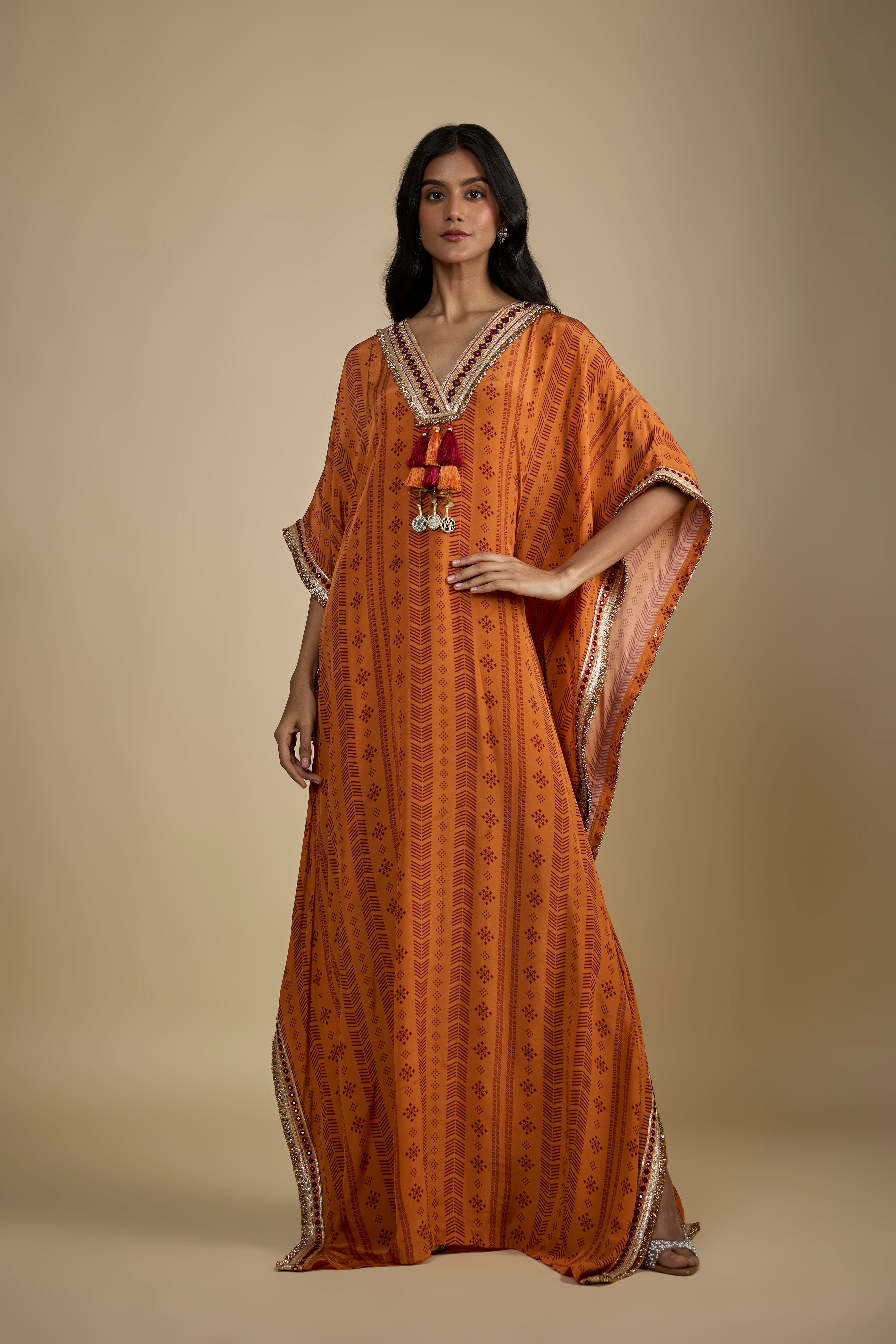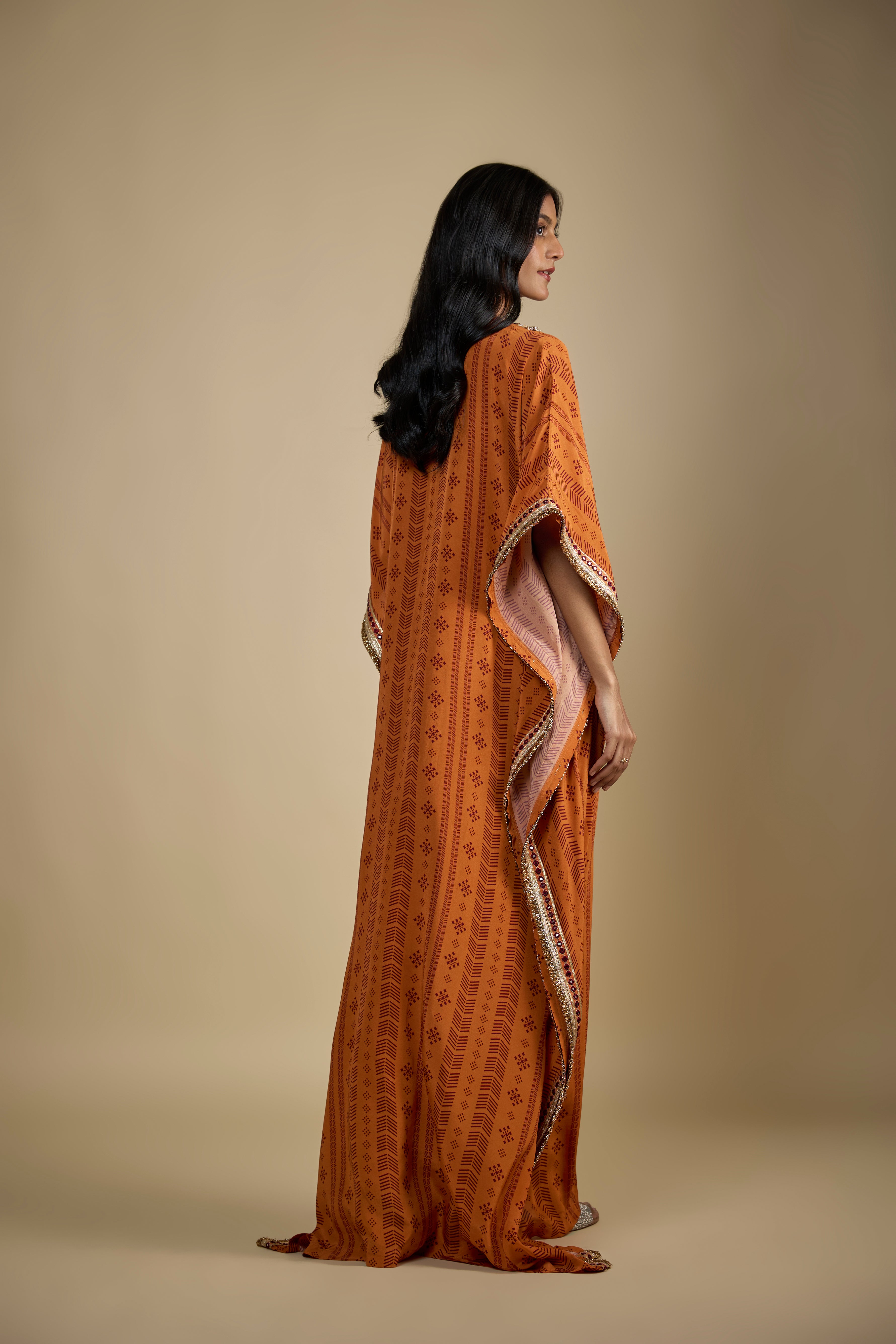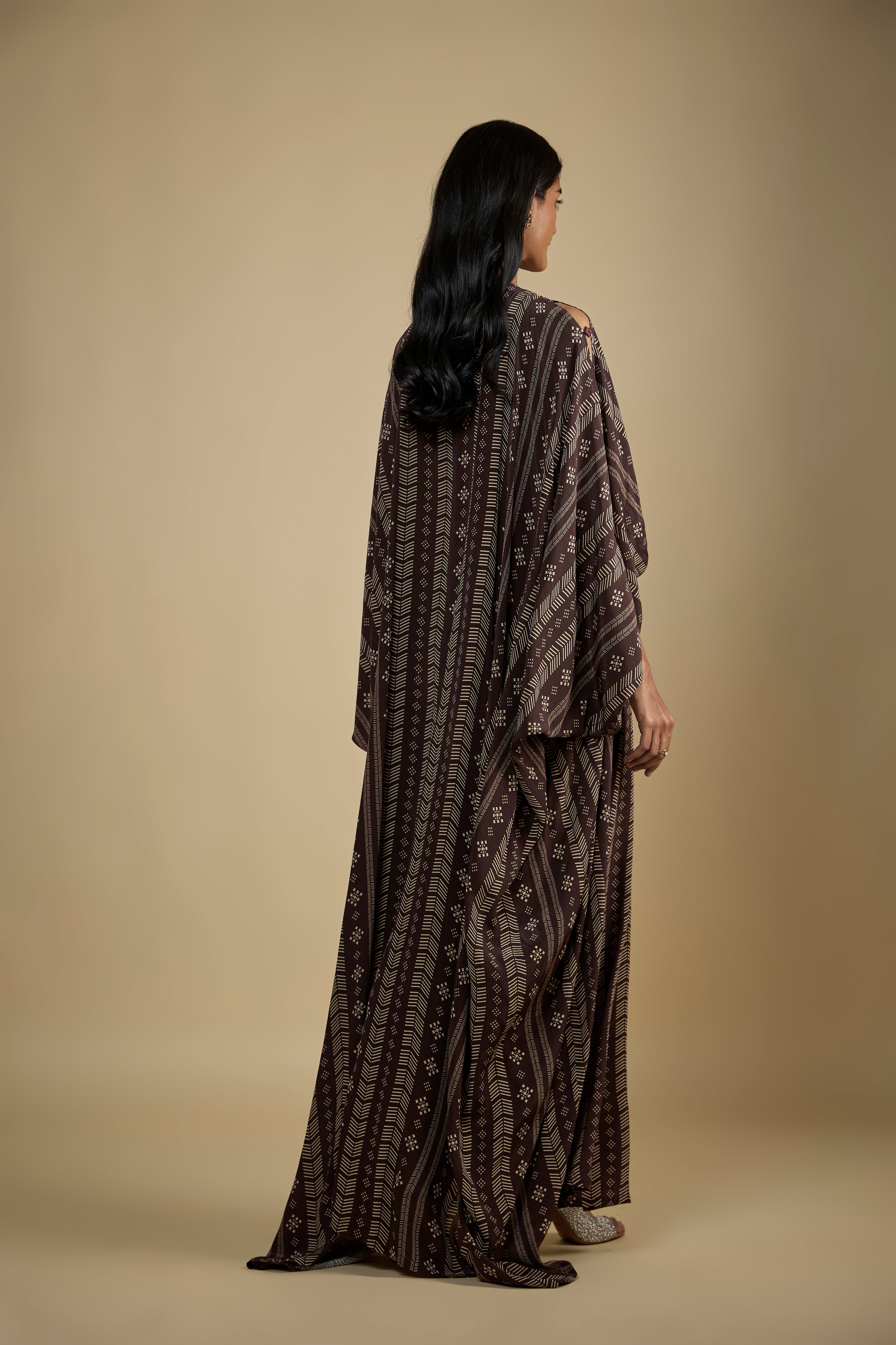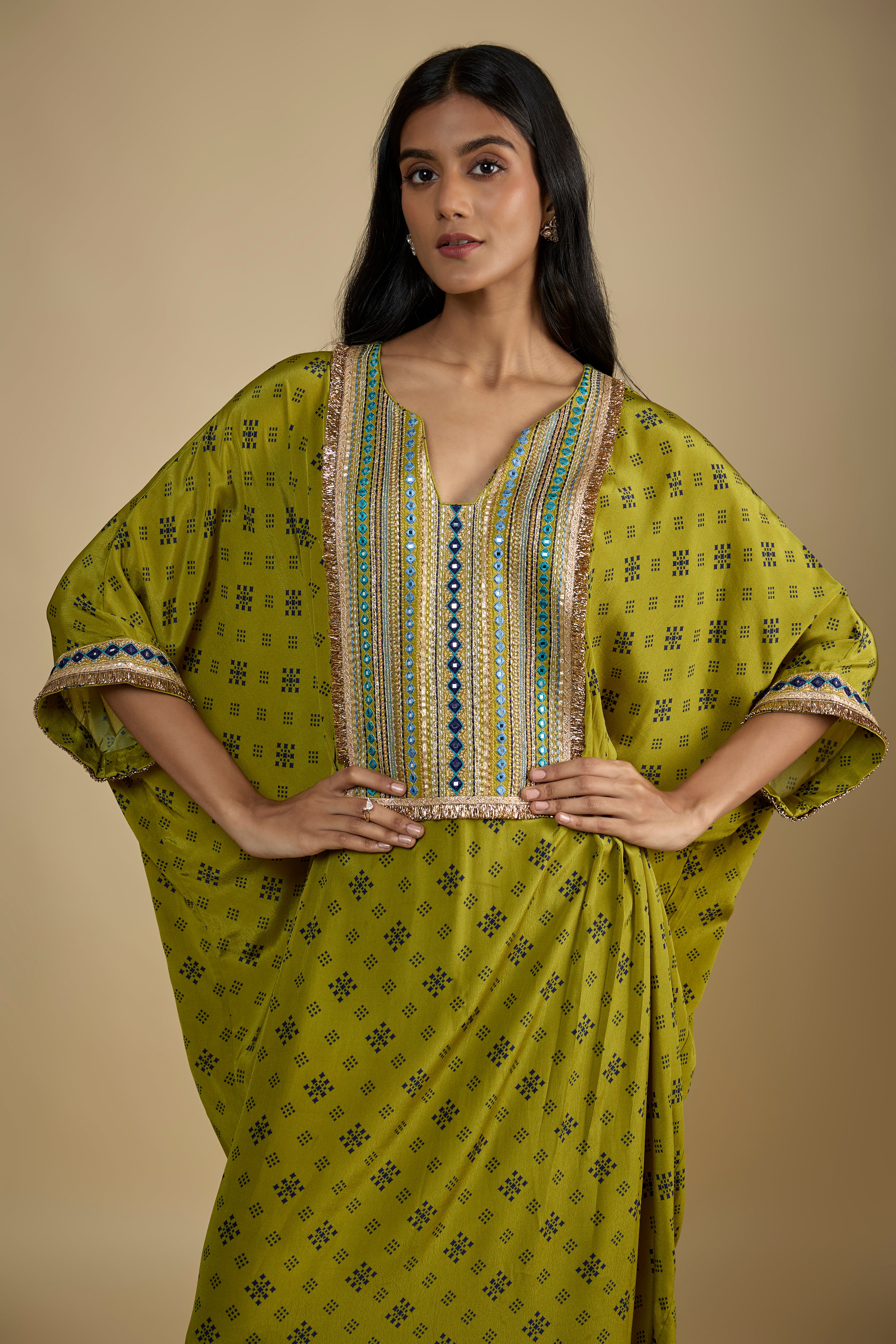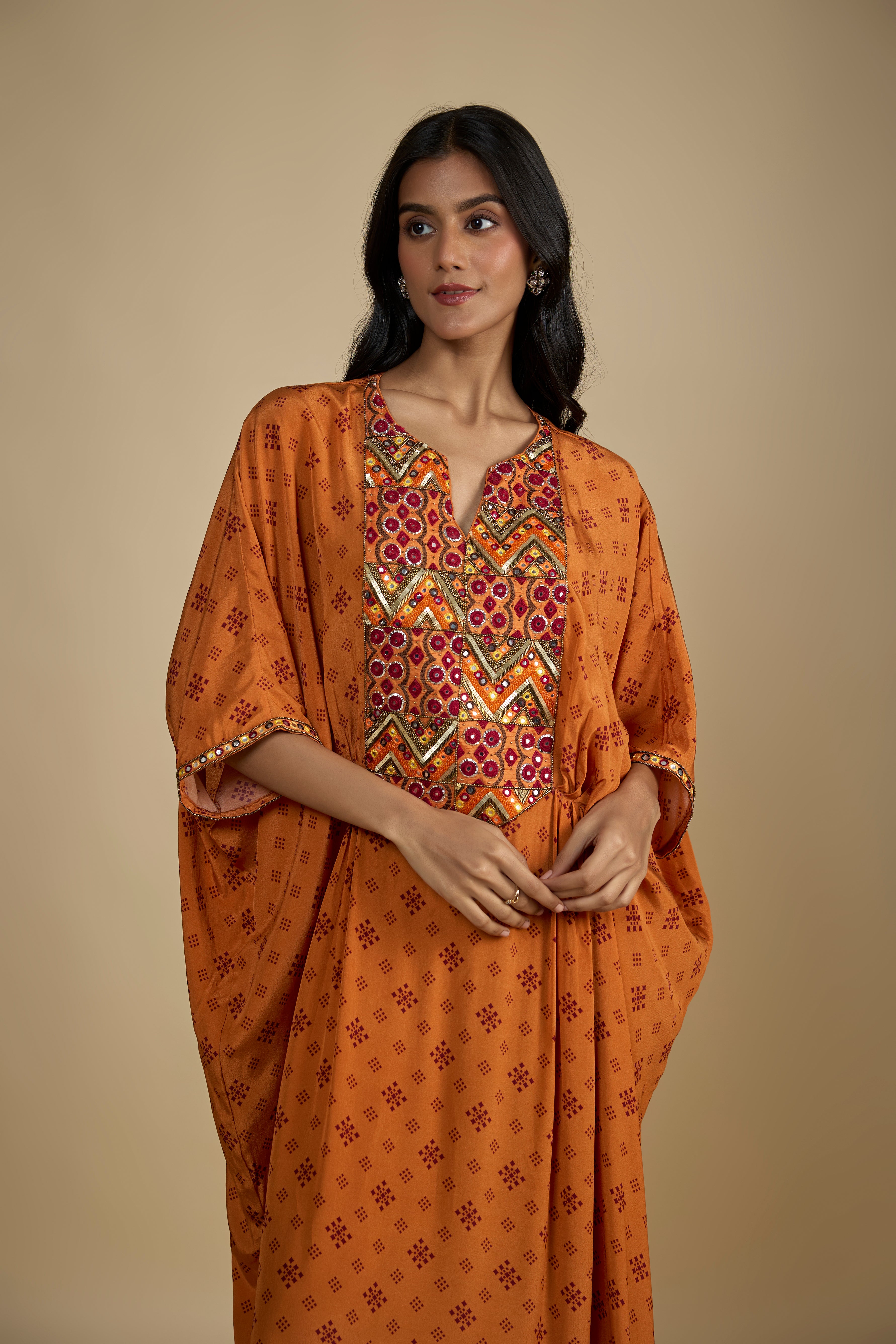 Multi Color Printed and Embroidered One- Shoulder Kaftan