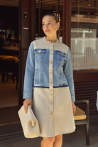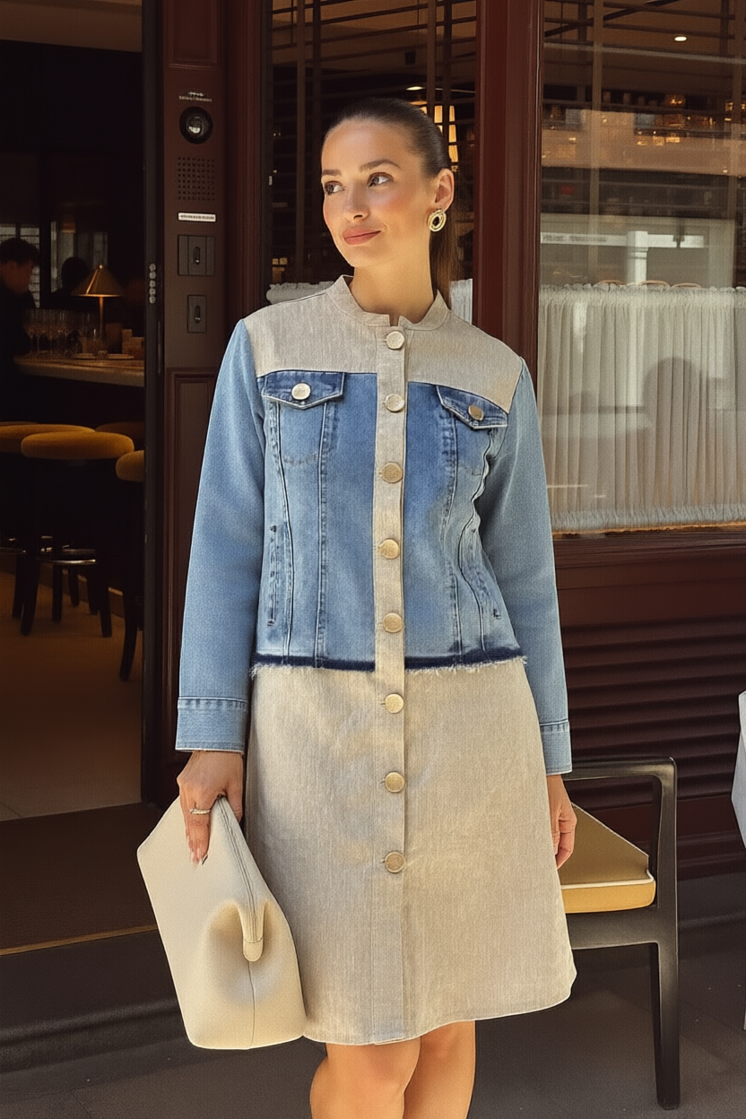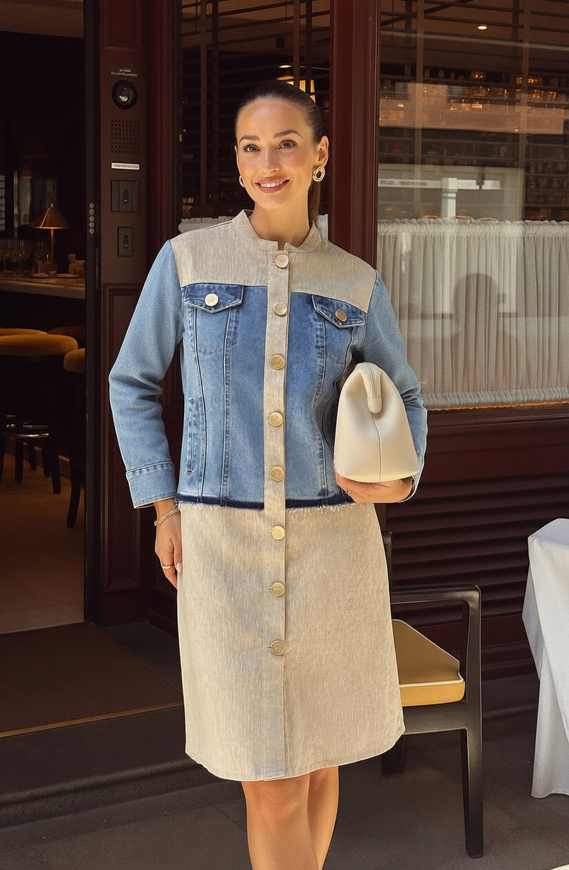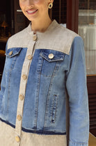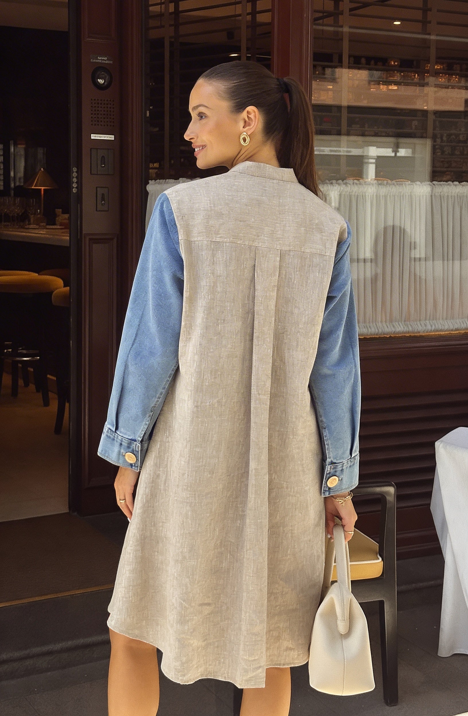 Featuring a beige linen and blue denim color blocked midi shirt dress, mandarin collared, full button-down front with gold-toned buttons.