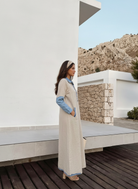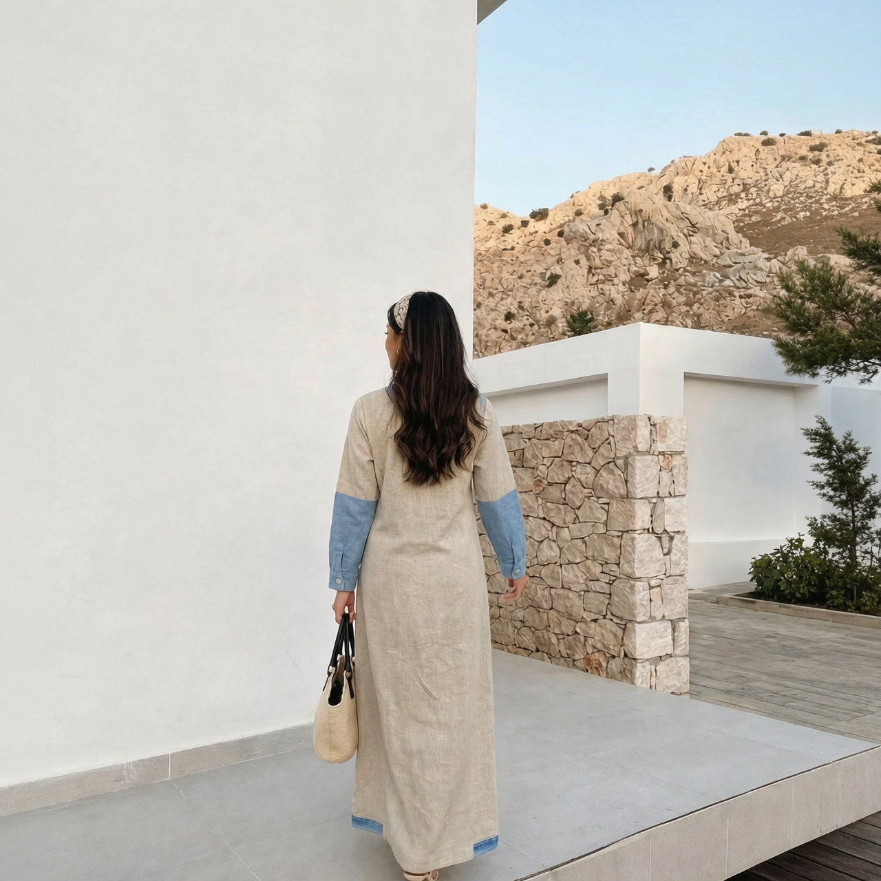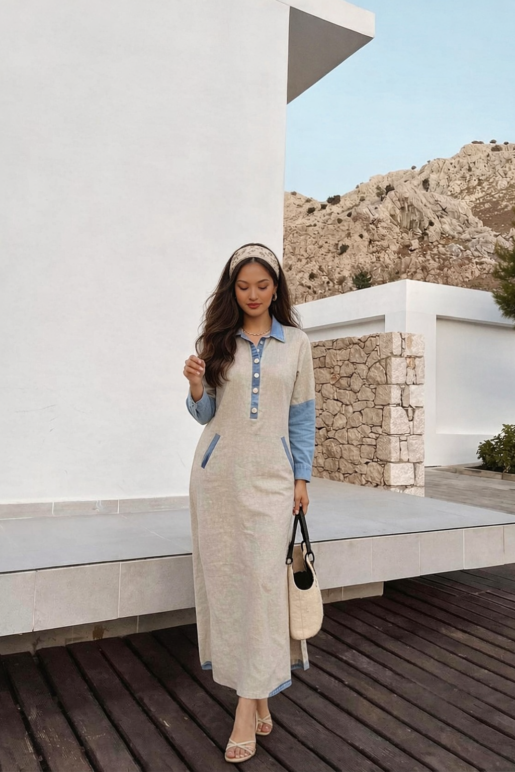 Featuring a beige linen color-blocked maxi/ ankle length dress with light blue denim contrast panels, Polo-style collar, half button-down placket with gold-toned buttons, long sleeves with cuffs, angled welt pockets with blue trim.
