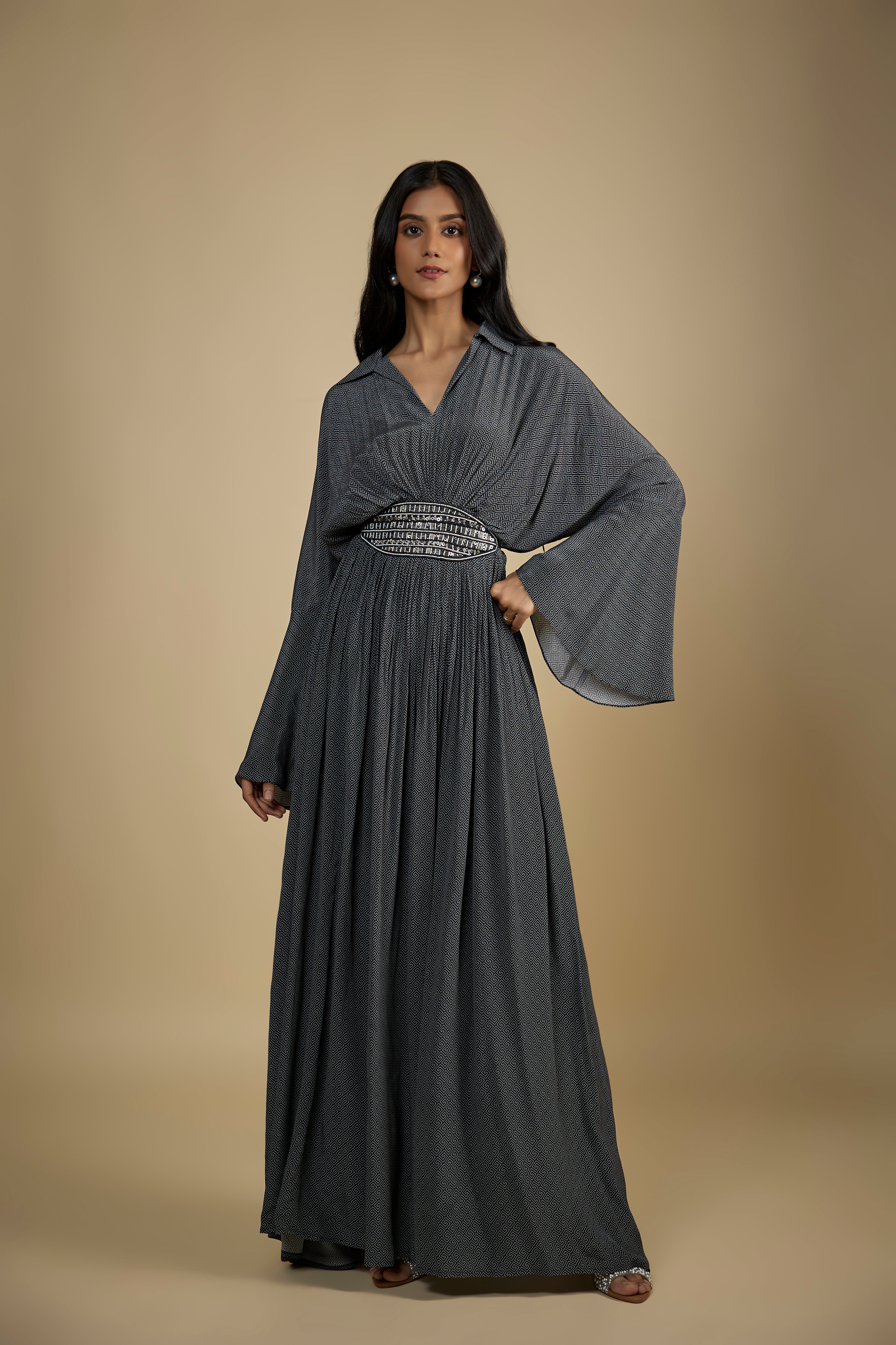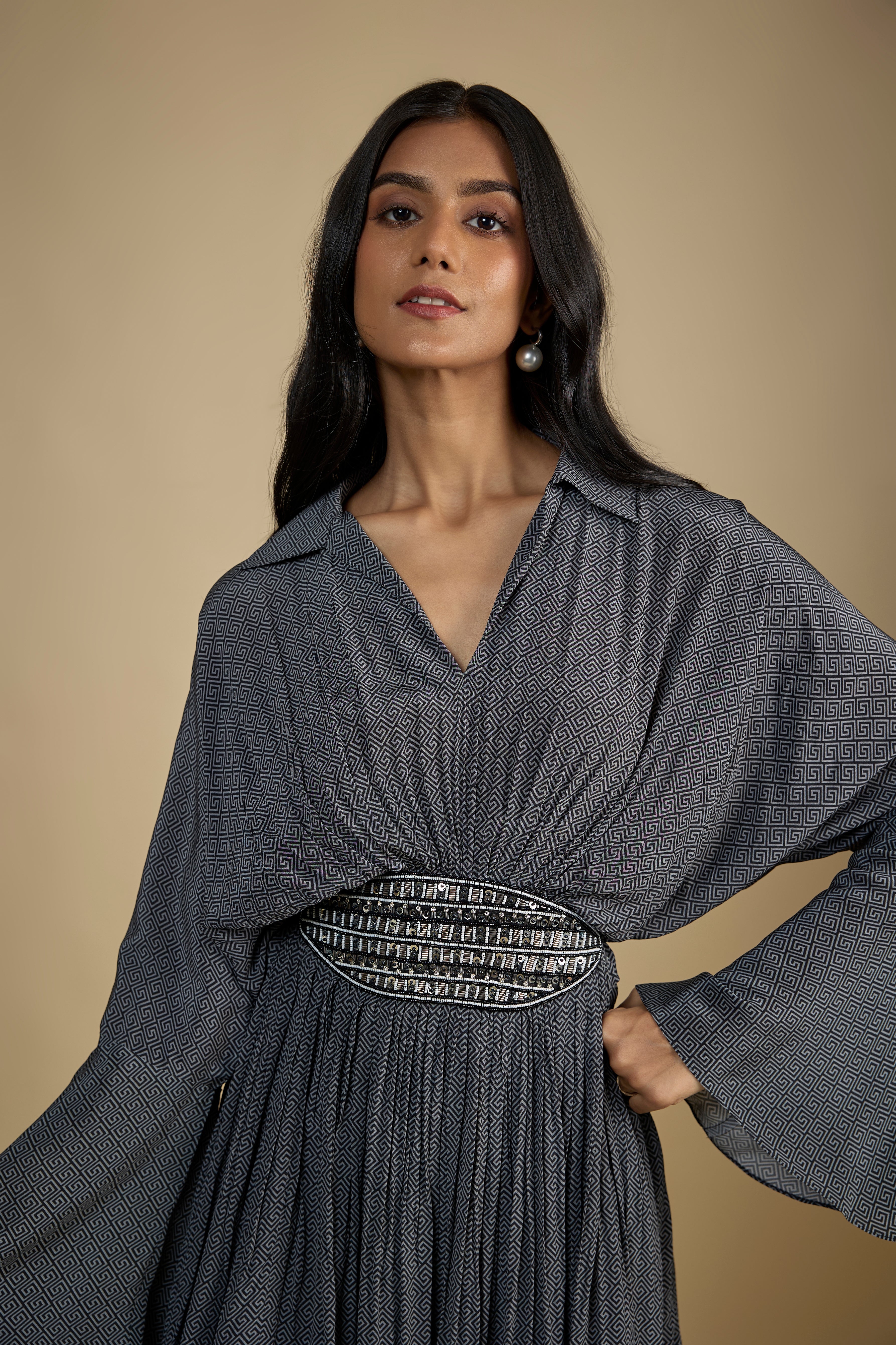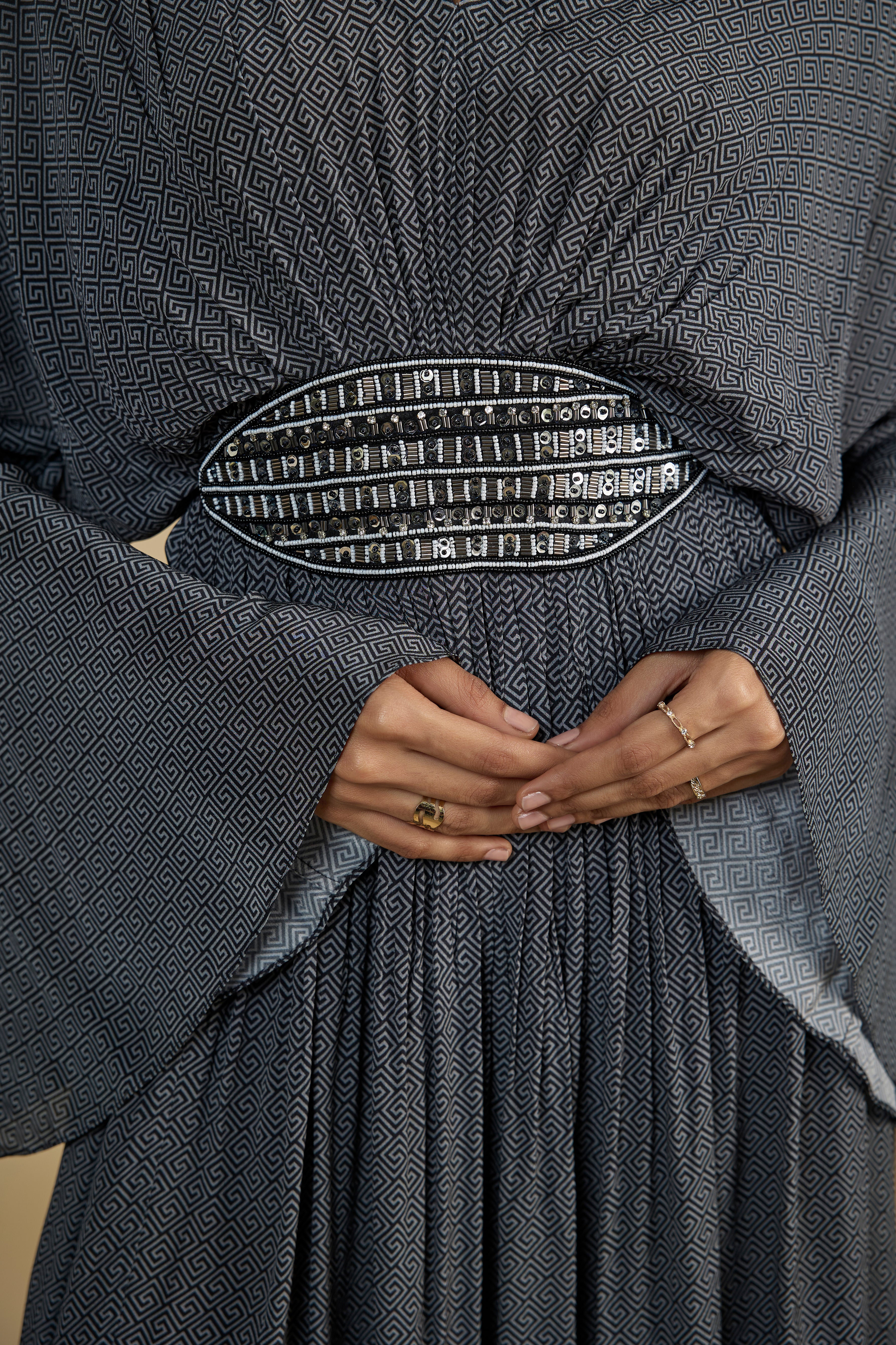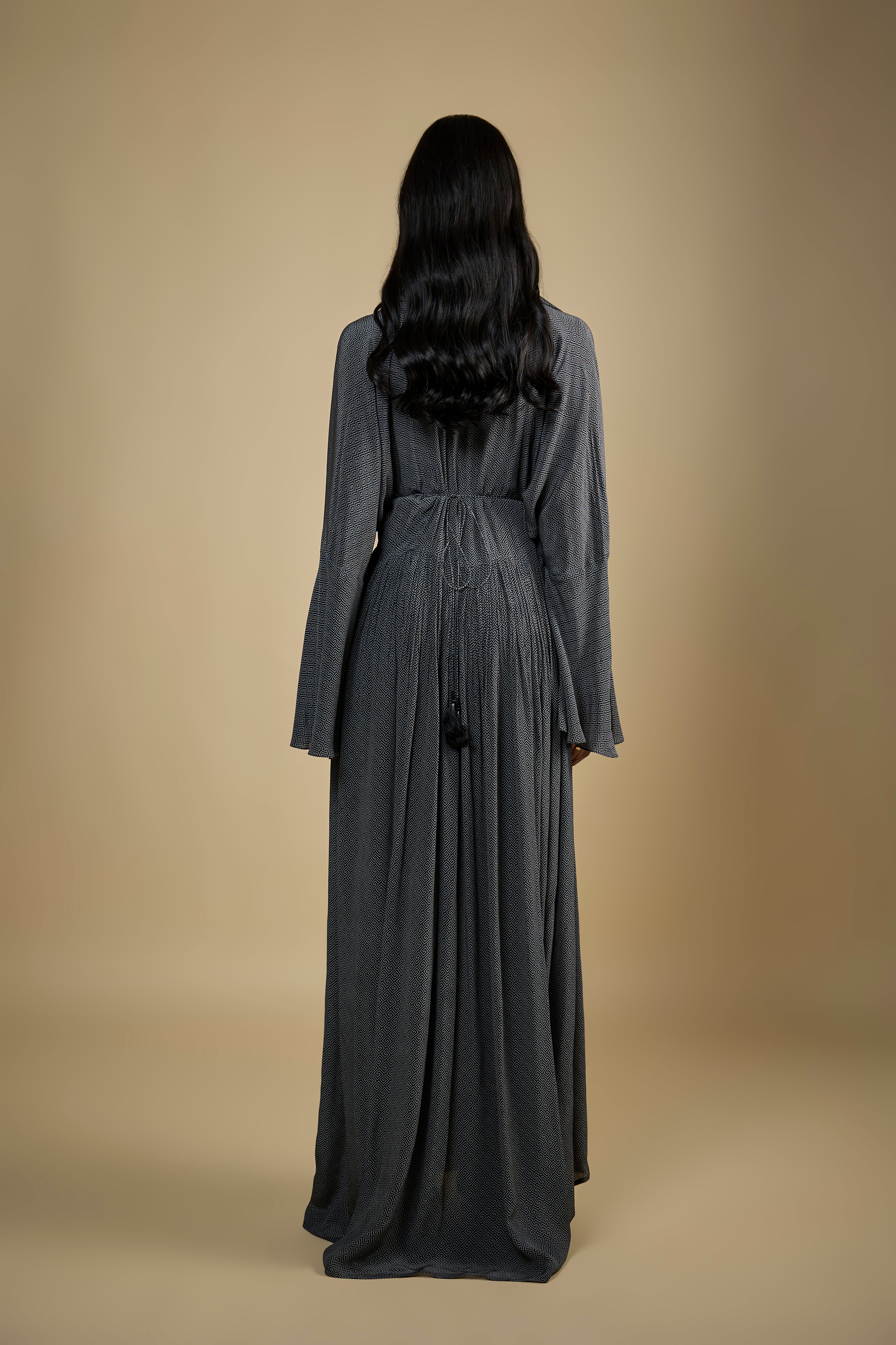 Featuring a black printed dress in crepe fabric with metallic sequins and stone embroidery on the waist line, with drawstring closure at the back with tassels.