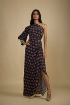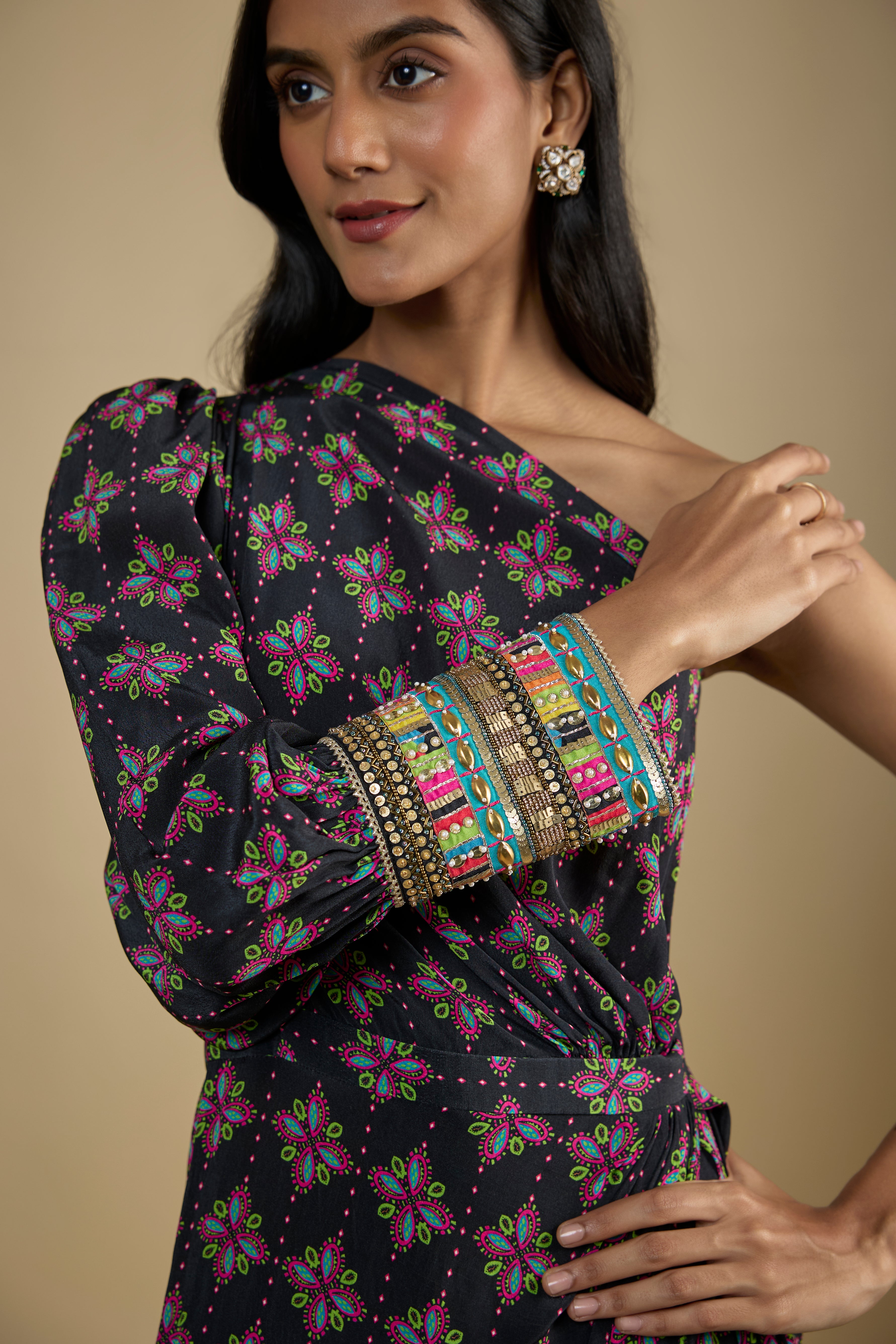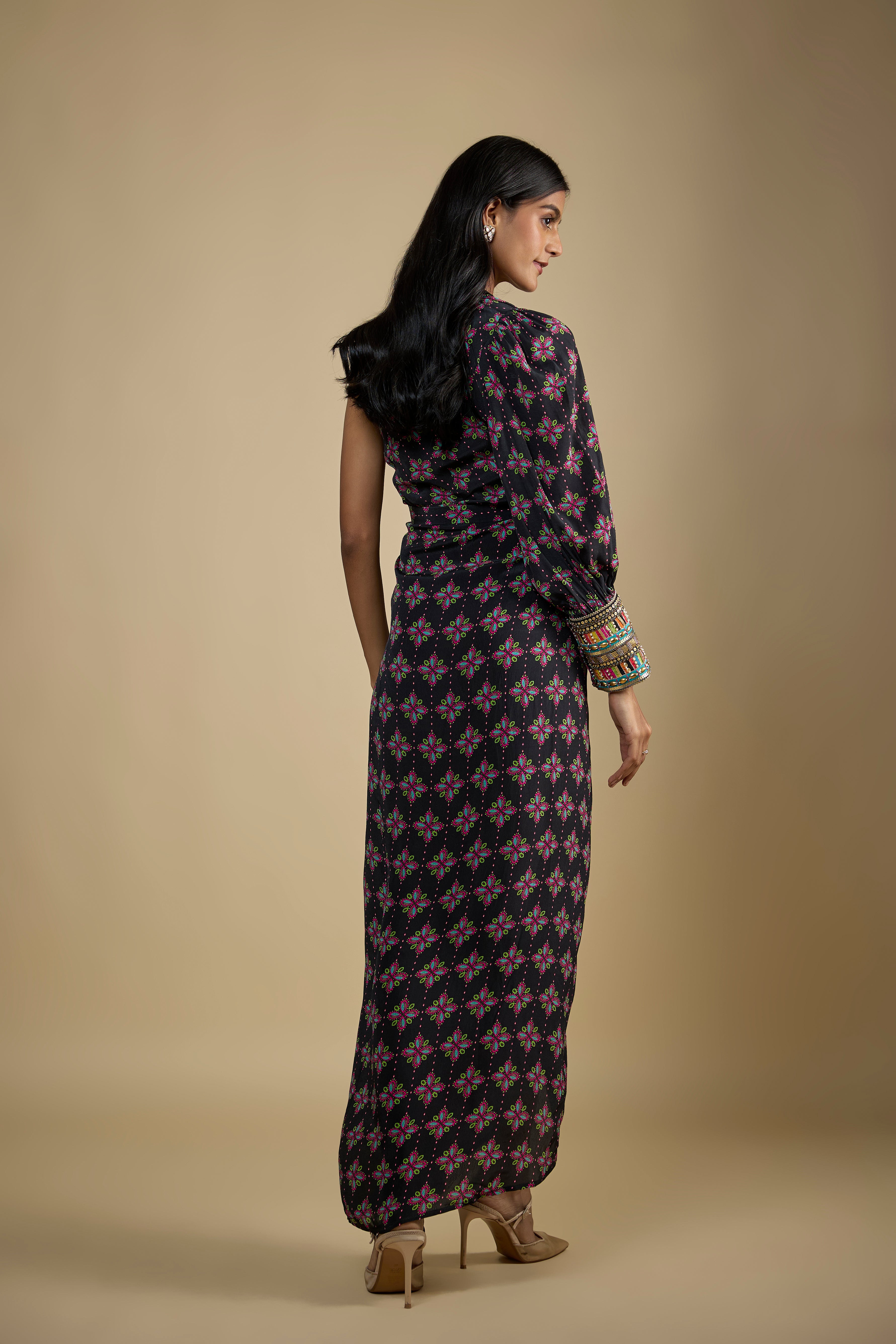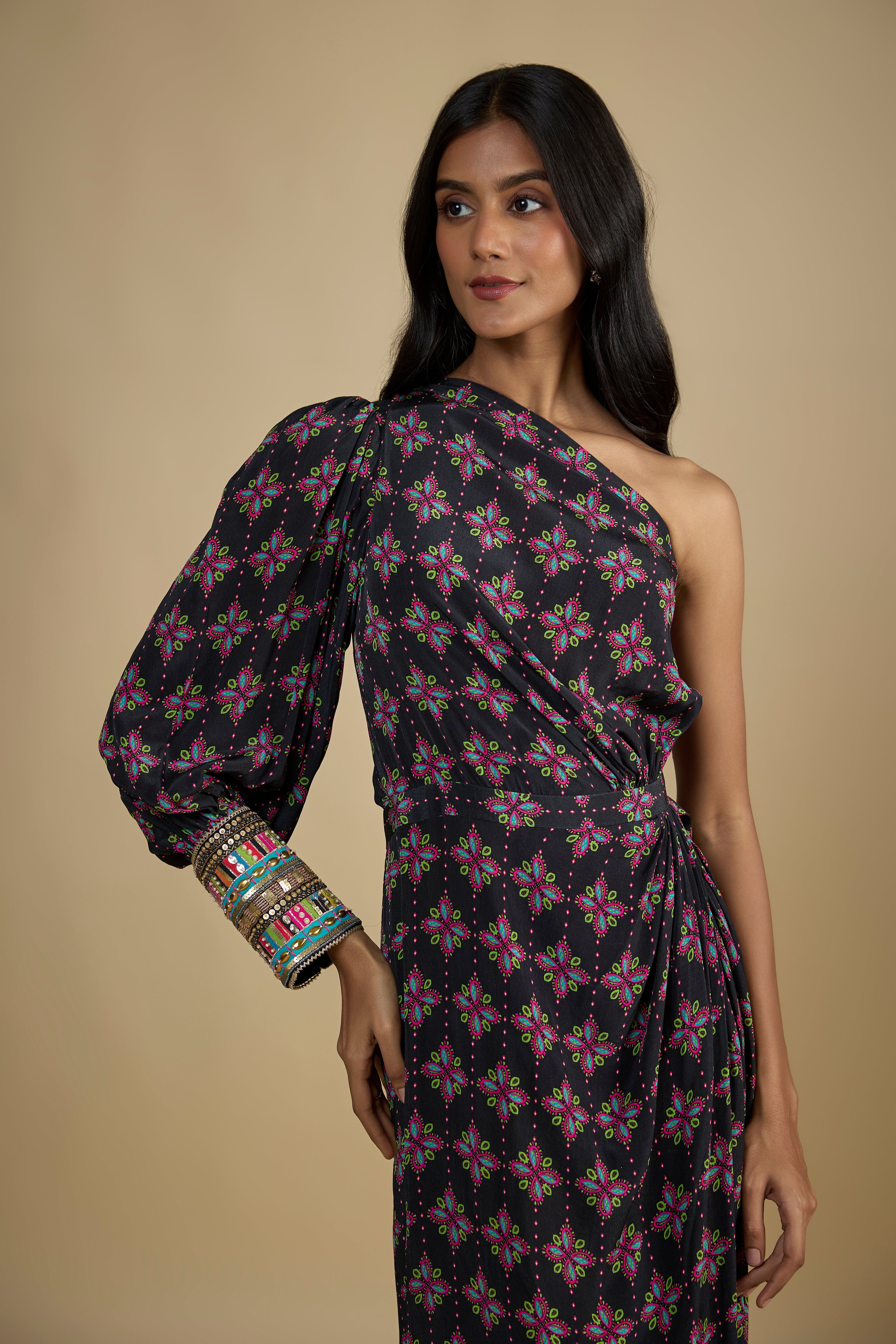 Featuring a black base with multicolor printed one-shoulder dress in crepe fabric with sequins and beads embroidery work.