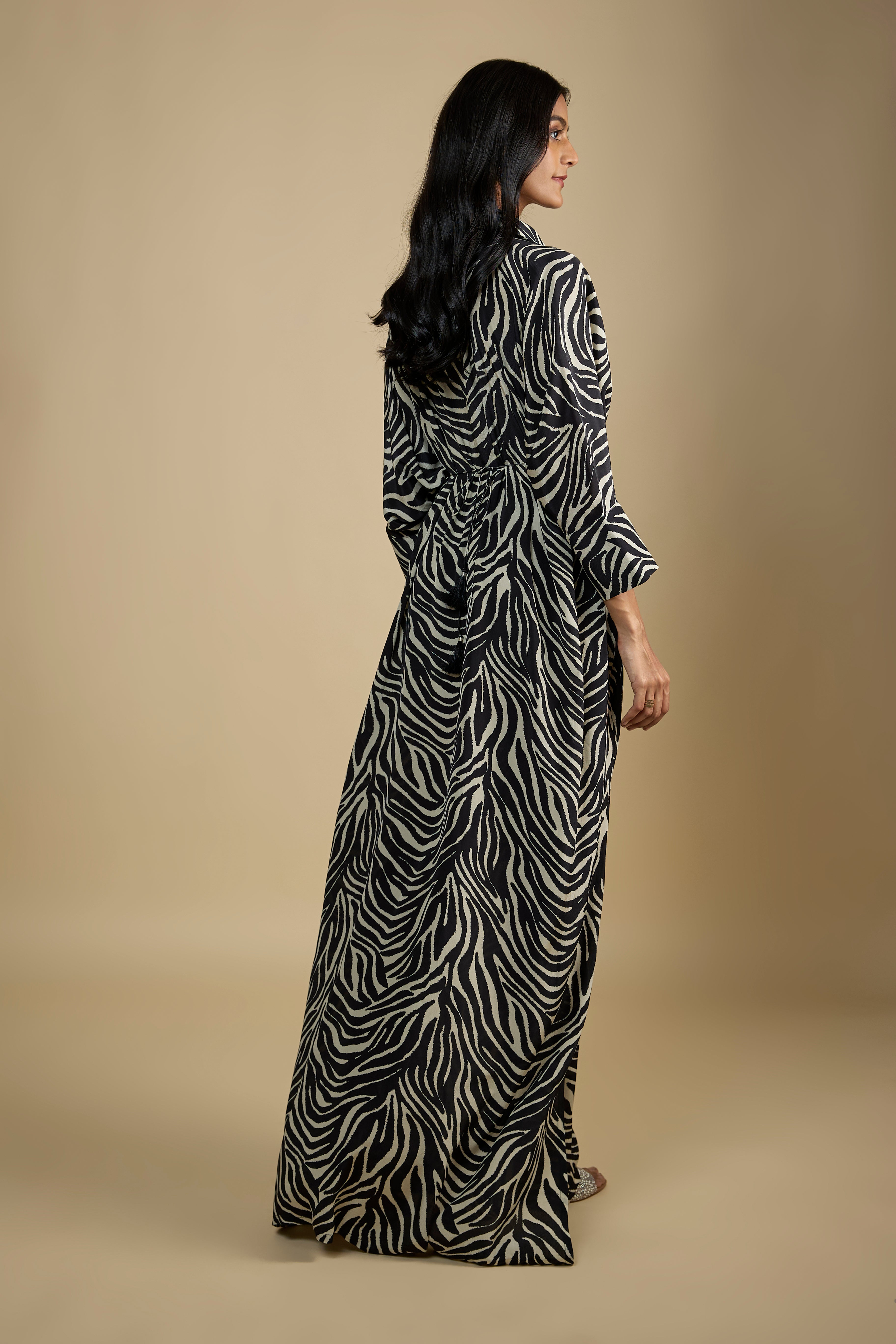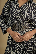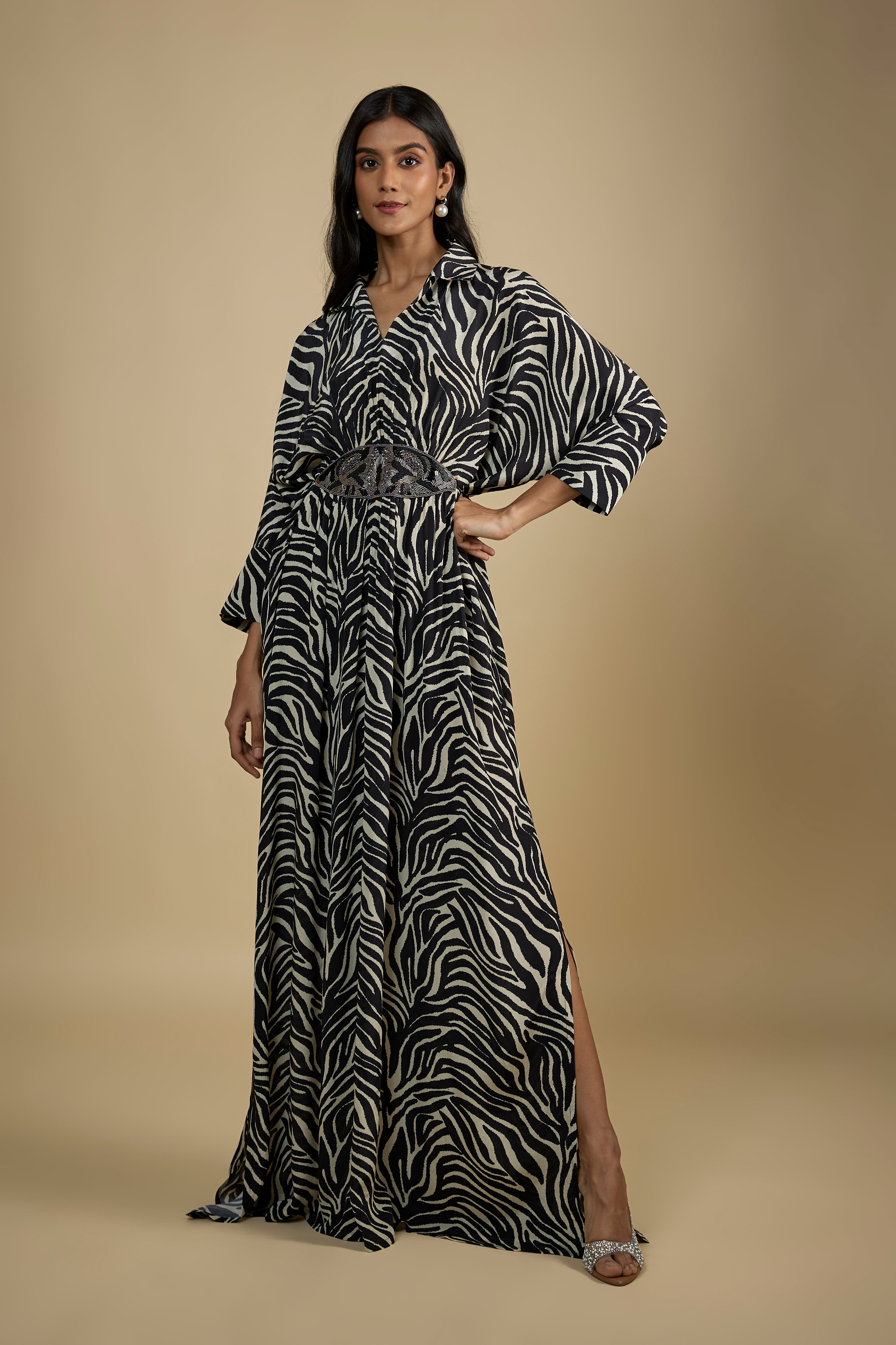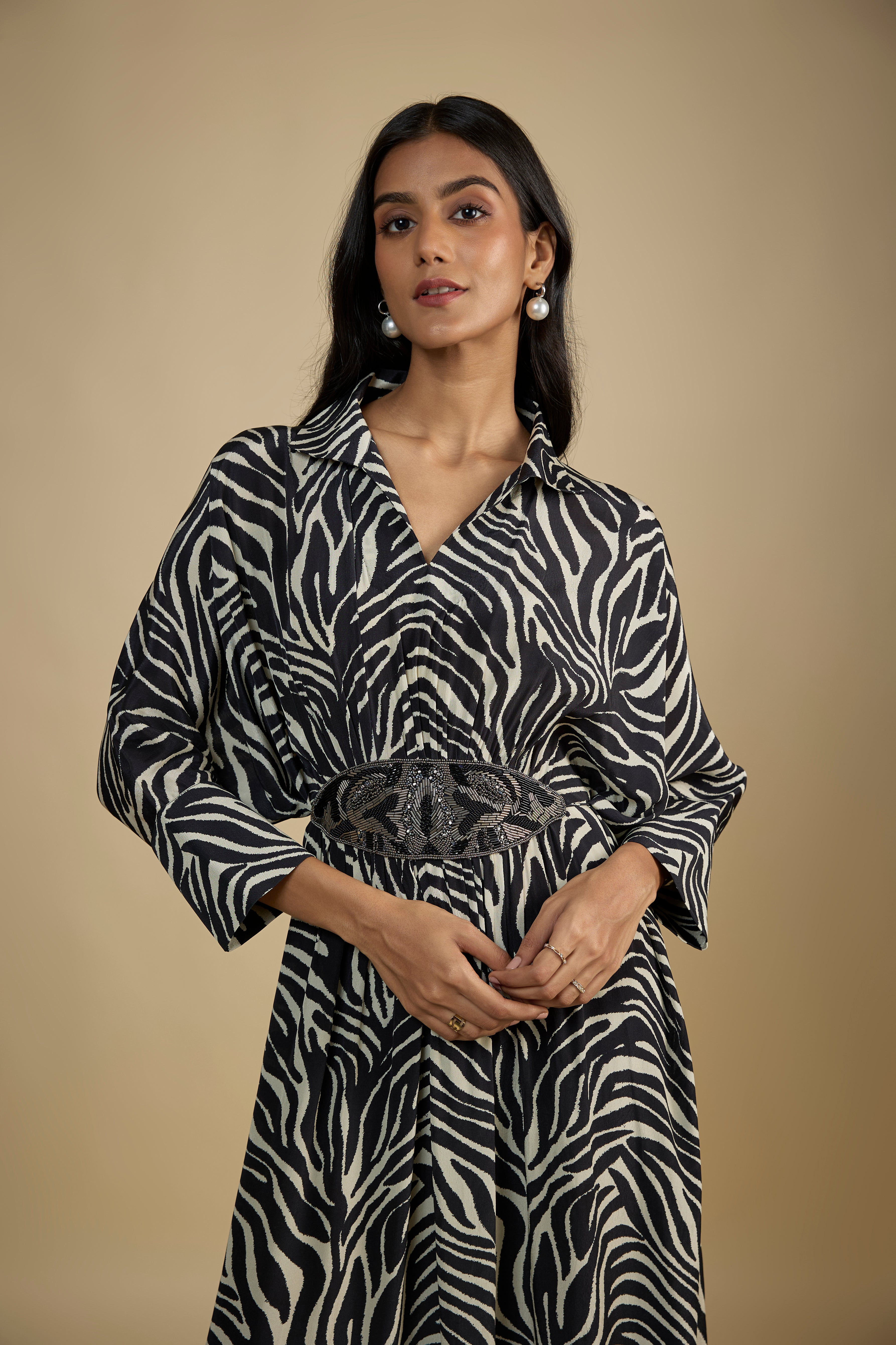 Featuring a black and white zebra print dress in crepe fabric with stone and beads work embroidery on the waist line.