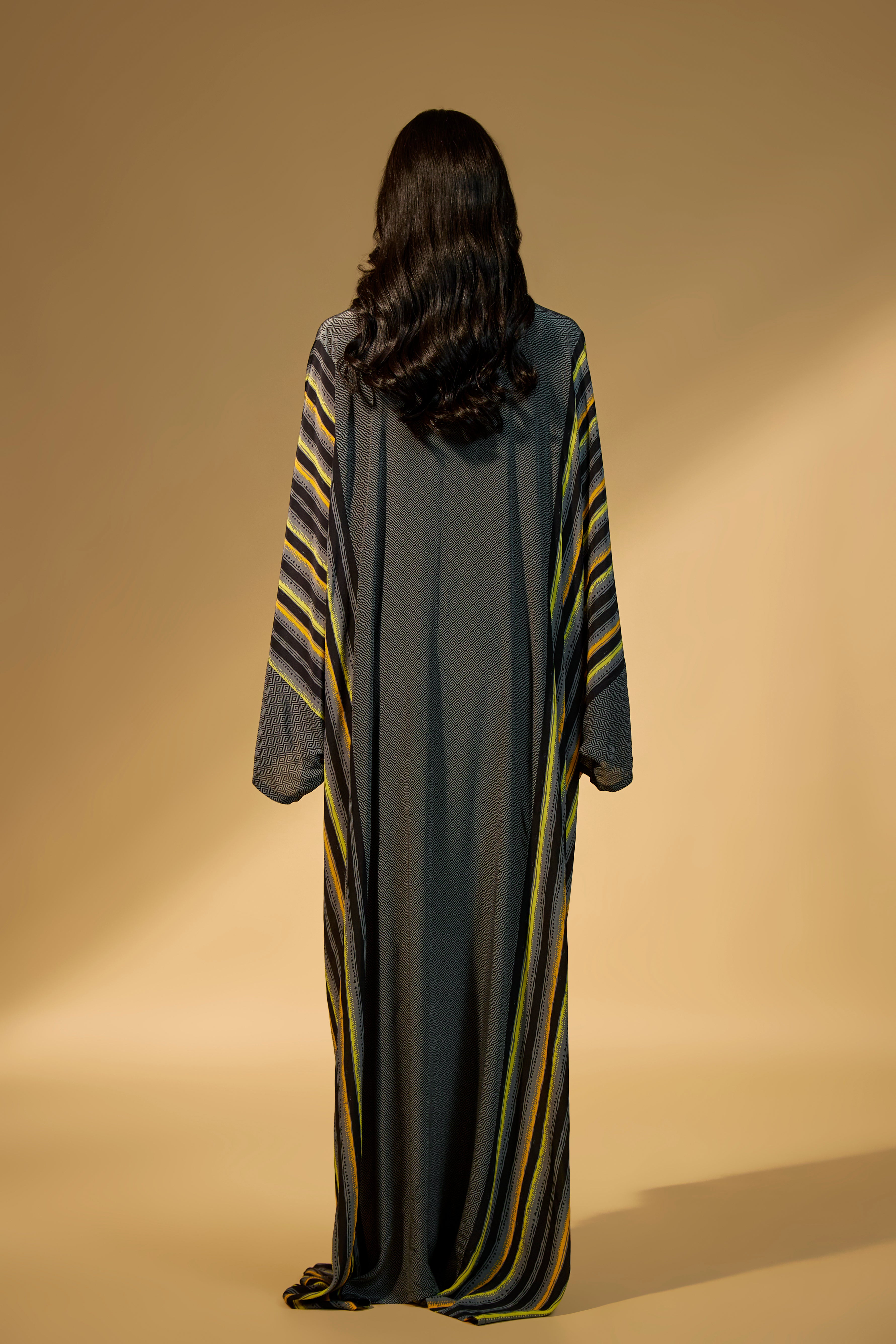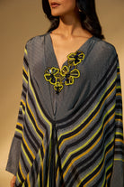 Featuring a black- yellow printed kaftan dress in crepe fabric with sequins and bead work embroidery.