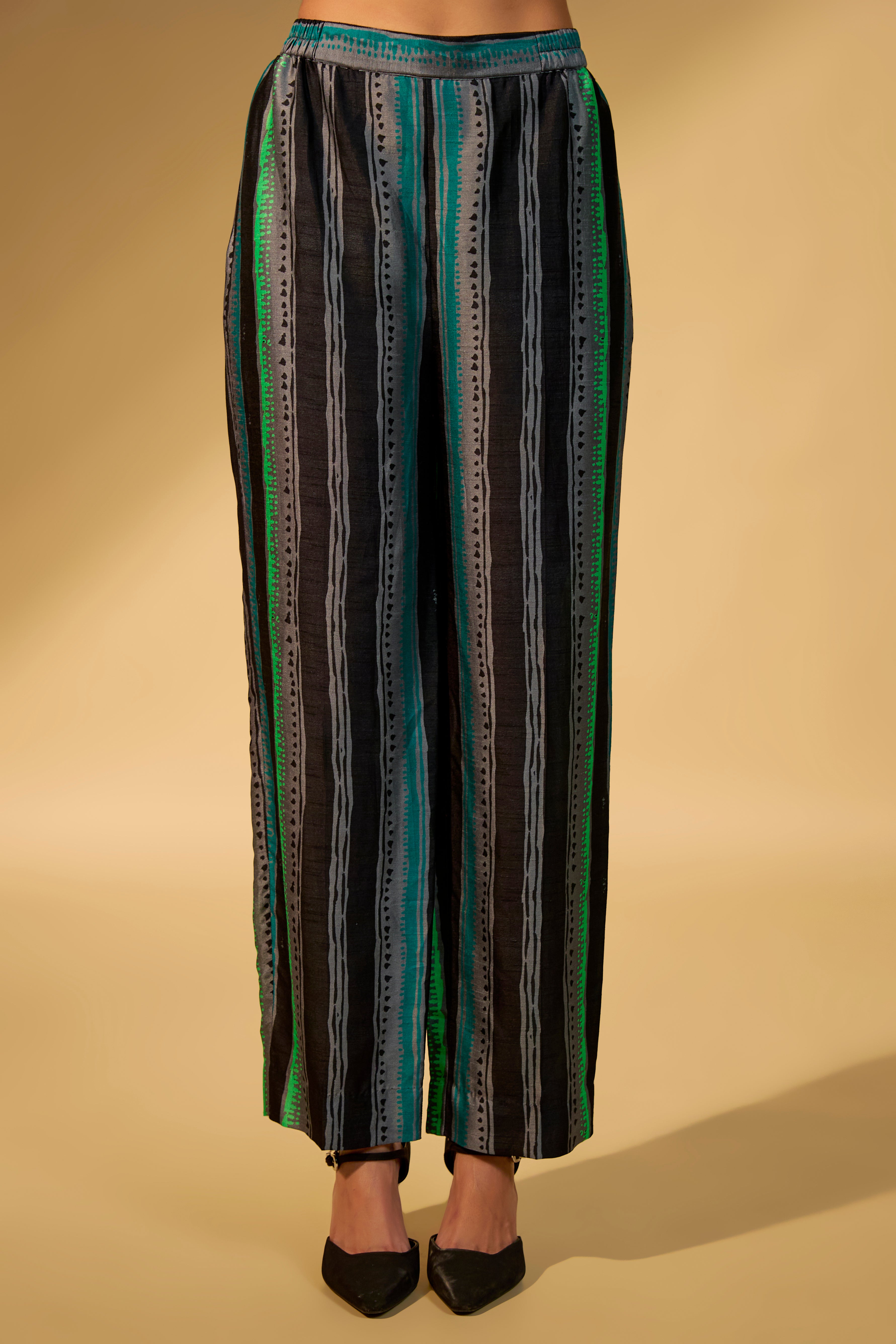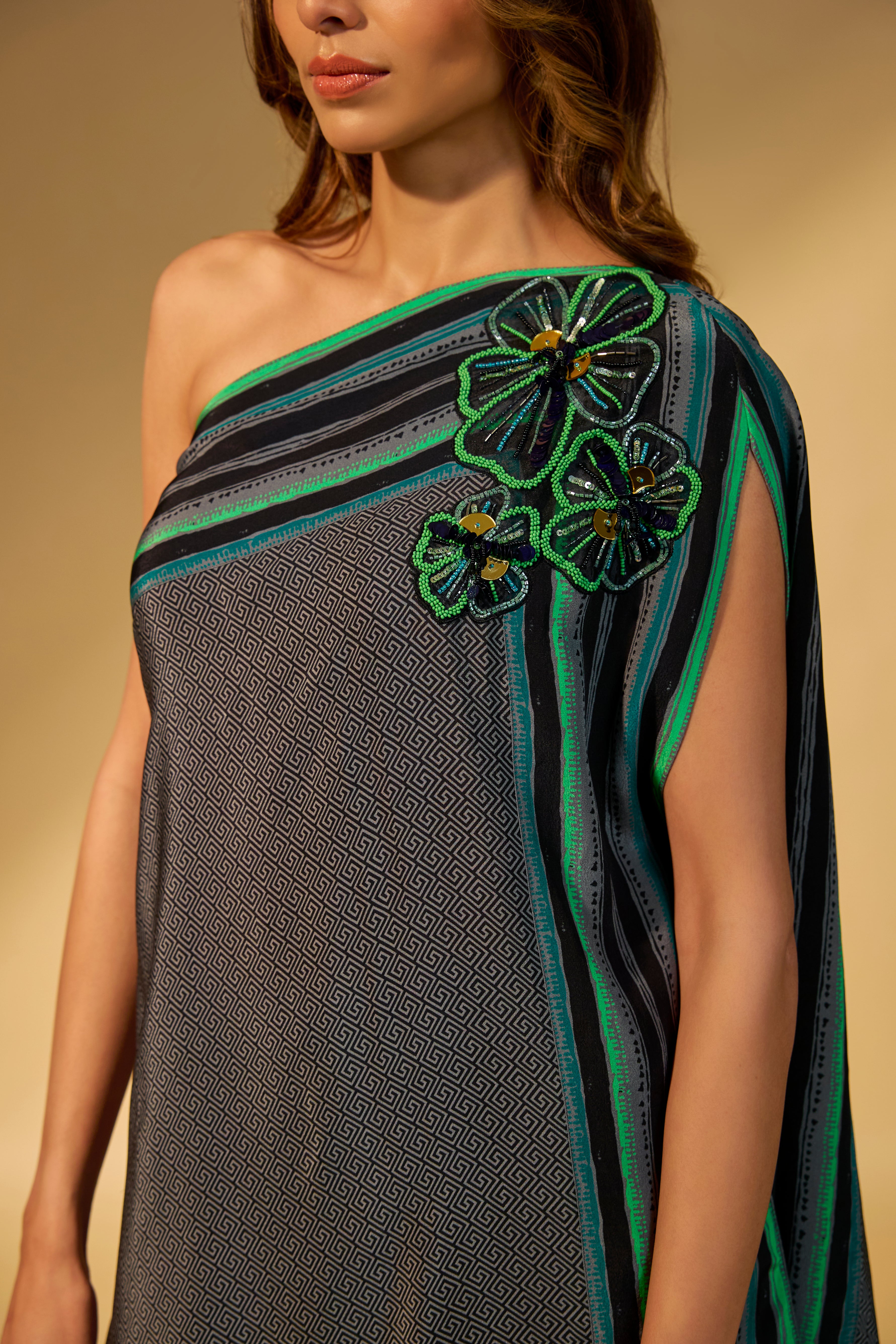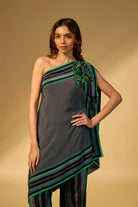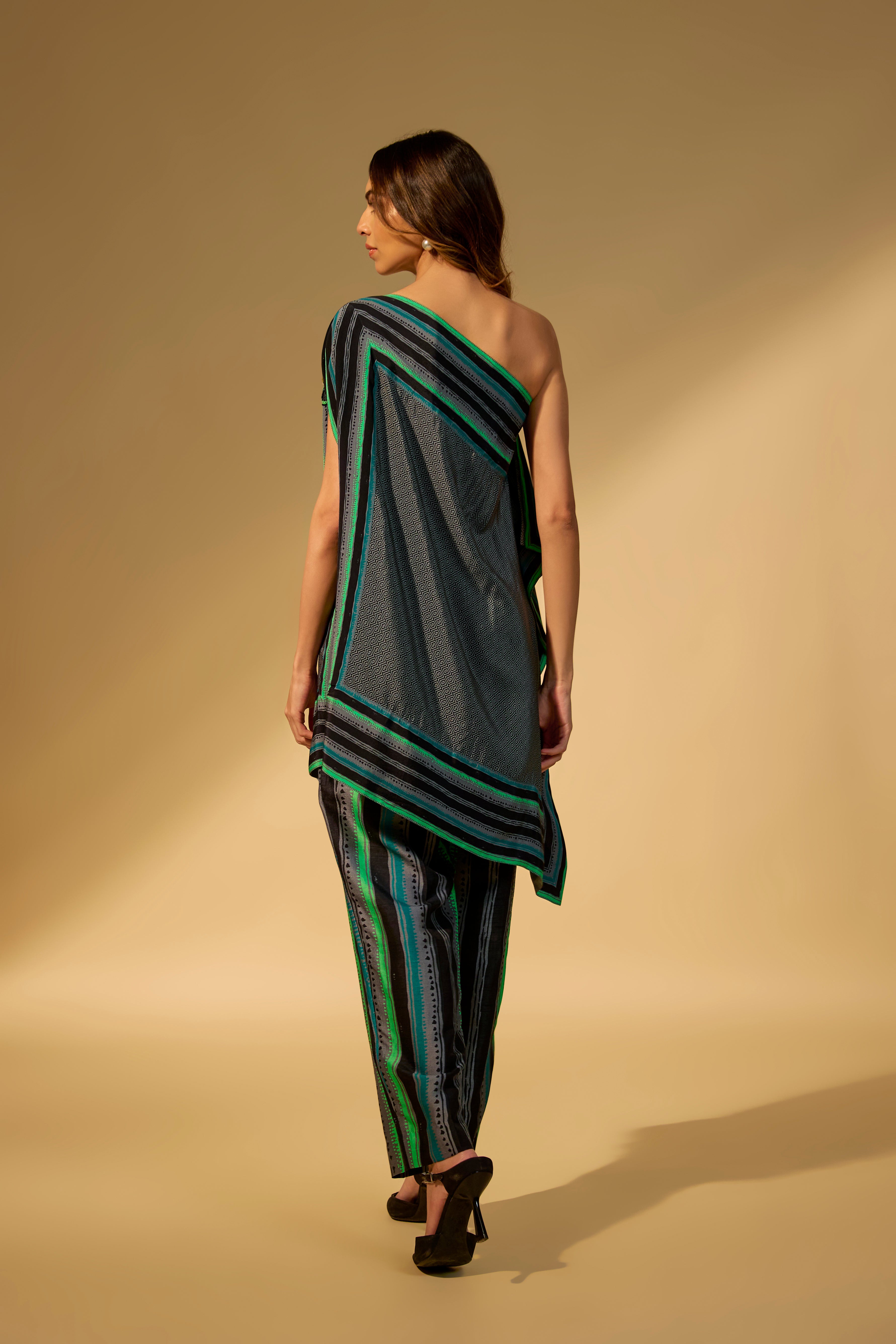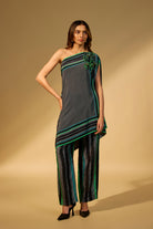 Featuring a black- green printed one shoulder top in crepe fabric with sequins and bead work embroidery. Comes with matching pants in dupion fabric.