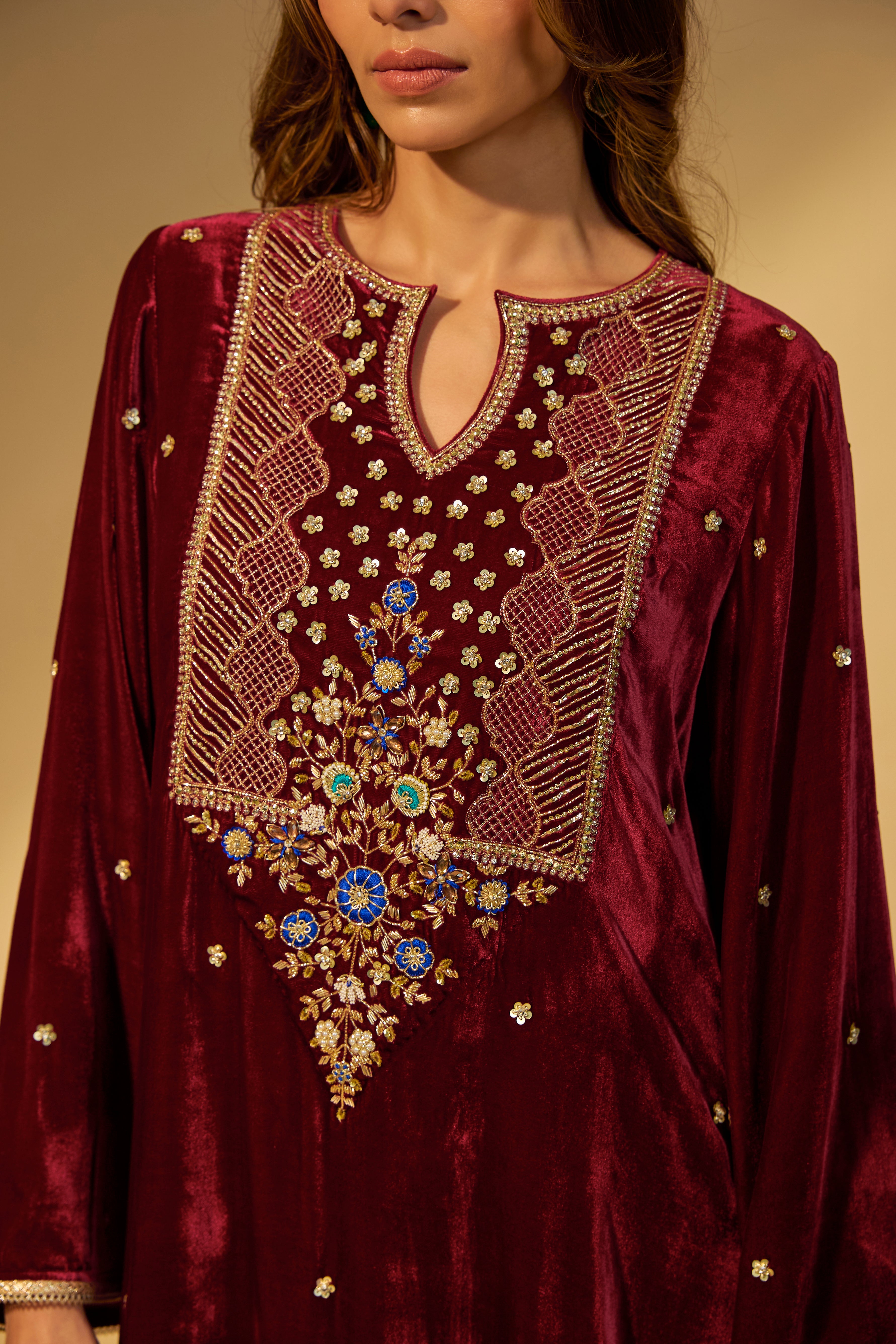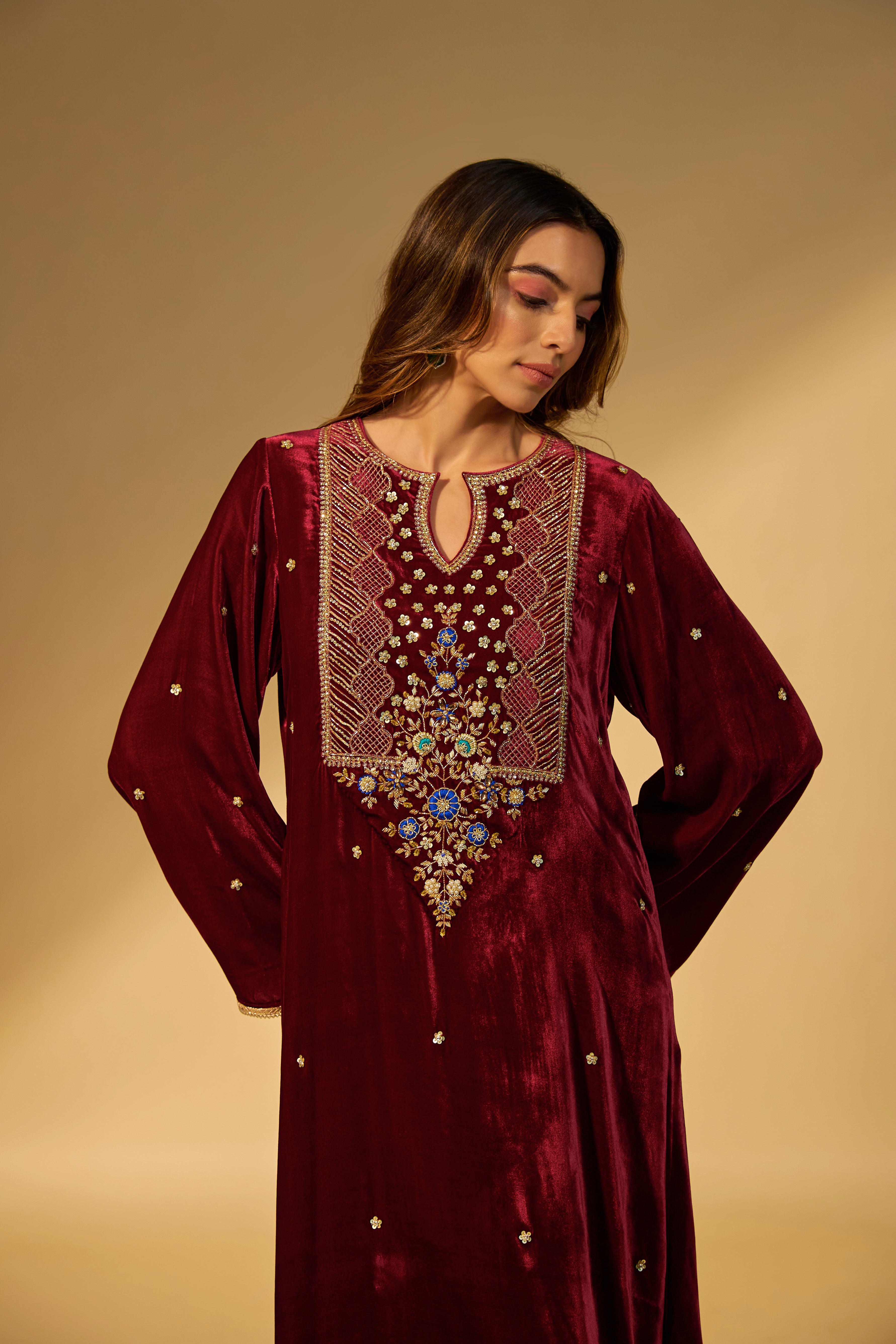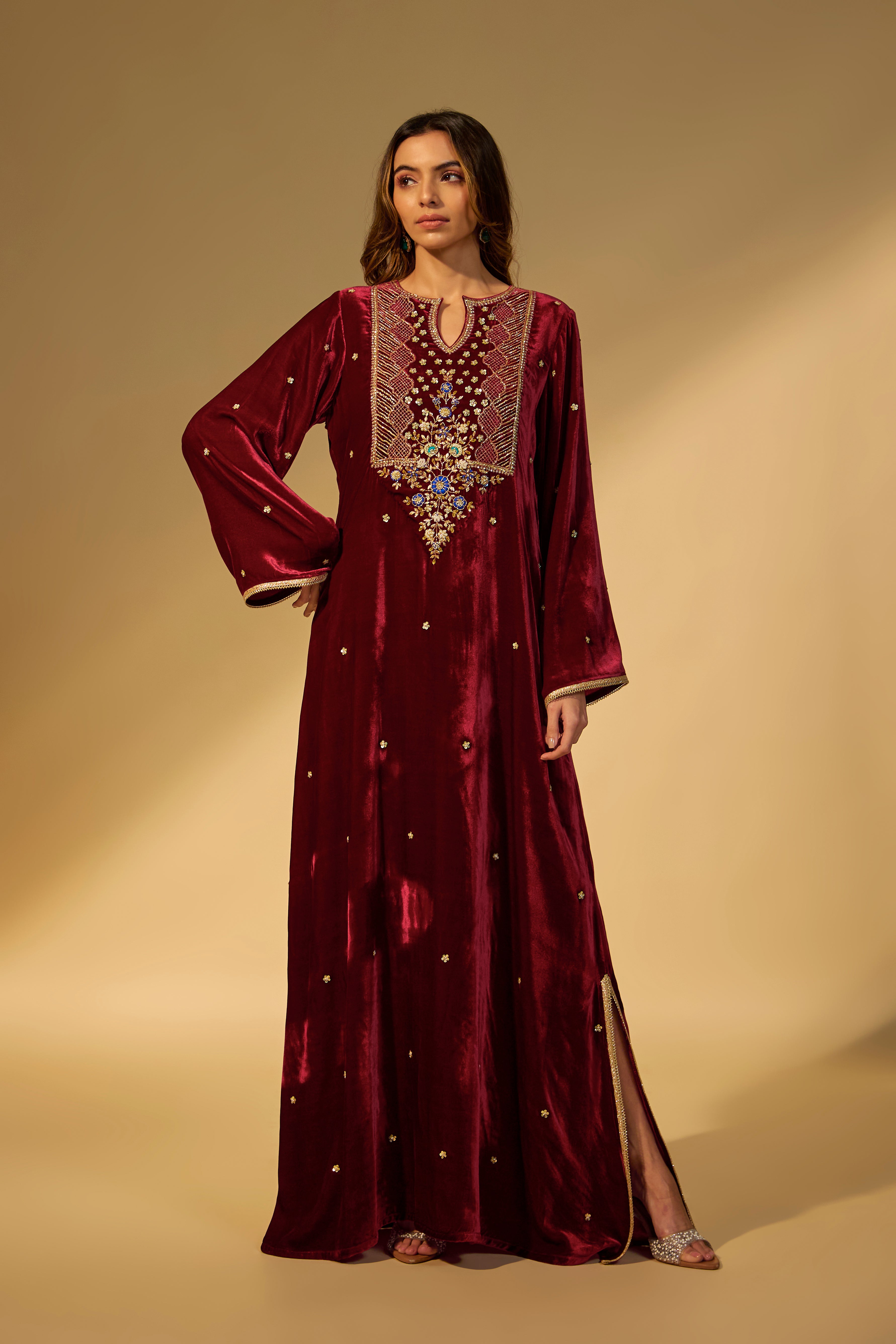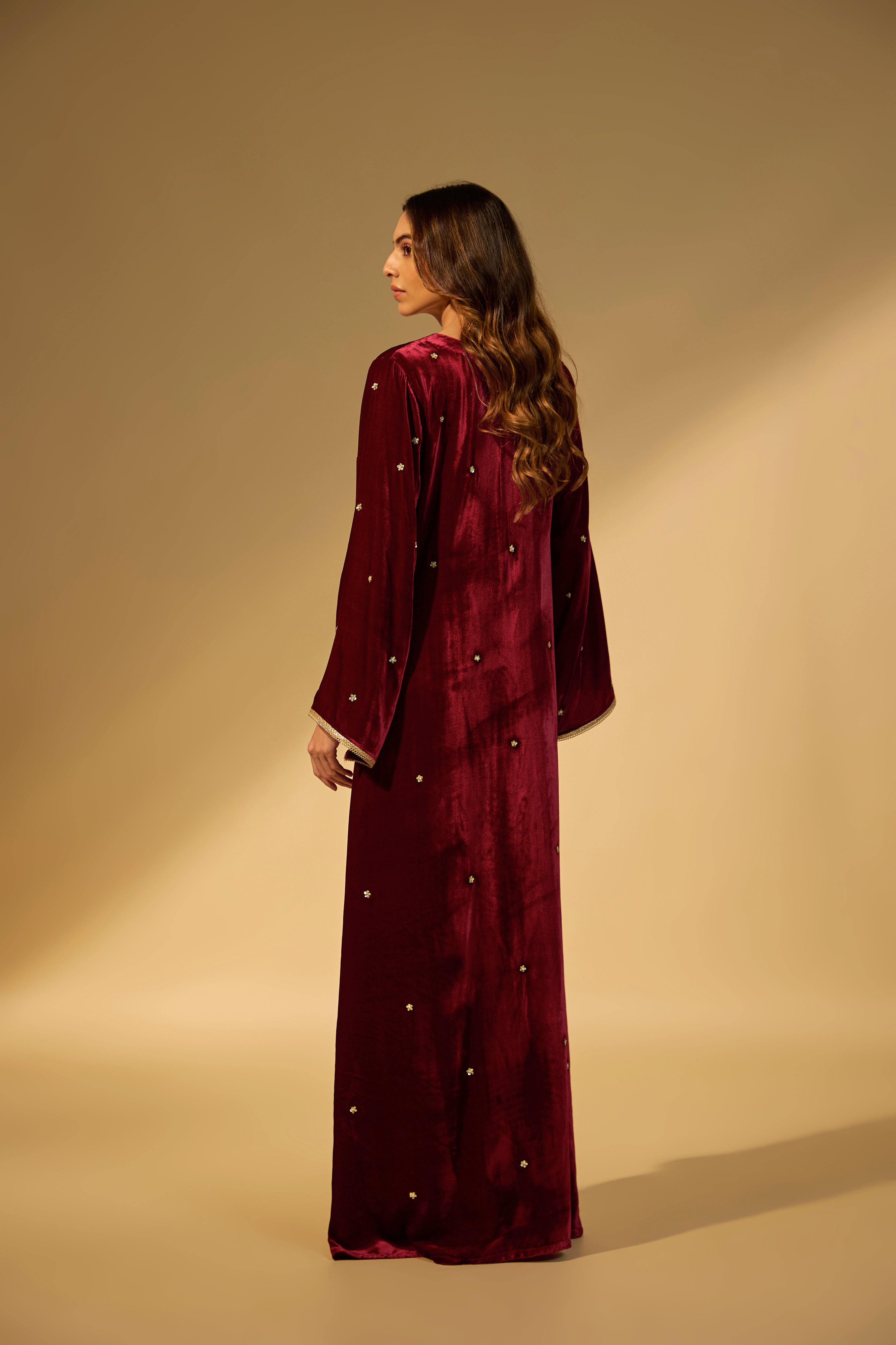 Featuring a maroon kaftan in velvet fabric with zardosi embroidery with stone work
