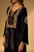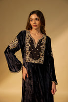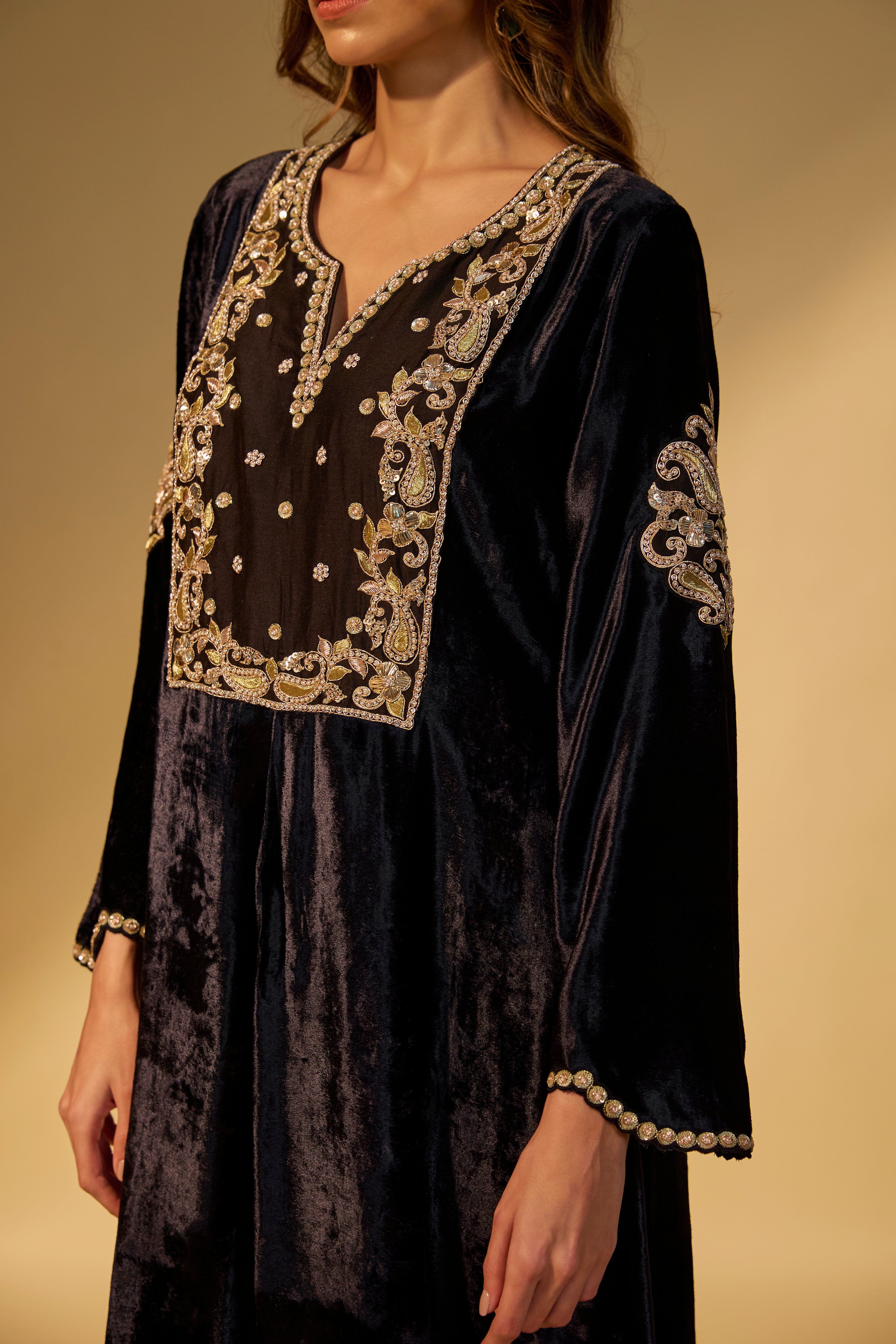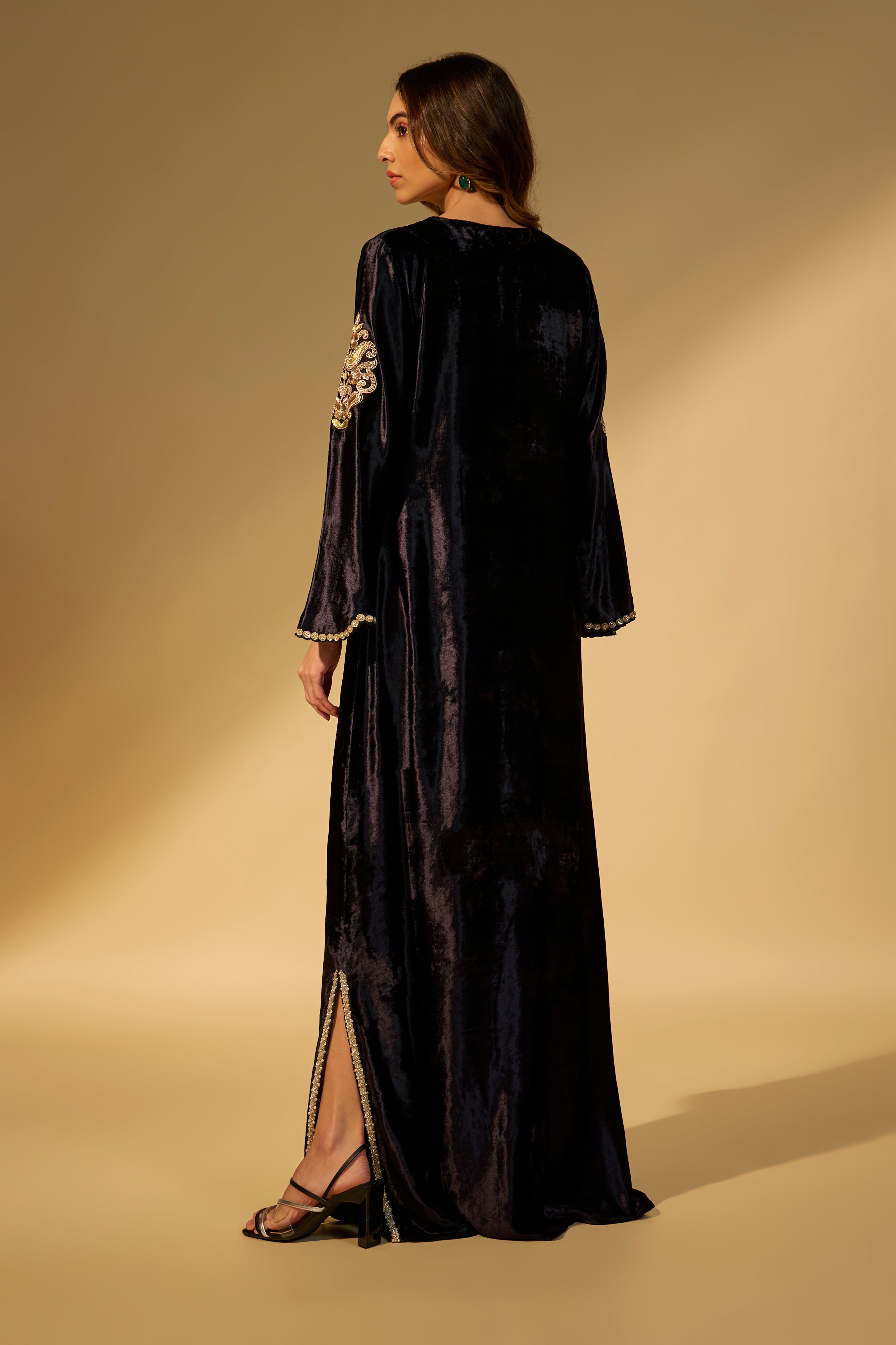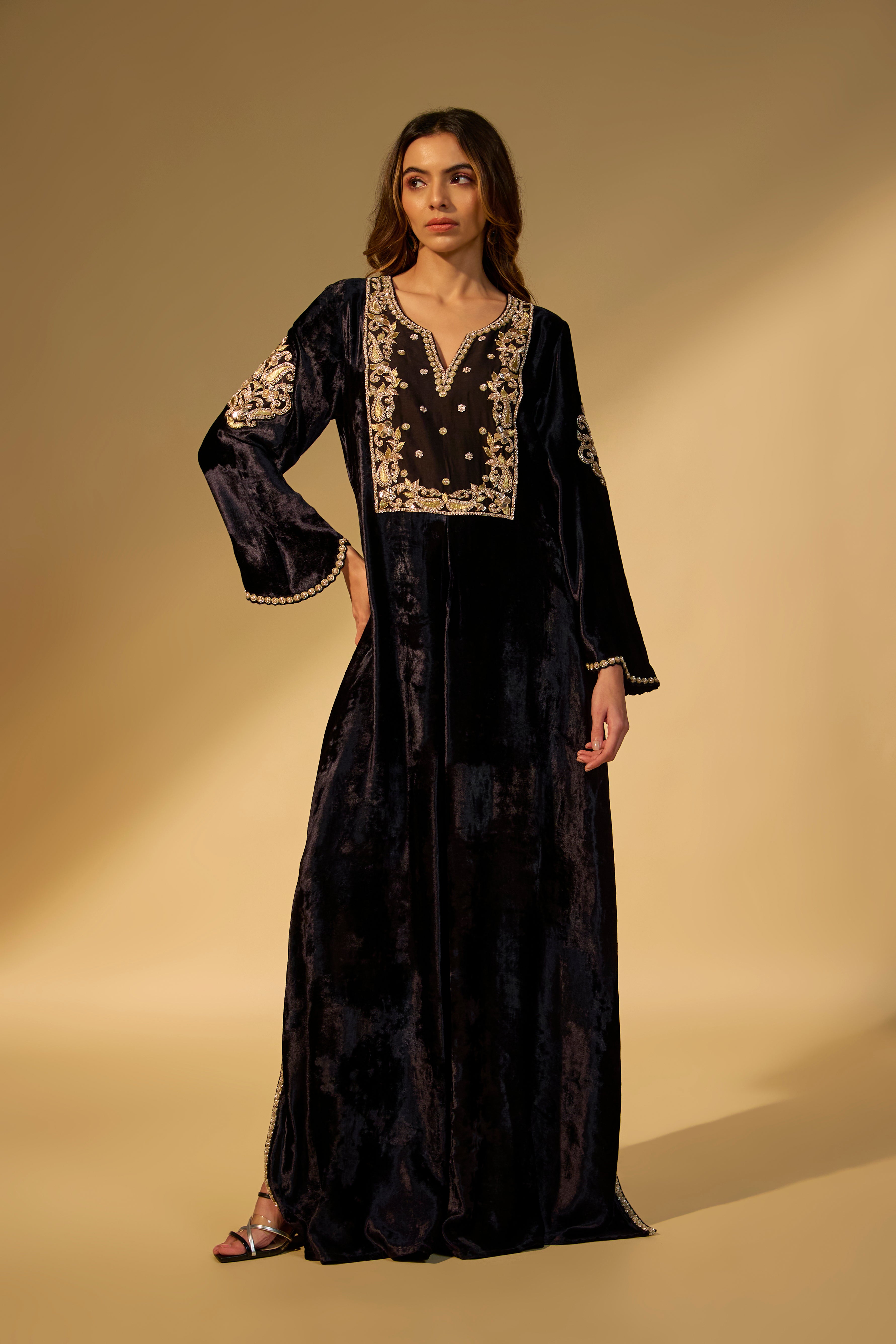 Featuring a midnight black kaftan in velvet fabric with zardosi and pearl embroidery work.