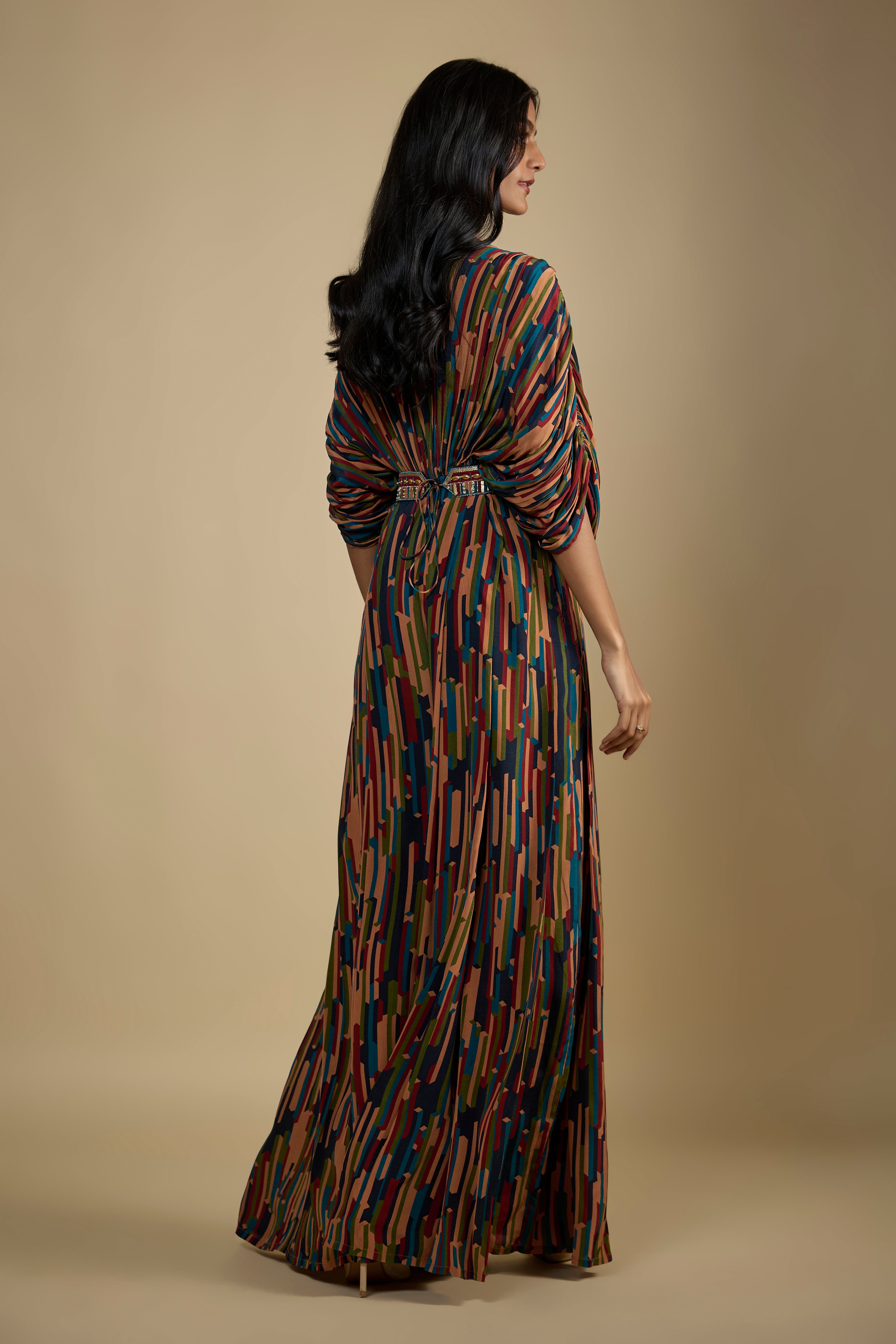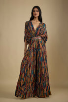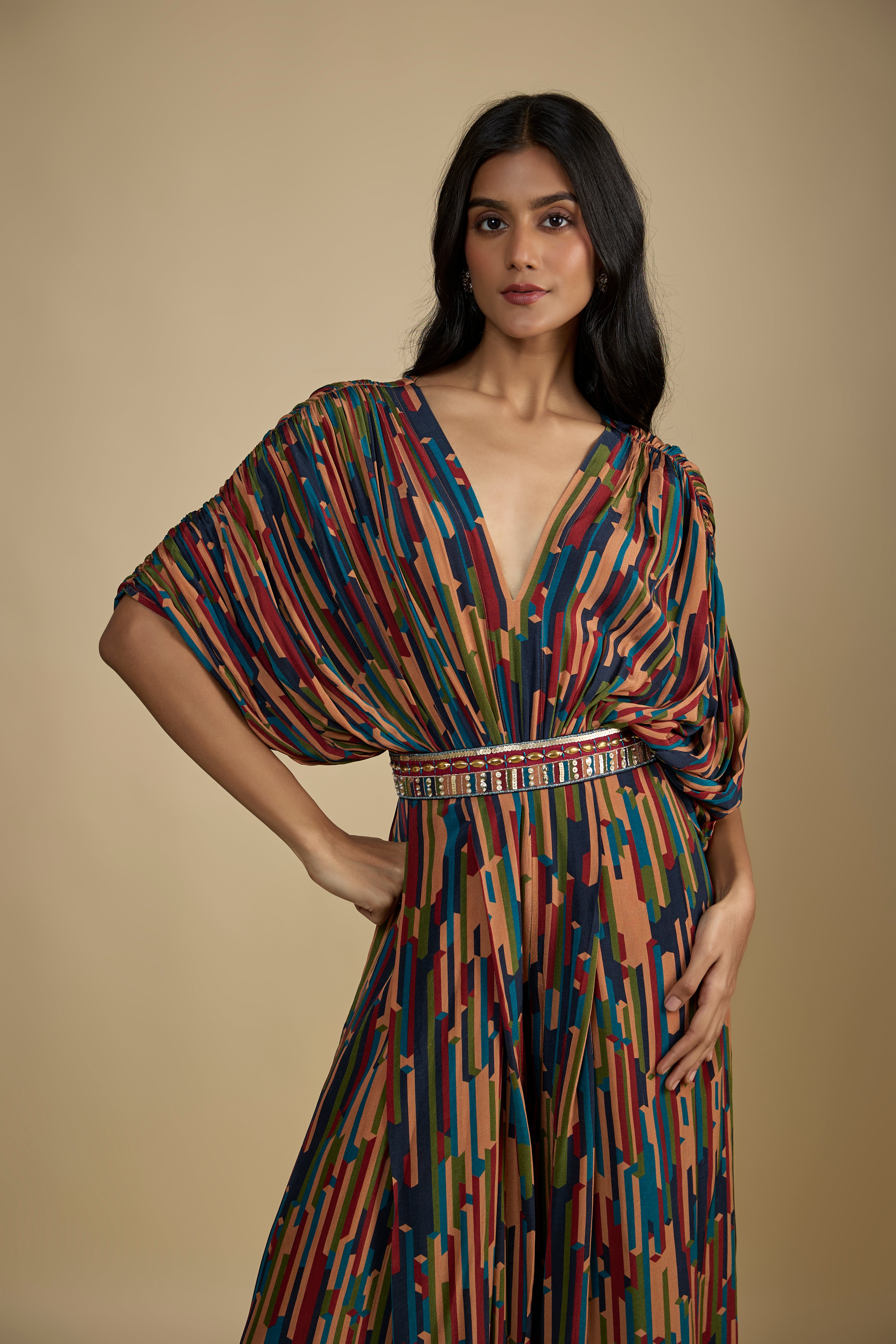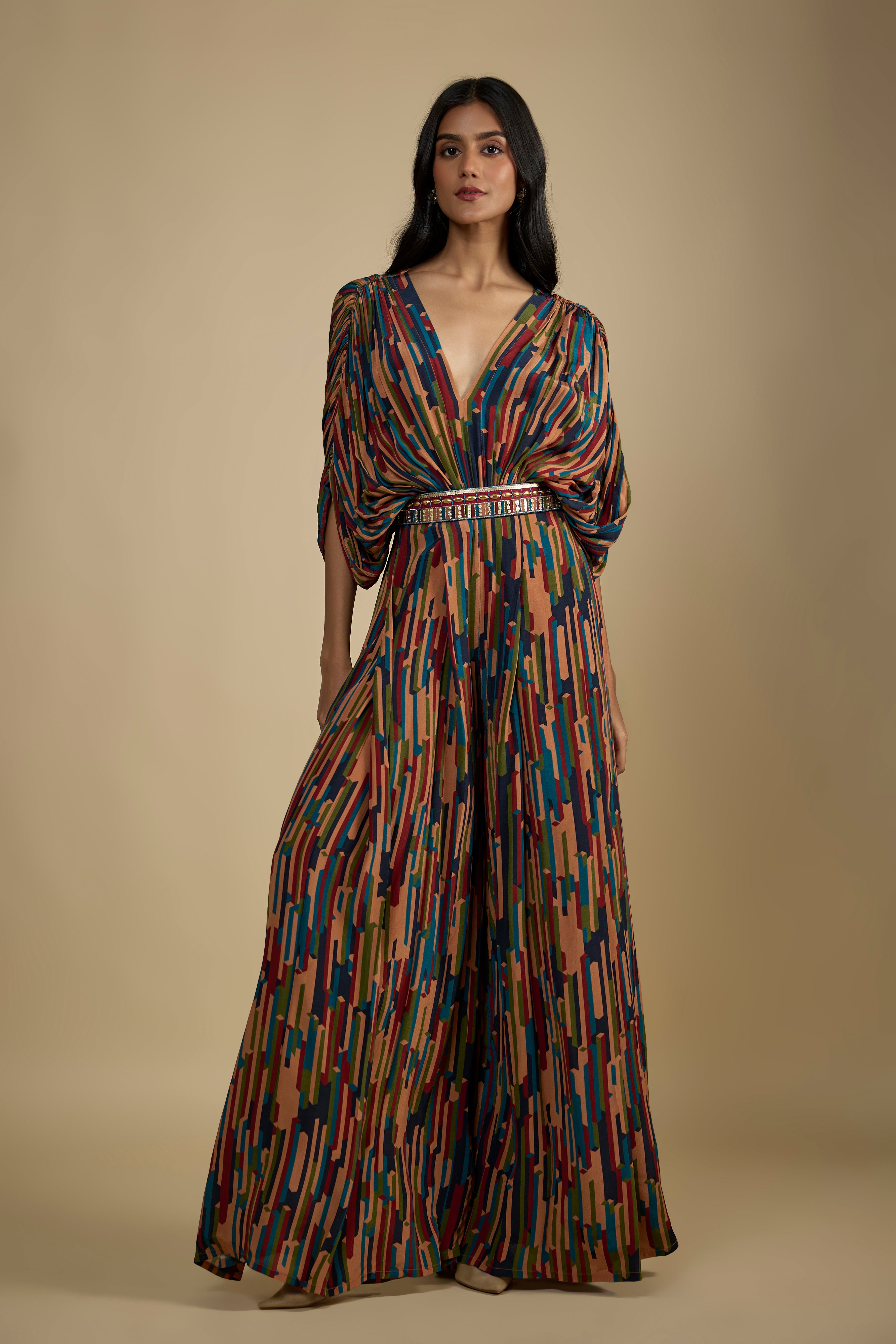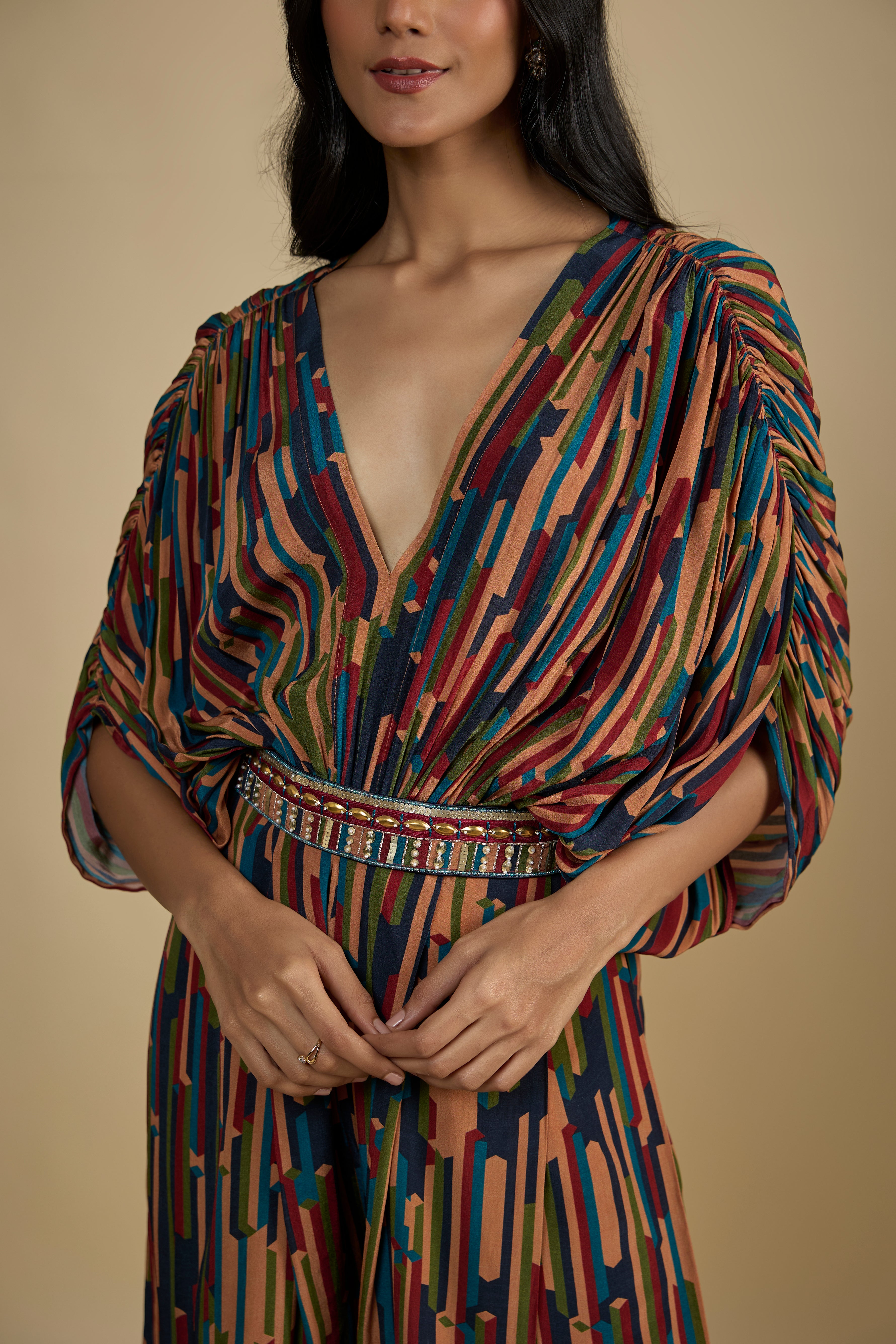 Featuring a multicolor printed crepe jumpsuit with gathered sleeves. Comes with a waist belt embroidered with sequins and pearls.