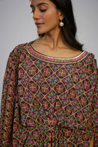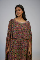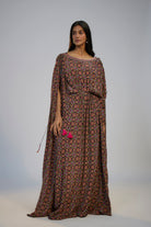 Featuring a multicolor printed crepe kaftan with sequins embroidery and tassel detail.