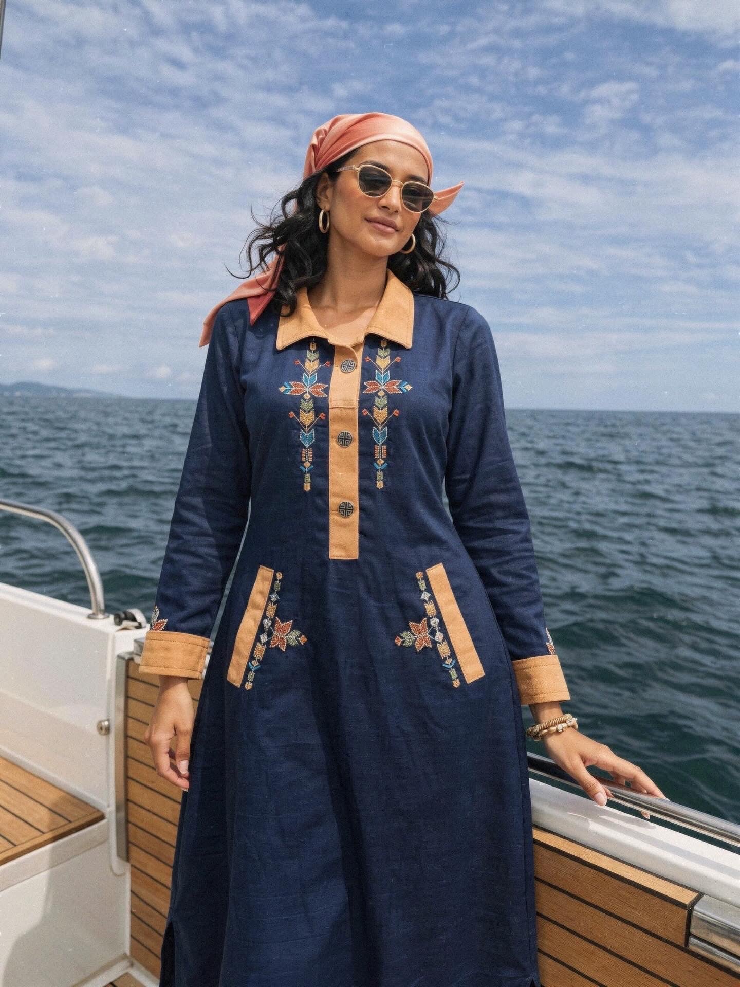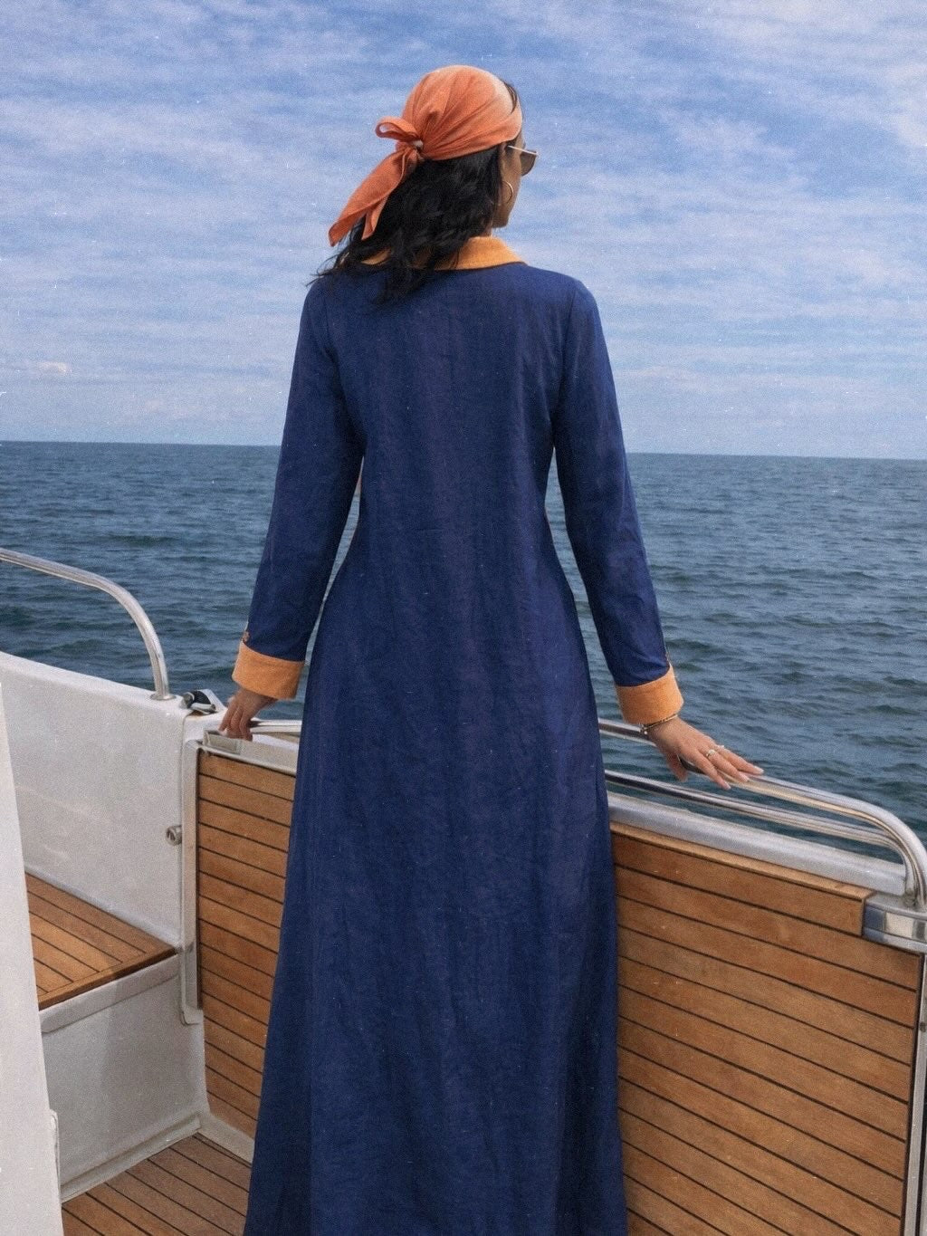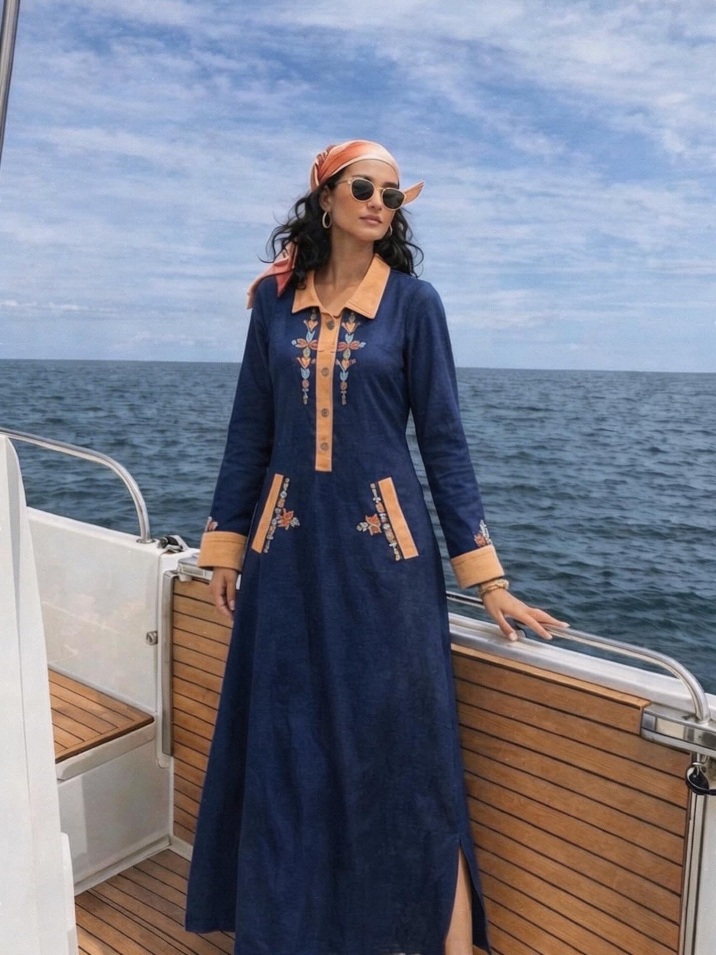 Featuring a navy blue linen embroidered maxi dress with contrast peach colored accents in denim, collared, half button-down placket, long sleeves with cuffs, A-line silhouette, angled welt pockets with trims. Floral and geometric embroidery on the chest, pocket welts, and sleeve cuffs.