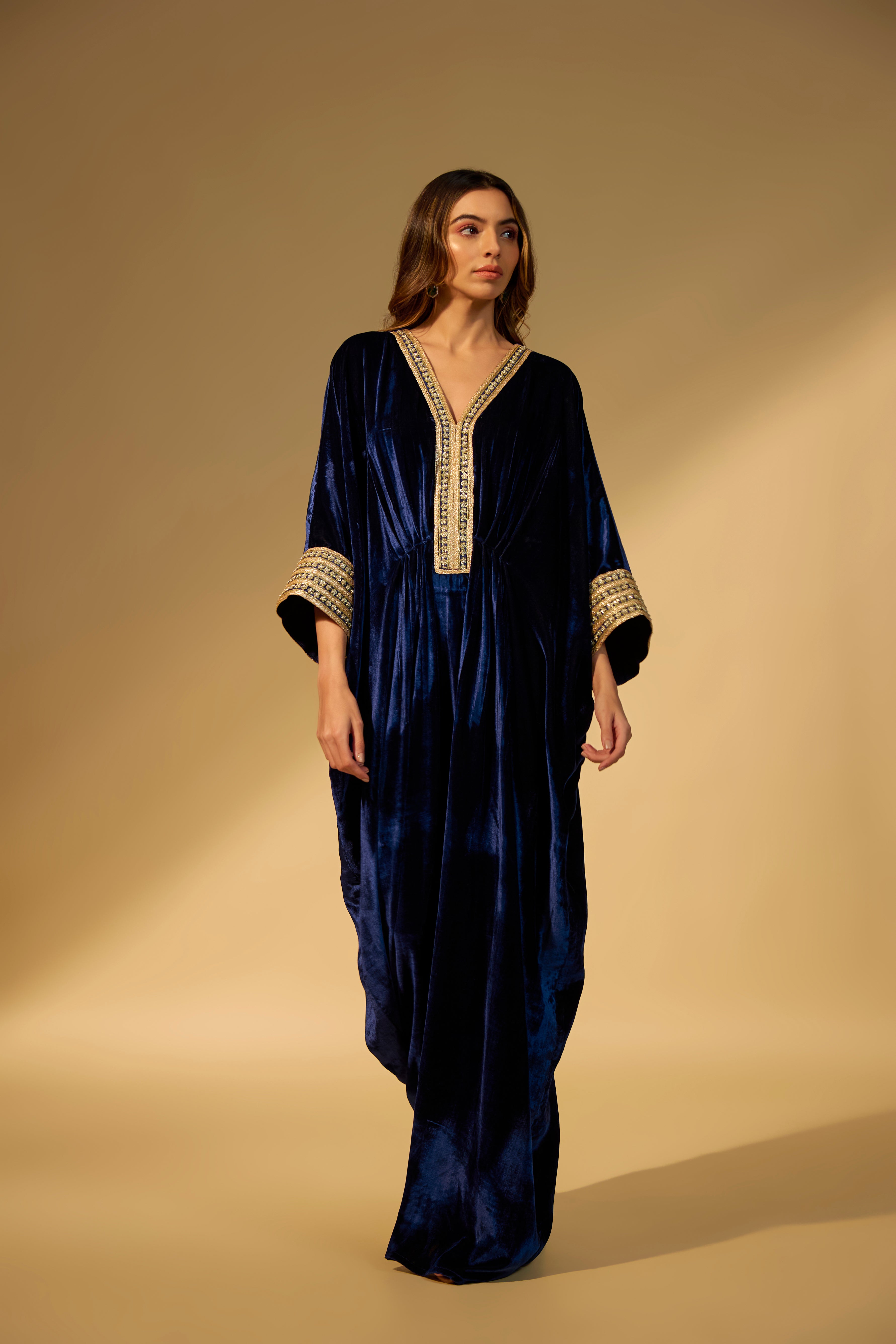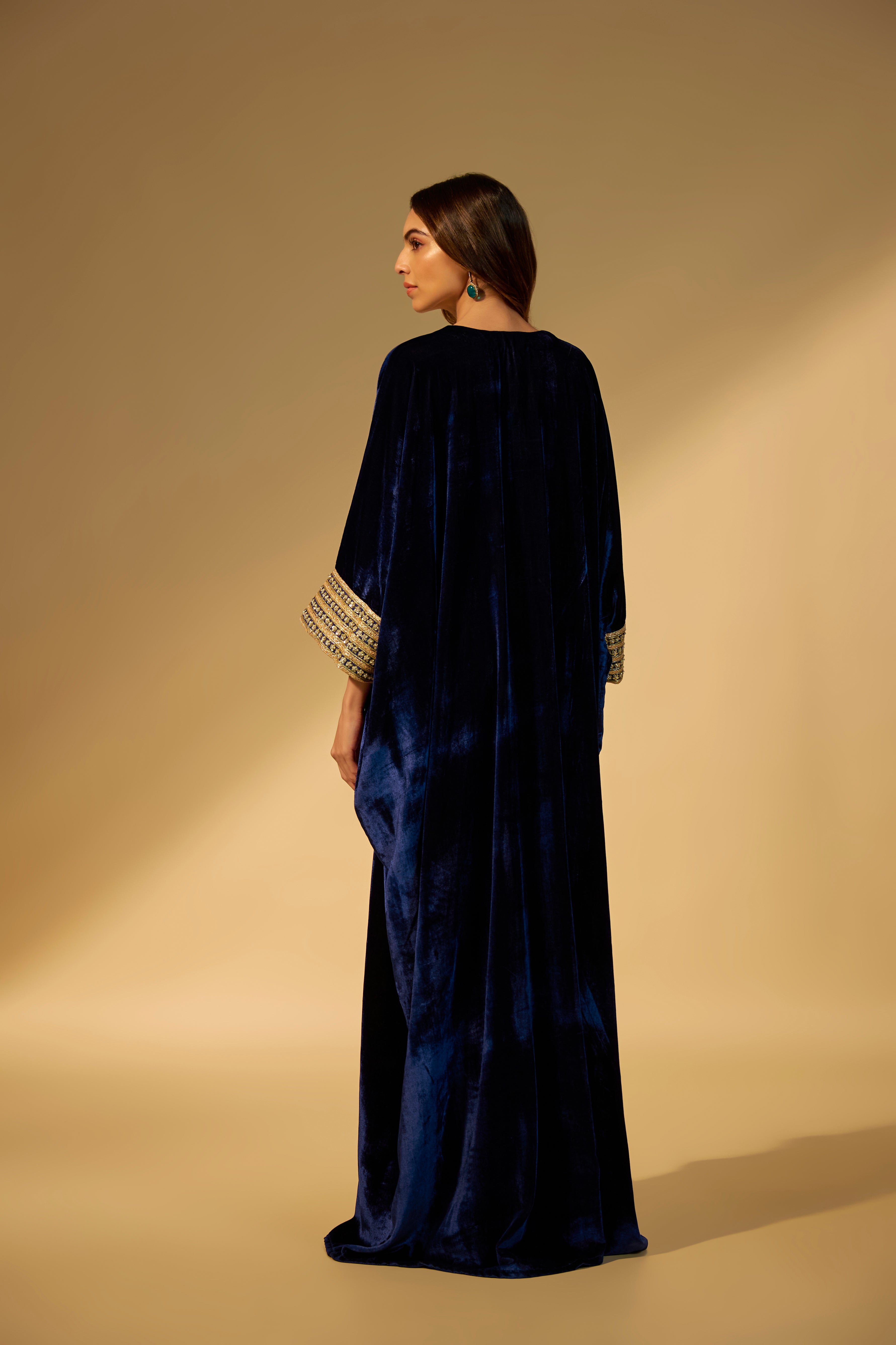 Featuring a Navy Blue kaftan in velvet fabric with sequins and stone embroidery work on the neckline and cuffs..