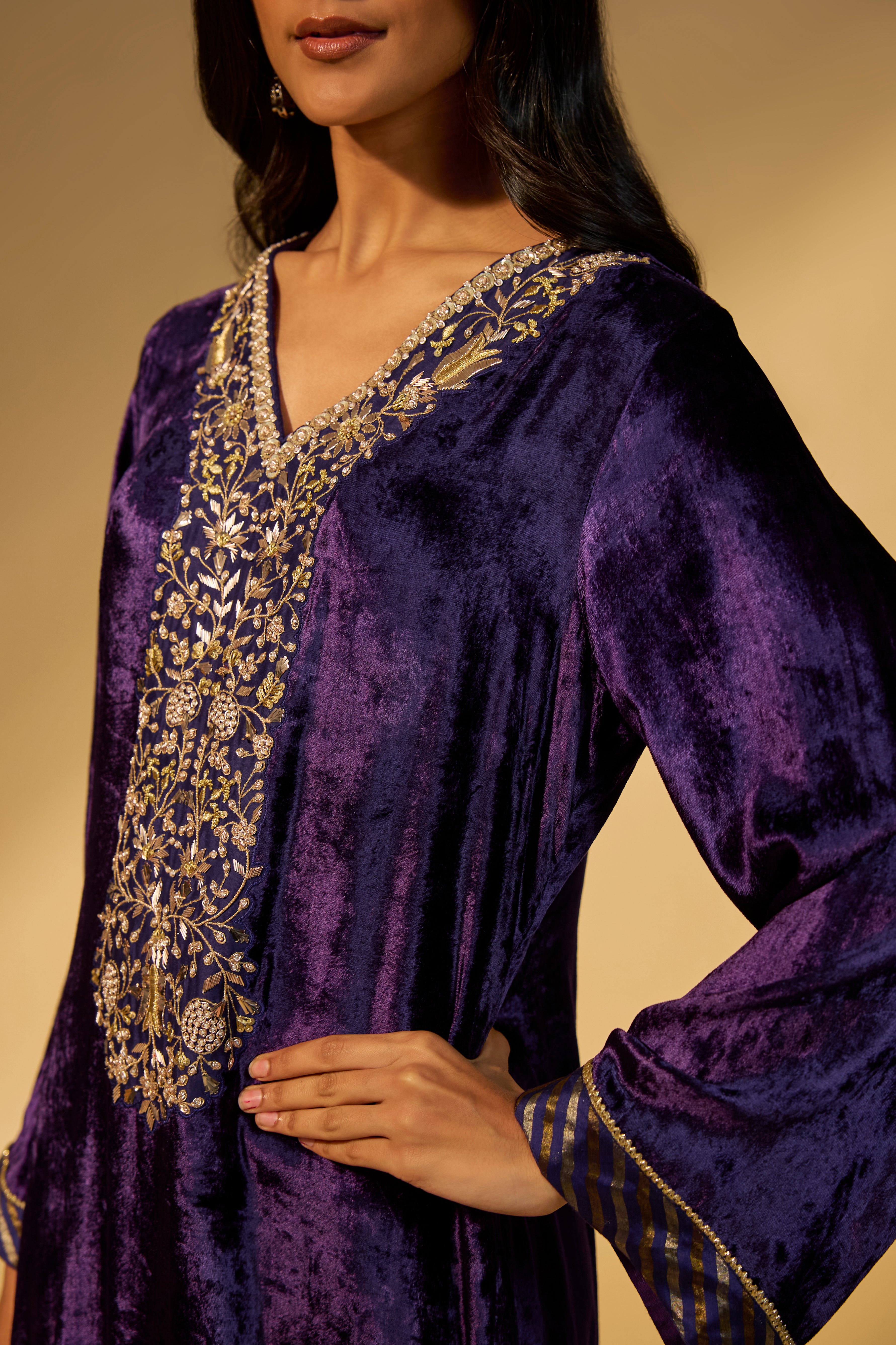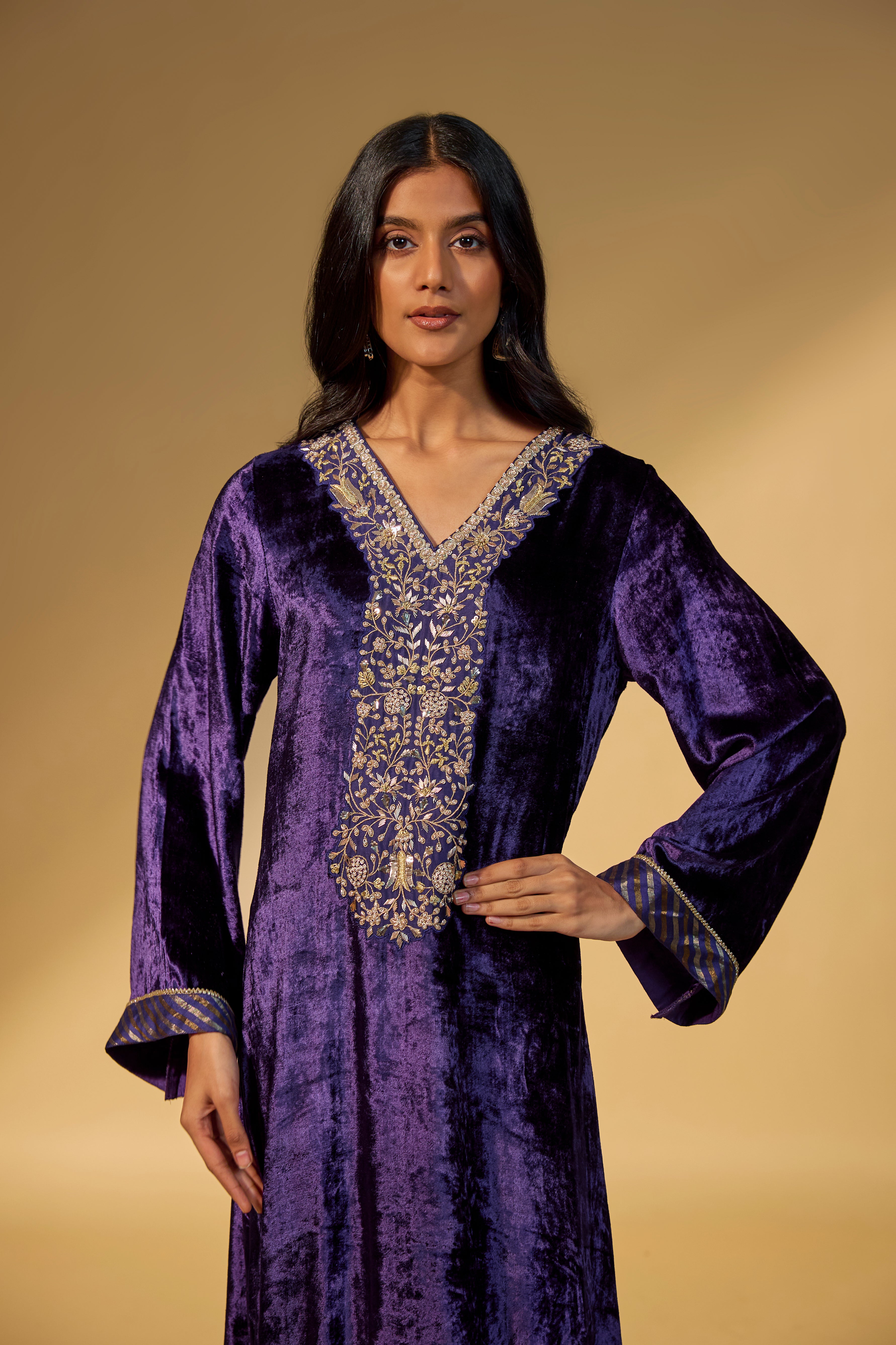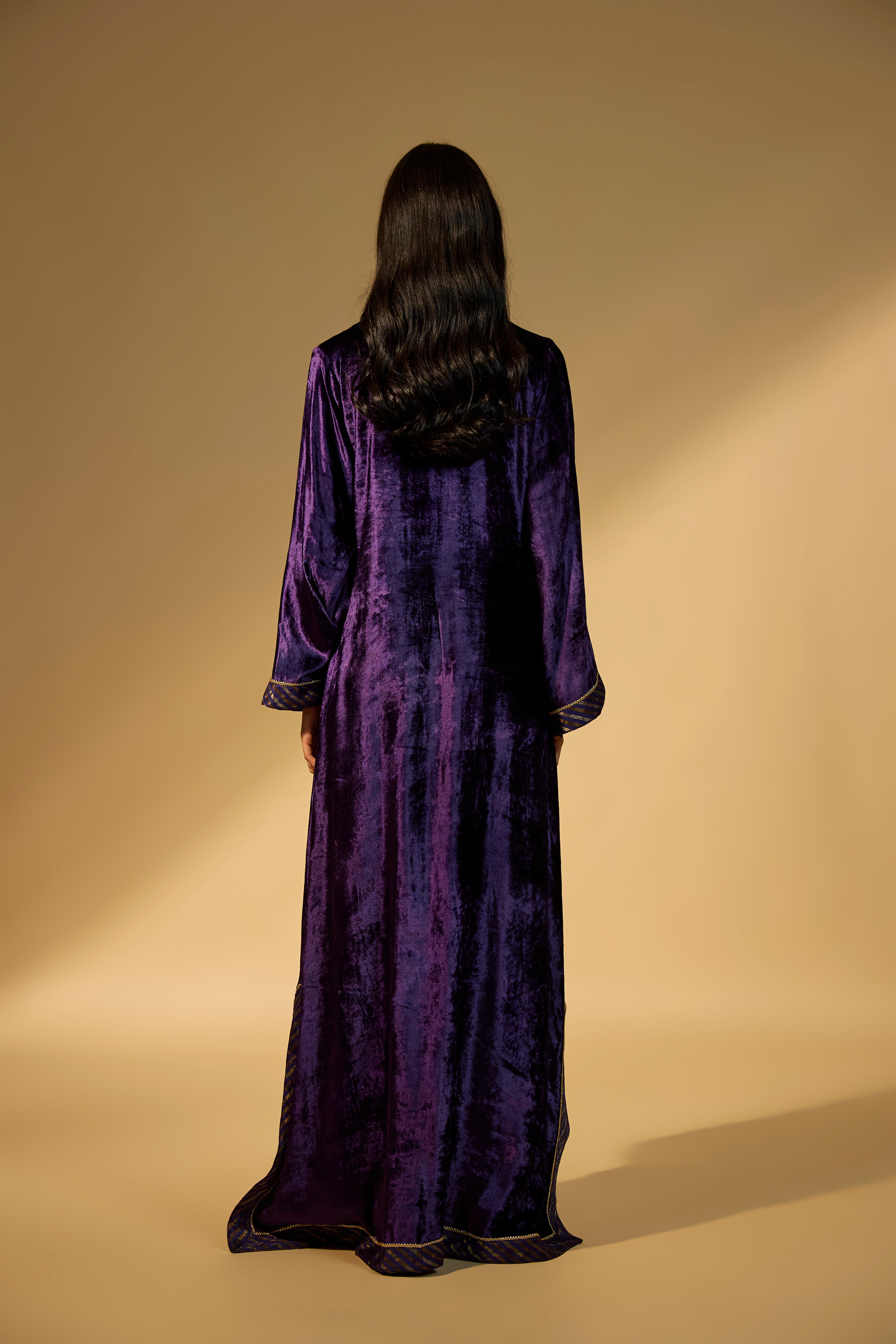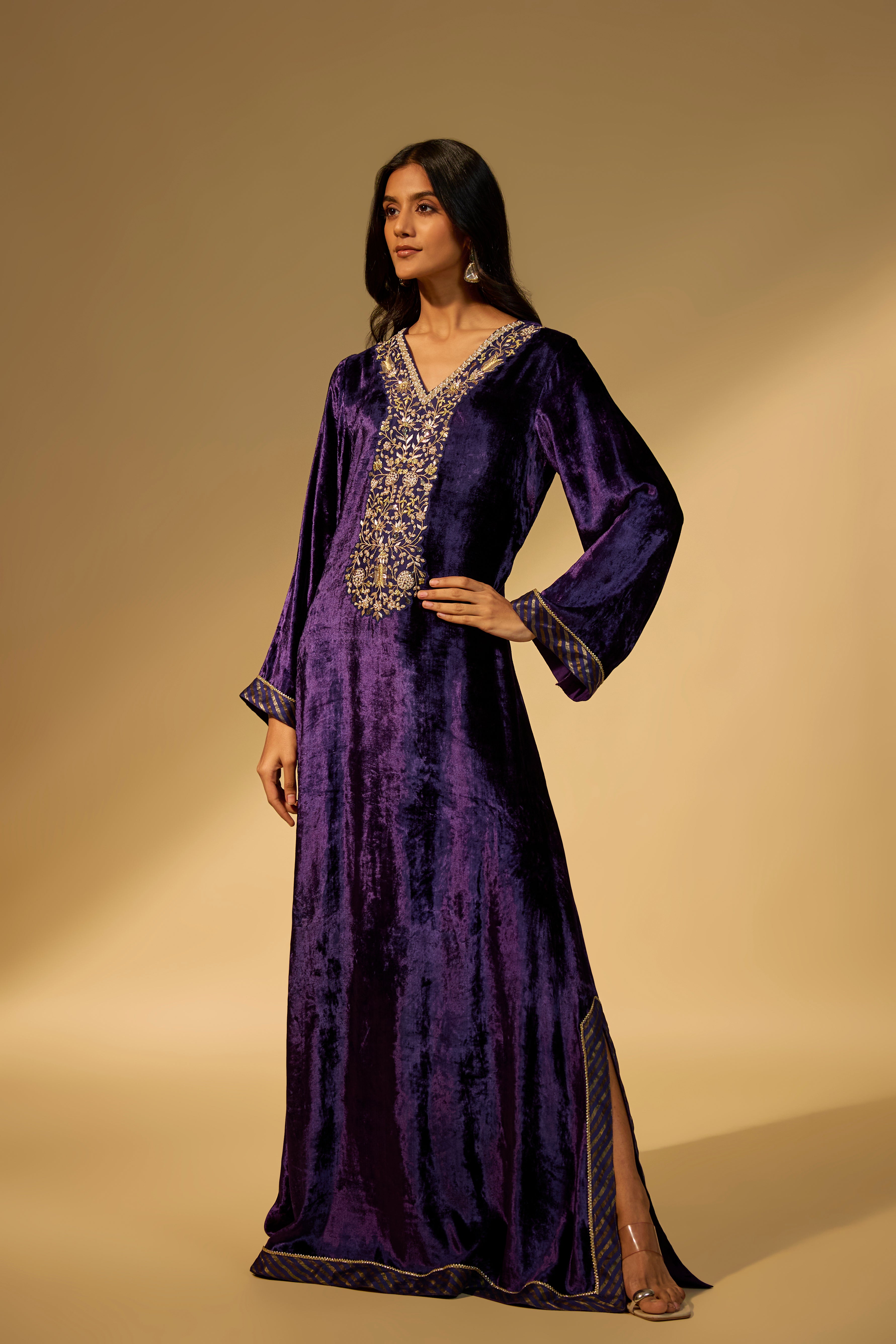 Featuring a purple kaftan in velvet fabric with zardosi embroidery with pearl highlights.