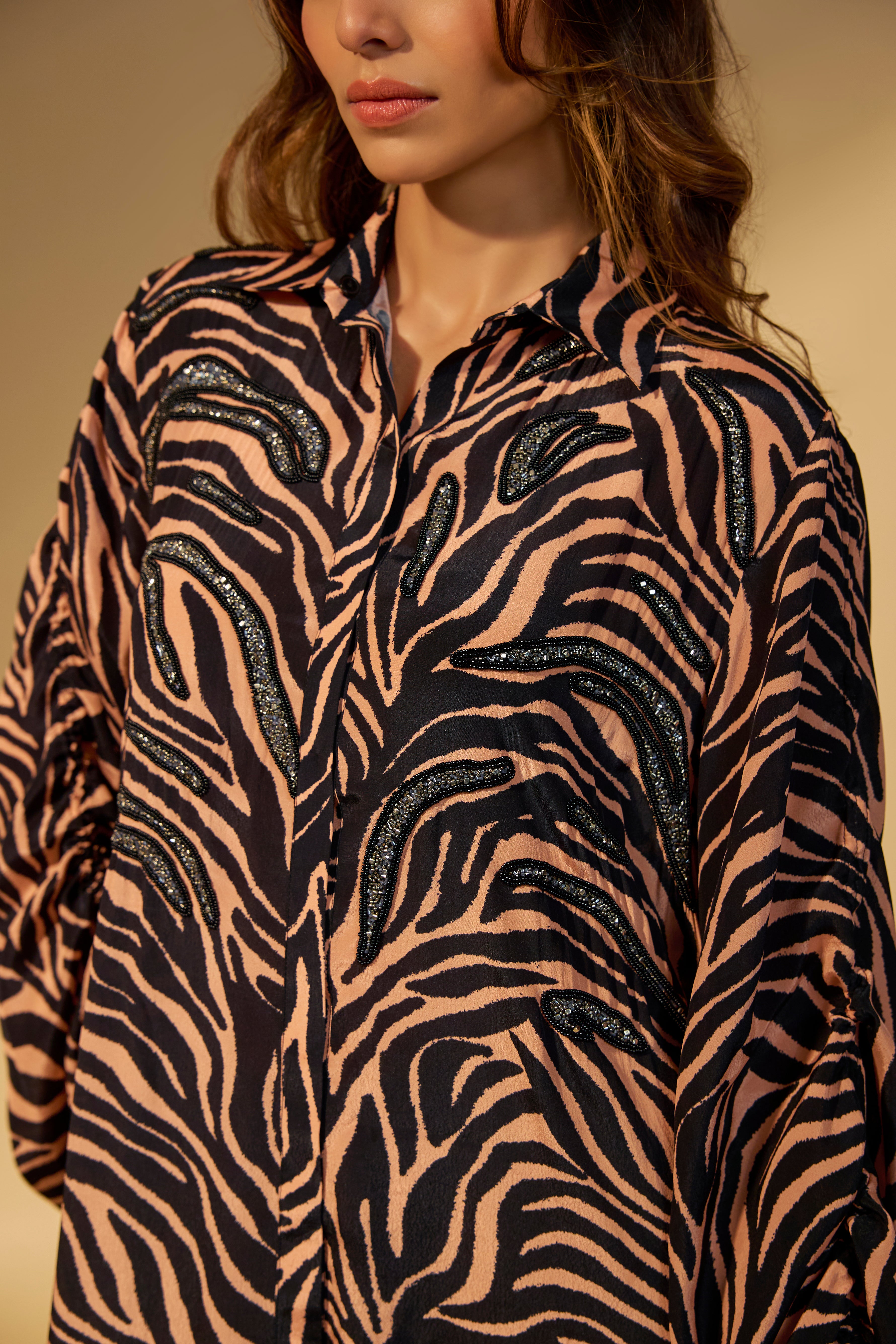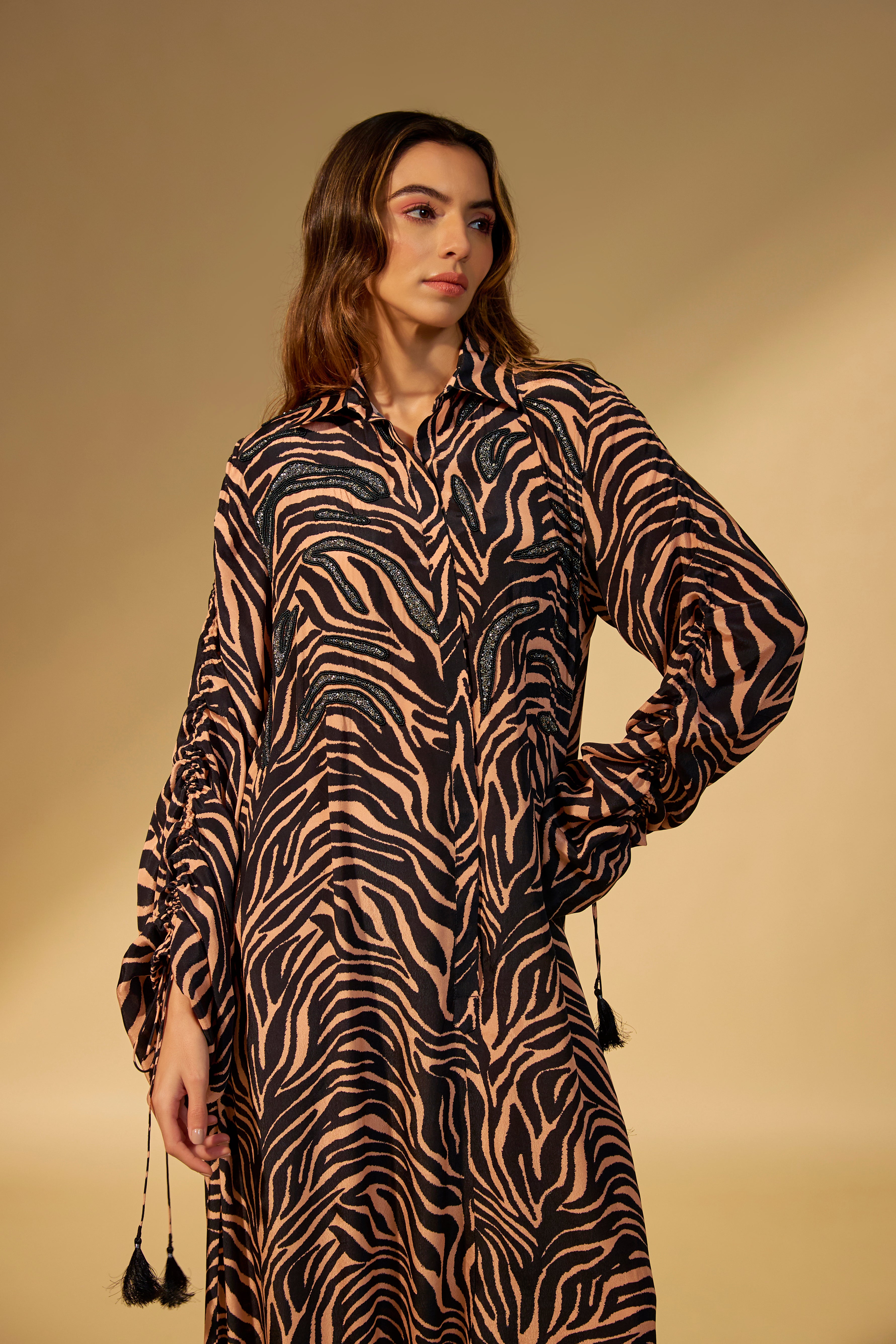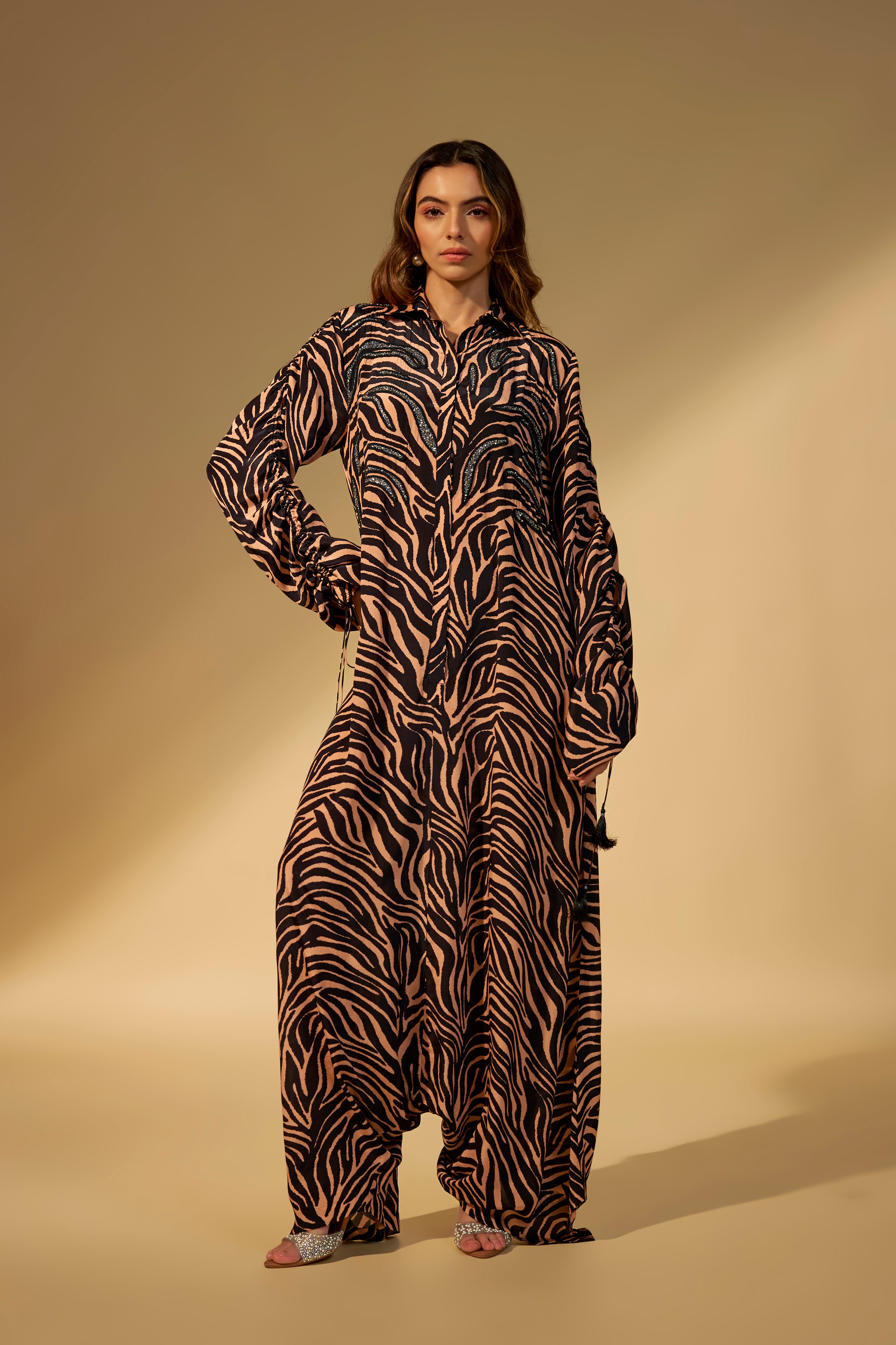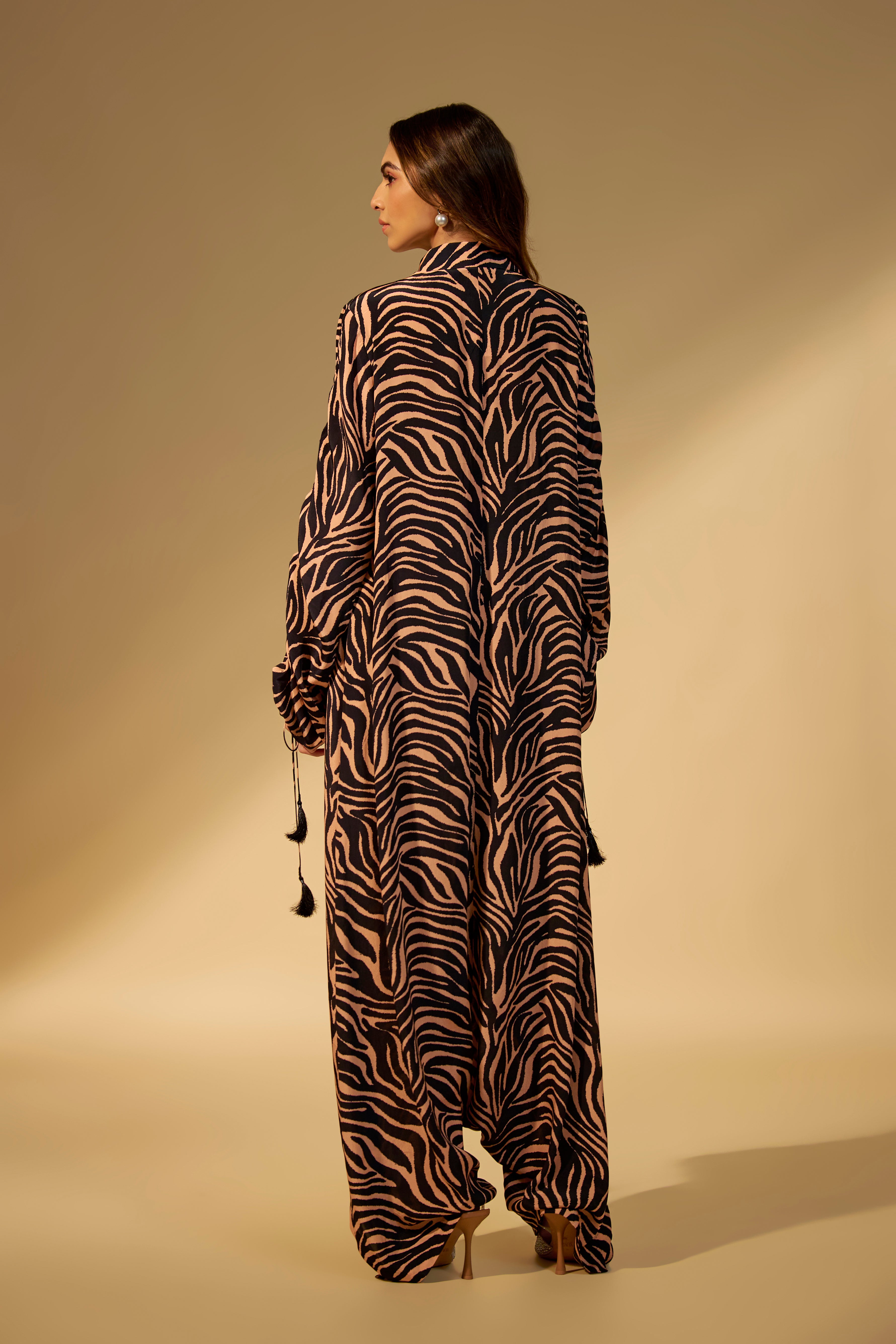 Featuring a peach - black printed jumpsuit in crepe fabric with stone and bead work embroidery with tassels tie-up on the sleeve cuffs.