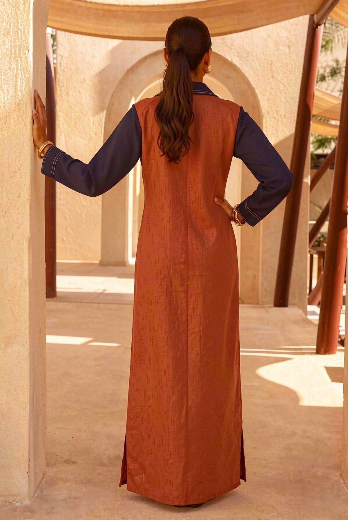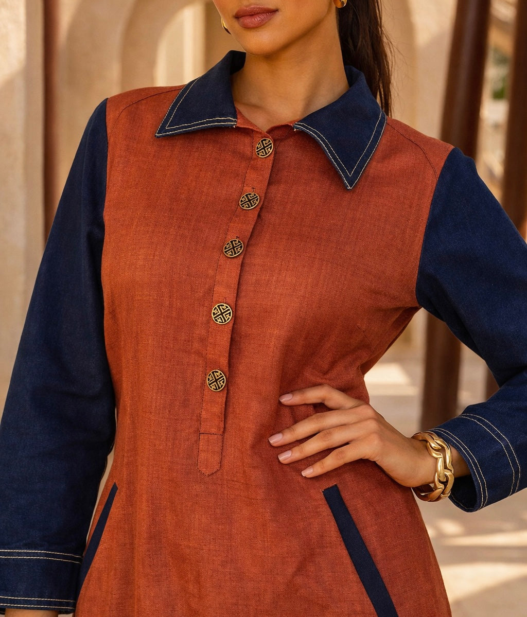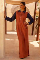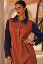 Featuring a red linen and navy blue denim color blocked maxi shirt dress, white contrast stitching on the collar and sleeve cuffs, angled welt pockets with navy trim, side slits at the hem, half button-down placket with gold tone buttons.