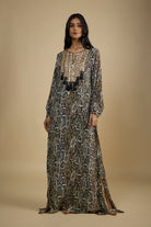 Featuring a snake print kaftan in crepe fabric with sequins, pearl embroidery & tassels details with gold fringe work on the side slits.