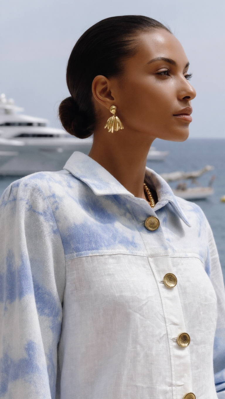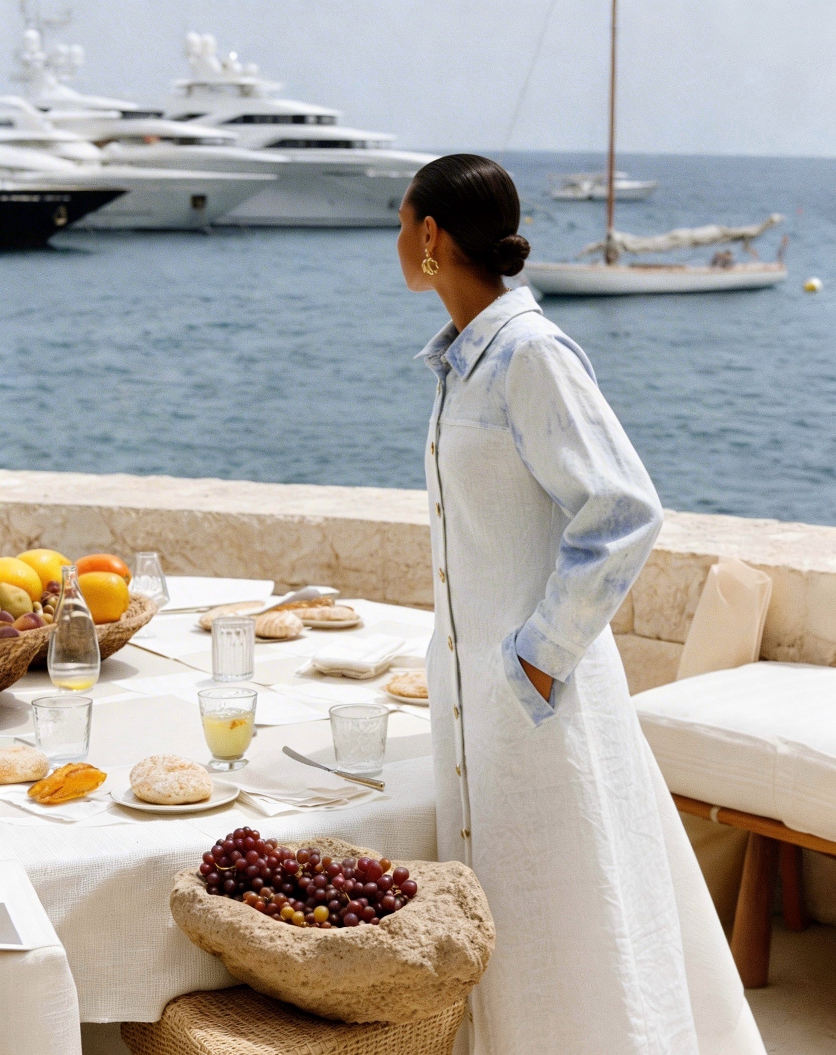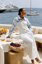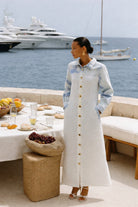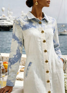 Featuring a white linen and light blue tie-dye denim maxi/ankle-length dress, collared, full button-down front with gold-toned buttons, long sleeves, and side pockets, with a small front slit.