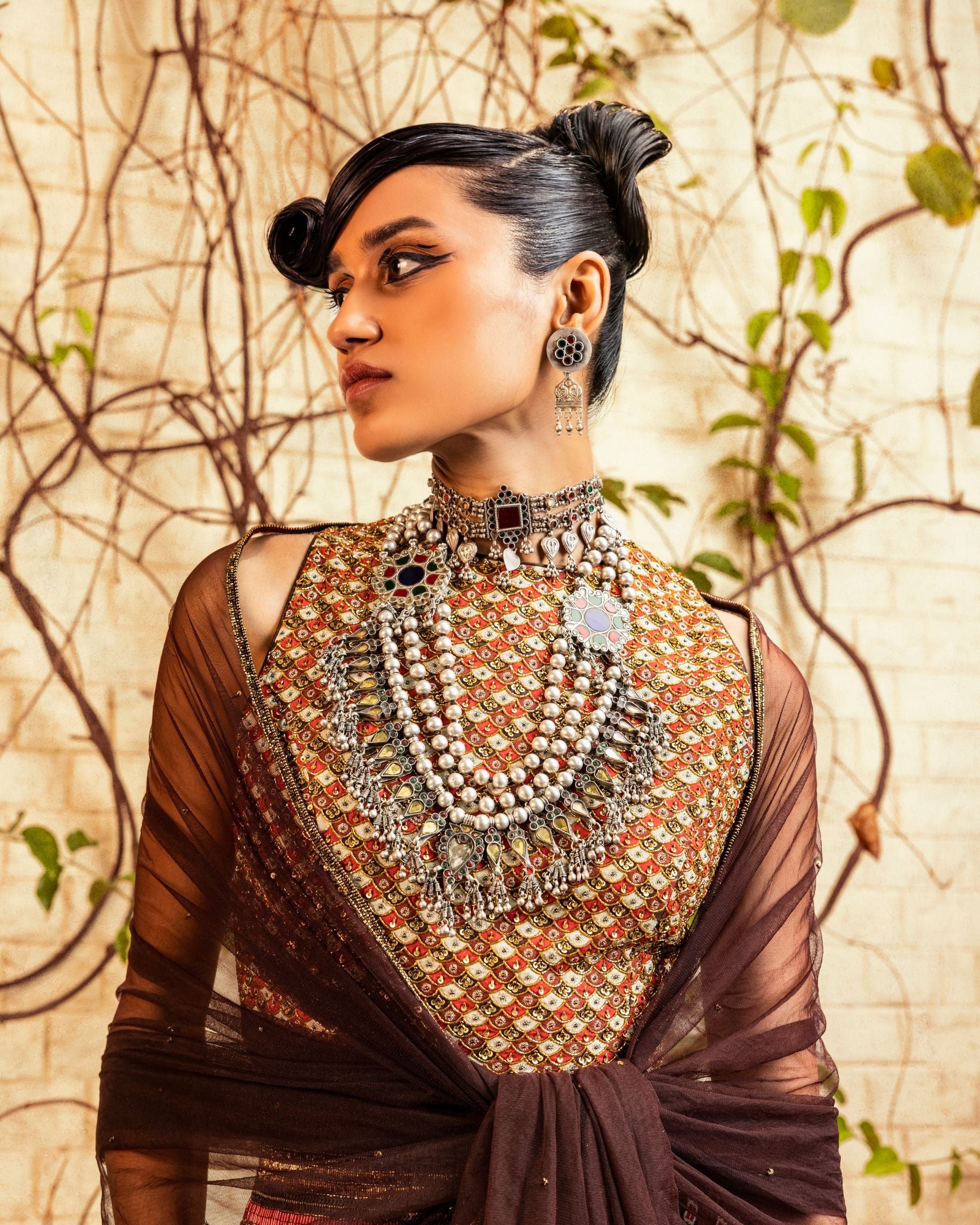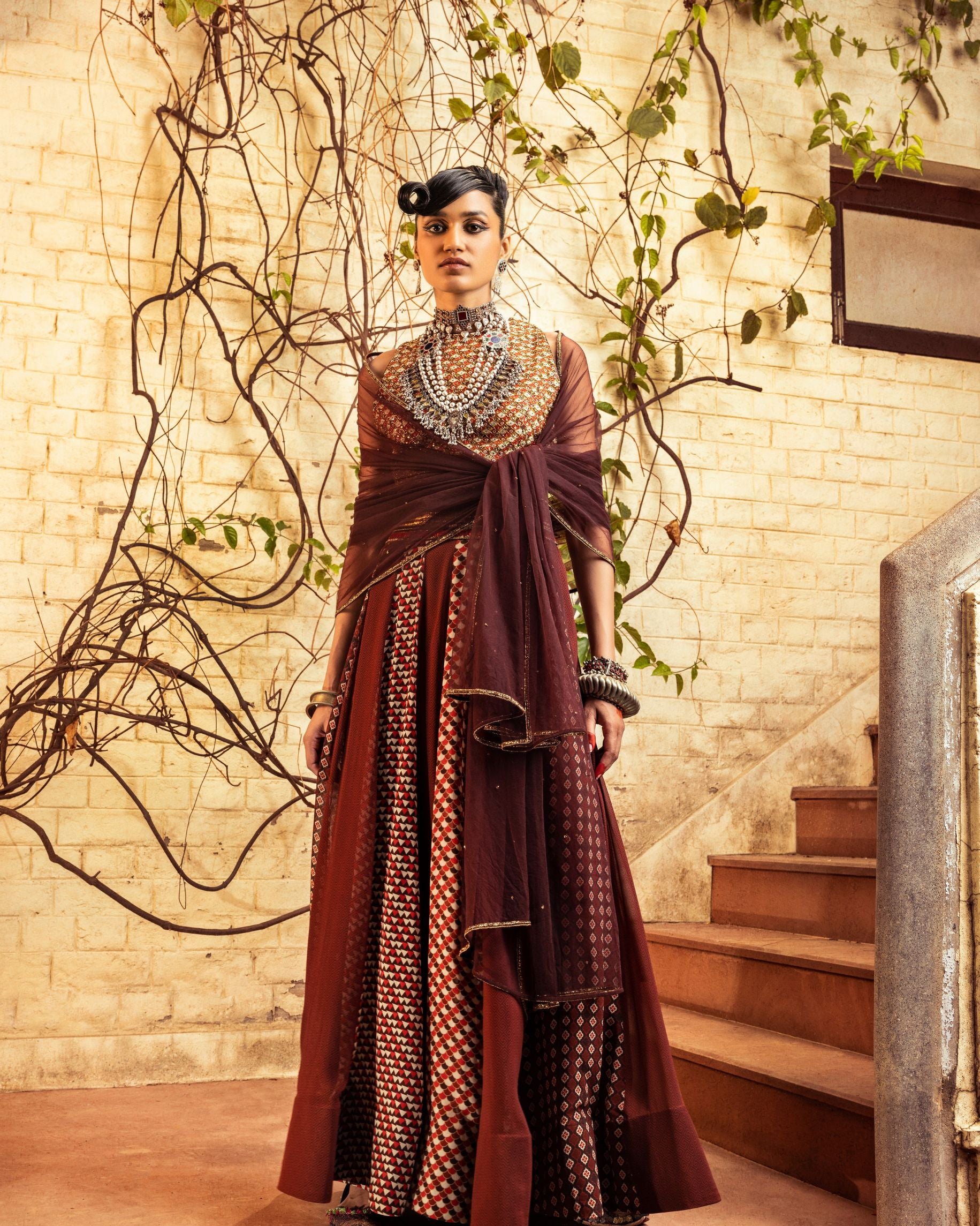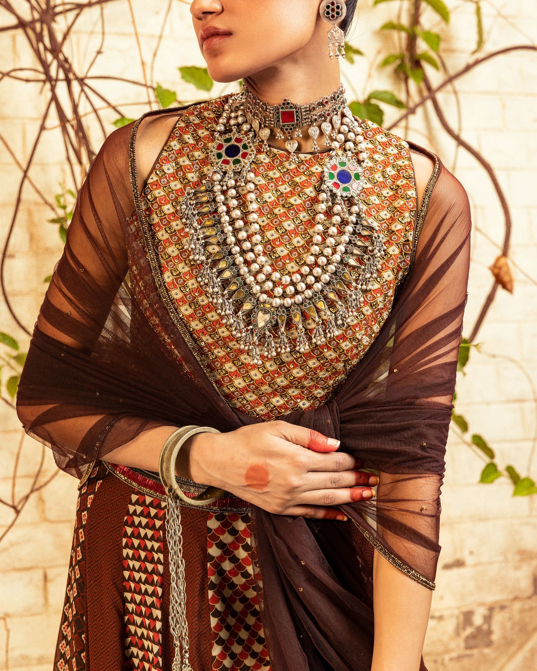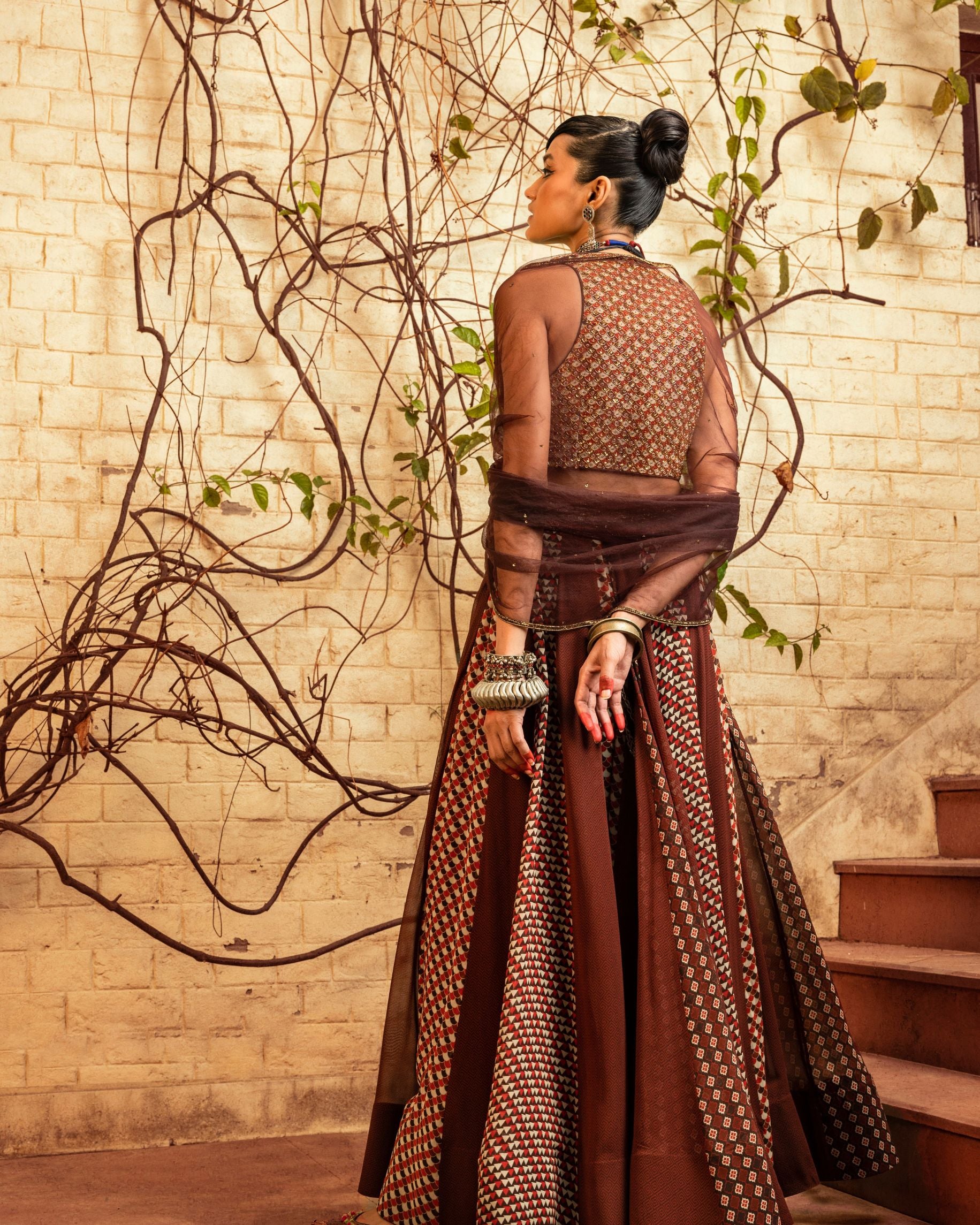 Featuring a brown printed skirt in georgette base with embroidered waist. It is paired with a matching embroidered bustier in mal silk base and net dupatta.