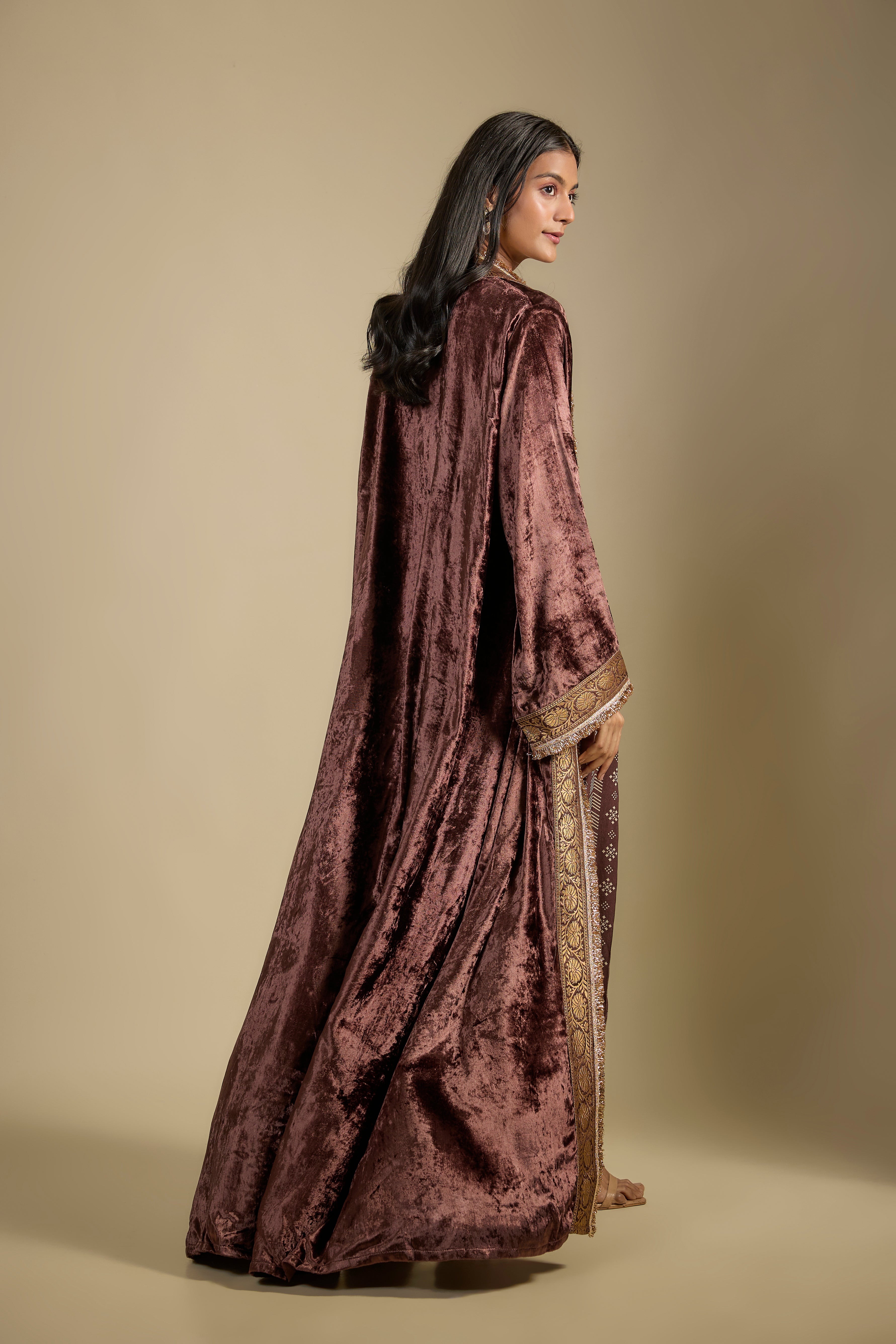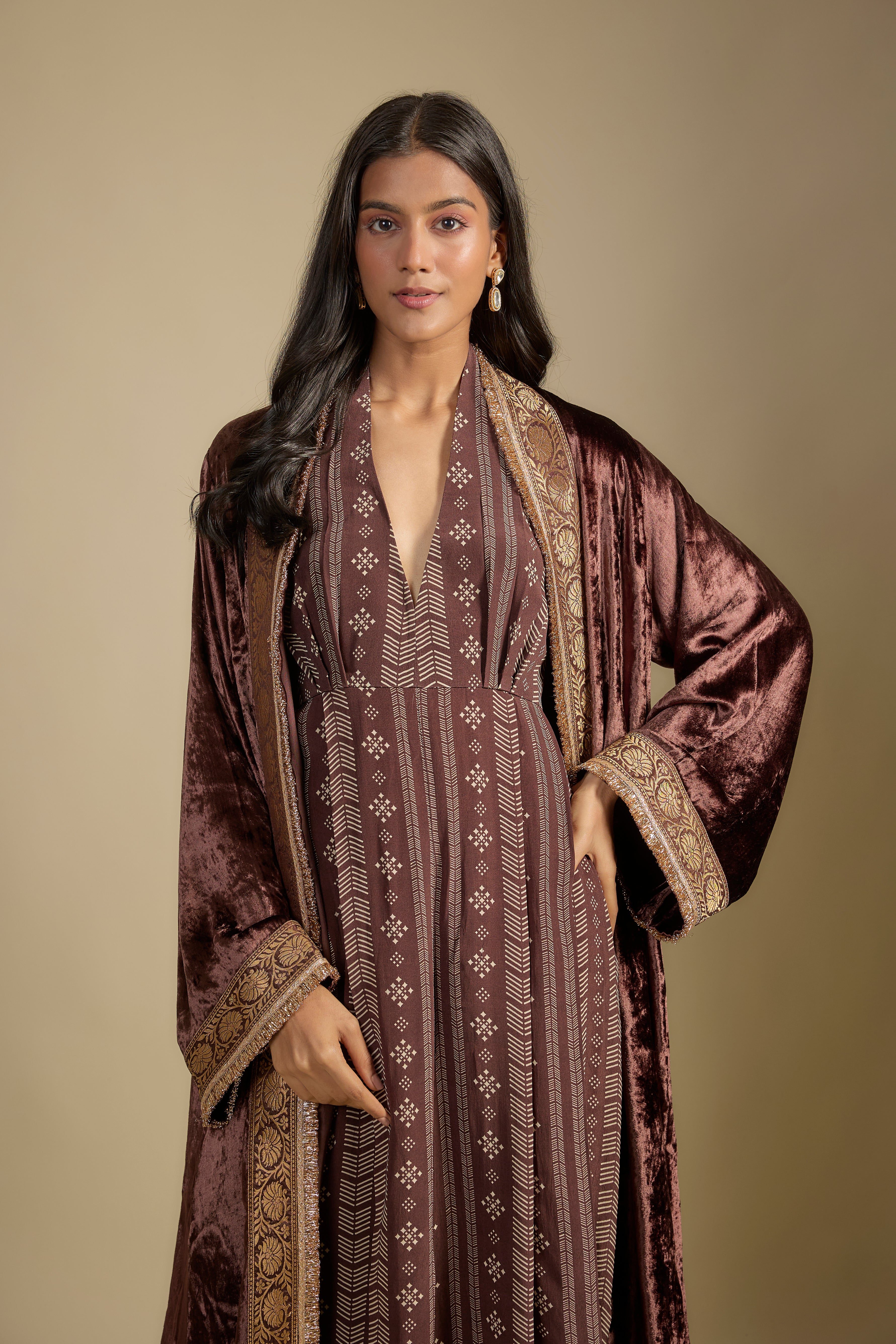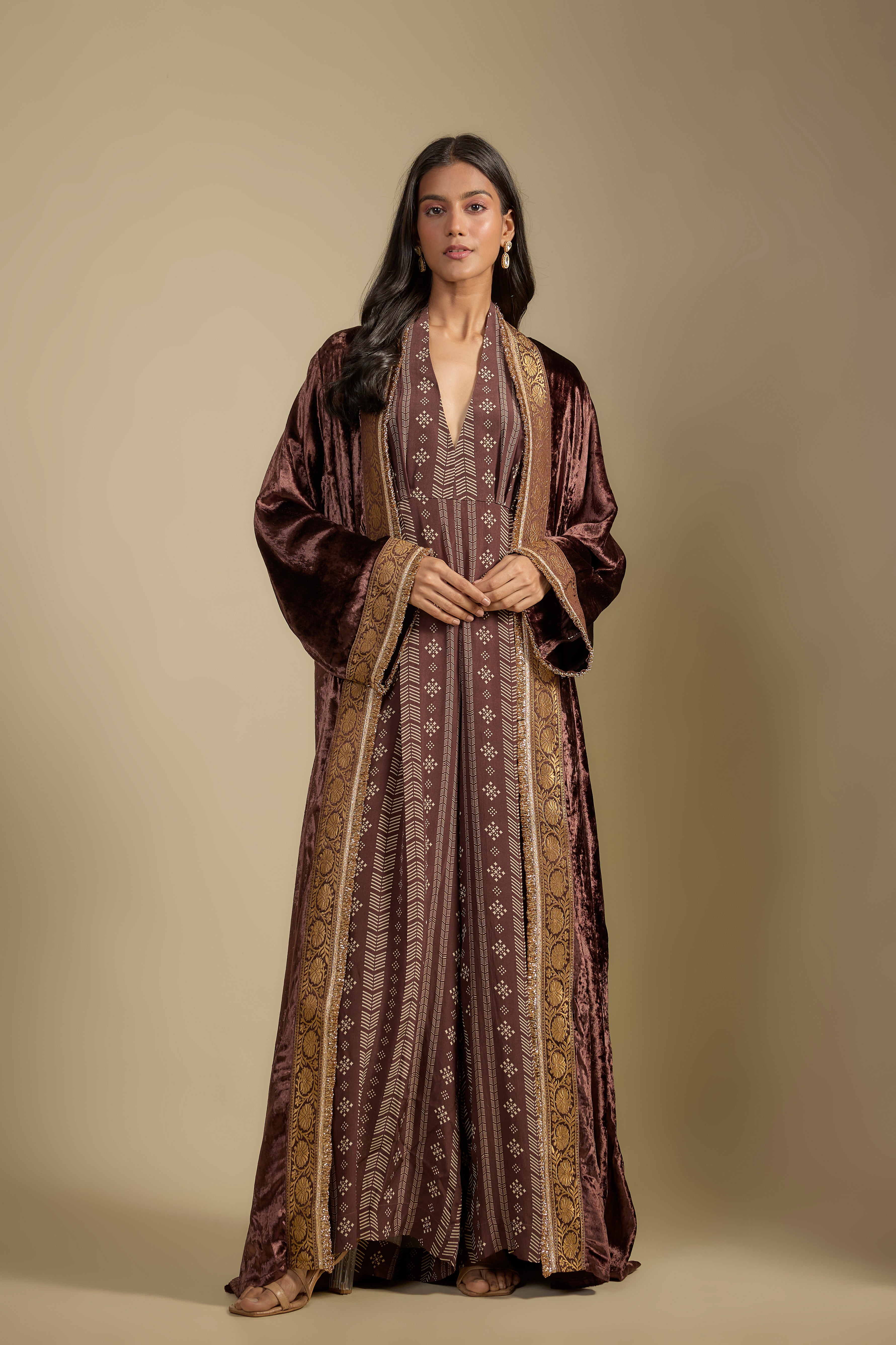 Brown Velvet Cape with Printed Jumpsuit