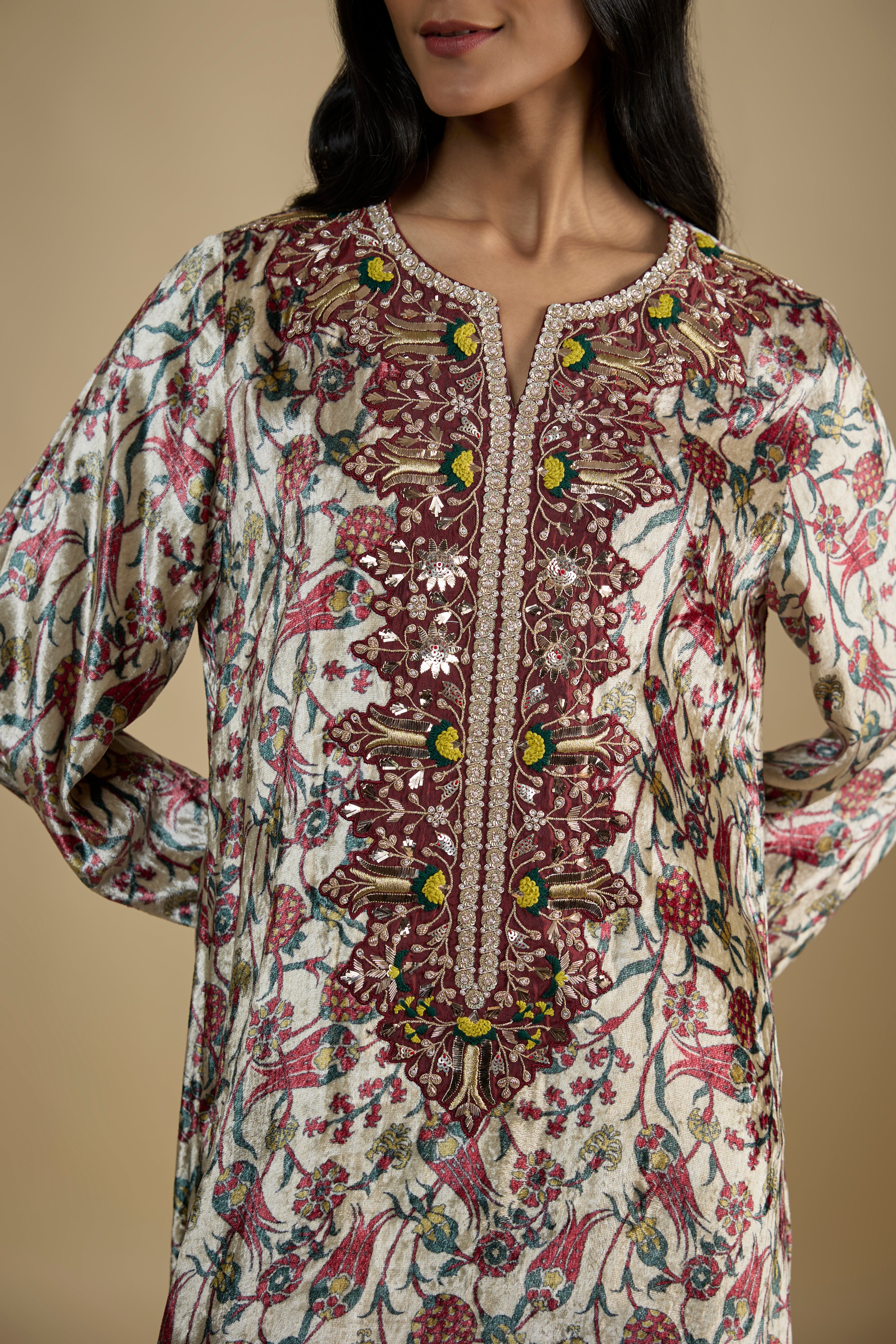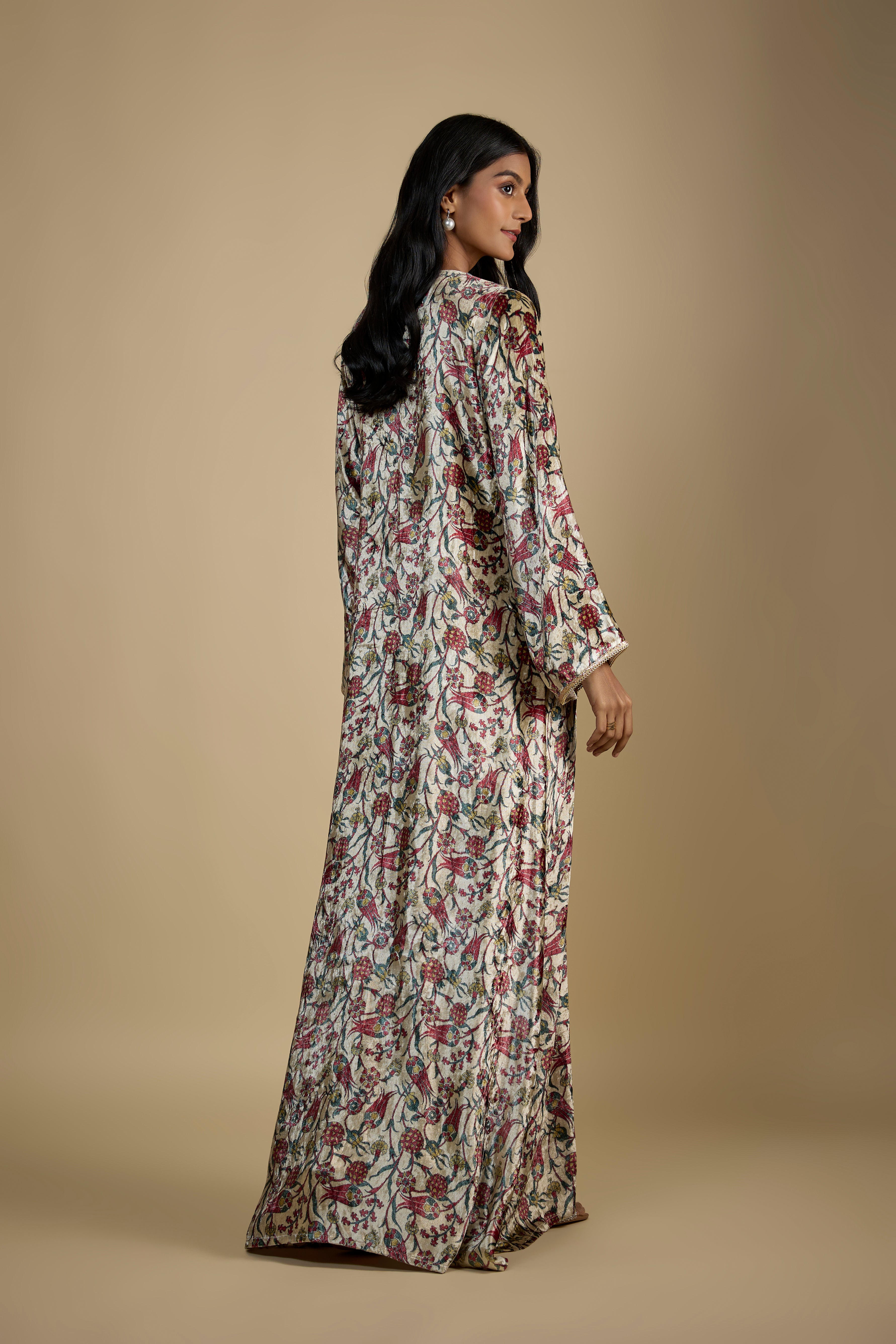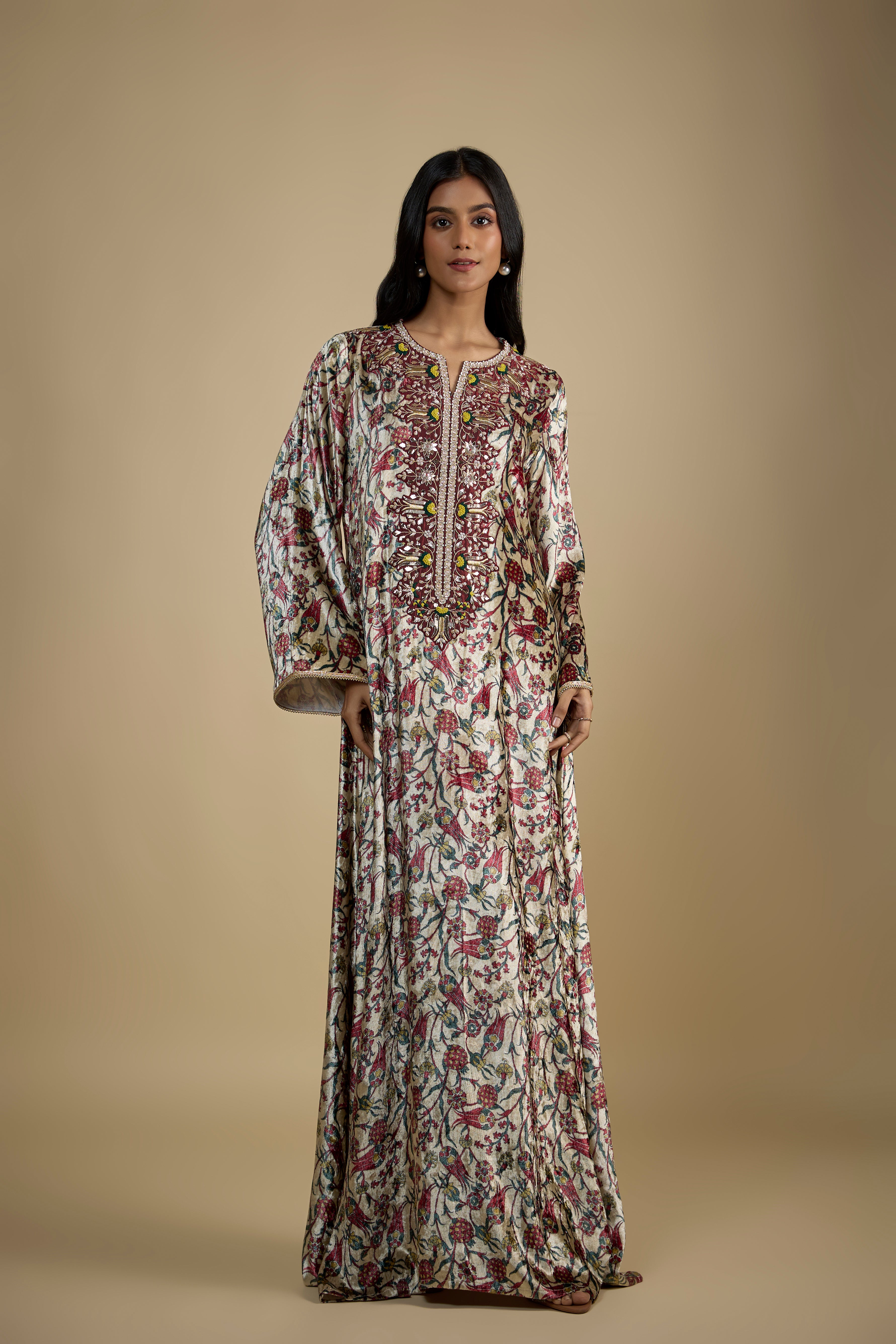 Beige Printed and Embroidered Velvet Kaftan