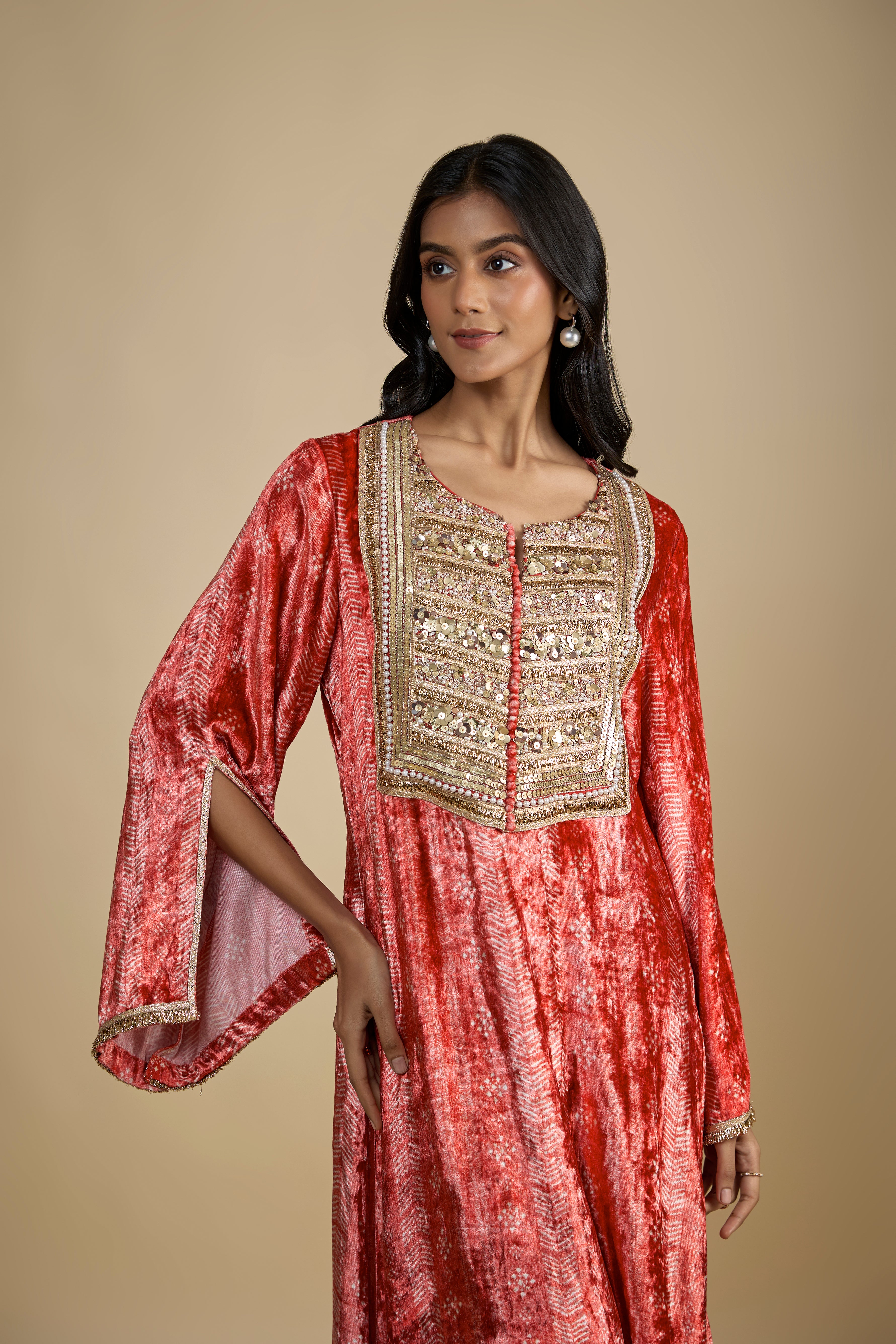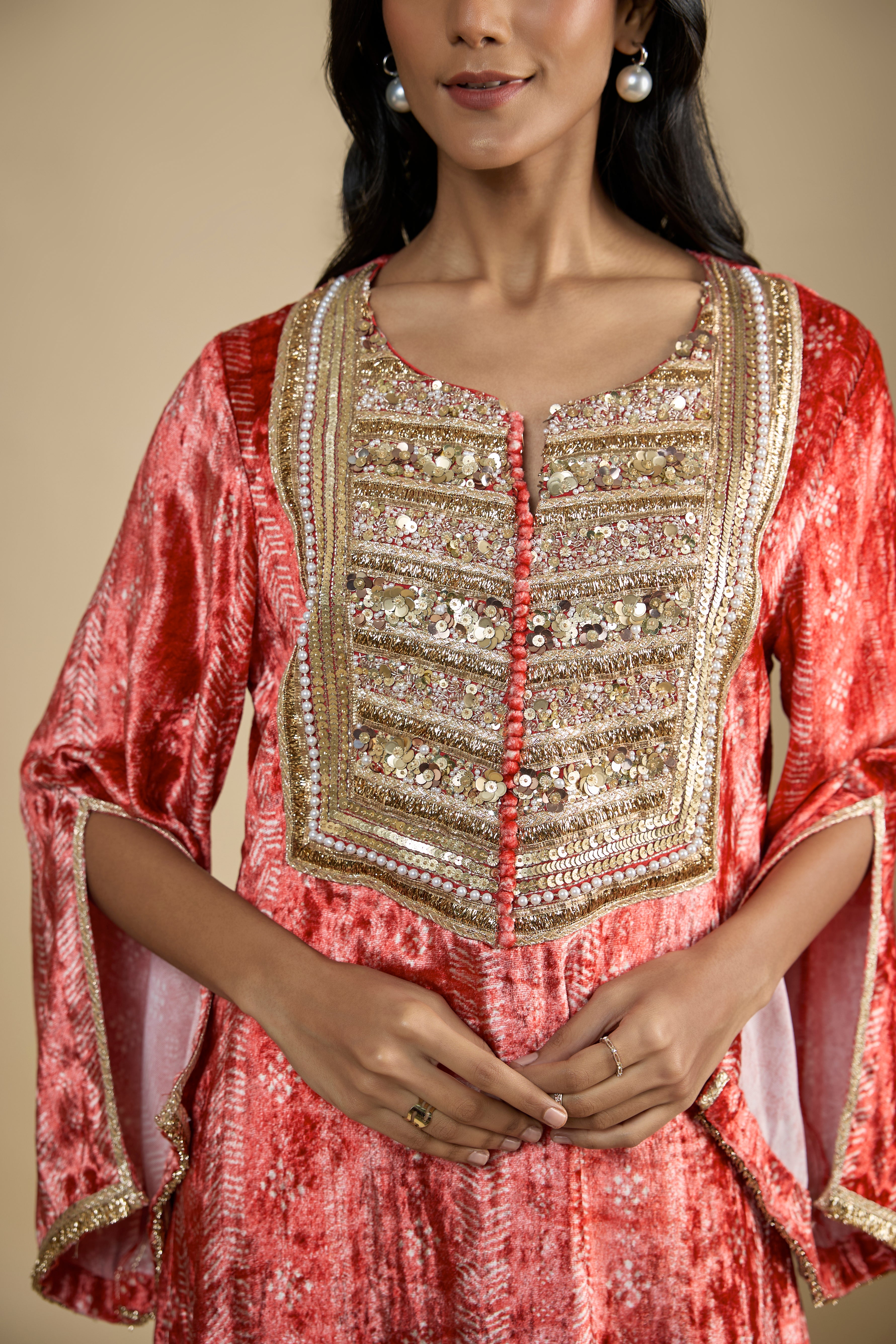 Red Printed and Embroidered Velvet Kaftan
