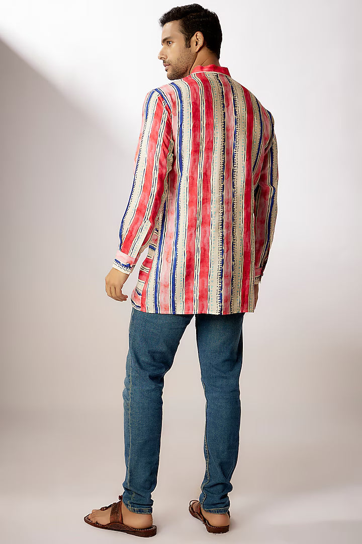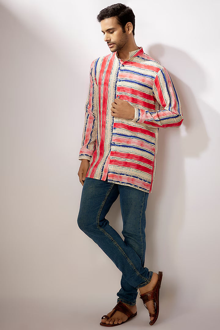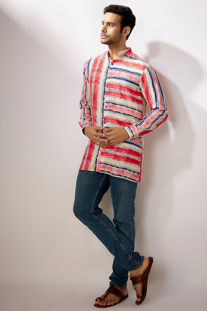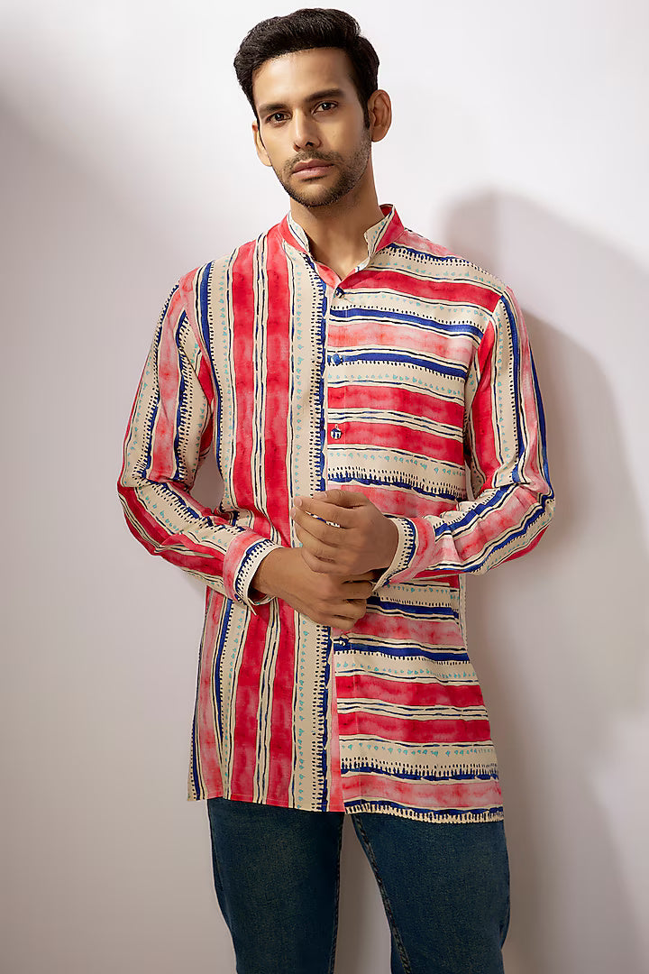 Featuring a multi-colored short kurta in dupion silk base with digital stripes print. Perfect wear for any festive occasion or sangeet ceremony.